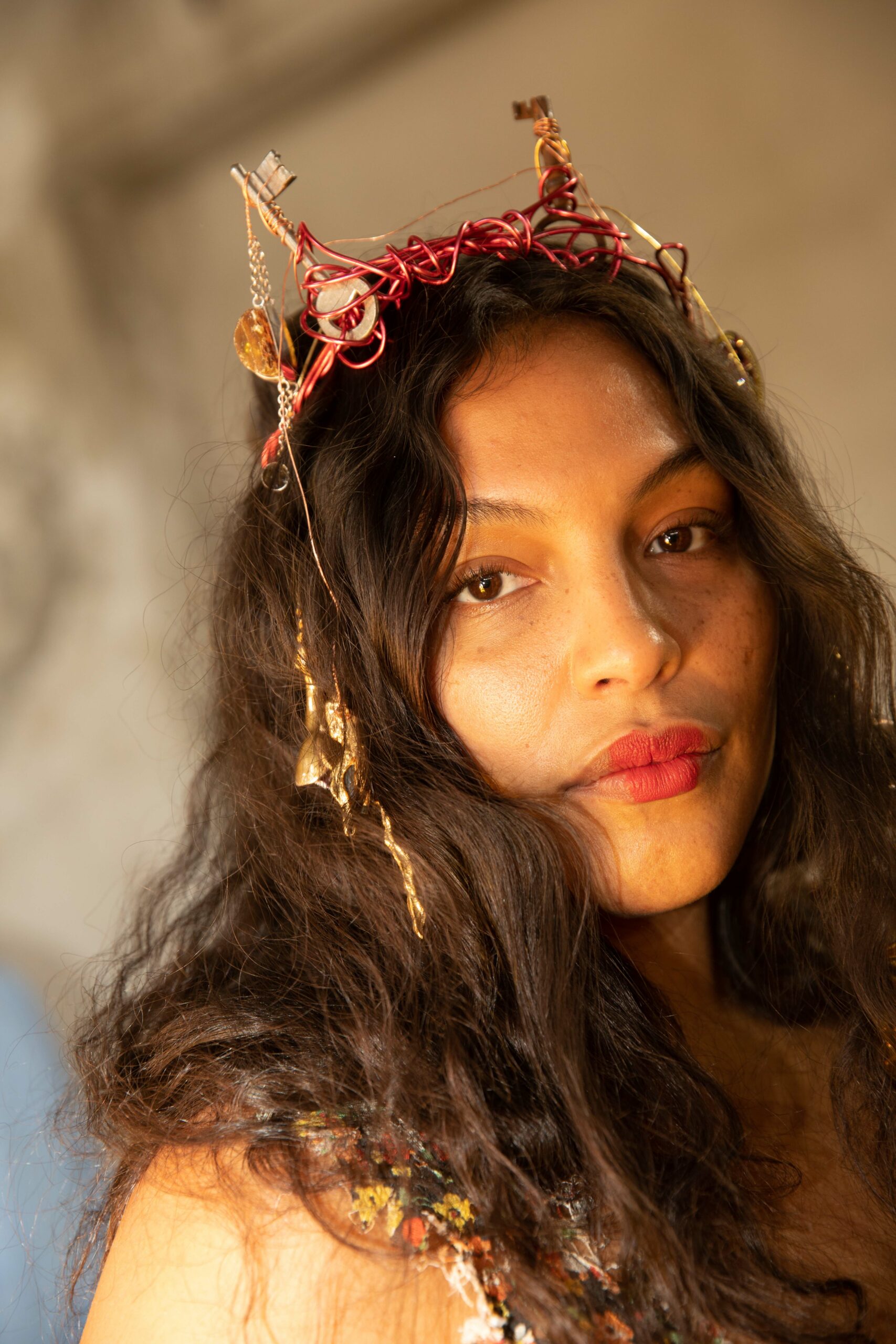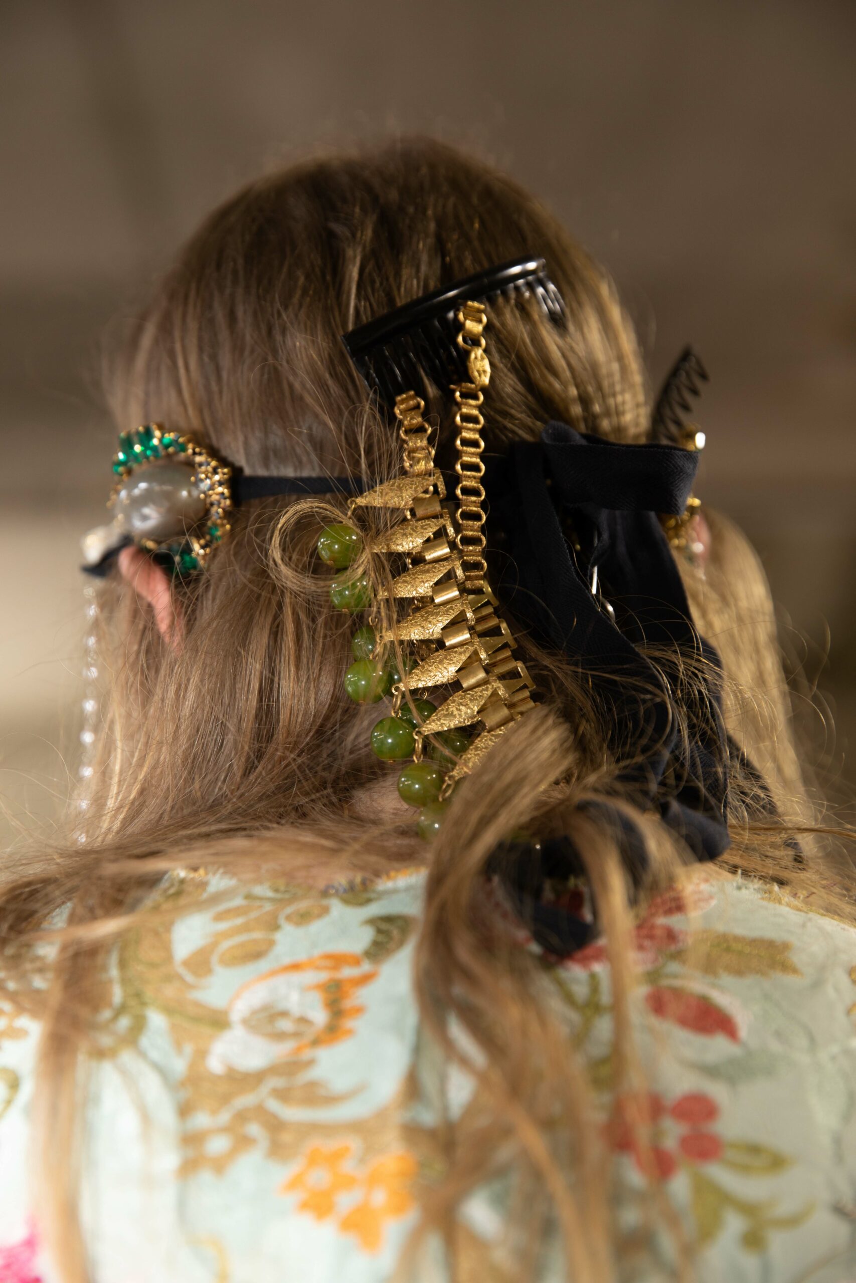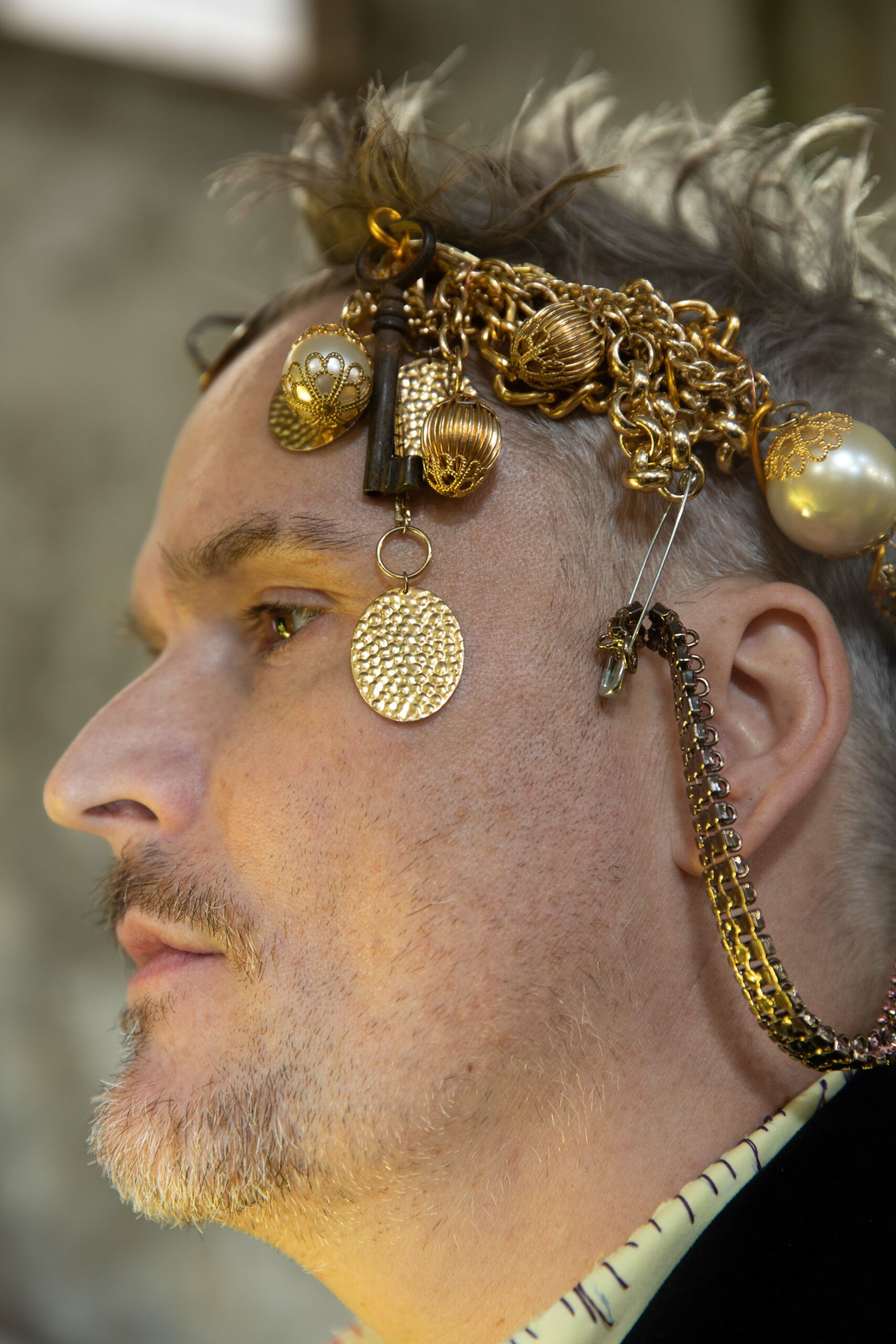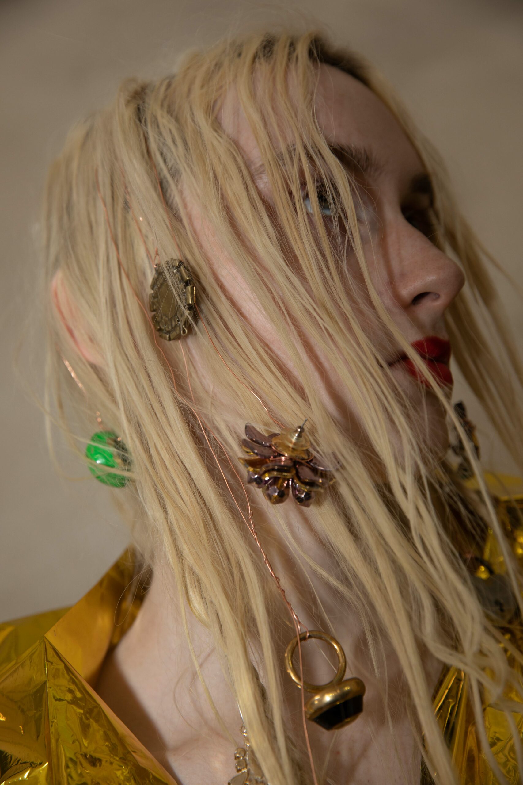 Objects woven into the hair and assembled into jewelry.