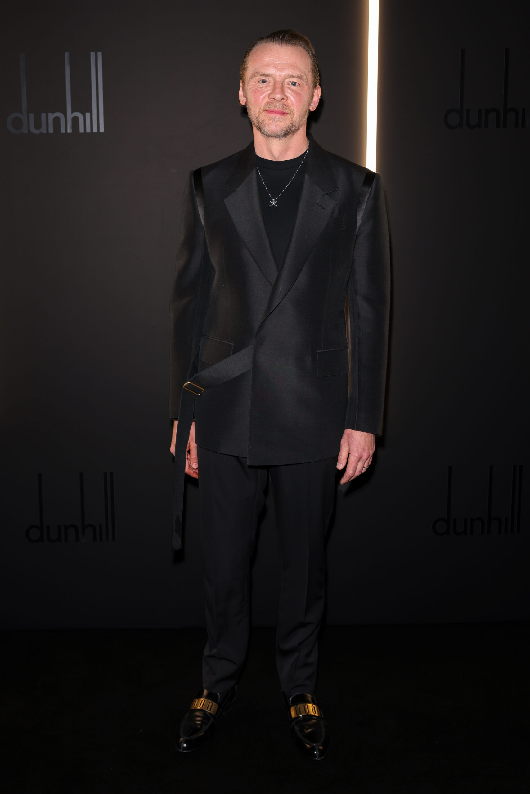 Simon Pegg in a black wool silk half-wrap jacket and evening trousers, black cotton D t-shirt and dunhill Link Loafers.