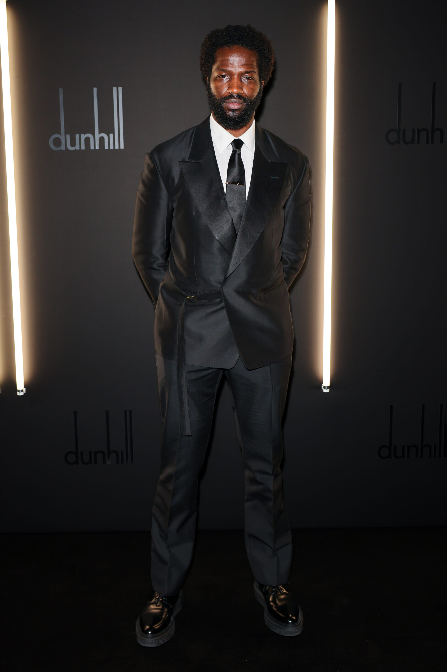 Sope Dìrísù in a black wool silk Ottoman half-wrap evening jacket and classic evening trousers, white cotton pointed collar shirt, black silk evening tie, gold plated Duke Hinge tiebar and black dunhill Creeper Derby shoes.
