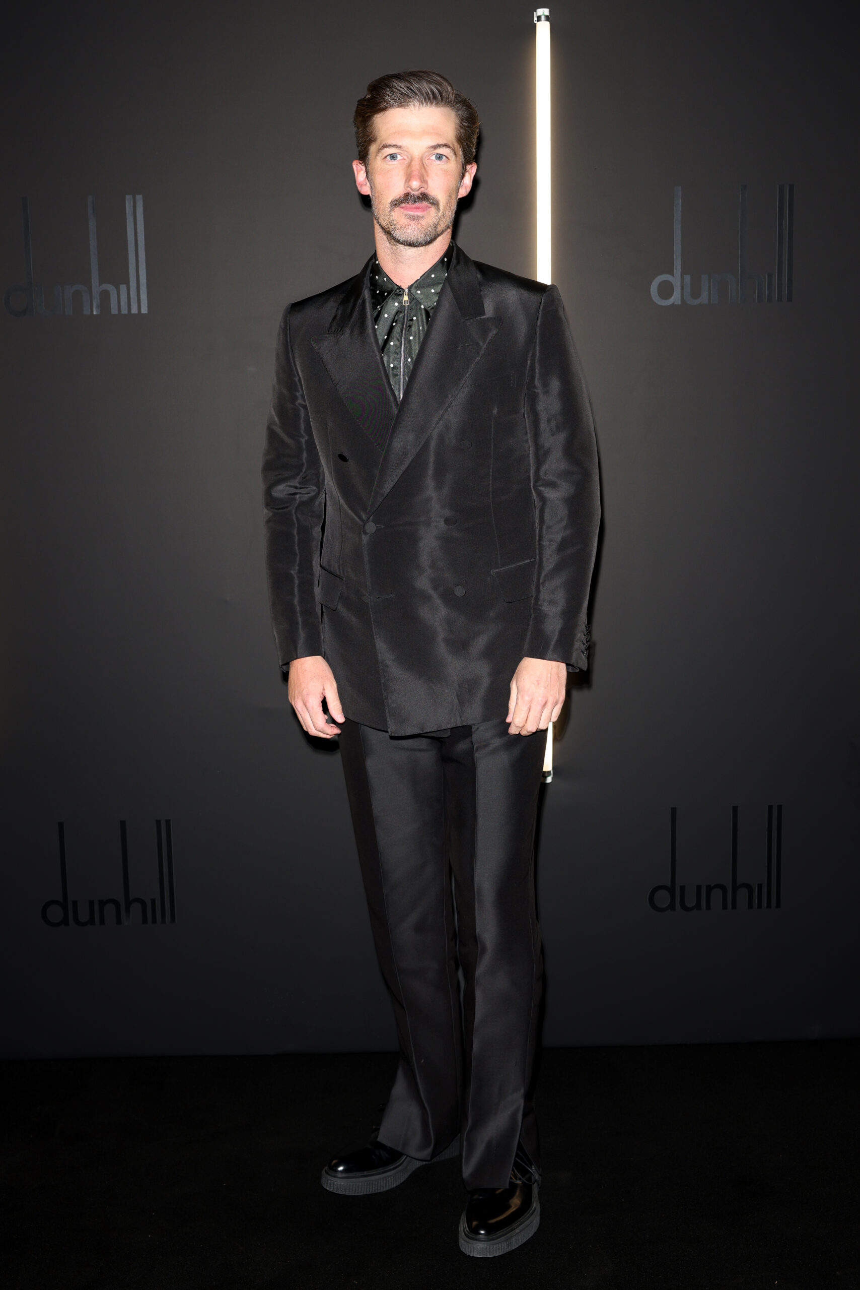 Gwilym Lee in a black silk faille double breasted jacket, black wool silk split hem trousers, black polka dot zip shirt and black dunhill Creeper Derby shoes.
