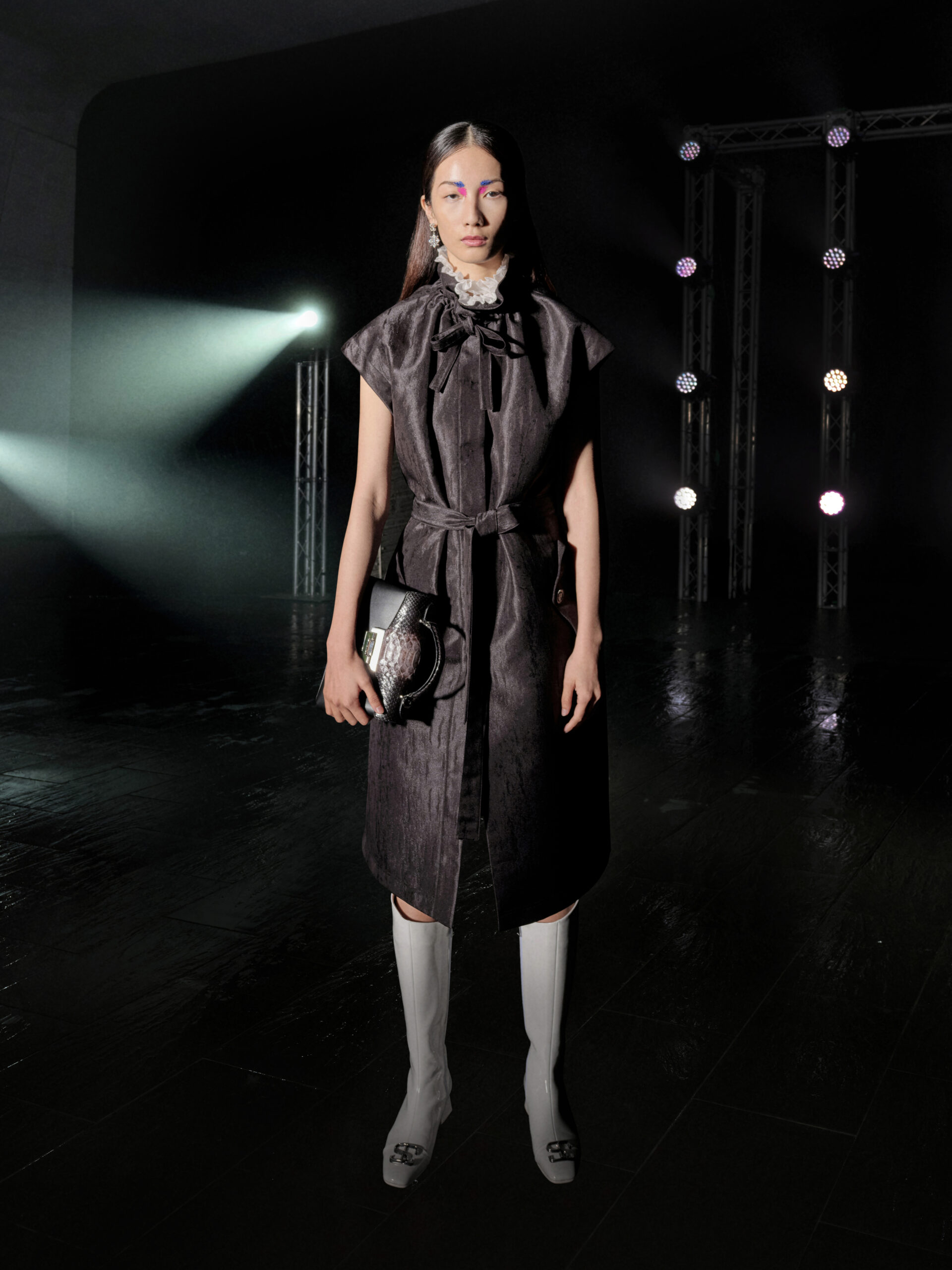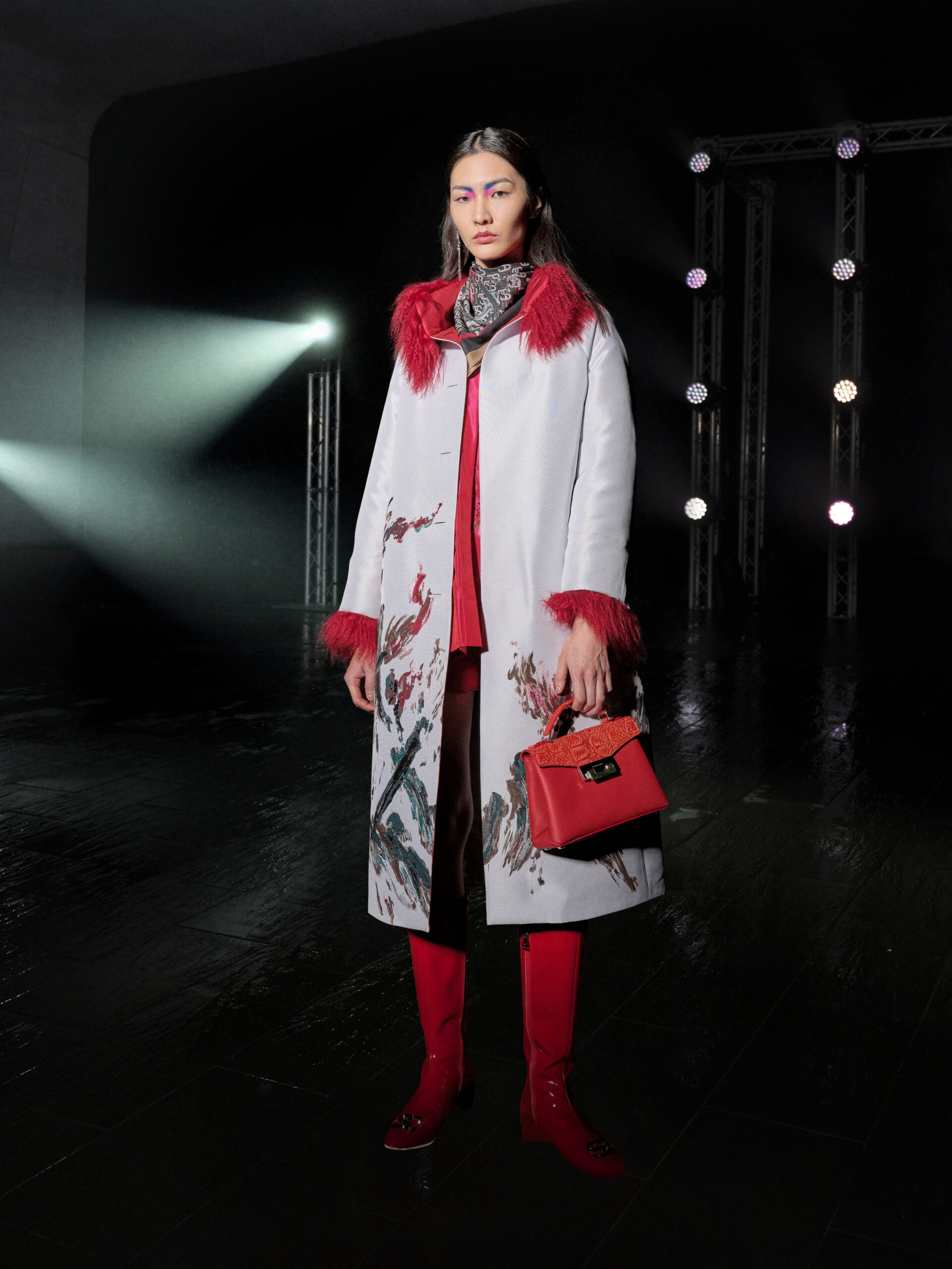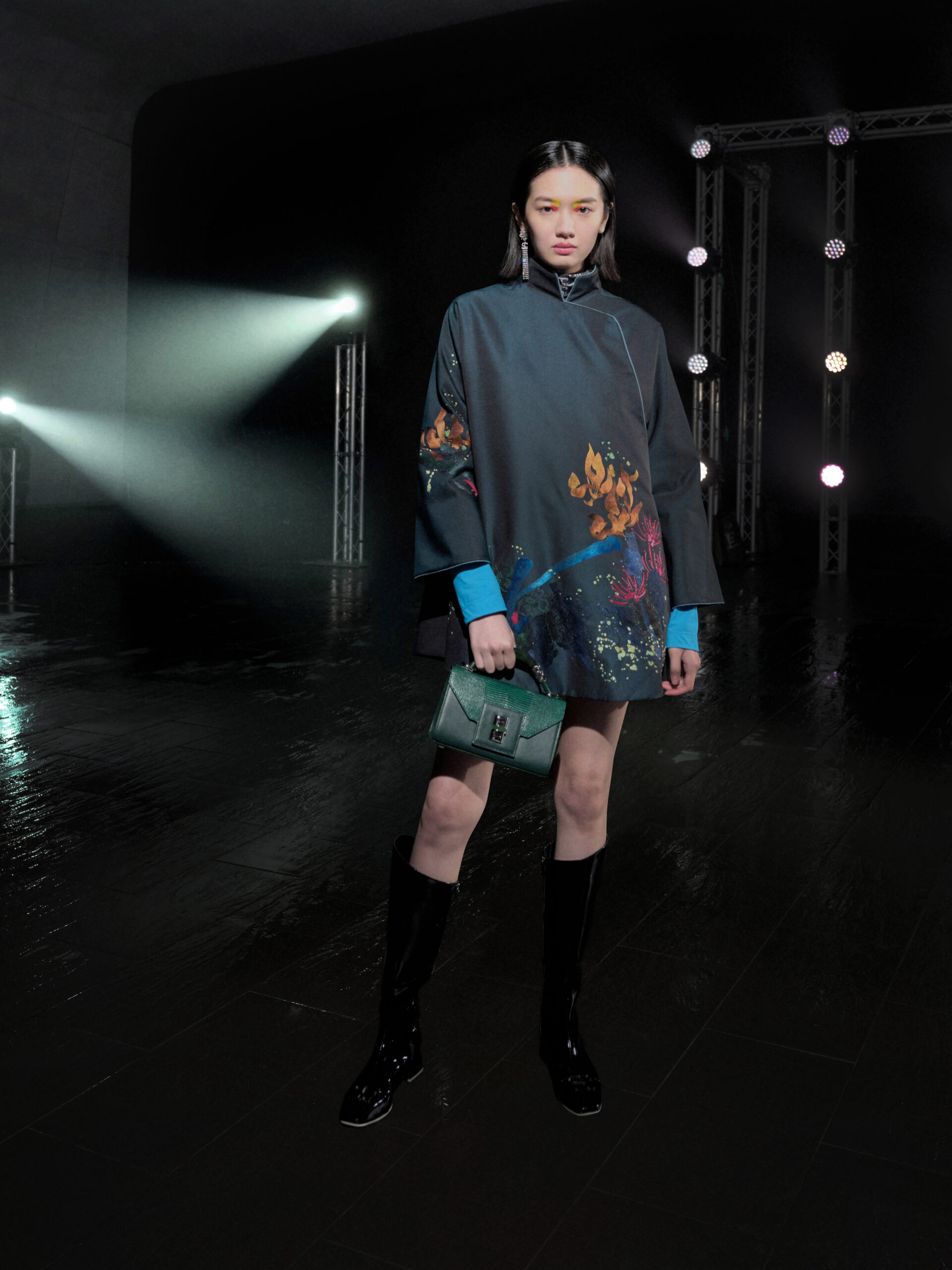 Light, the swiftest of travelers, translates this inspiration into different assortments. A number of men’s garments use tight, casual turtleneck tops with prints accompanied by more formal elements such as a shirt and jacket, giving a new oriental image. Splendid flamboyant red wool accessories are also added to long men’s high-collared coats, redefining the notion of oriental luxury. In addition, this collection makes extensive use of scarves with printed patterns, becoming the new key paraphernalia used in common by women and men, and which, accompanying leather jackets and short skirts, are reminiscent of the retro look of the 80s. Basket dresses, so representative of the rococo era, with their horizontal hoops, draw the quintessential contours of light, making a statement of feminine power. The accessories are inspired by the idea that light spreads evenly. Symmetrical radial crystal earrings and waterfall-like necklaces with glittering bangs take us on the path to a radiant future. Shoes, meanwhile, inherit the concept of blossoming, with ankle boots and ankle boots all designed with light-reflecting patent leather, discreetly adorning them with light. Similarly, the bags, with their classic jade-colored handles and mini satchels, are a distinctive feature of this collection and, by accompanying the garments, make for a neat, neutral modern style.