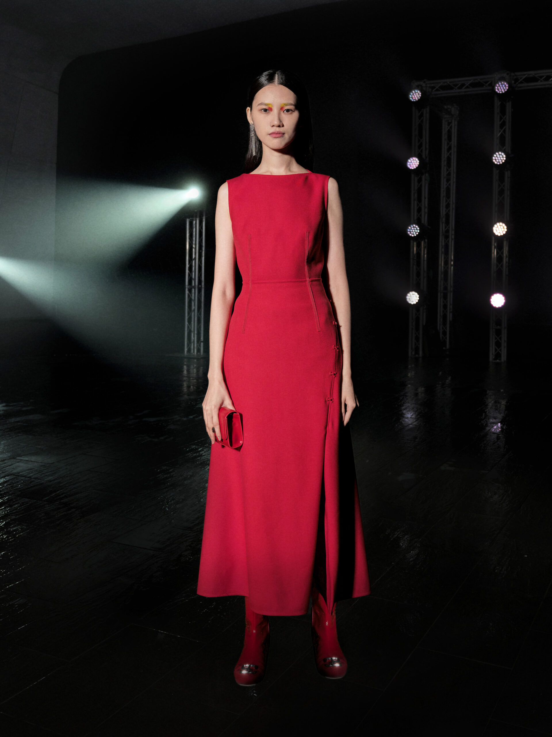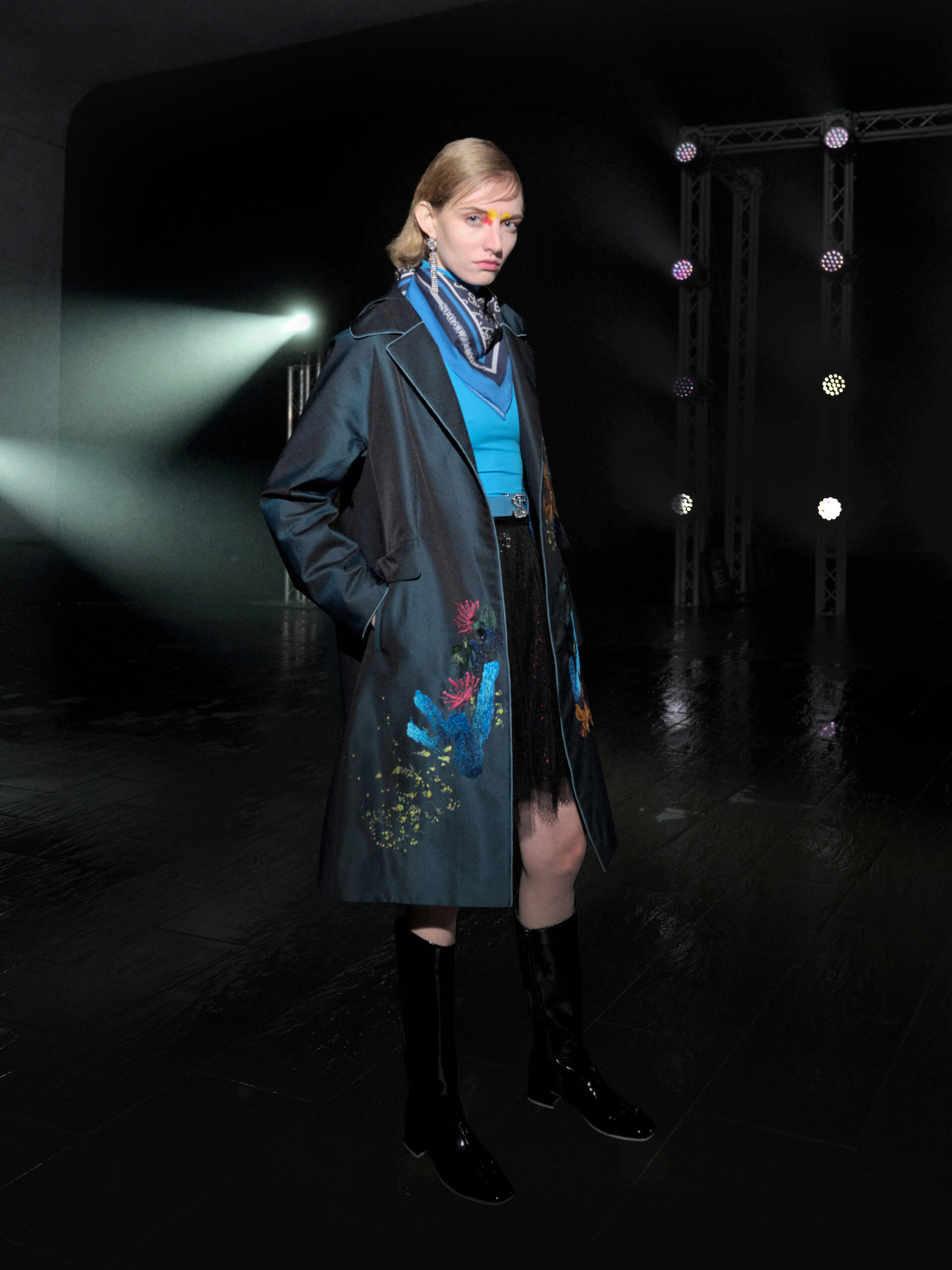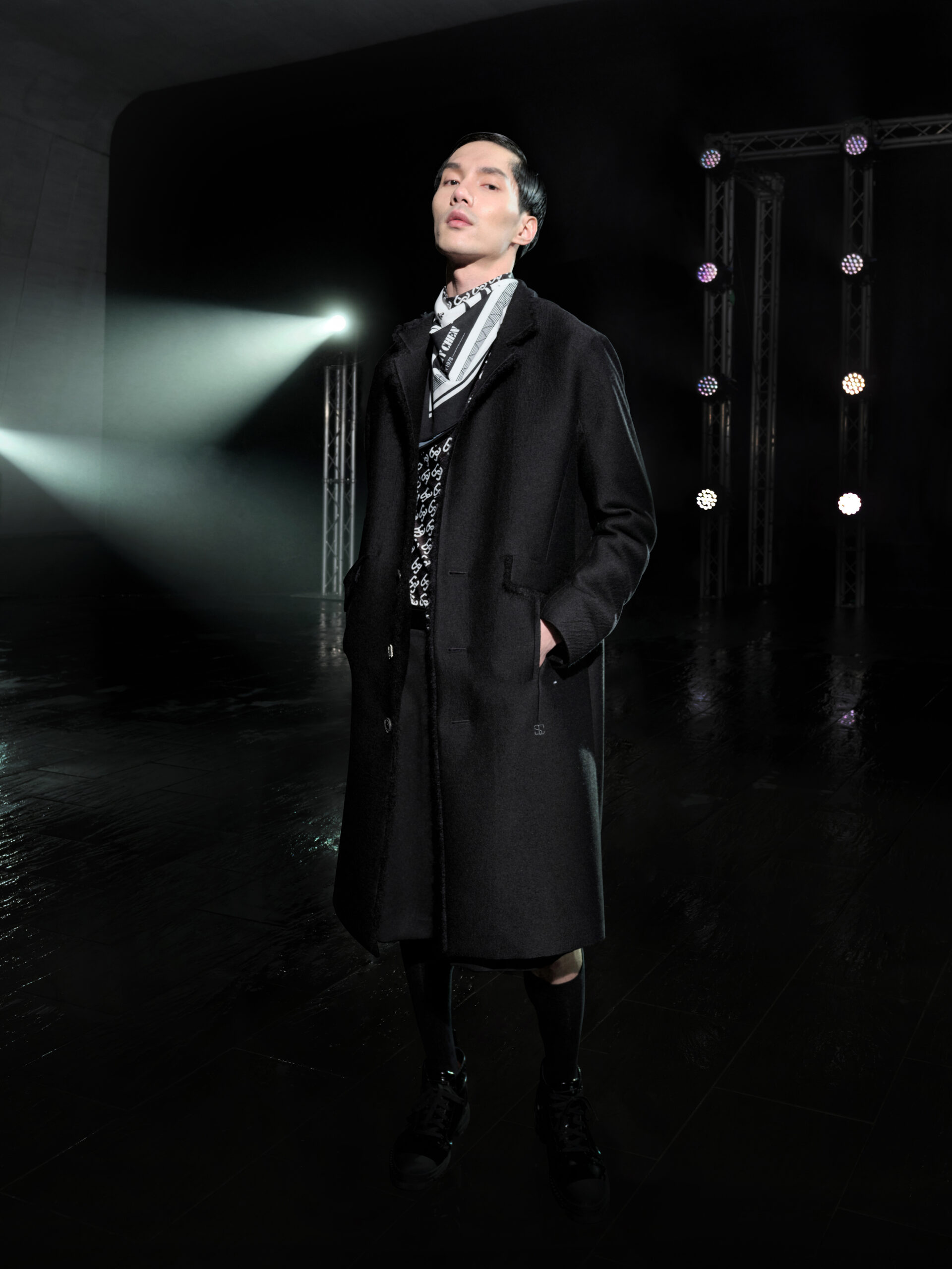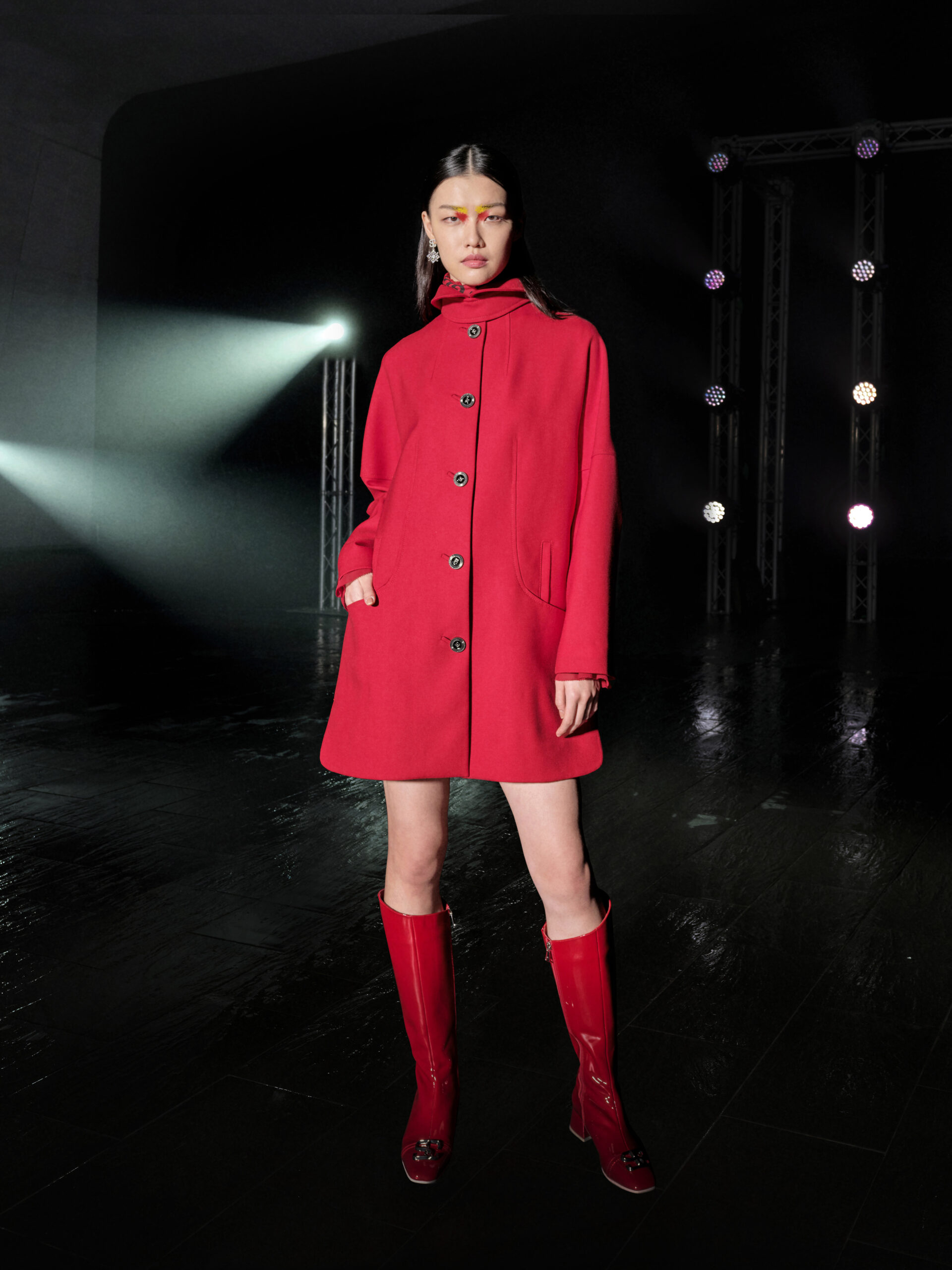 Light, the swiftest of travelers, translates this inspiration into different assortments. A number of men’s garments use tight, casual turtleneck tops with prints accompanied by more formal elements such as a shirt and jacket, giving a new oriental image. Splendid flamboyant red wool accessories are also added to long men’s high-collared coats, redefining the notion of oriental luxury. In addition, this collection makes extensive use of scarves with printed patterns, becoming the new key paraphernalia used in common by women and men, and which, accompanying leather jackets and short skirts, are reminiscent of the retro look of the 80s. Basket dresses, so representative of the rococo era, with their horizontal hoops, draw the quintessential contours of light, making a statement of feminine power. The accessories are inspired by the idea that light spreads evenly. Symmetrical radial crystal earrings and waterfall-like necklaces with glittering bangs take us on the path to a radiant future. Shoes, meanwhile, inherit the concept of blossoming, with ankle boots and ankle boots all designed with light-reflecting patent leather, discreetly adorning them with light. Similarly, the bags, with their classic jade-colored handles and mini satchels, are a distinctive feature of this collection and, by accompanying the garments, make for a neat, neutral modern style.