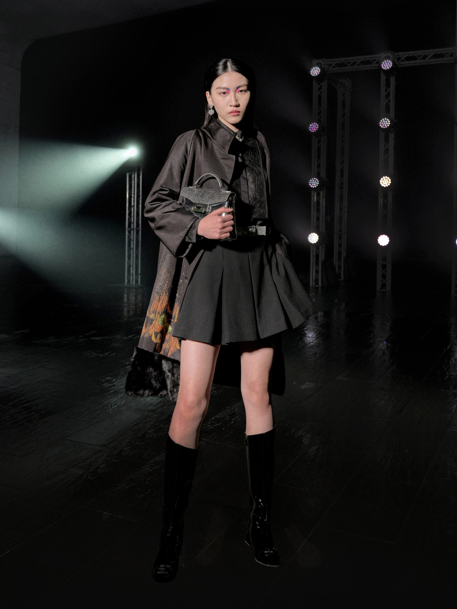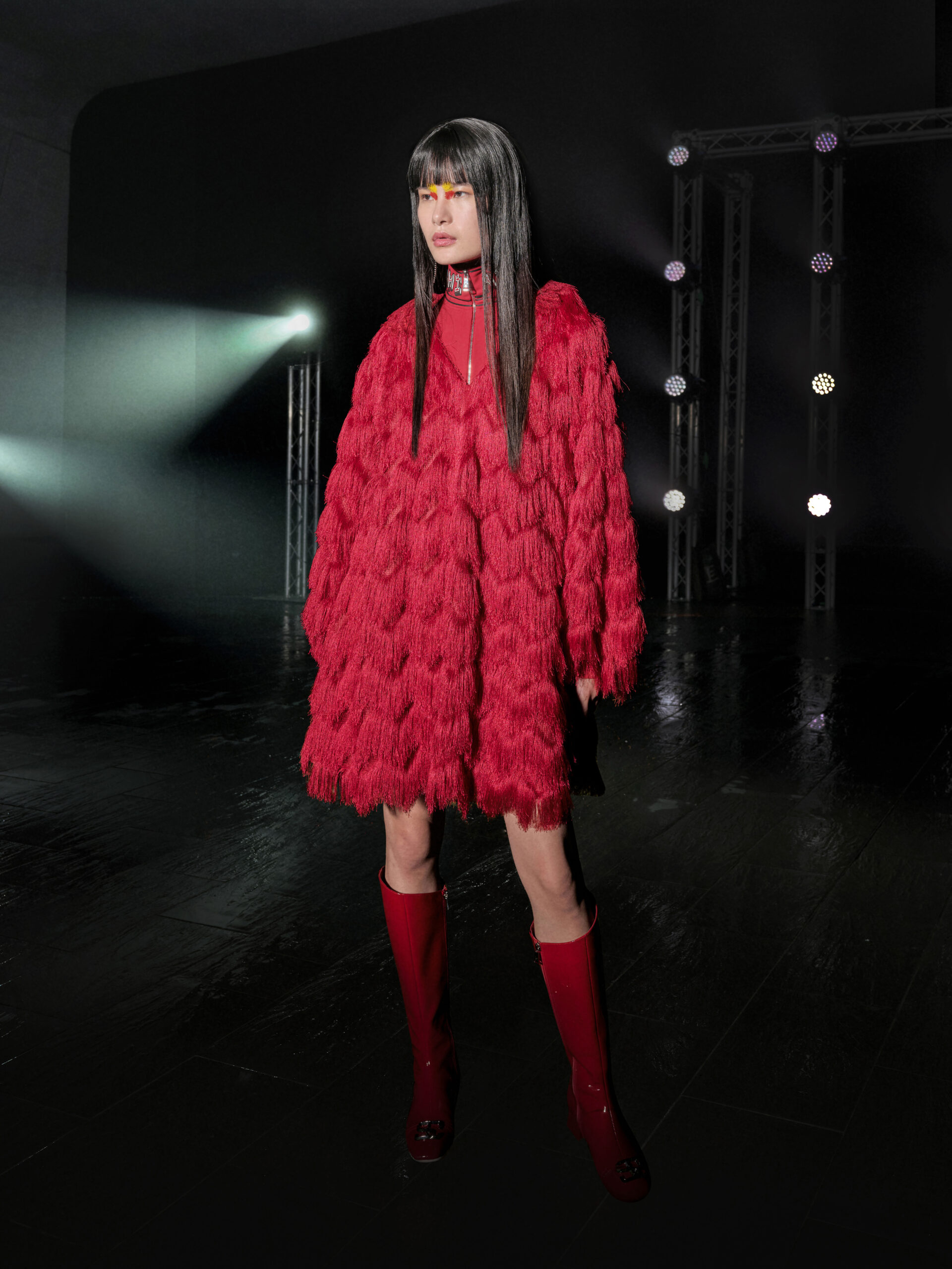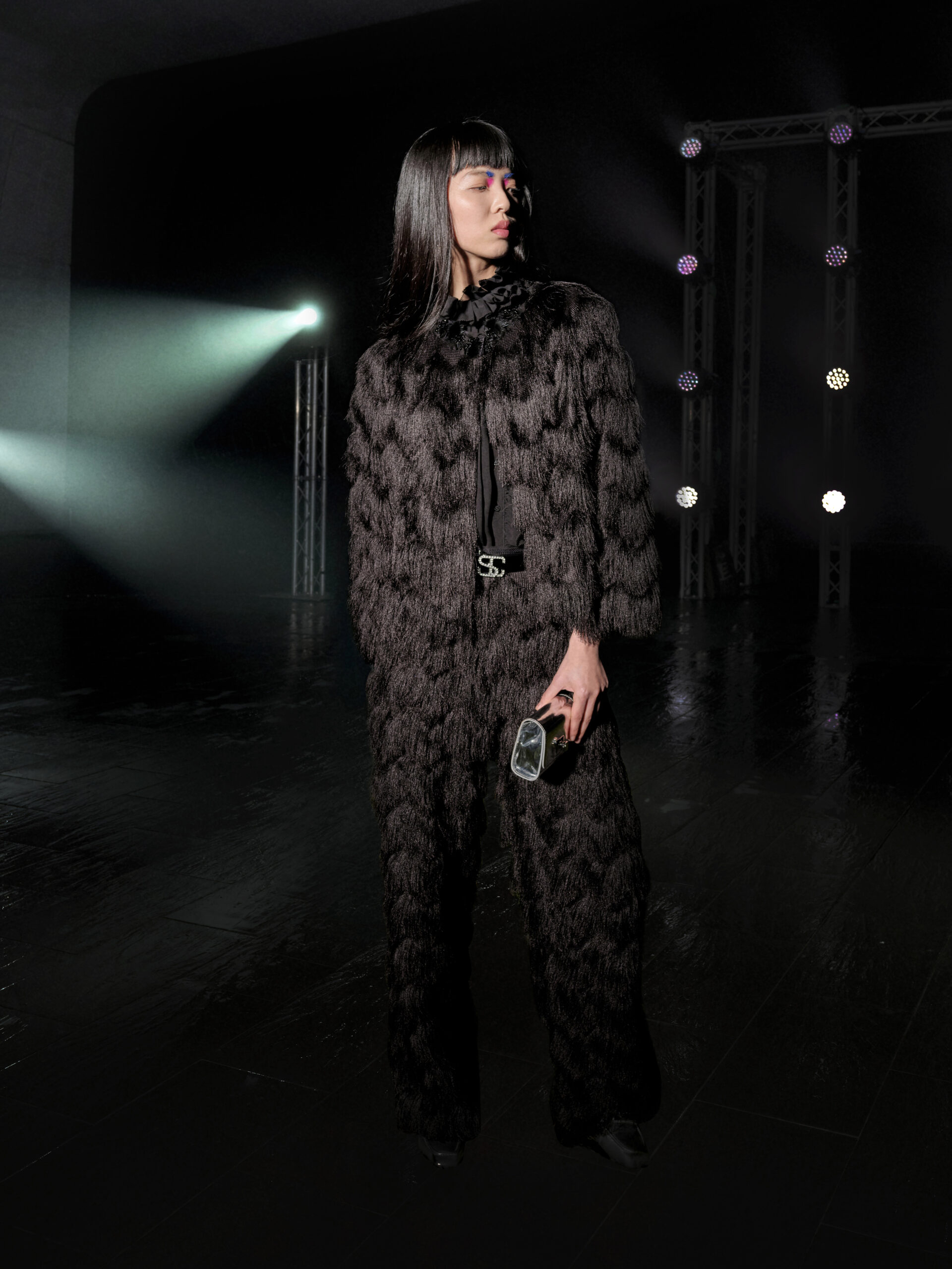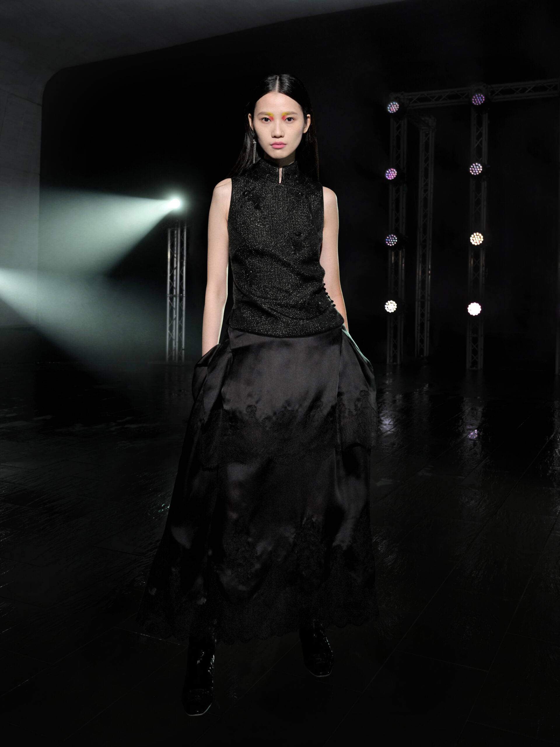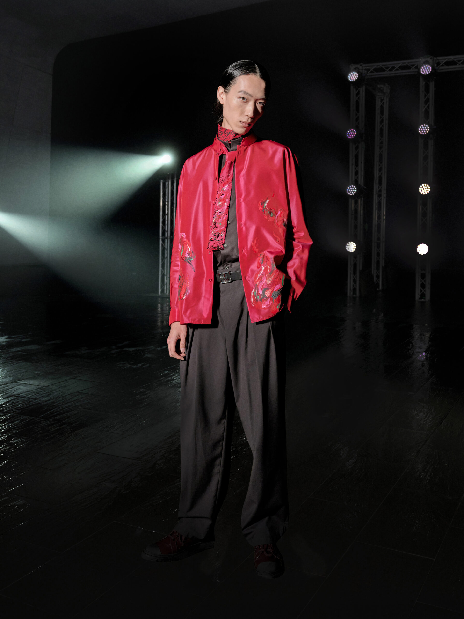 Whether it’s the past or the light, both are abstractly conceived in our minds, but deeply felt in our hearts. We transpose this idea poetically into our clothes. We draw on this spirit of harmonious oriental aesthetics, which combines opposition and perseverance, to concretely express sleek, slender contours that are as abundant as they are beautiful, starting with form-fitting, sporty ribbed-collar tops in line with the trend of recent years, accompanied by long, loose, fringed pants. It’s with this combination of casual and graceful that this collection begins. Then come hooded coats in metallic thread jacquard adorned with the house’s unique motifs, as well as H-line dresses, constituting the torch that ignites in the heart of darkness. Then, with padded diamond jackets sewn with metallic thread, shiny leather jackets and short skirts and patterned transparent organza tops, a fleeting, transient appearance is invoked, symbolizing light and fire. Finally, black and white, as the main colors, are used extensively on different fabrics, such as muslin with specially embossed fireworks motifs, metallic thread jacquard, muslin and lace, to which embossed sequins and feathers are added, to express the swirling of light in the dark night. In terms of color scheme, we see an abundance of flamboyant reds, tapered fringed dresses, long red coats embroidered with padding, high-collared jackets embroidered with red satin. Delicate neon-colored windings are abundantly used in long black and white chiffon umbrella skirts, long embroidered silk tulle skirts and wool jackets. Light purple wool jackets, patterned pink knit coats, brown leather jackets and skirts with sequins and peach-colored organza sleeves also radiate an infinite vitality saturated with brilliance. Finally, there’s boundless black adorned with peacock-green sequins, reflecting the bright rays that shine through the darkness. The motifs used in this collection take as their inspiration the light of fire in its earliest moments, gunpowder smoke, fire sparks and fluorescent halos, representing on the one hand their own splendor and on the other hand that which is at the very origin of this splendor, for both exist in the same temporality and have the same importance.