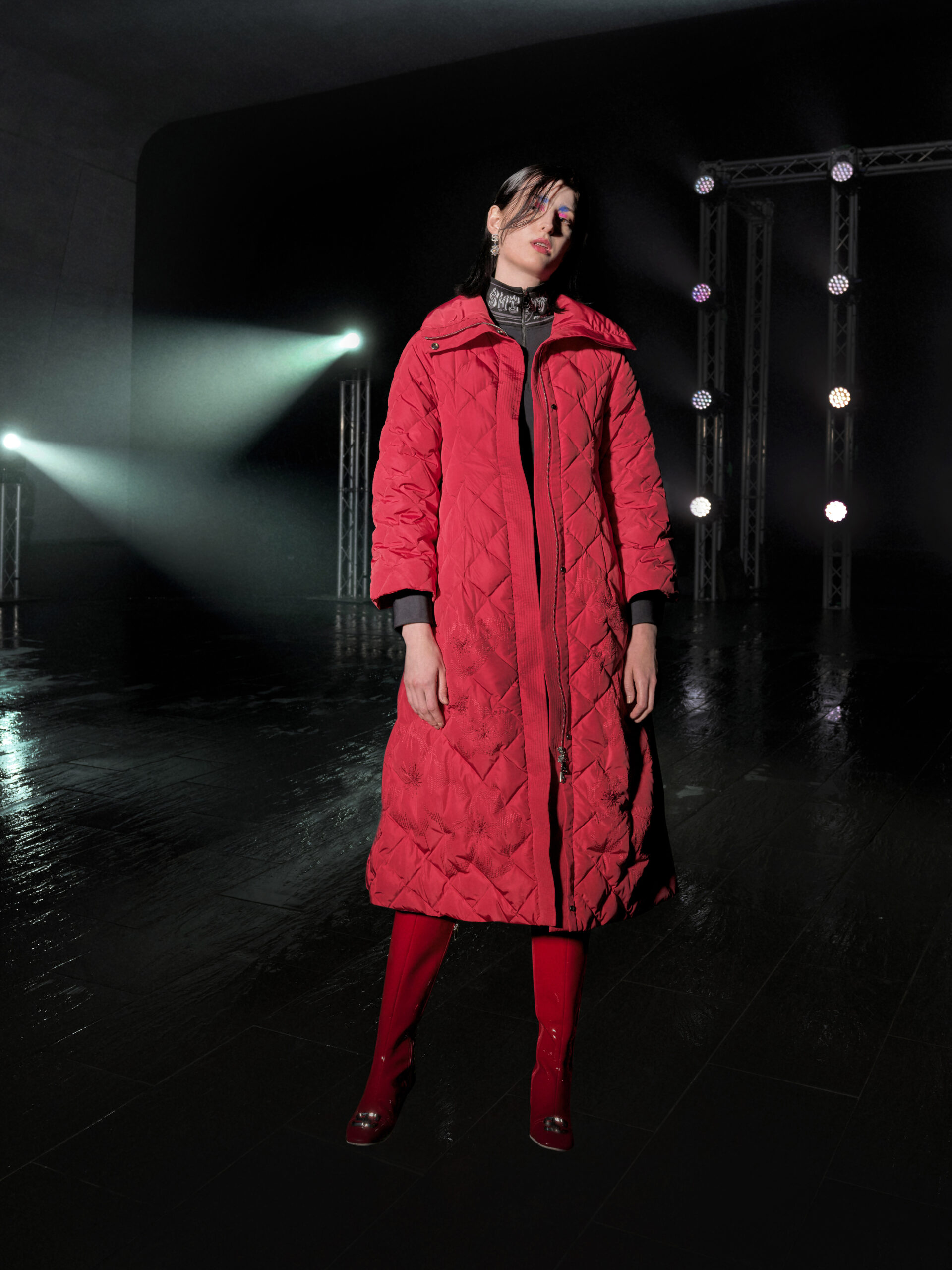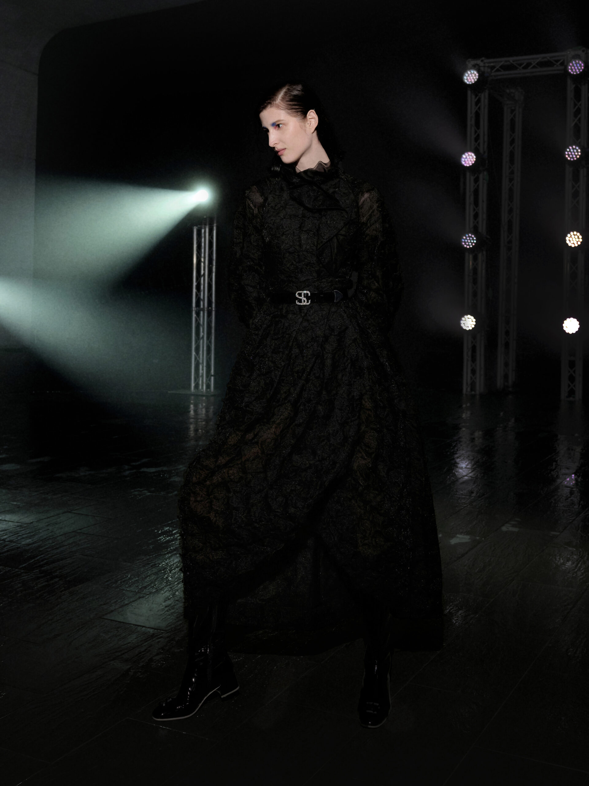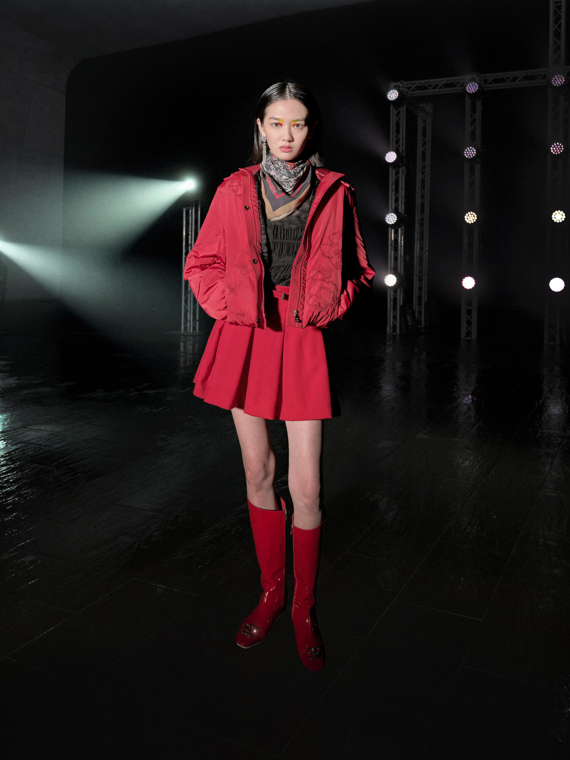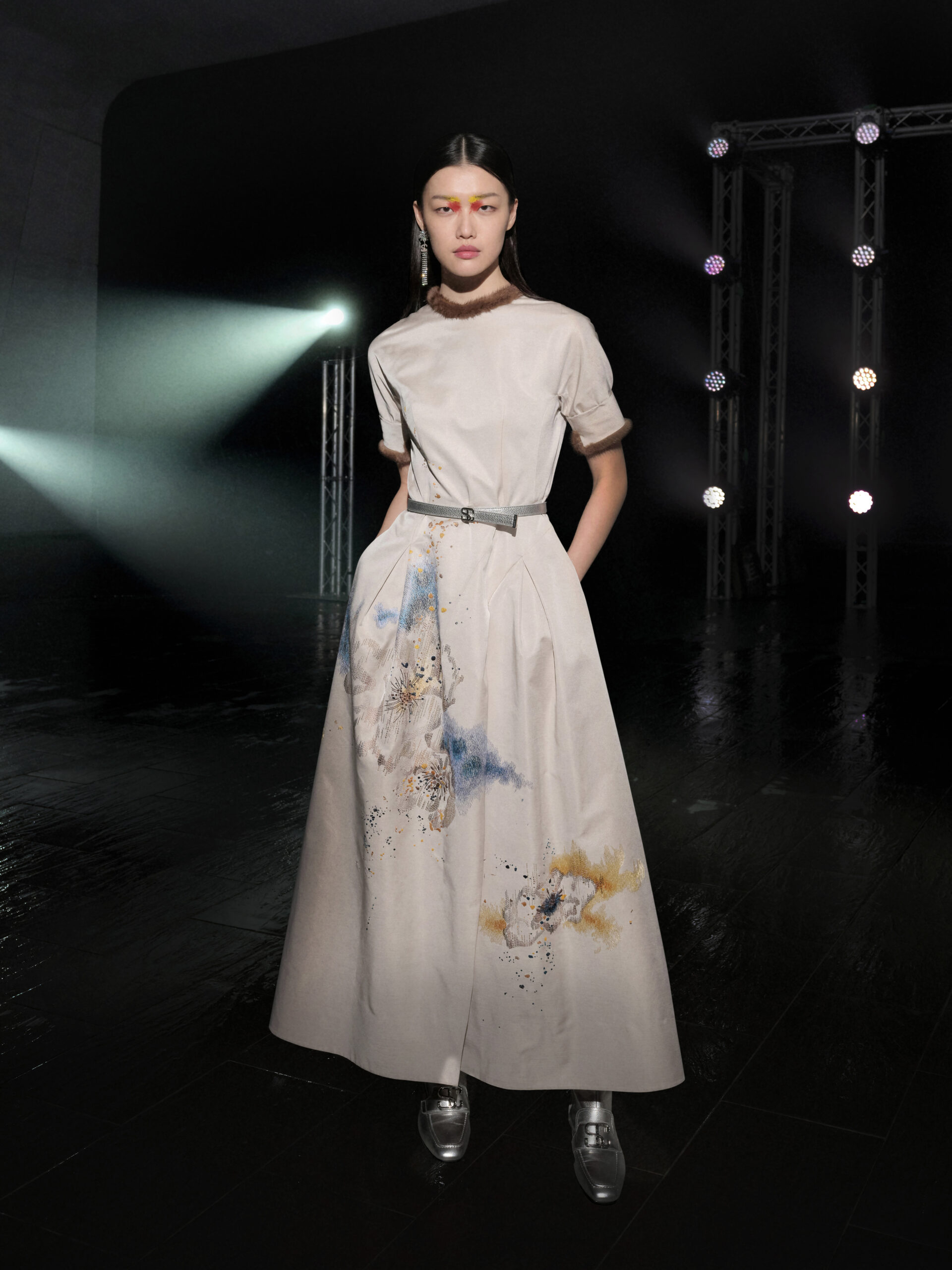 Whether it’s the past or the light, both are abstractly conceived in our minds, but deeply felt in our hearts. We transpose this idea poetically into our clothes. We draw on this spirit of harmonious oriental aesthetics, which combines opposition and perseverance, to concretely express sleek, slender contours that are as abundant as they are beautiful, starting with form-fitting, sporty ribbed-collar tops in line with the trend of recent years, accompanied by long, loose, fringed pants. It’s with this combination of casual and graceful that this collection begins. Then come hooded coats in metallic thread jacquard adorned with the house’s unique motifs, as well as H-line dresses, constituting the torch that ignites in the heart of darkness. Then, with padded diamond jackets sewn with metallic thread, shiny leather jackets and short skirts and patterned transparent organza tops, a fleeting, transient appearance is invoked, symbolizing light and fire. Finally, black and white, as the main colors, are used extensively on different fabrics, such as muslin with specially embossed fireworks motifs, metallic thread jacquard, muslin and lace, to which embossed sequins and feathers are added, to express the swirling of light in the dark night. In terms of color scheme, we see an abundance of flamboyant reds, tapered fringed dresses, long red coats embroidered with padding, high-collared jackets embroidered with red satin. Delicate neon-colored windings are abundantly used in long black and white chiffon umbrella skirts, long embroidered silk tulle skirts and wool jackets. Light purple wool jackets, patterned pink knit coats, brown leather jackets and skirts with sequins and peach-colored organza sleeves also radiate an infinite vitality saturated with brilliance. Finally, there’s boundless black adorned with peacock-green sequins, reflecting the bright rays that shine through the darkness. The motifs used in this collection take as their inspiration the light of fire in its earliest moments, gunpowder smoke, fire sparks and fluorescent halos, representing on the one hand their own splendor and on the other hand that which is at the very origin of this splendor, for both exist in the same temporality and have the same importance.