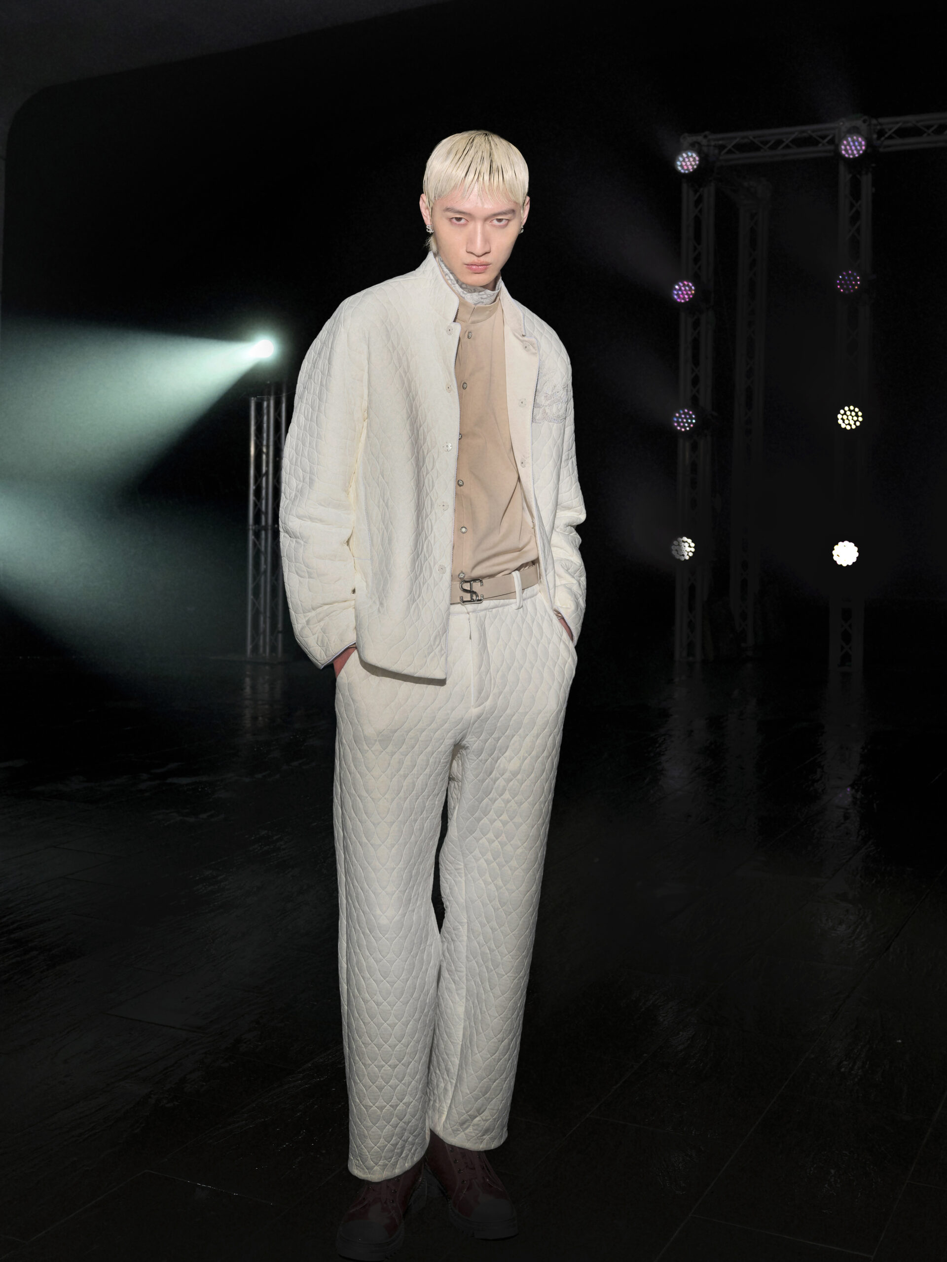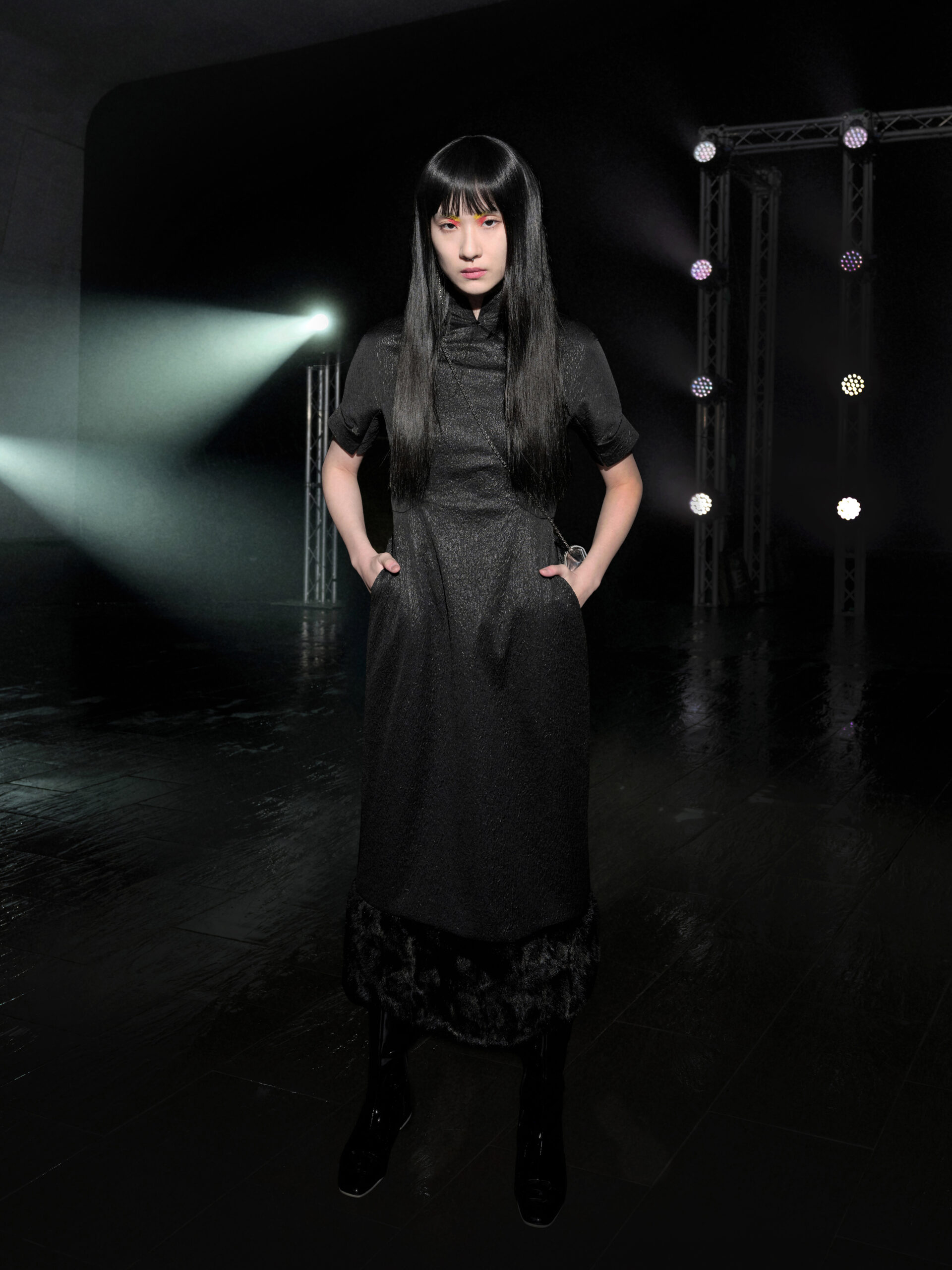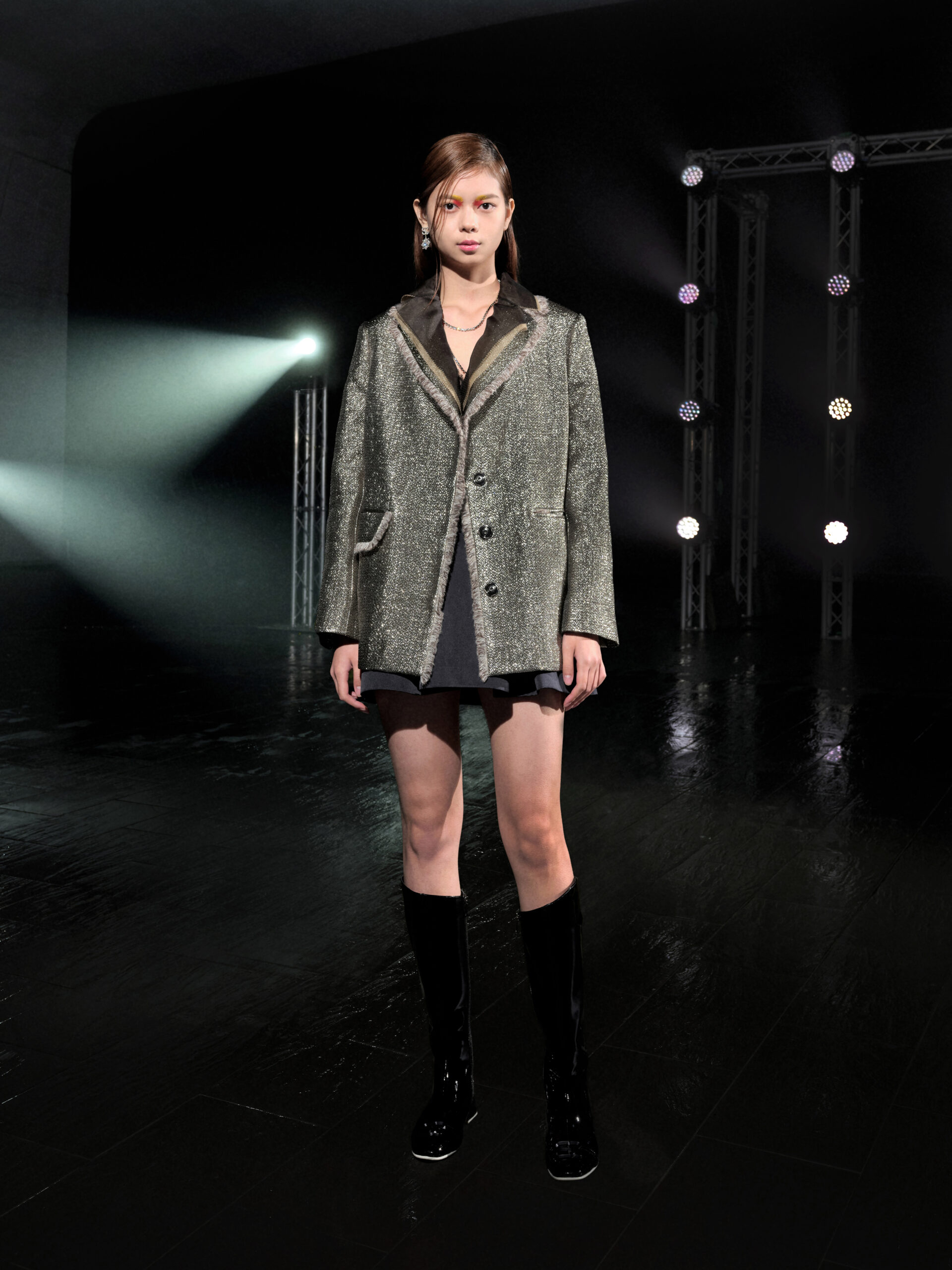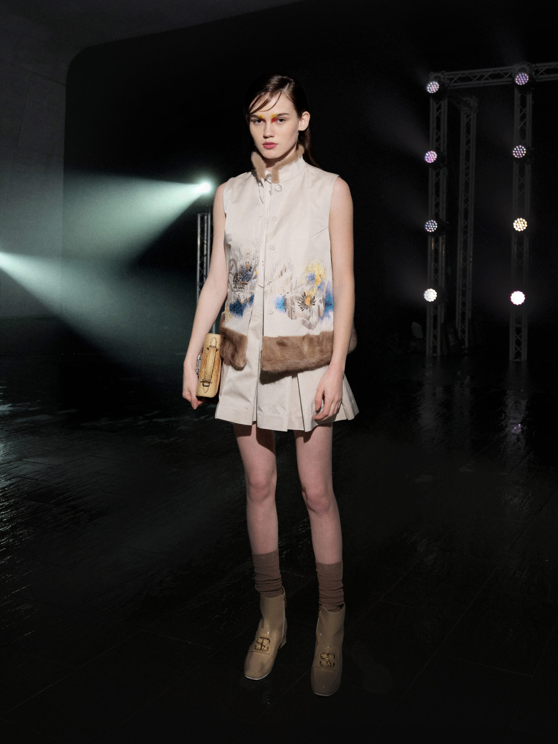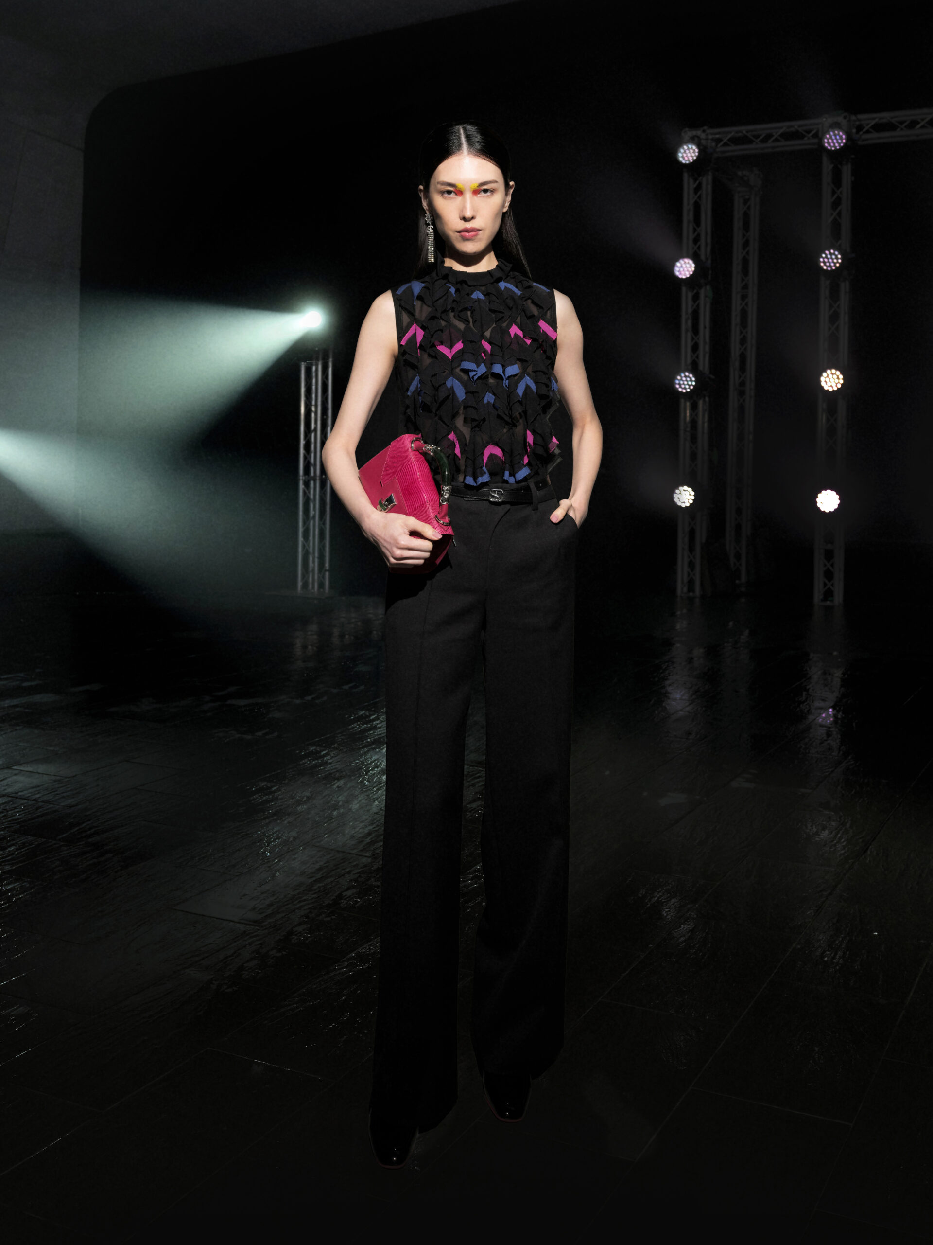Whether it’s the past or the light, both are abstractly conceived in our minds, but deeply felt in our hearts. We transpose this idea poetically into our clothes. We draw on this spirit of harmonious oriental aesthetics, which combines opposition and perseverance, to concretely express sleek, slender contours that are as abundant as they are beautiful, starting with form-fitting, sporty ribbed-collar tops in line with the trend of recent years, accompanied by long, loose, fringed pants. It’s with this combination of casual and graceful that this collection begins. Then come hooded coats in metallic thread jacquard adorned with the house’s unique motifs, as well as H-line dresses, constituting the torch that ignites in the heart of darkness. Then, with padded diamond jackets sewn with metallic thread, shiny leather jackets and short skirts and patterned transparent organza tops, a fleeting, transient appearance is invoked, symbolizing light and fire. Finally, black and white, as the main colors, are used extensively on different fabrics, such as muslin with specially embossed fireworks motifs, metallic thread jacquard, muslin and lace, to which embossed sequins and feathers are added, to express the swirling of light in the dark night. In terms of color scheme, we see an abundance of flamboyant reds, tapered fringed dresses, long red coats embroidered with padding, high-collared jackets embroidered with red satin. Delicate neon-colored windings are abundantly used in long black and white chiffon umbrella skirts, long embroidered silk tulle skirts and wool jackets. Light purple wool jackets, patterned pink knit coats, brown leather jackets and skirts with sequins and peach-colored organza sleeves also radiate an infinite vitality saturated with brilliance. Finally, there’s boundless black adorned with peacock-green sequins, reflecting the bright rays that shine through the darkness. The motifs used in this collection take as their inspiration the light of fire in its earliest moments, gunpowder smoke, fire sparks and fluorescent halos, representing on the one hand their own splendor and on the other hand that which is at the very origin of this splendor, for both exist in the same temporality and have the same importance.
