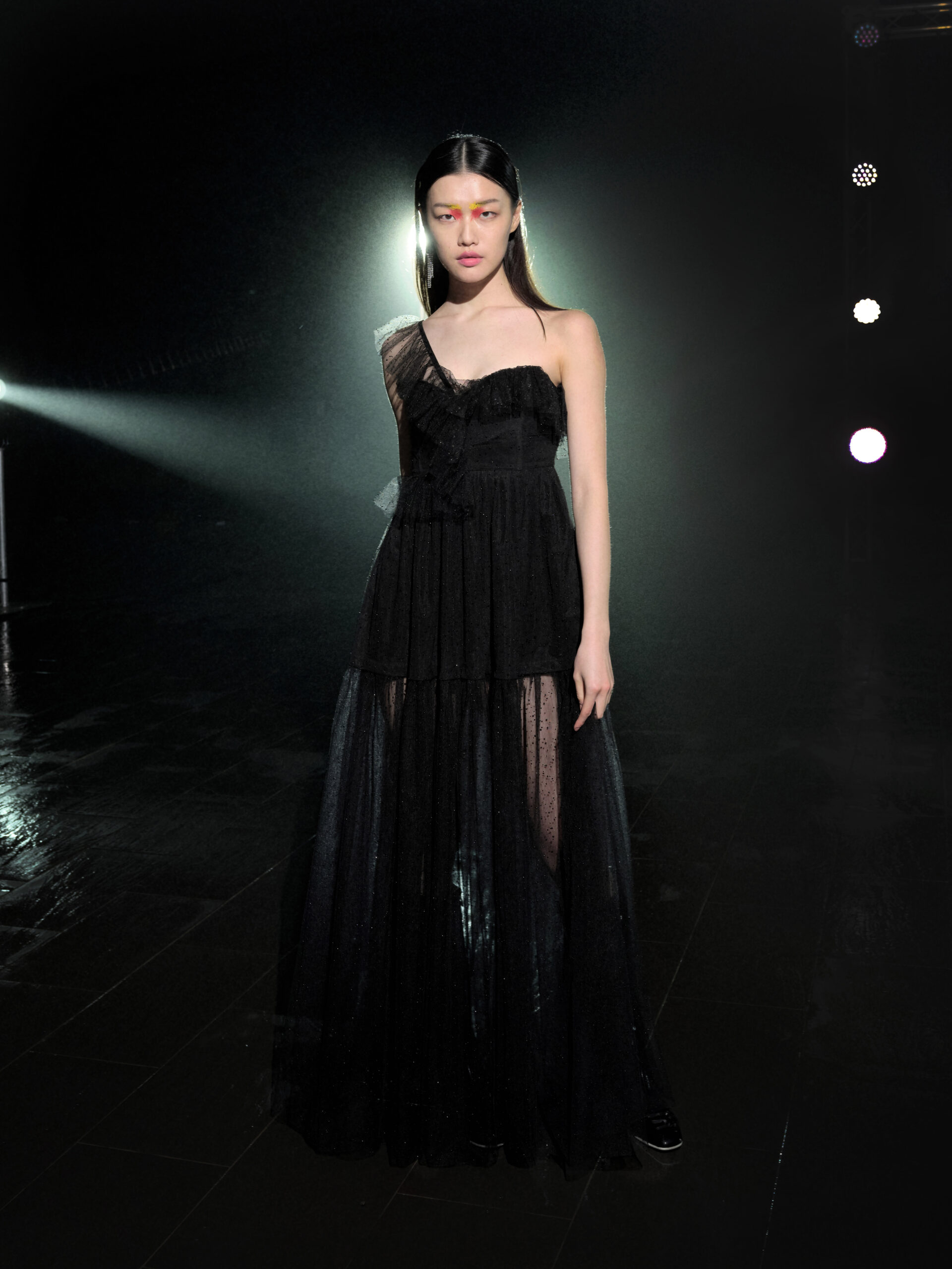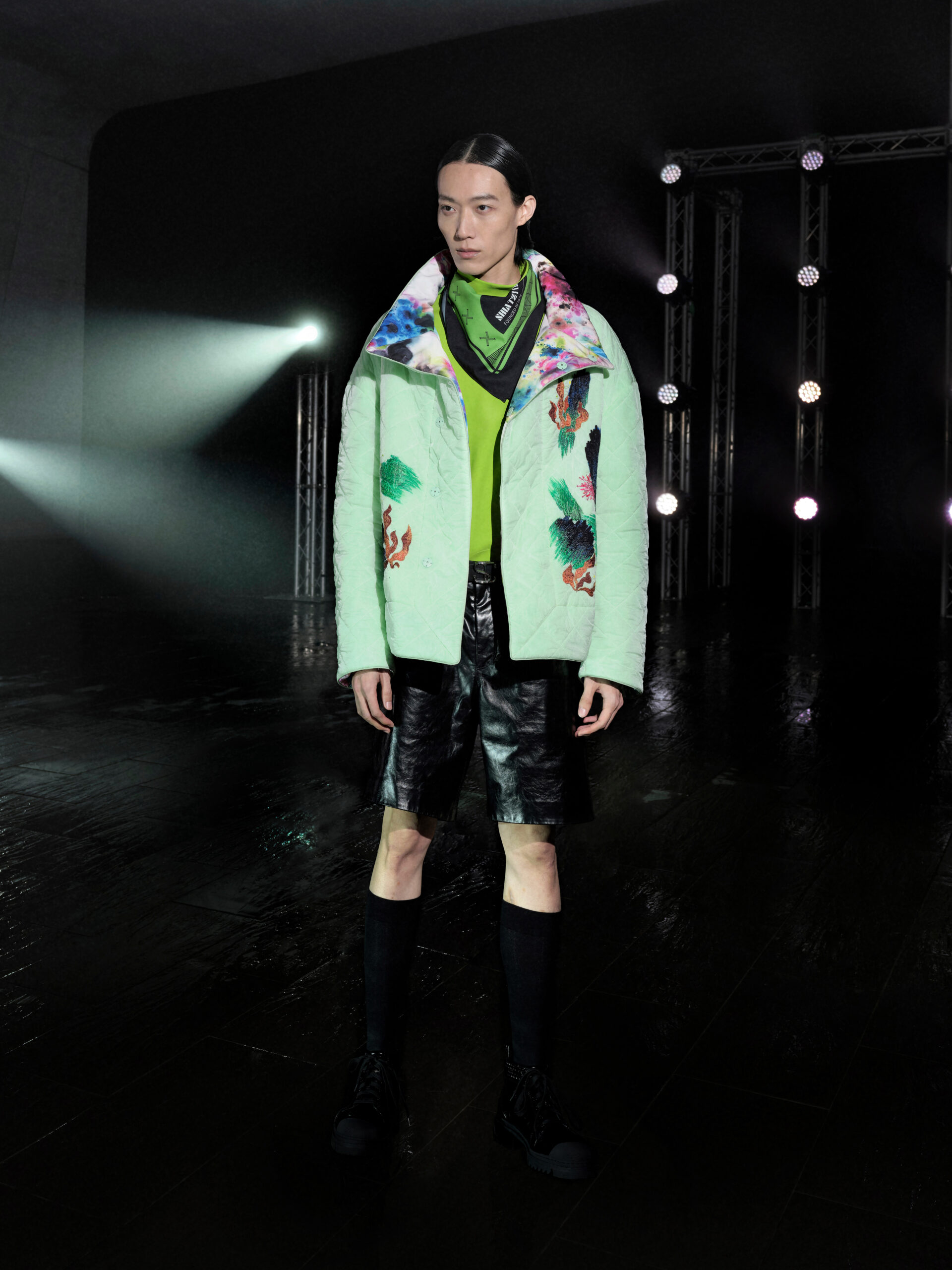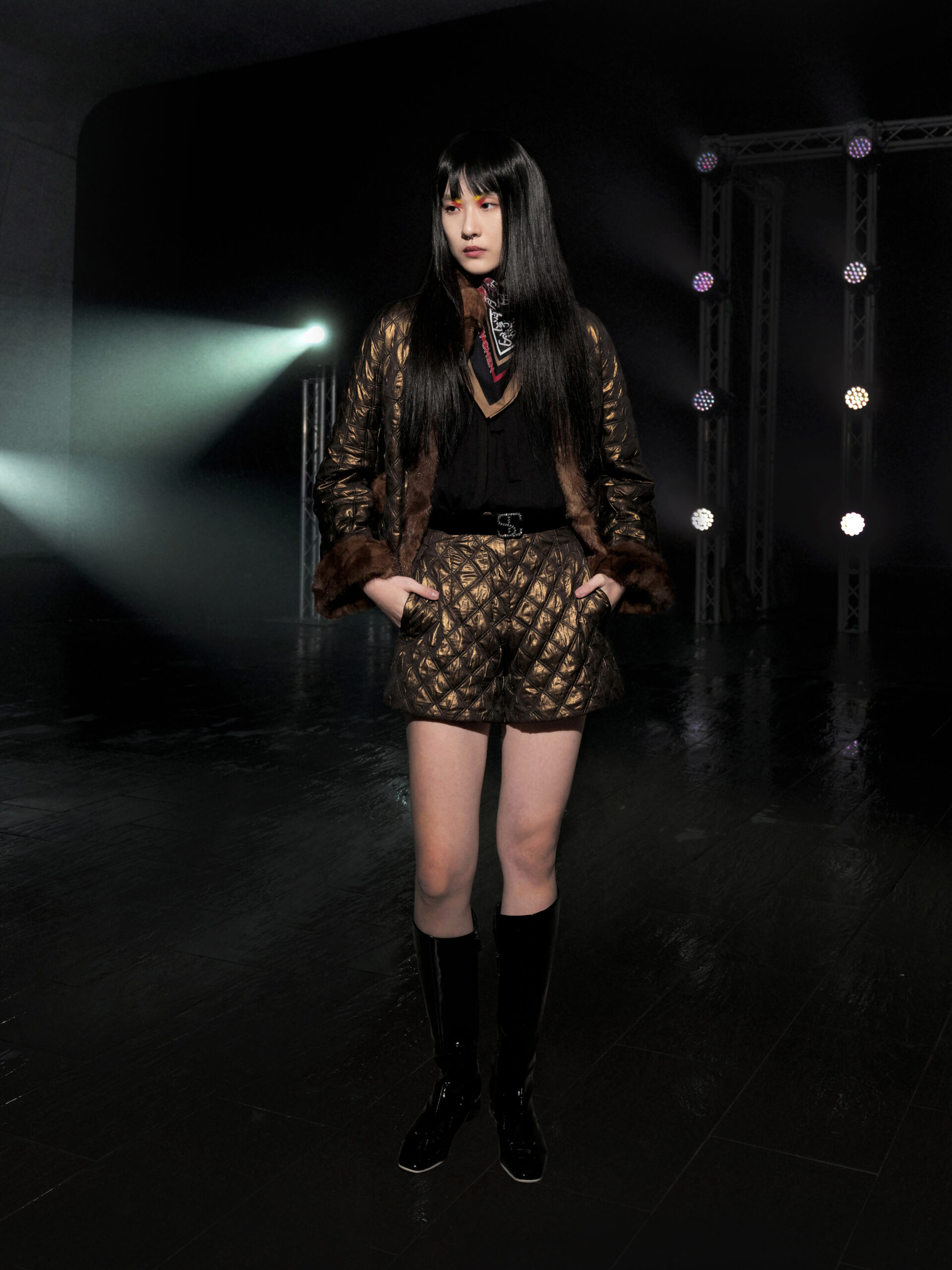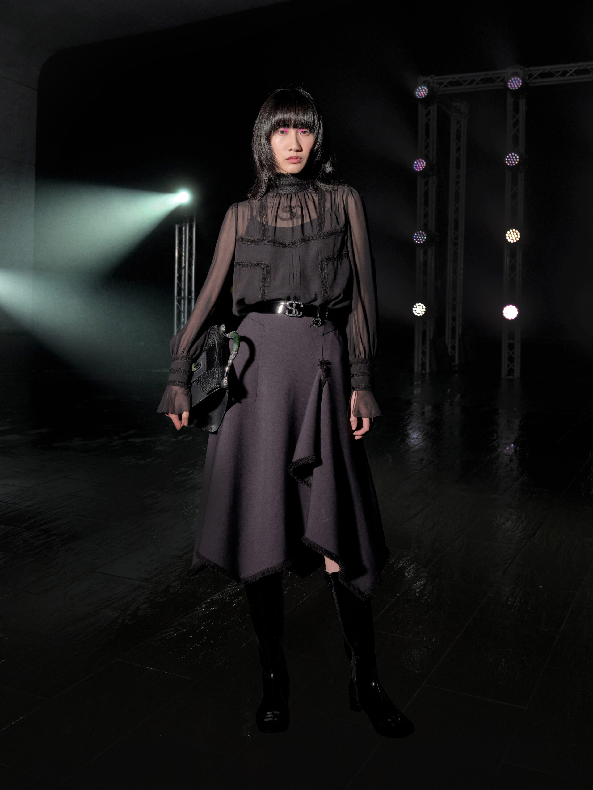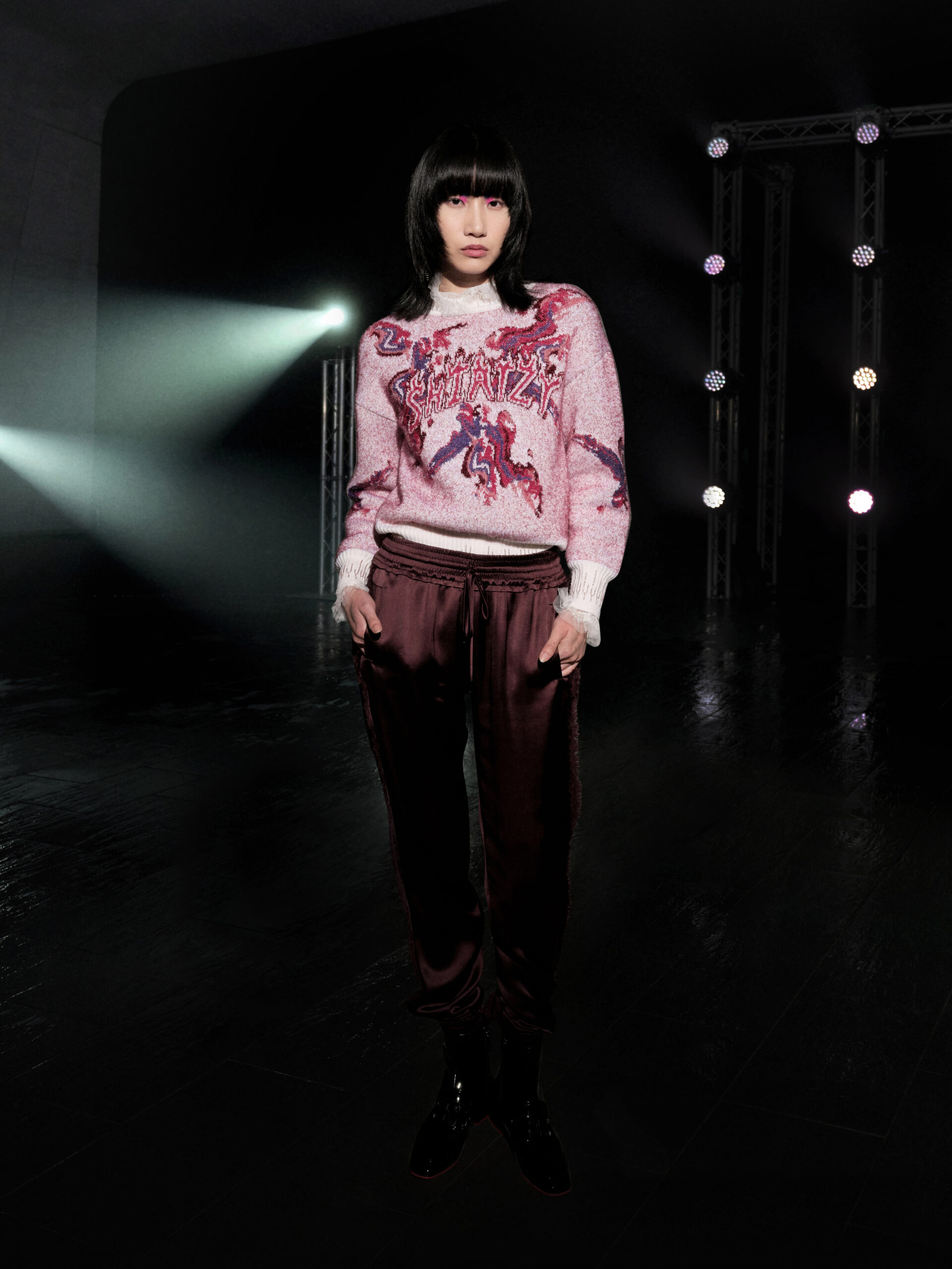 Whether it’s the past or the light, both are abstractly conceived in our minds, but deeply felt in our hearts. We transpose this idea poetically into our clothes. We draw on this spirit of harmonious oriental aesthetics, which combines opposition and perseverance, to concretely express sleek, slender contours that are as abundant as they are beautiful, starting with form-fitting, sporty ribbed-collar tops in line with the trend of recent years, accompanied by long, loose, fringed pants. It’s with this combination of casual and graceful that this collection begins. Then come hooded coats in metallic thread jacquard adorned with the house’s unique motifs, as well as H-line dresses, constituting the torch that ignites in the heart of darkness. Then, with padded diamond jackets sewn with metallic thread, shiny leather jackets and short skirts and patterned transparent organza tops, a fleeting, transient appearance is invoked, symbolizing light and fire. Finally, black and white, as the main colors, are used extensively on different fabrics, such as muslin with specially embossed fireworks motifs, metallic thread jacquard, muslin and lace, to which embossed sequins and feathers are added, to express the swirling of light in the dark night. In terms of color scheme, we see an abundance of flamboyant reds, tapered fringed dresses, long red coats embroidered with padding, high-collared jackets embroidered with red satin. Delicate neon-colored windings are abundantly used in long black and white chiffon umbrella skirts, long embroidered silk tulle skirts and wool jackets. Light purple wool jackets, patterned pink knit coats, brown leather jackets and skirts with sequins and peach-colored organza sleeves also radiate an infinite vitality saturated with brilliance. Finally, there’s boundless black adorned with peacock-green sequins, reflecting the bright rays that shine through the darkness. The motifs used in this collection take as their inspiration the light of fire in its earliest moments, gunpowder smoke, fire sparks and fluorescent halos, representing on the one hand their own splendor and on the other hand that which is at the very origin of this splendor, for both exist in the same temporality and have the same importance.