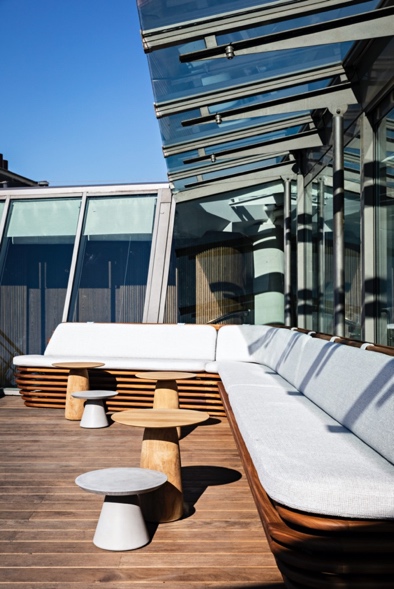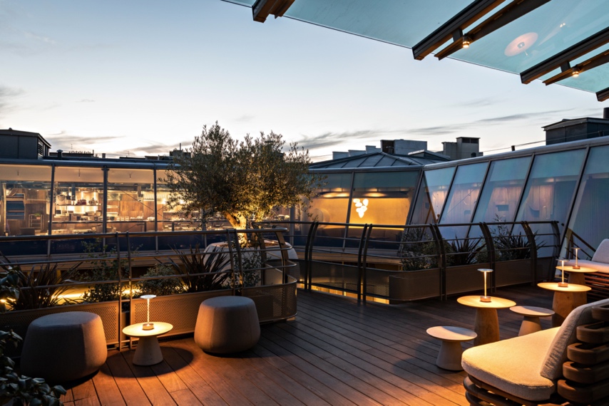 The restaurant opens naturally, through huge sliding glass windows, onto a sublime garden suspended over the rooftops of Paris. Imagined by Raphael Navot as the prow of a ship, with a century-old olive tree floating at its summit, it reflects the beauty of nature and the elements. Sheltered from the hustle and bustle of Paris, this unique garden, peaceful and comfortable, offers the chance to enjoy the fine bubbles of a grand cru Champagne, a colorful cocktail or simply a coffee, with a panoramic view of the kitchens and bar.