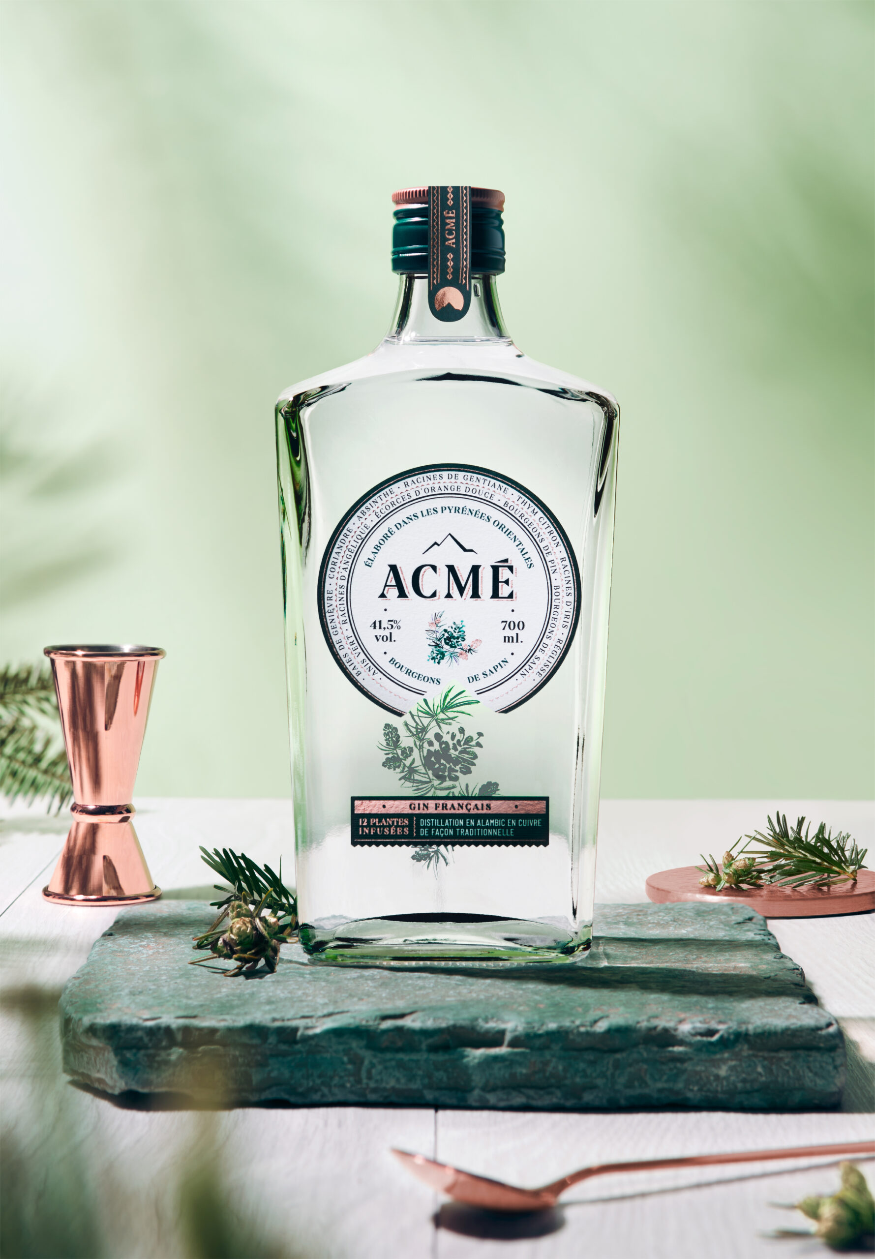 ACMÉ gin showcases the diversity of aromatic plants and owes its unique style to an original recipe featuring fir buds selected not only for their quality, but also for their taste. These fir buds are hand-picked in the mountains of France. Super-premium, this new “made in France” gin is distinguished above all by its unique personality: a profile of great freshness and rare intensity.