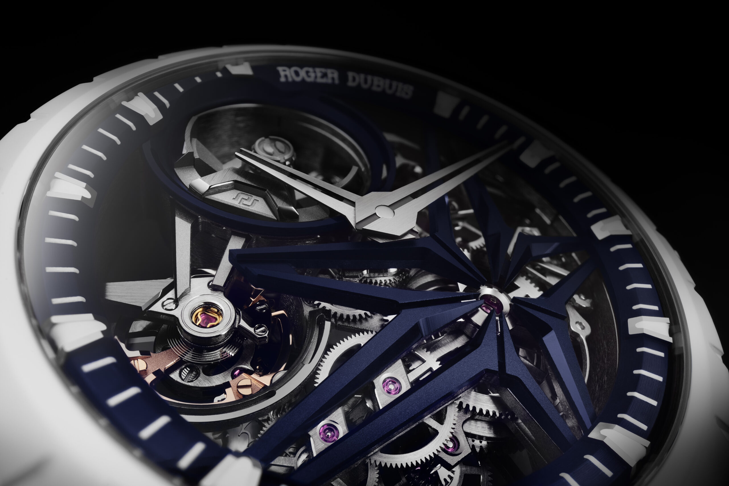 Roger Dubuis dévoile aujourd’hui le fruit de cette collaboration : une édition limitée de l’Excalibur MB. Tout en conservant la forme de son étoile signature, la Maison a choisi de la décliner en bleu marine, l’une des couleurs phares d’Hypebeast qu’elle a également appliquée au rehaut et au pourtour du microrotor.