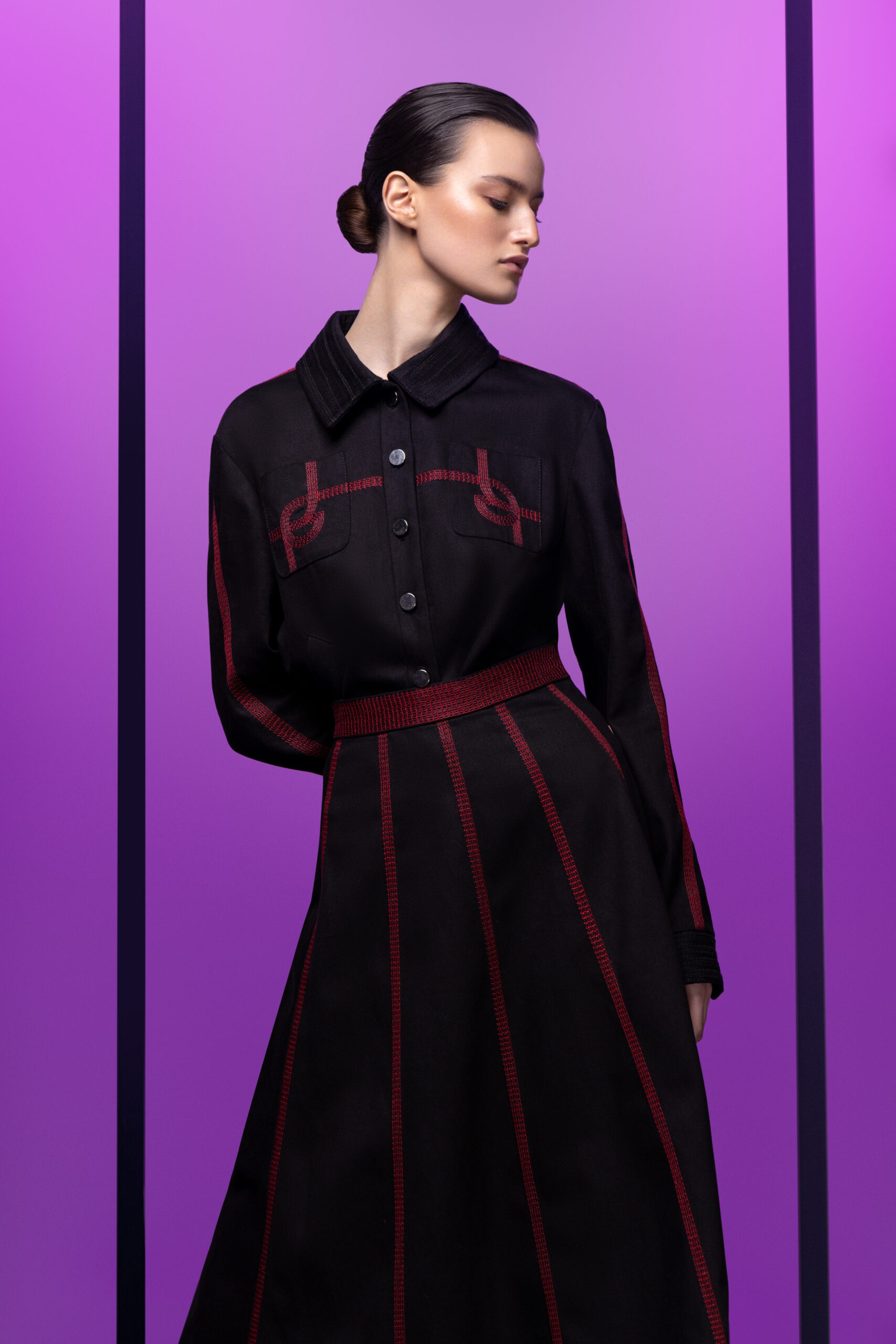 This collection of dark, sophisticated expressions evokes captivating allure, sumptuous opulence and pure power in the moment. Vivid touches of saturated color add shimmer to strong silhouettes in dominant shades of black. Like bursts of exhilaration, Sangria and Purple Magic sequins splash across tulle-embroidered costumes. In the same breath, Fanfare Aqua and a touch of Nautical Blue cascade over strapless dresses and plunging V-neck gowns, illuminating more defined lines. Floral buttons dot New Red scuba miniskirts and Moonflower White cotton shirts, while three-dimensional foliage blooms in boxy leather shirts and matching A-line skirts. Embroidered geometric monograms slip youthfully onto structured denim skirts, emphasizing contours with illusions of movement.
