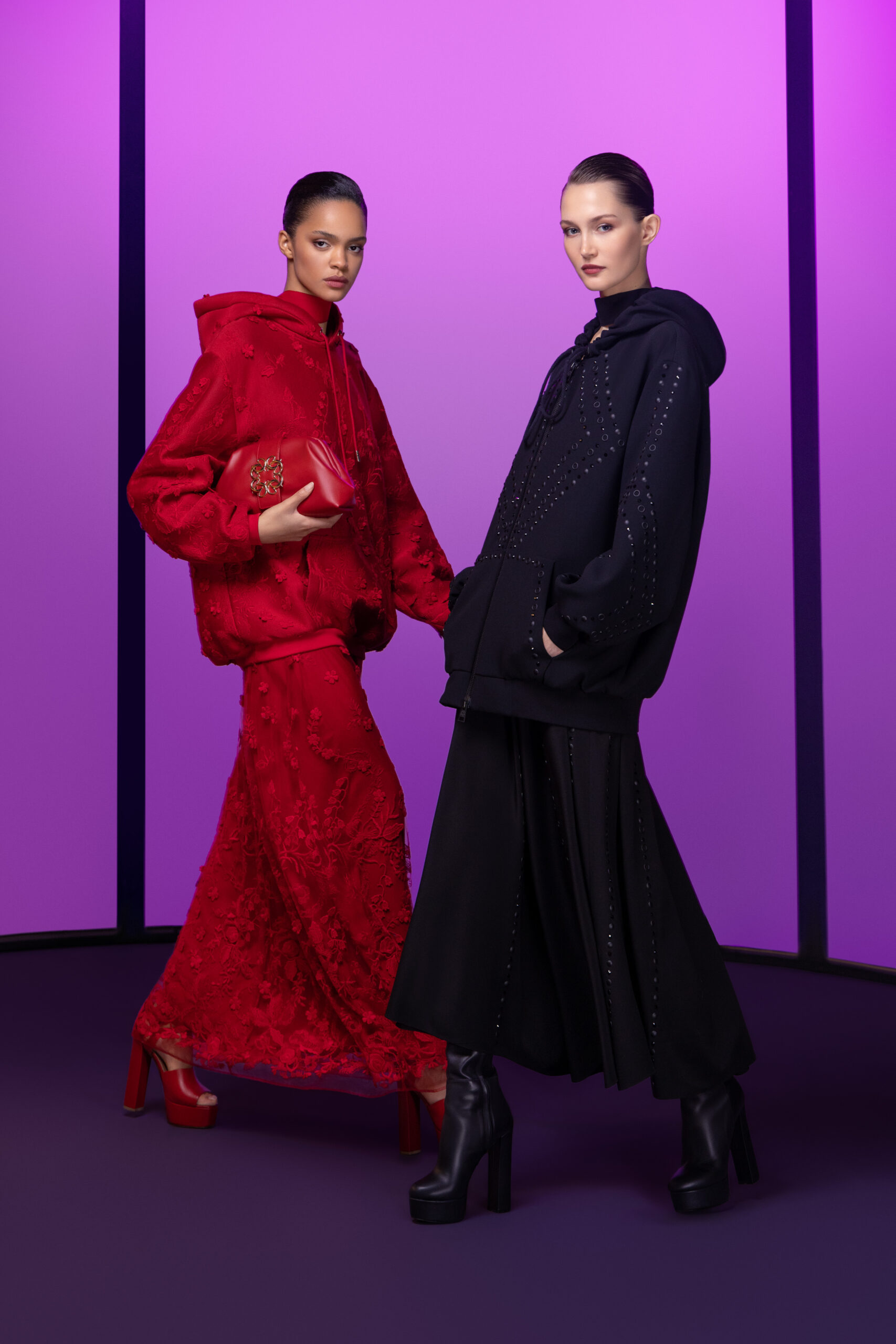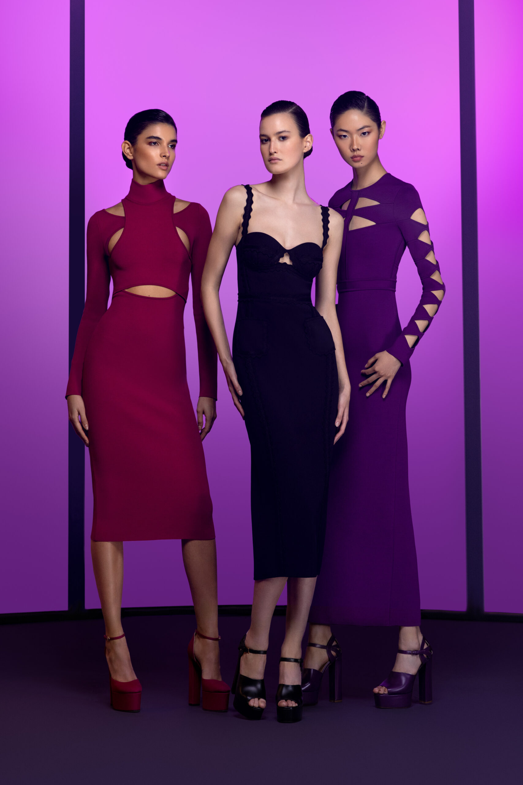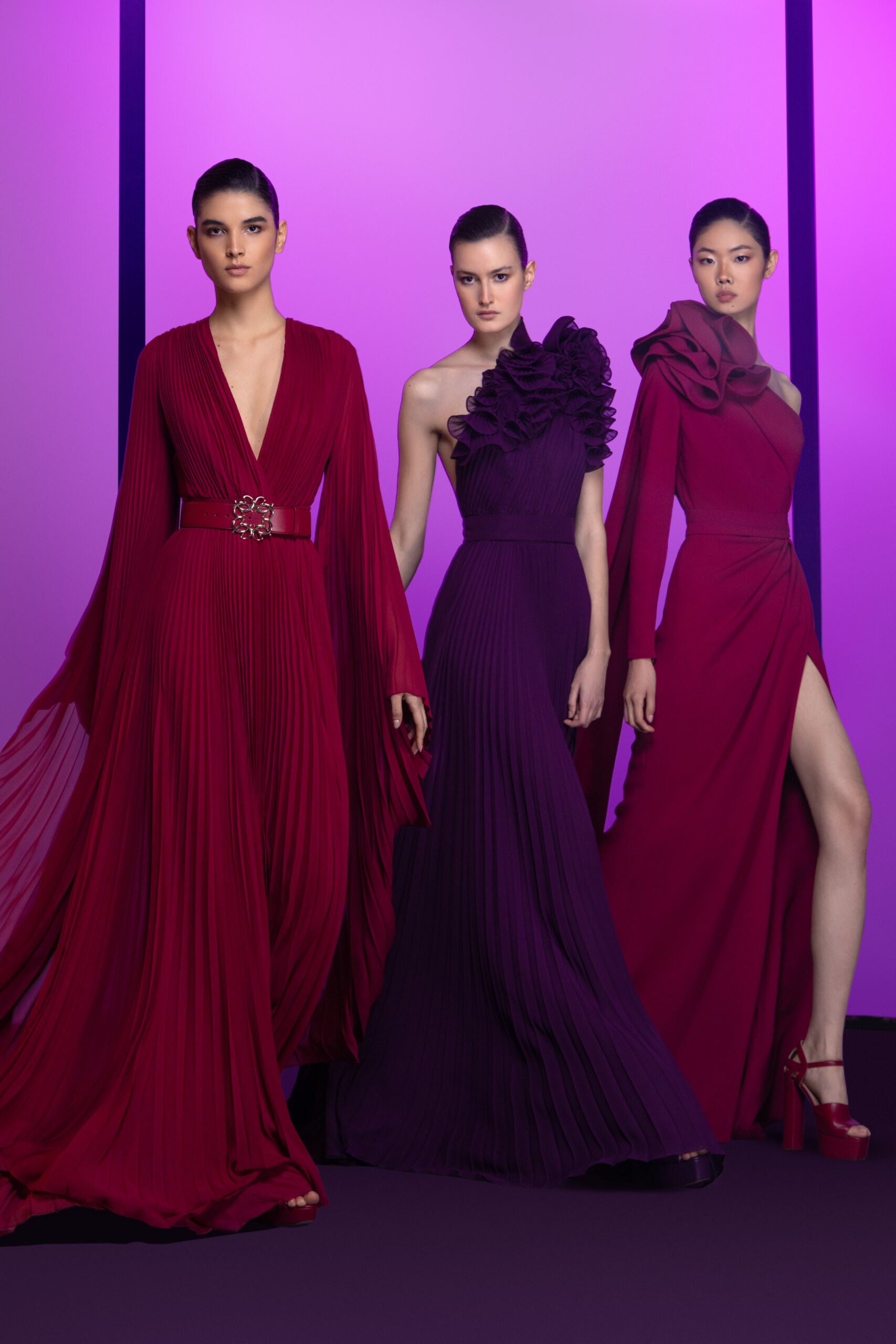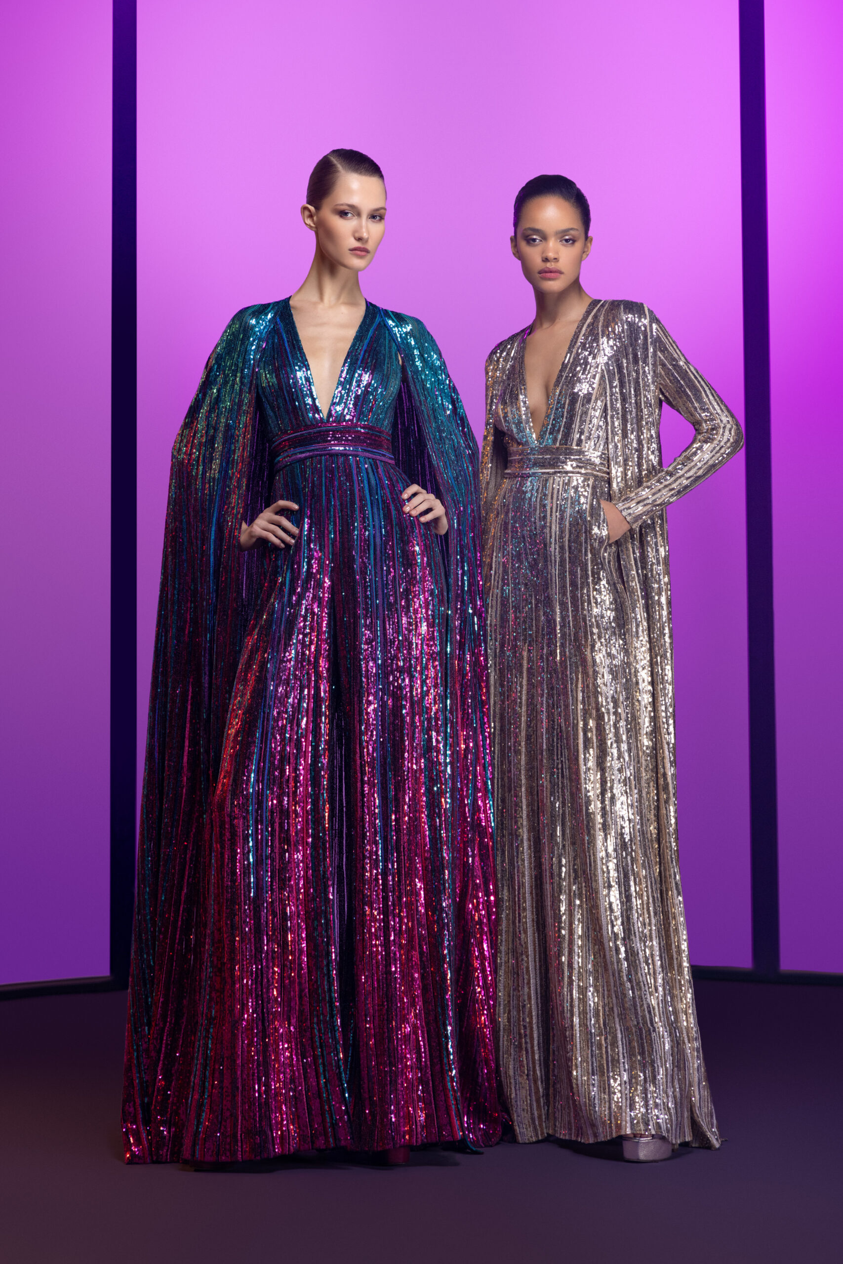 come together to create sumptuous turtleneck jumpsuits and long, symmetrical A-line mermaid dresses that shimmer and sparkle like the depths of night. ELIE SAAB’s essential crepe cady cocktail dresses and form-fitting gowns stretch into voluminous, low-cut swirls. Voluminous embellishments are balanced by striking cut-outs and the quintessential cinched waist.