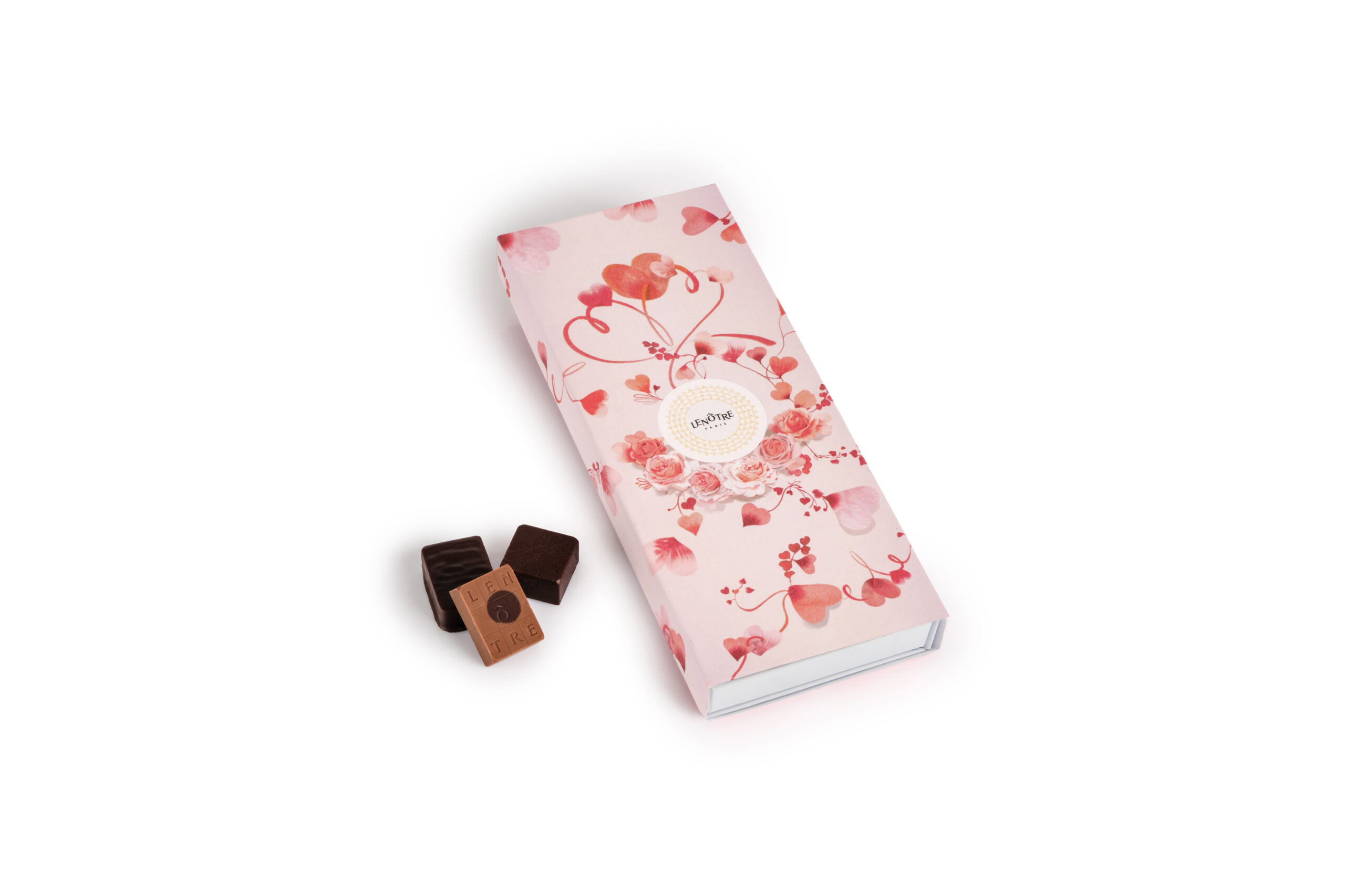 Once again this year, the House called on artist Sophie Griotto to illustrate the visual universe of its Valentine’s Day collection. Inspired by the finesse of Asian paintings from which she draws her poetic and calligraphic line, Sophie Griotto expresses here the feeling of love through a flight of rose petals in the shape of a heart, worked in different graphic textures like the different facets of love. Carried away by a whirlwind of love, the petals detach from the crown of flowers while remaining linked by a red thread symbolizing eternal love. Chocolate Heart Entremets For chocolate lovers… On a crunchy chocolate cookie base and a crispy layer of hazelnut praline feuilletine, a melting heart of dark and milk chocolate cream is delicately placed. The whole thing is coated with a creamy dark chocolate mousse and decorated with a fine chocolate mirror icing.