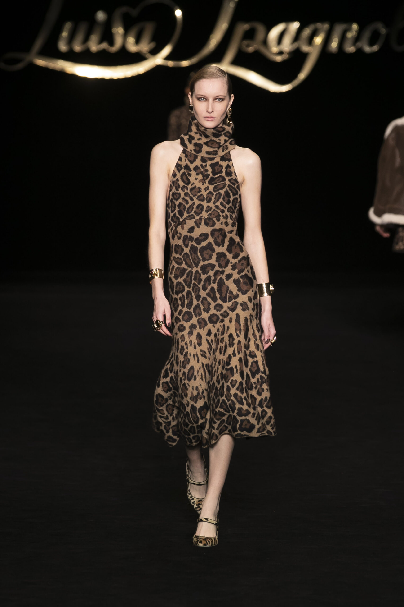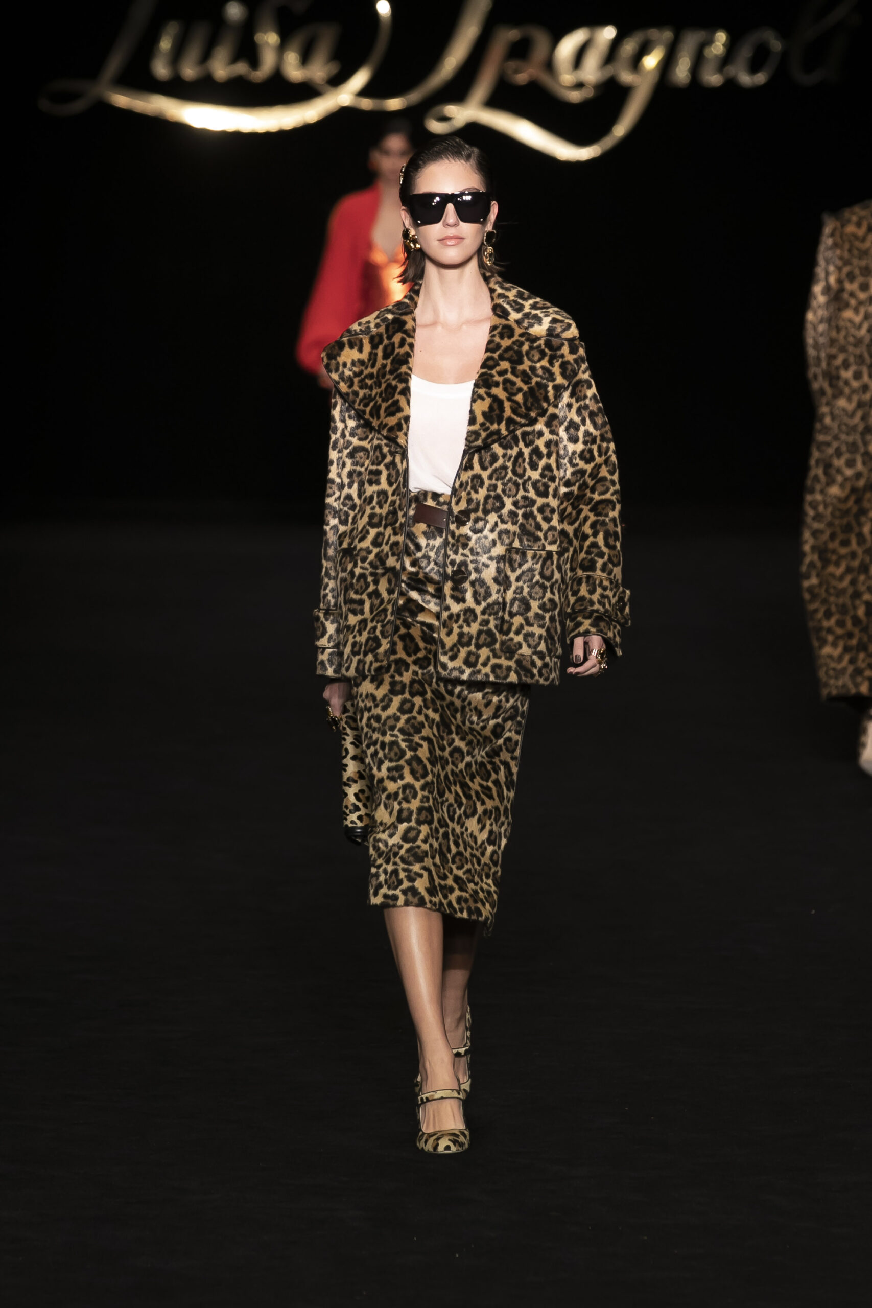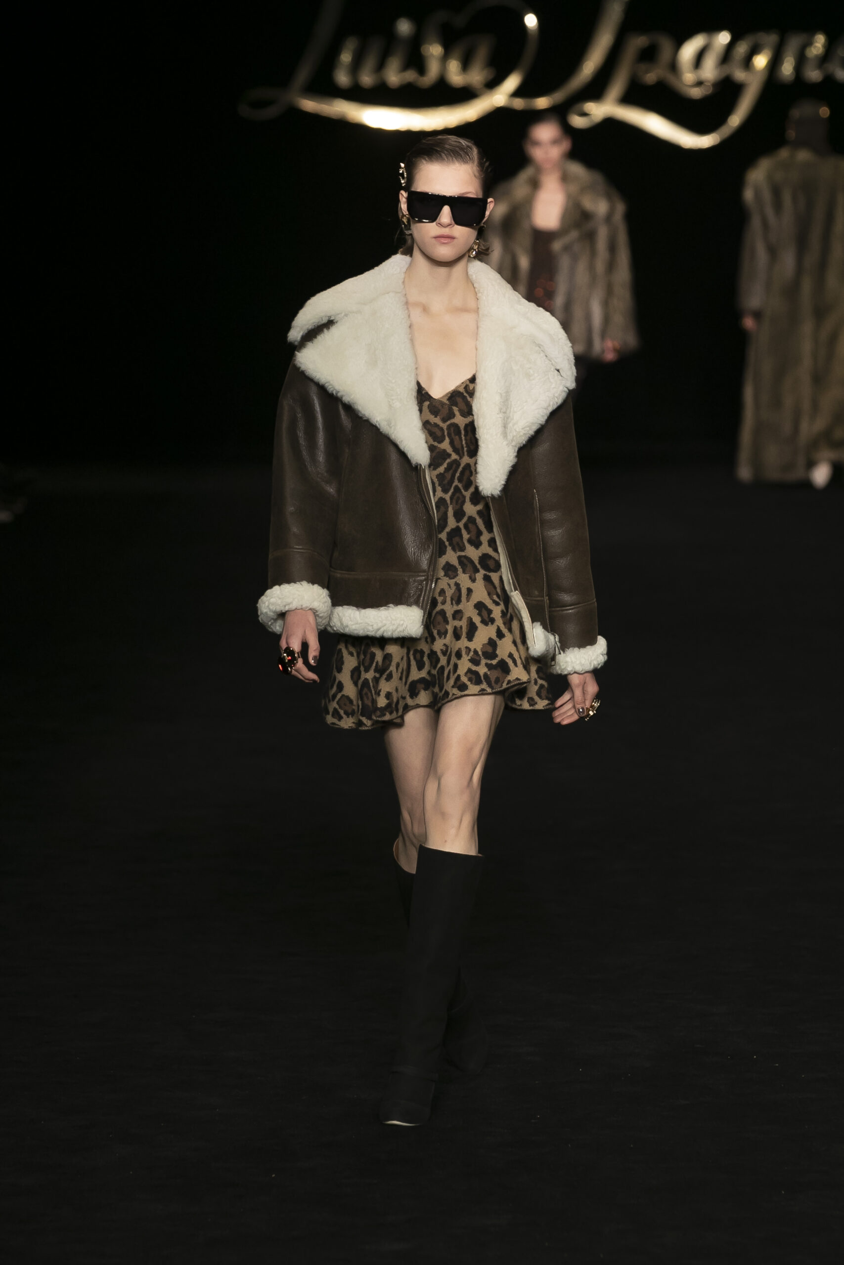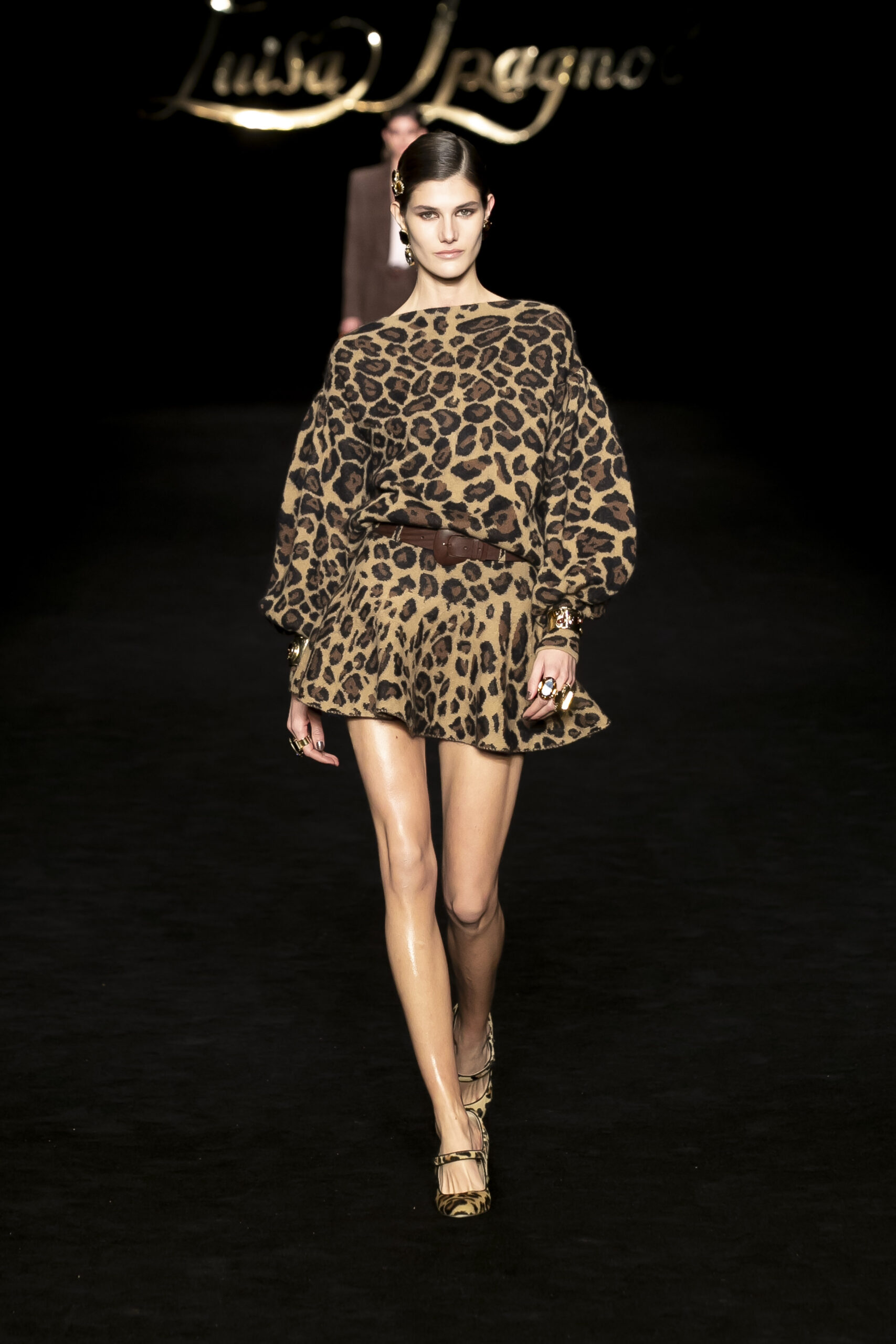 Looks are accessorized with clutch bags in suede, leather and faux fur with leopard and astrakhan patterns, suede belts, and Mary Jane footwear, in suede and faux leopard, done in pump and knee-high boot versions.