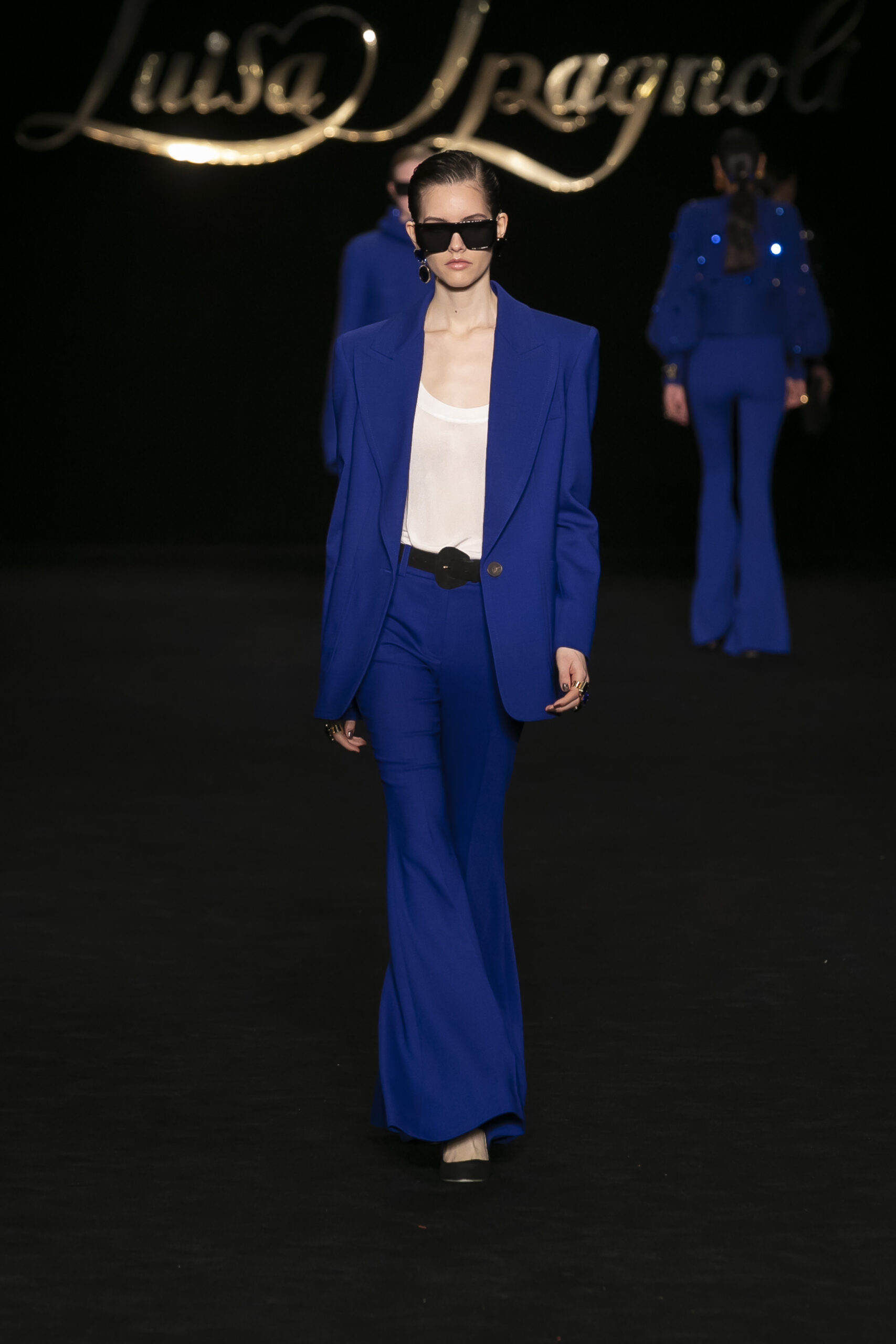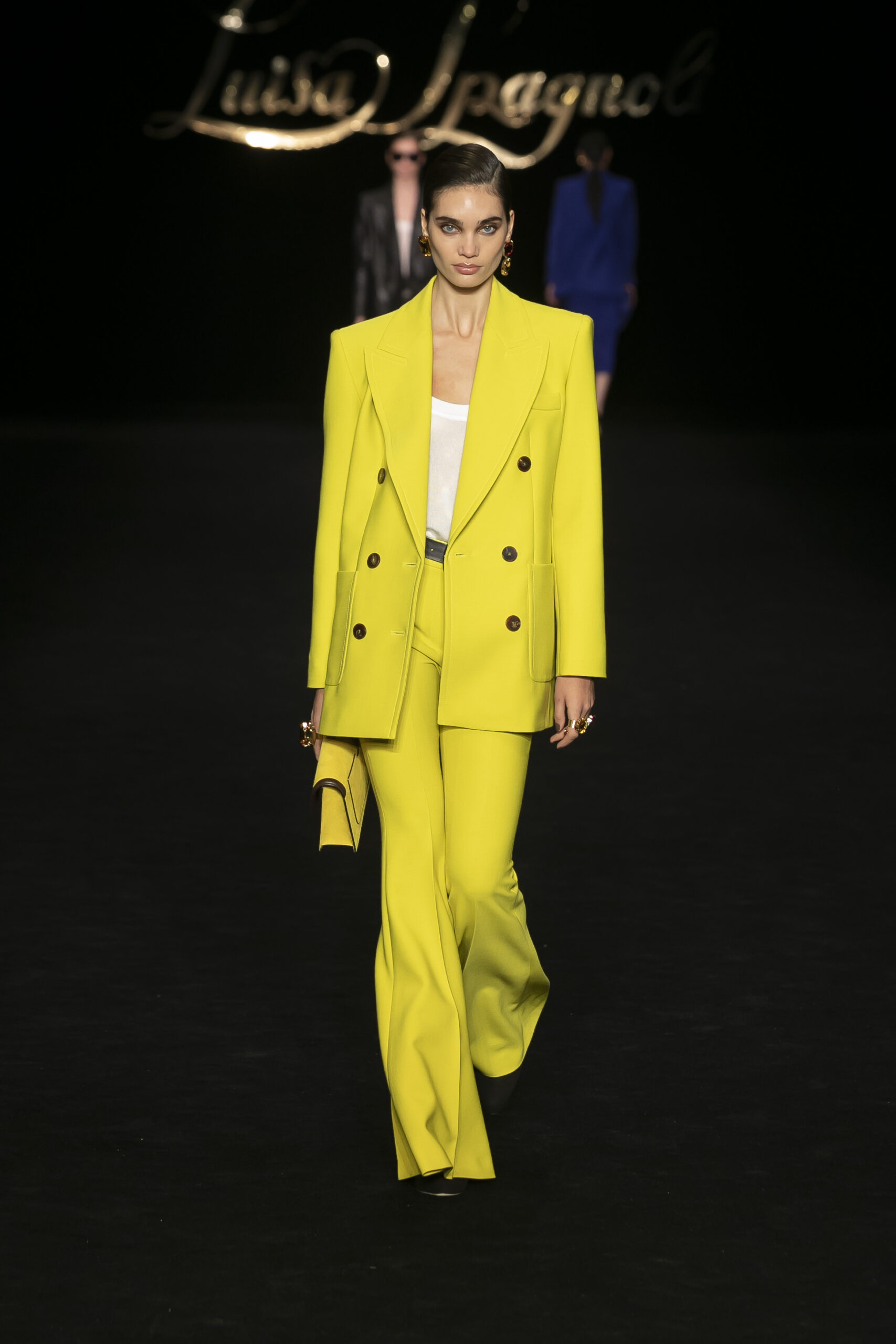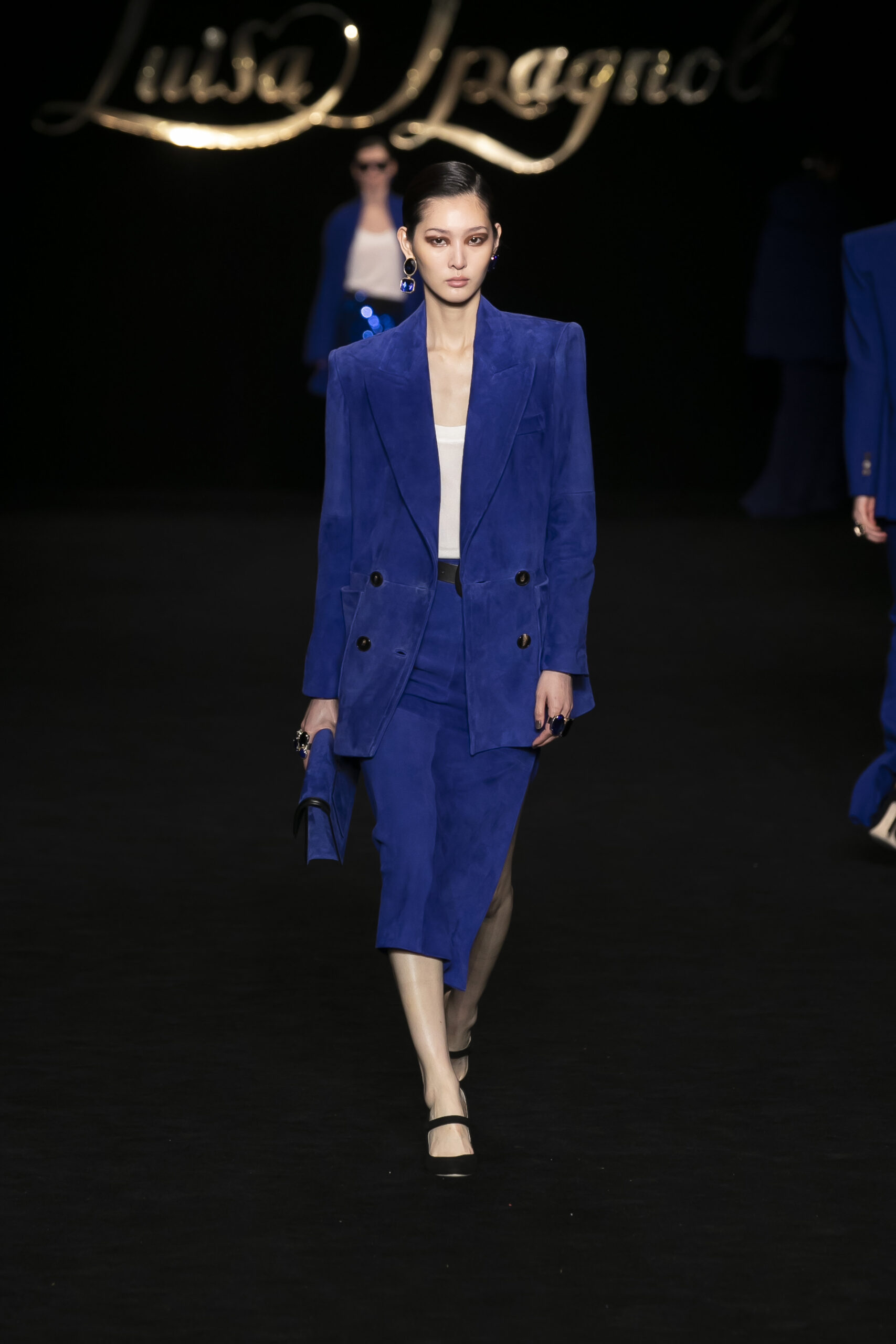 The statement coat is reworked into oversize peacoats and blazers, the latter part of wool crepe pantsuits with power shoulders and flared bottoms elongating the silhouette. Suede options are offered in tobacco brown and blue while a leather tuxedo number with grosgrain piping furthers the penchant of Luisa Spagnoliโs muses for dressing to the nines.