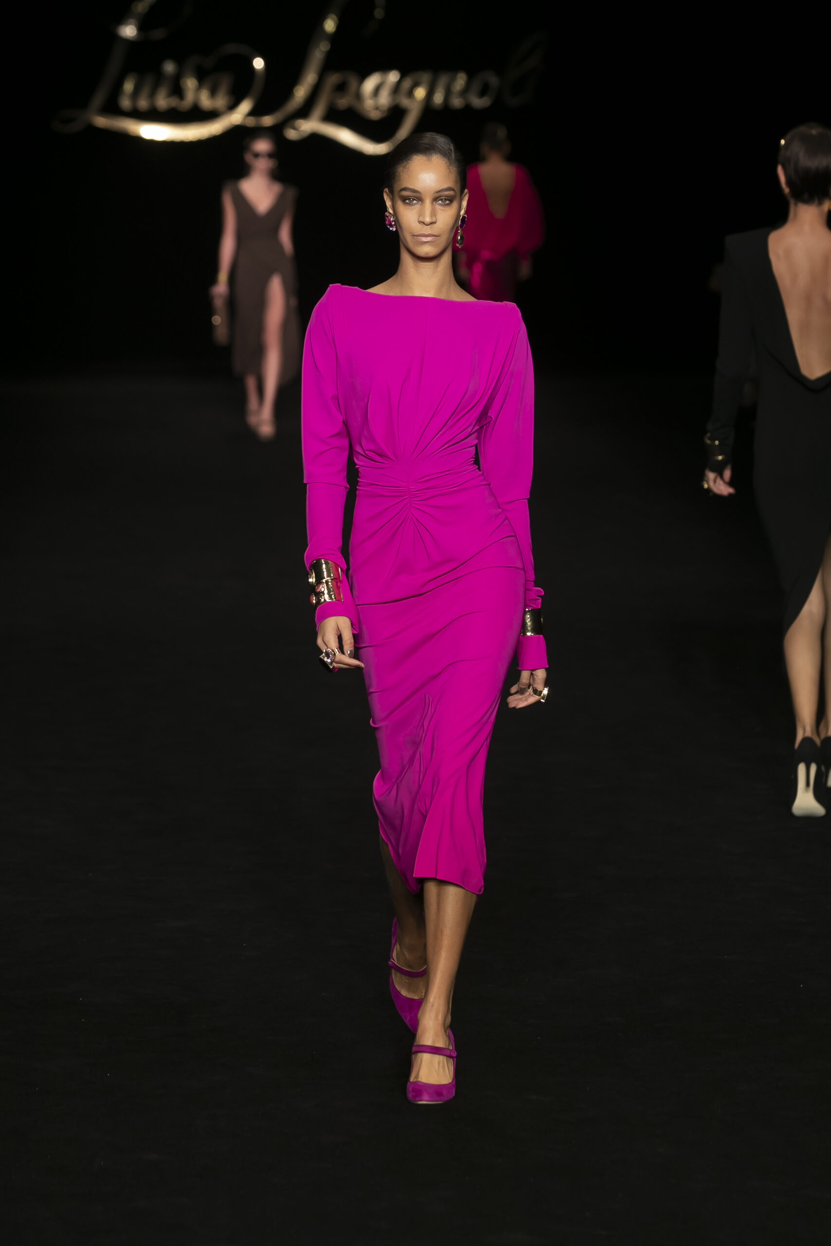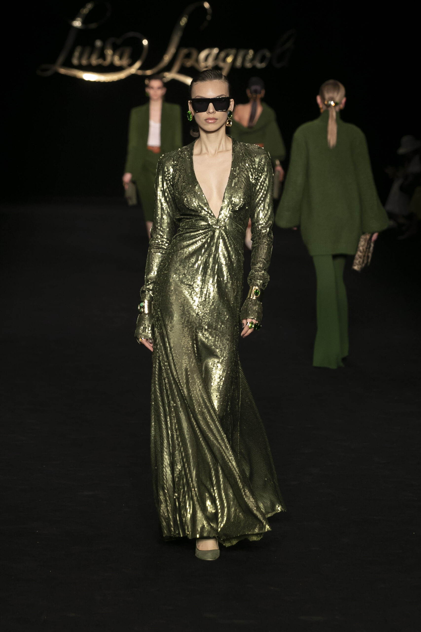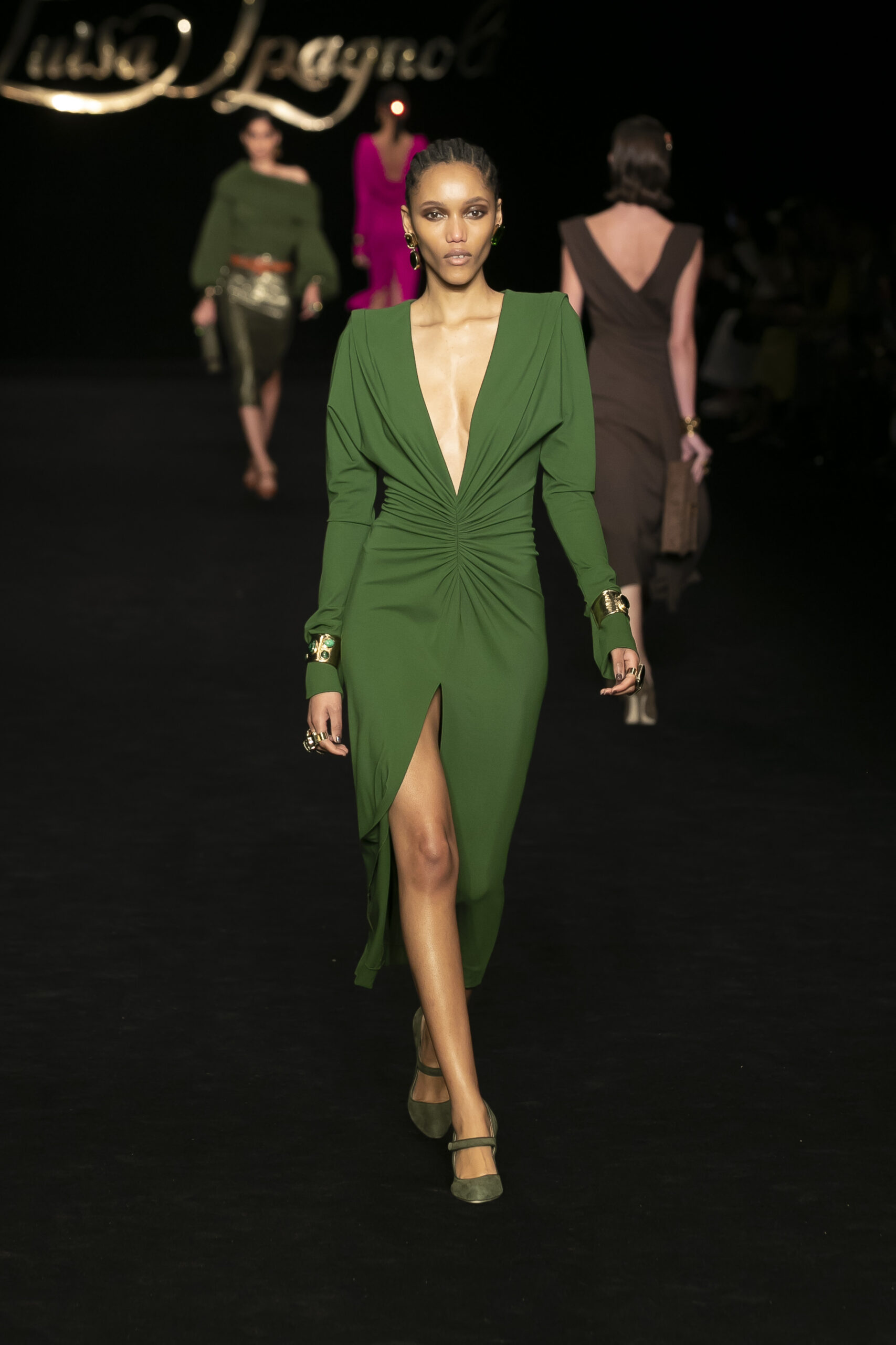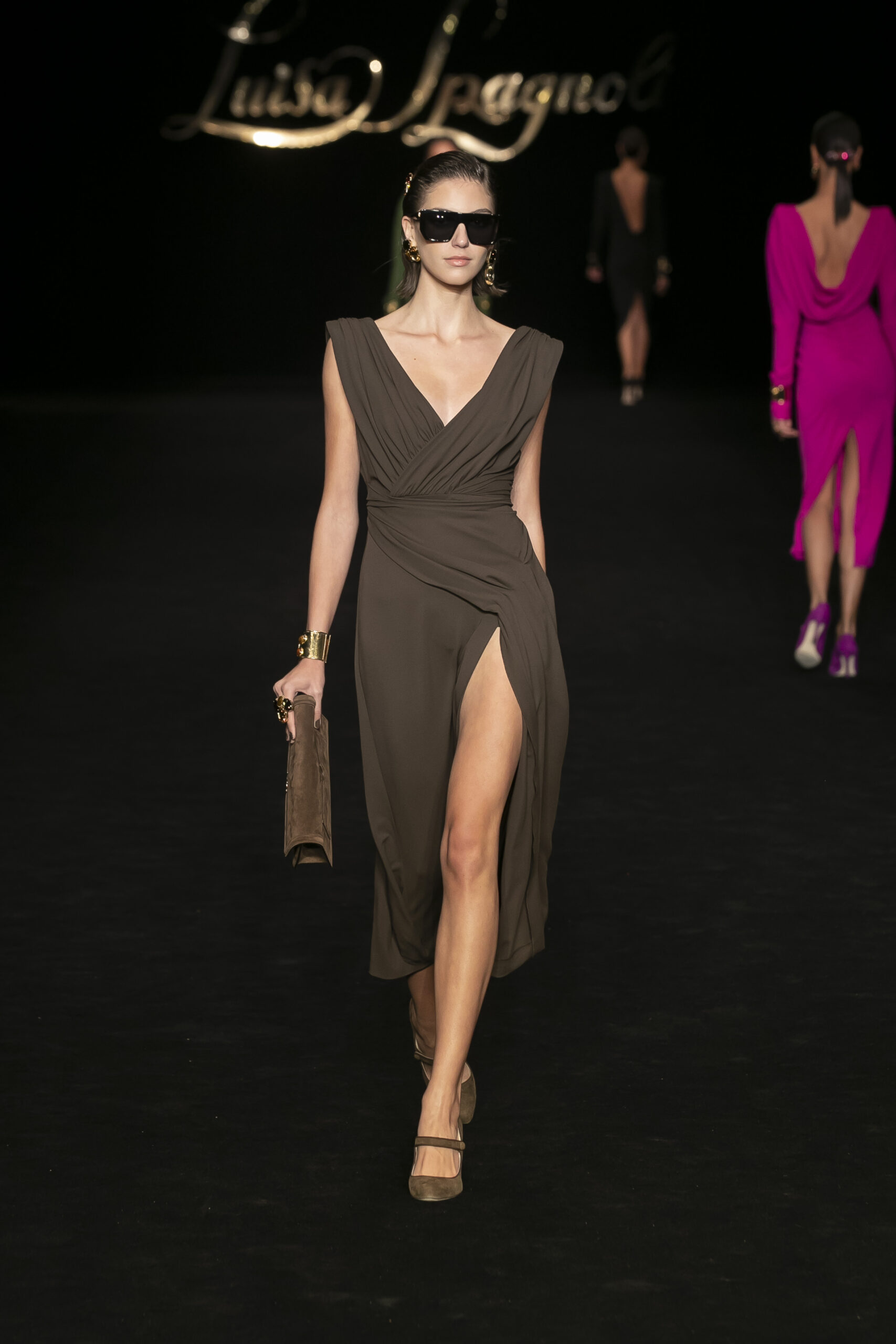 Similar drapes sculpting the body grace jersey cocktail dresses with skin-baring necklines. For special occasions Luisa Spagnoliโs women opt for intricately embroidered mermaid gowns with plunging necks crafted from lace, velvet and sequins, as well as Chantilly lace and sequined jumpsuits.