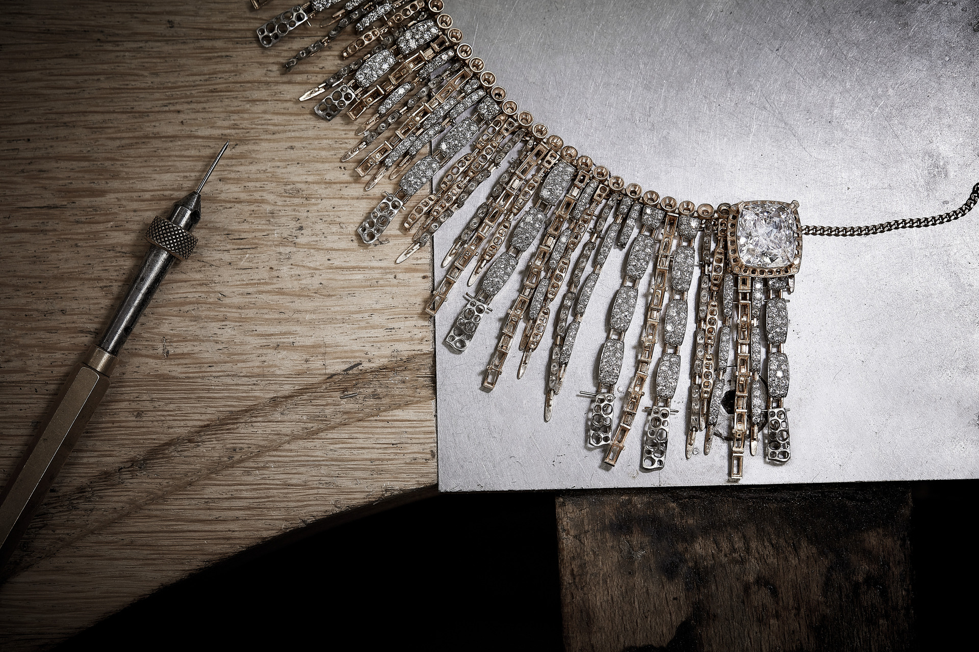 The “Tweed Couture” necklace perfectly matches the curve of the neck and recreates the weave of tweed, making flexibility a creative principle sublimated by the mastery and expertise of the CHANEL Fine Jewelry Workshop. Its freedom and inventiveness celebrate the formidable audacity of Mademoiselle and make it part of CHANEL’s jewellery heritage.