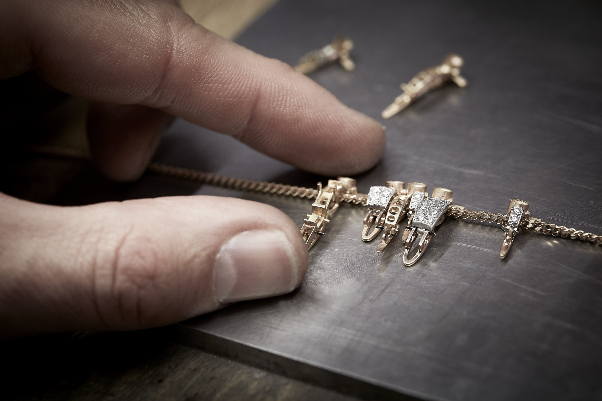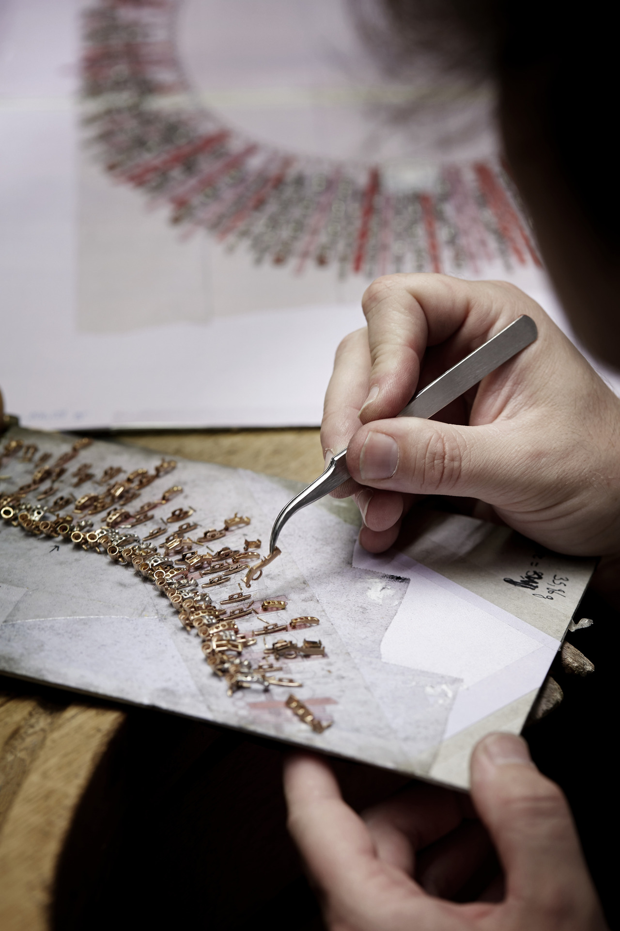 Starting with the swaddling of rose gold or platinum wires which, by creating tiny hinges, rings or articulations, allow the necklace to be structured with flexibility. They are combined with equally light settings where each stone seems to be free of claws or grains to reveal itself in the light.