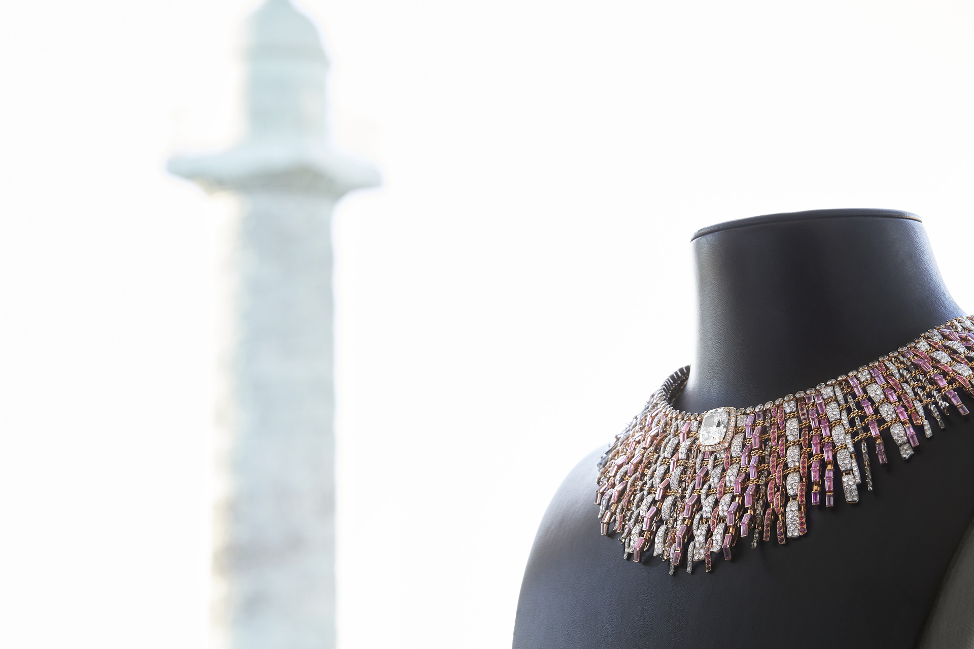 Lines of infinitely poetic pink sapphires, intense and crystalline red spinels, velvety pearls and brilliantly clear diamonds draw the weft and warp threads of the tweed to recreate its mossy thickness. While a line of pearls, punctuated in its center by a 10.20 carat DIF Type IIa cushion-cut diamond, delicately highlights the birth of the neck. Finally, the reverse side of each element has been polished so that wearing the collar is as light and comfortable as wearing tweed.