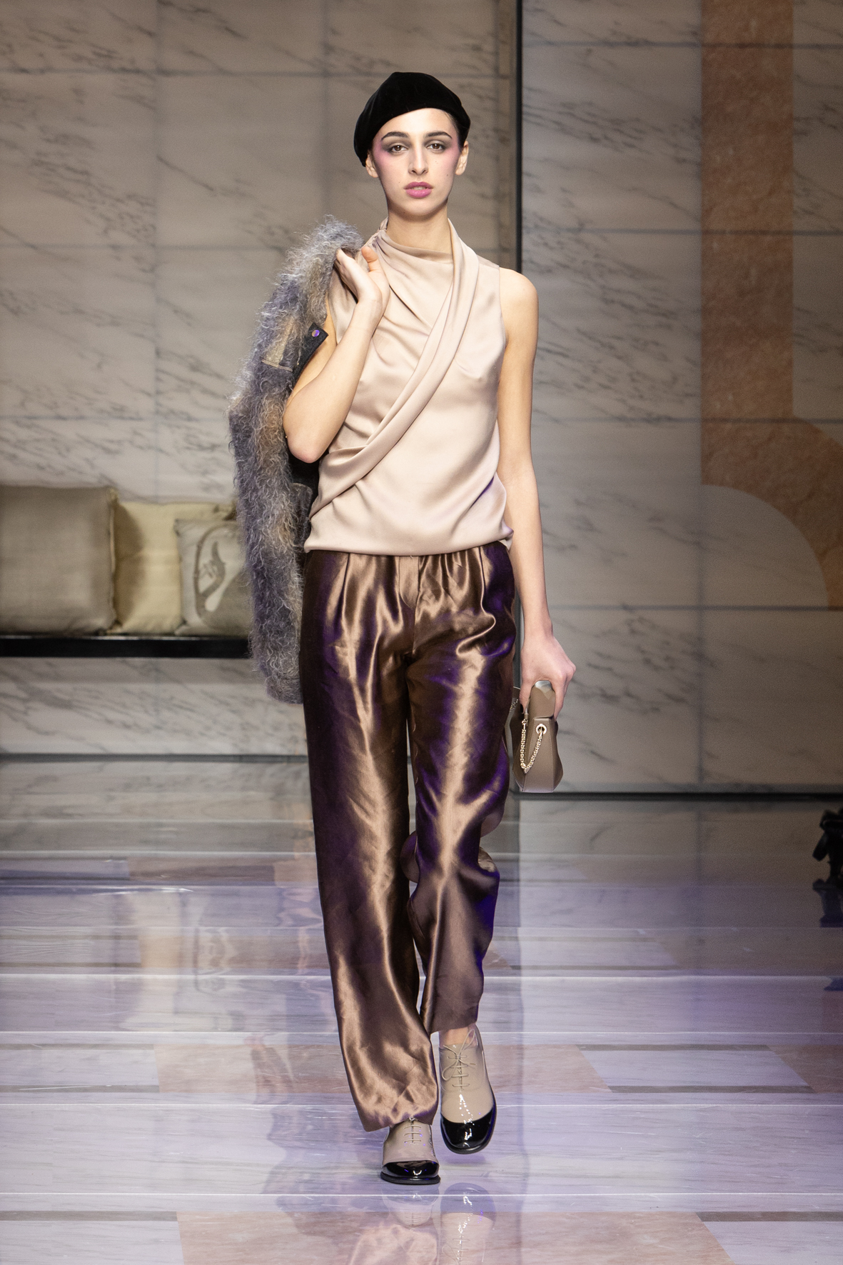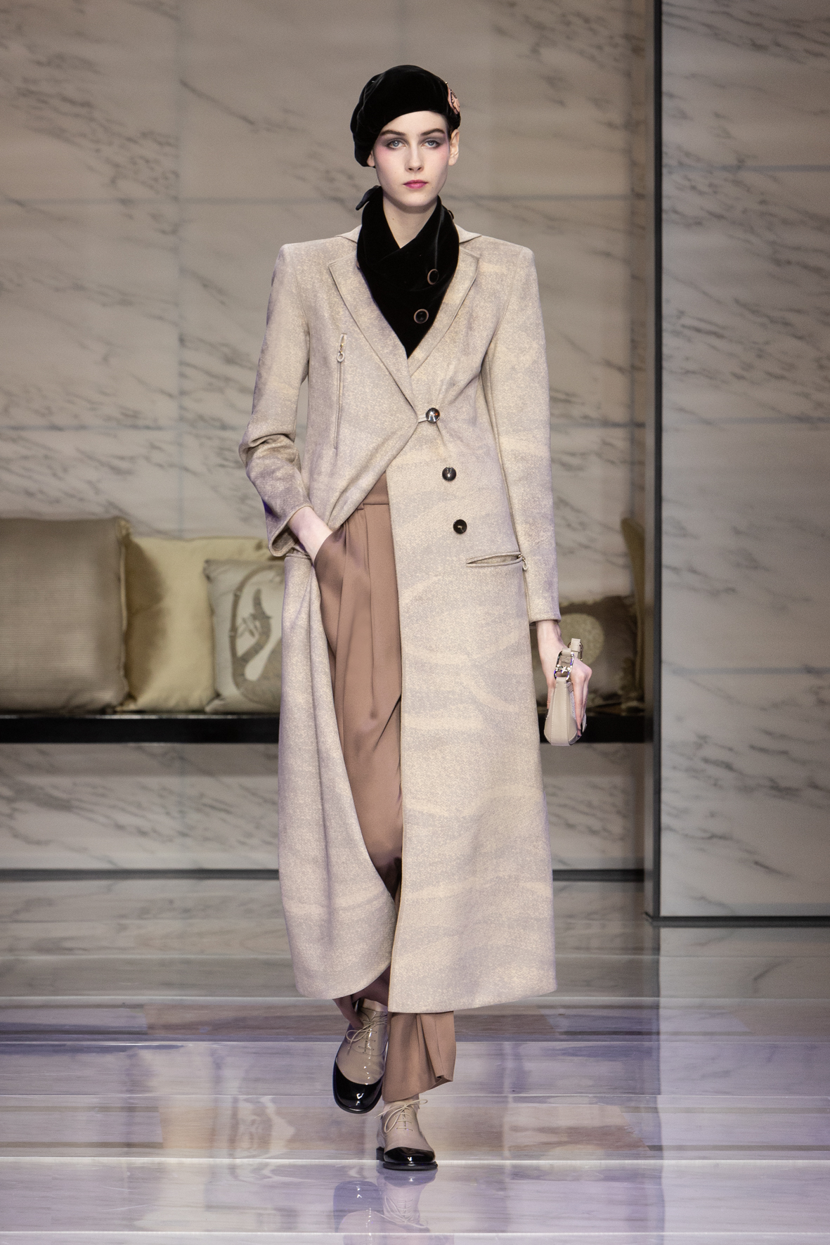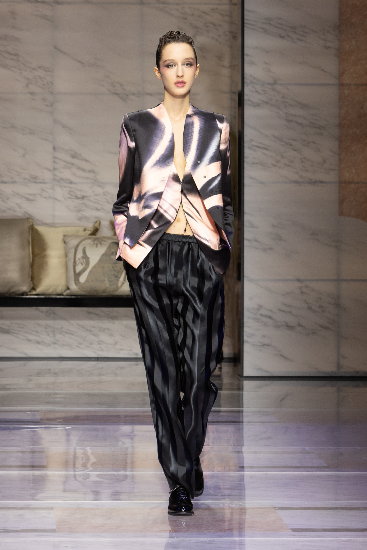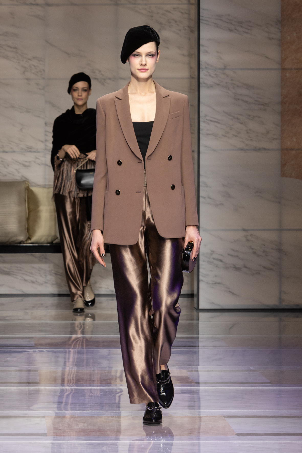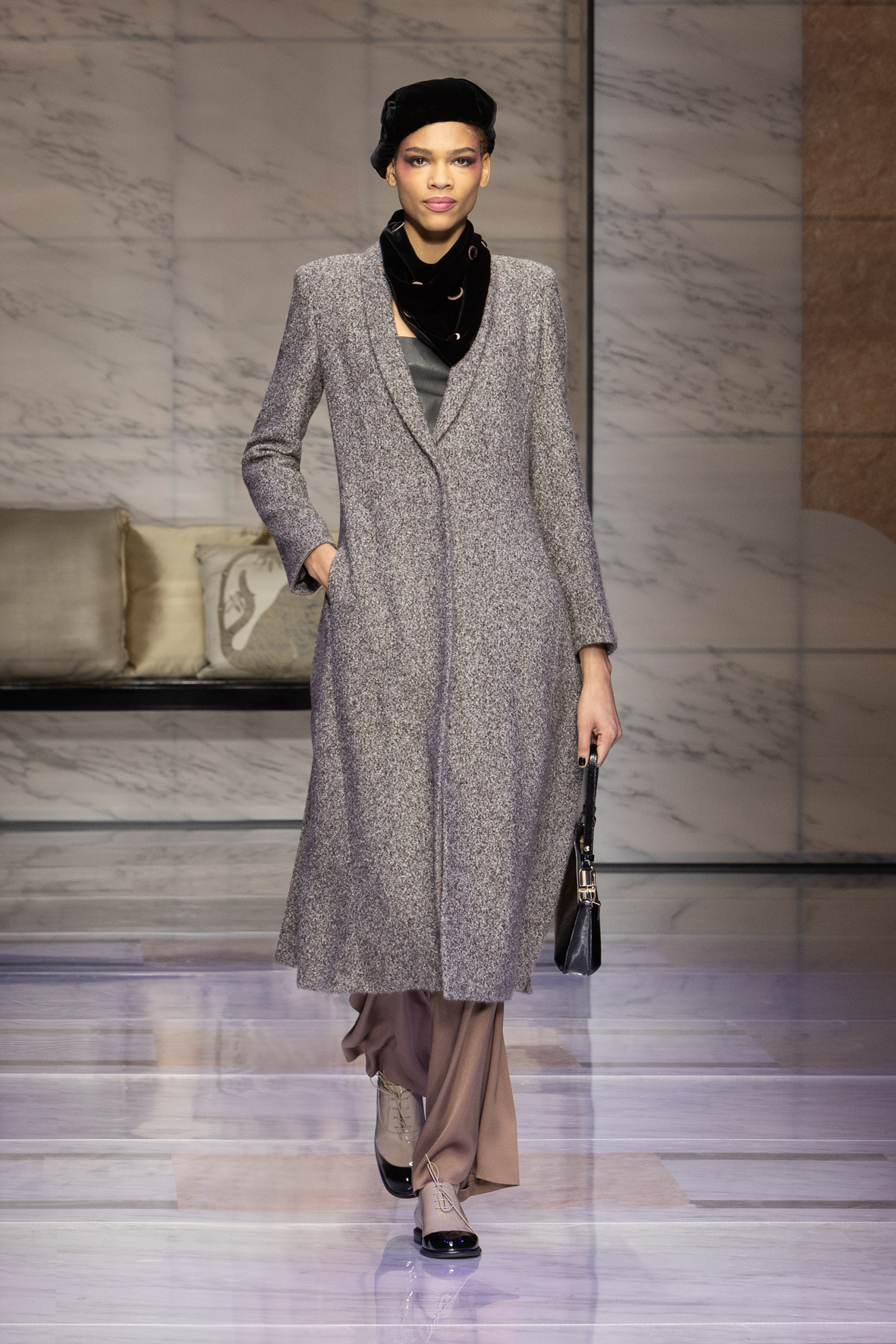 Makeup is always an intimate and personal moment. So is the atmosphere that permeates this collection, and not just because Giorgio Armani once again invites his guests to the small theater in Via Borgonuovo 21. After crossing the threshold of the Milanese palaces, suggested by the elegant marble frame and the harmony of colors and spaces, the guests are welcomed into a domestic dimension evoked by the presence of sofa cushions. It feels like a living room, a place for dialogue and socialization, and the wardrobe that accompanies this idea of gentle domesticity is fluid and sublime.