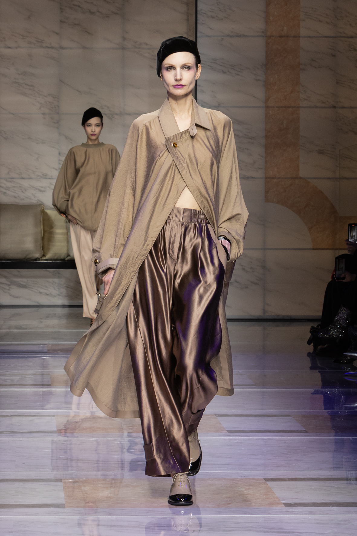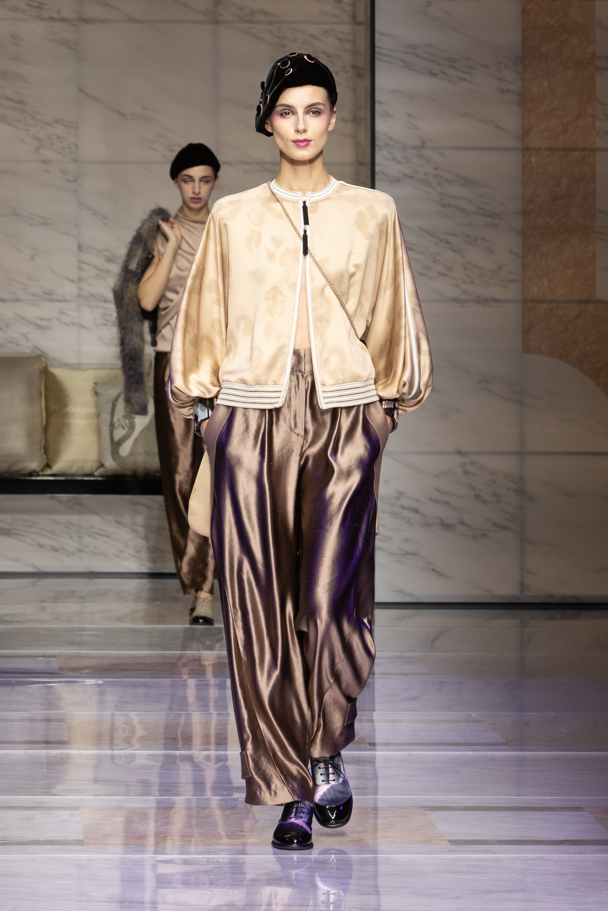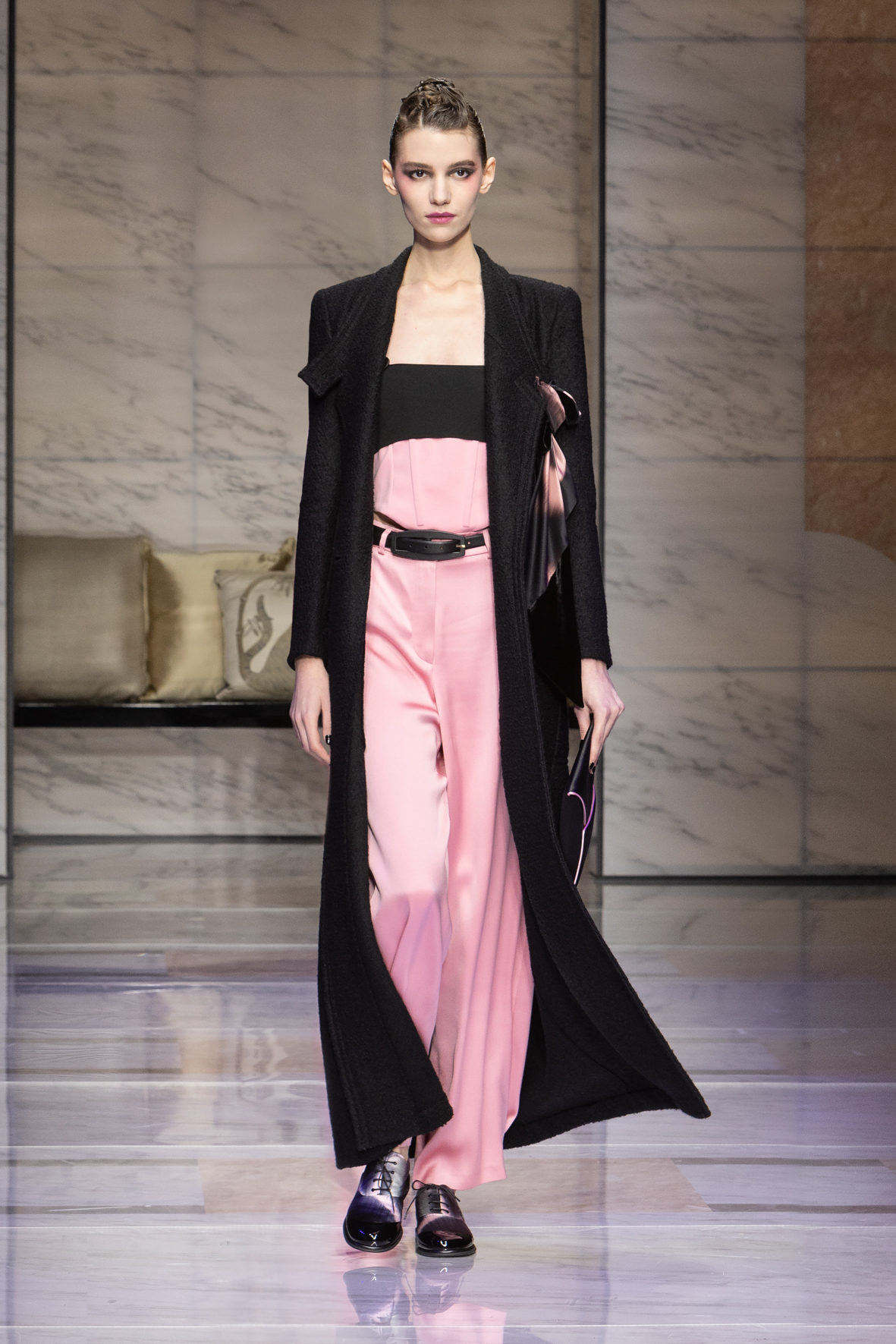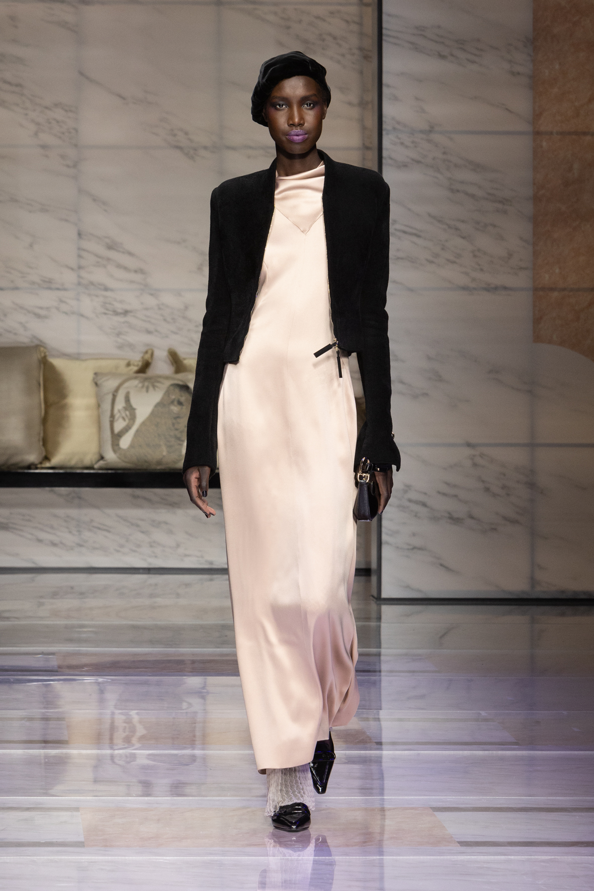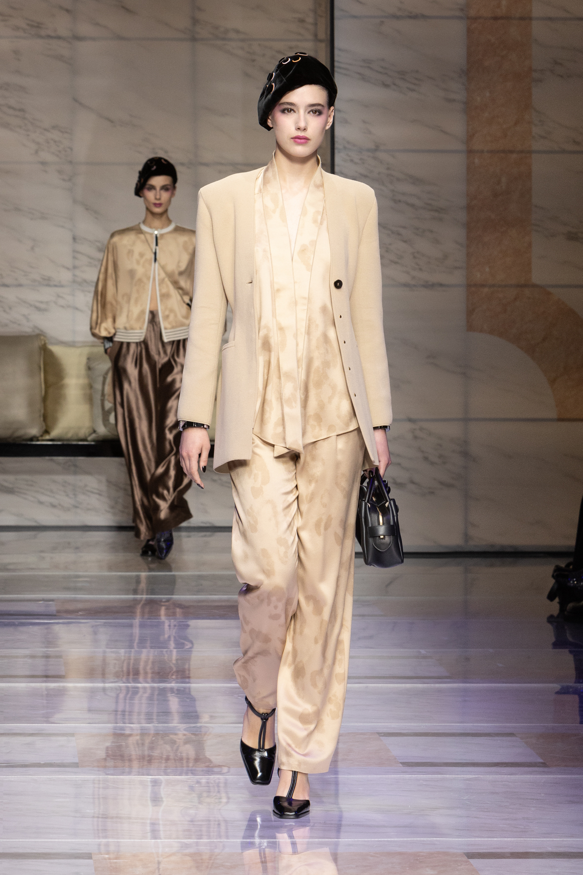 Makeup is always an intimate and personal moment. So is the atmosphere that permeates this collection, and not just because Giorgio Armani once again invites his guests to the small theater in Via Borgonuovo 21. After crossing the threshold of the Milanese palaces, suggested by the elegant marble frame and the harmony of colors and spaces, the guests are welcomed into a domestic dimension evoked by the presence of sofa cushions. It feels like a living room, a place for dialogue and socialization, and the wardrobe that accompanies this idea of gentle domesticity is fluid and sublime.