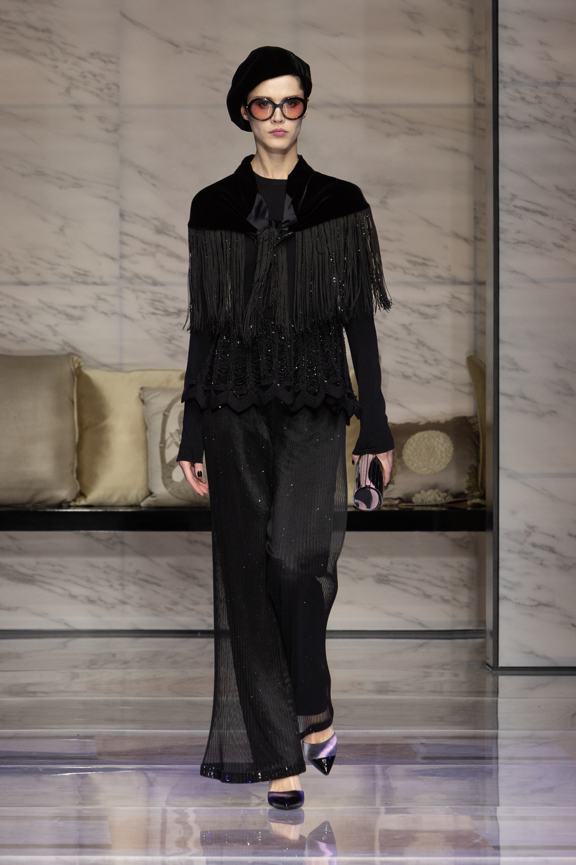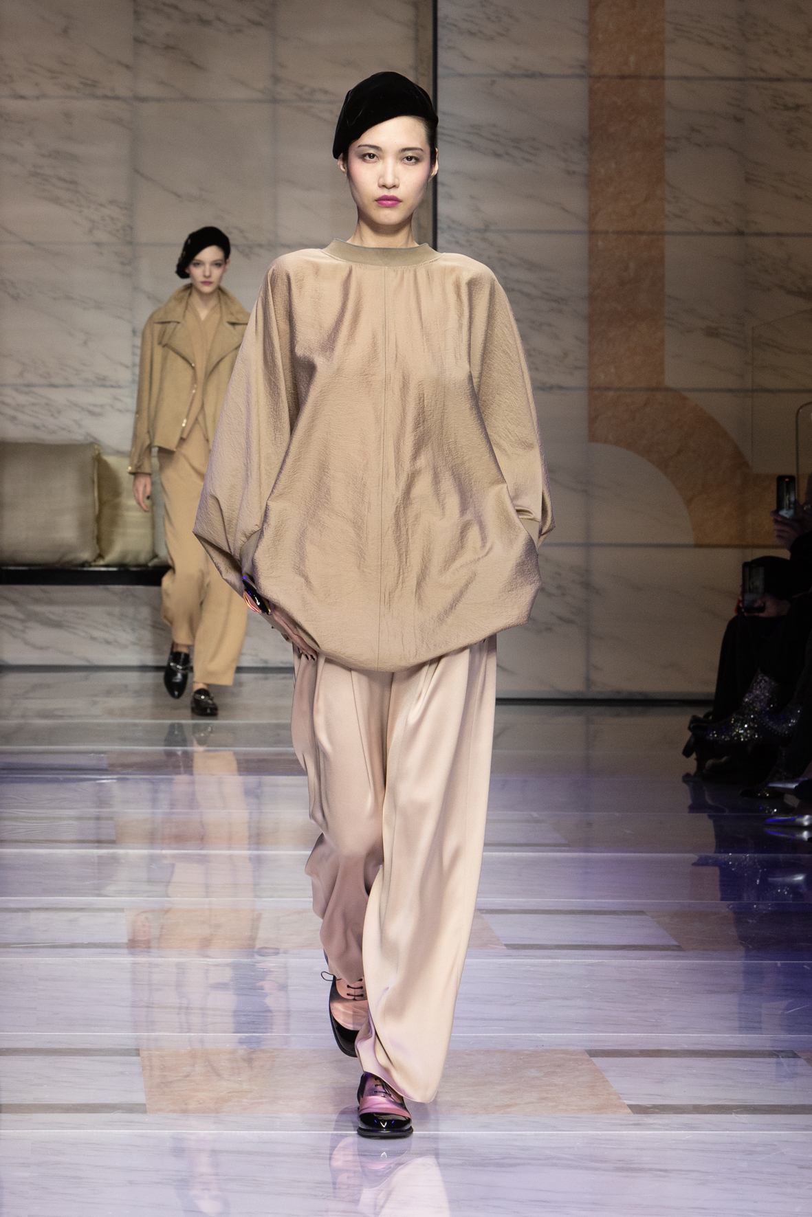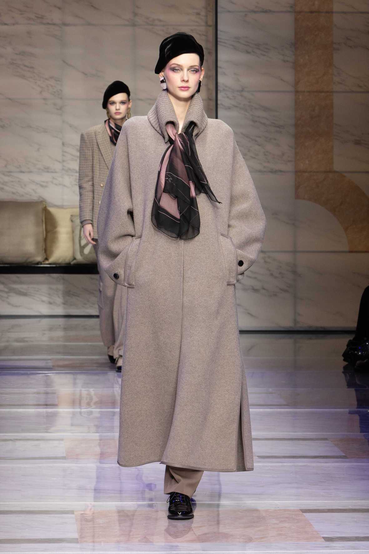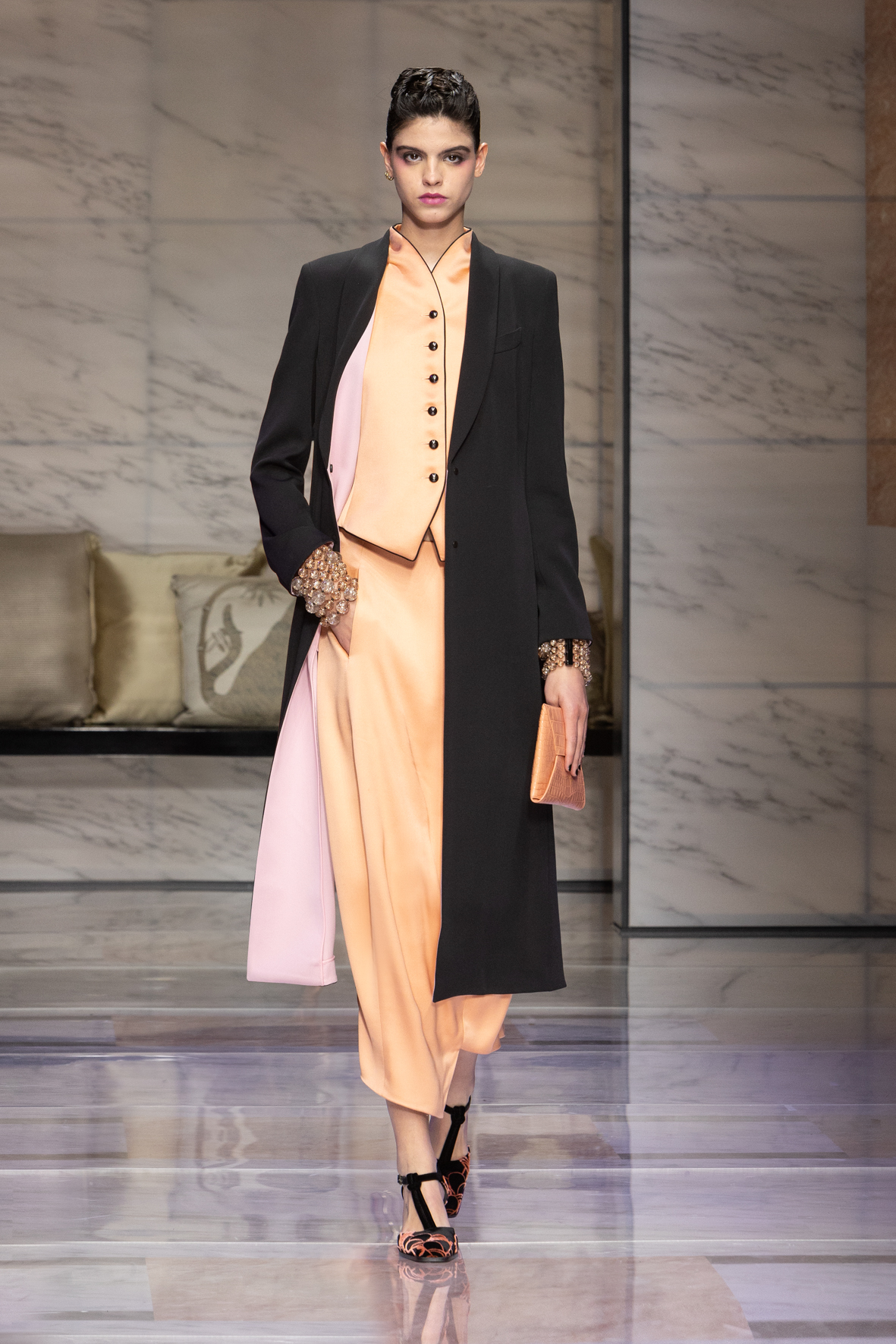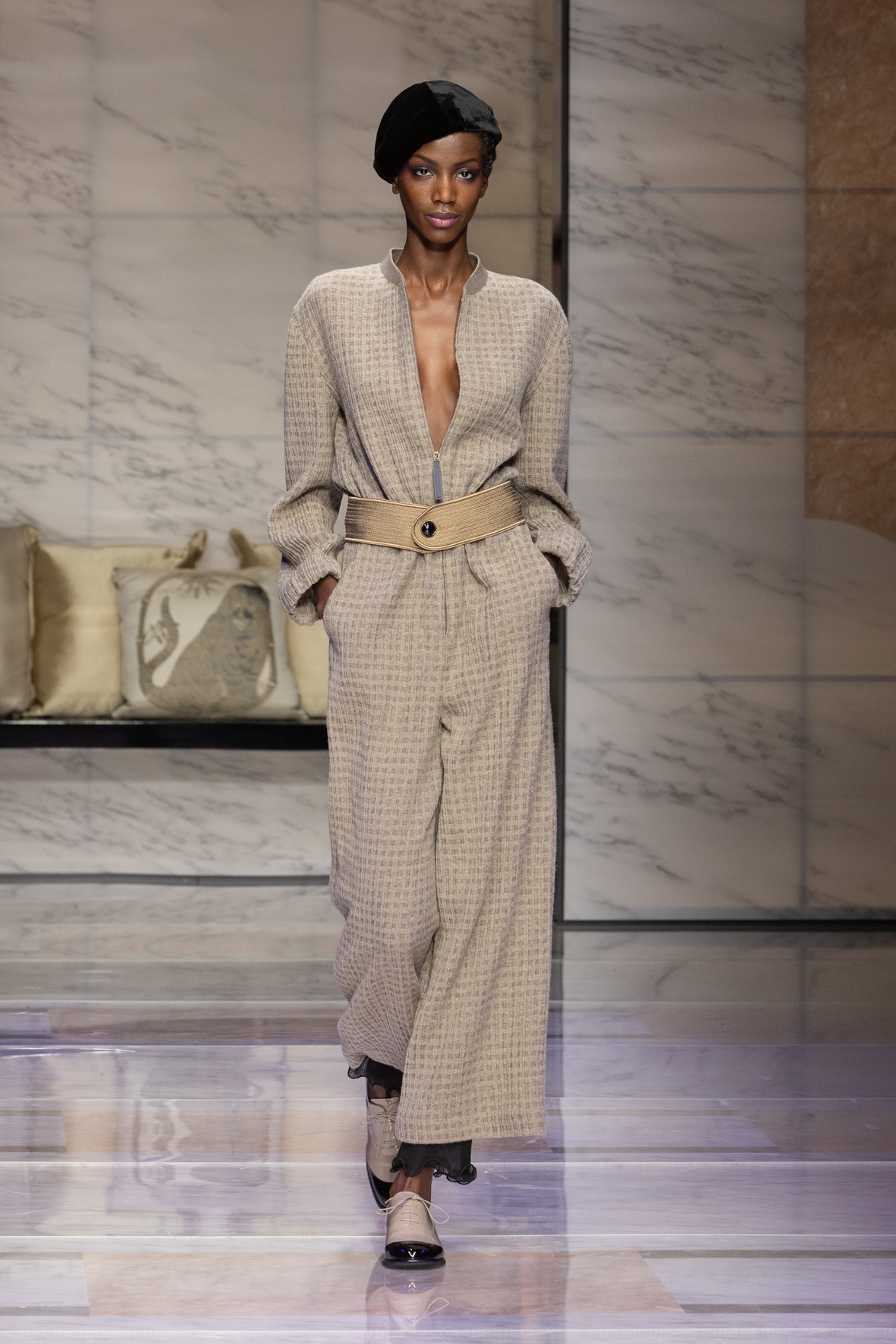 Makeup is always an intimate and personal moment. So is the atmosphere that permeates this collection, and not just because Giorgio Armani once again invites his guests to the small theater in Via Borgonuovo 21. After crossing the threshold of the Milanese palaces, suggested by the elegant marble frame and the harmony of colors and spaces, the guests are welcomed into a domestic dimension evoked by the presence of sofa cushions. It feels like a living room, a place for dialogue and socialization, and the wardrobe that accompanies this idea of gentle domesticity is fluid and sublime.