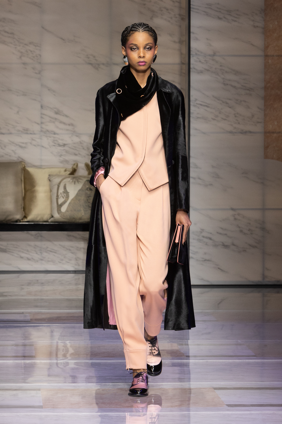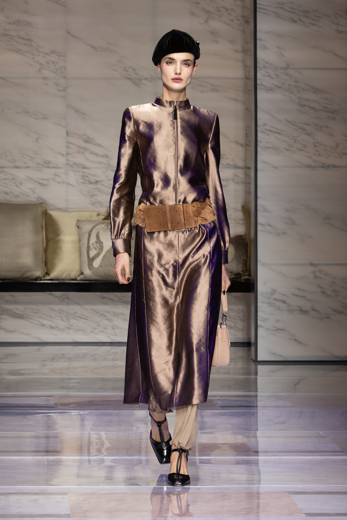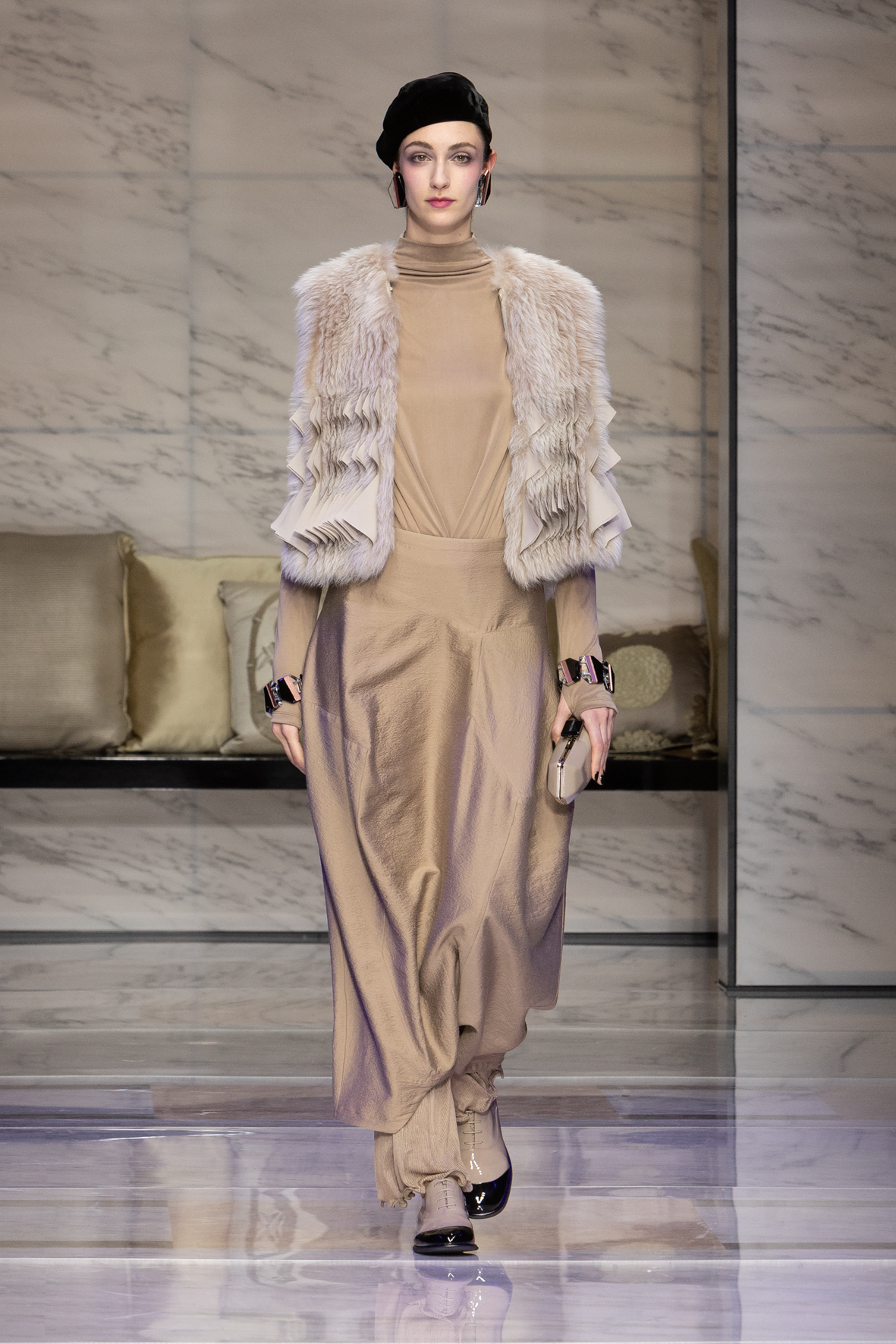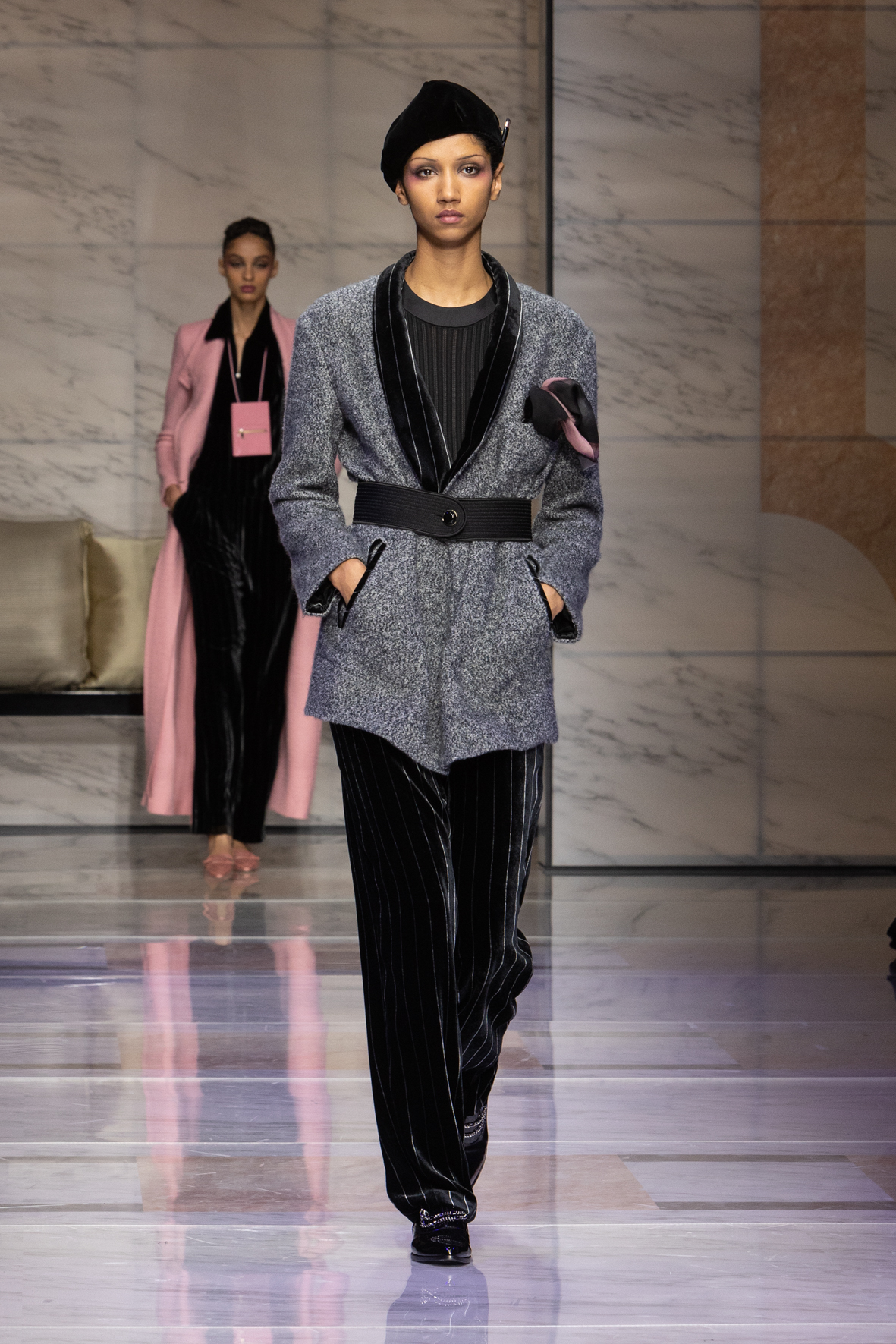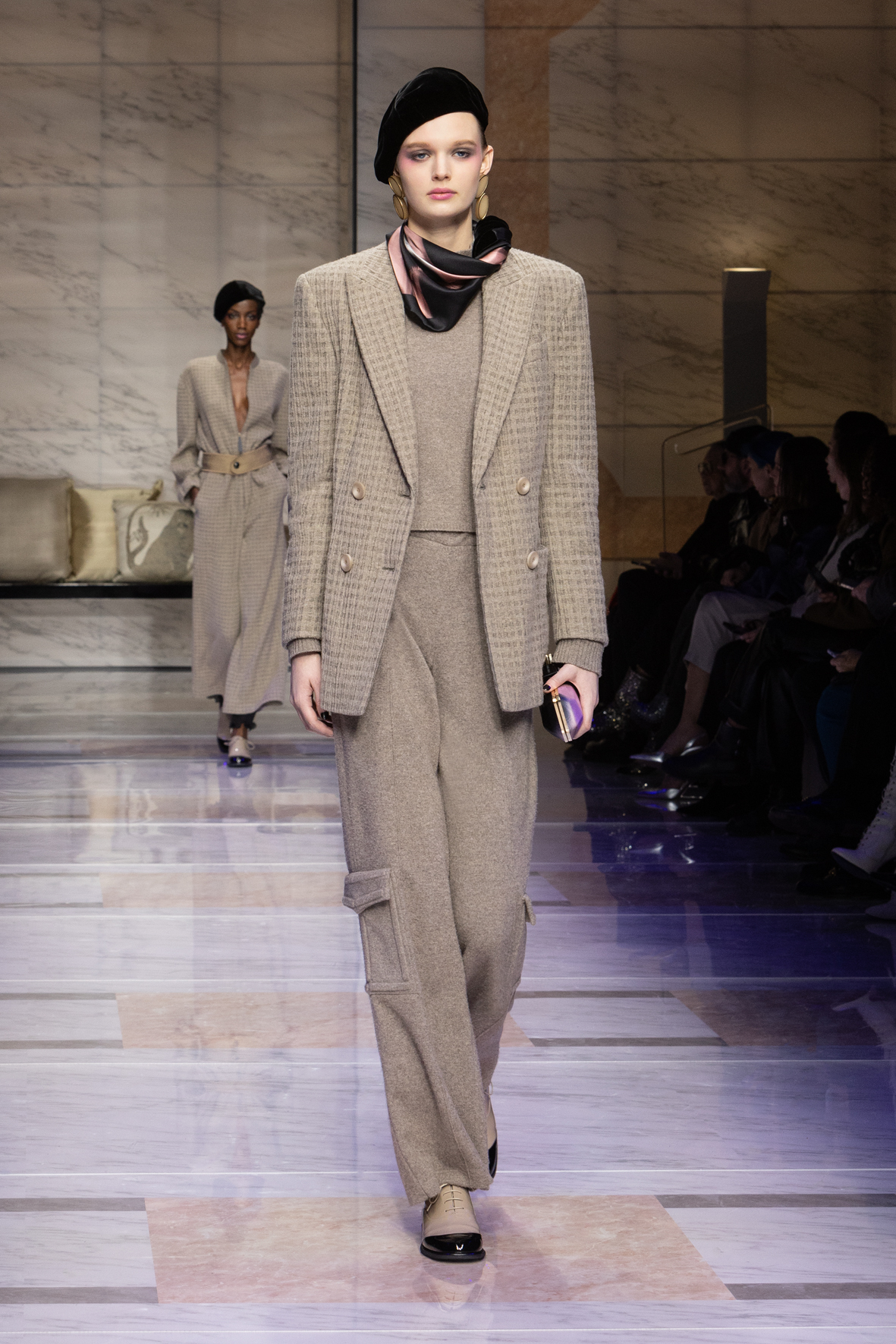 Makeup is always an intimate and personal moment. So is the atmosphere that permeates this collection, and not just because Giorgio Armani once again invites his guests to the small theater in Via Borgonuovo 21. After crossing the threshold of the Milanese palaces, suggested by the elegant marble frame and the harmony of colors and spaces, the guests are welcomed into a domestic dimension evoked by the presence of sofa cushions. It feels like a living room, a place for dialogue and socialization, and the wardrobe that accompanies this idea of gentle domesticity is fluid and sublime.