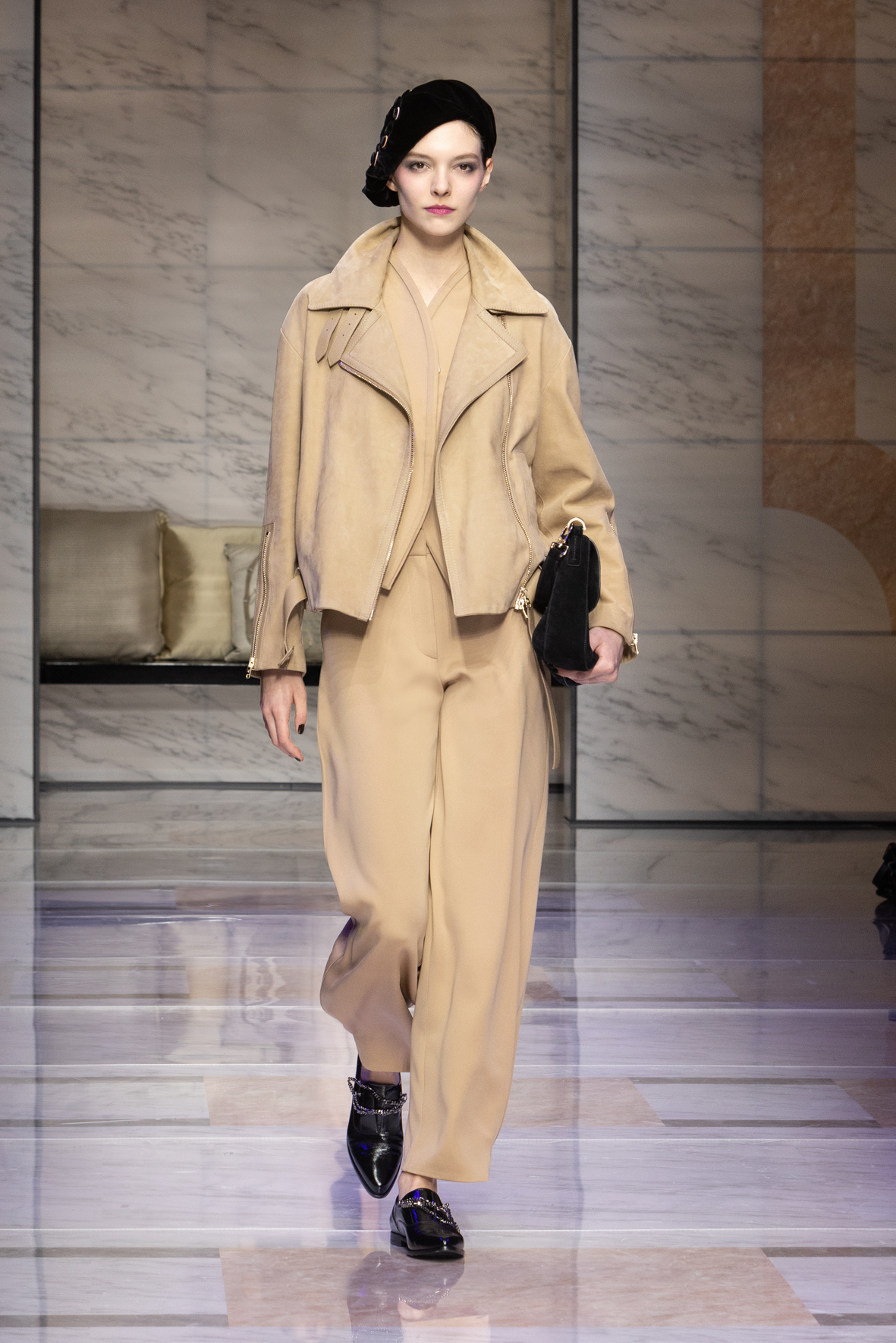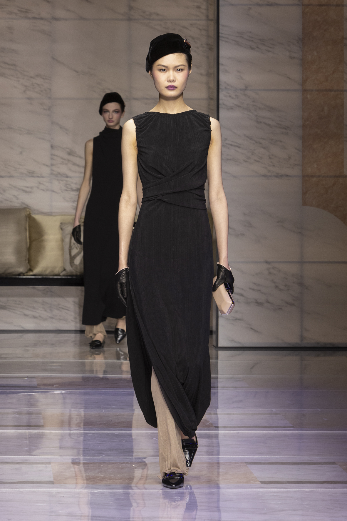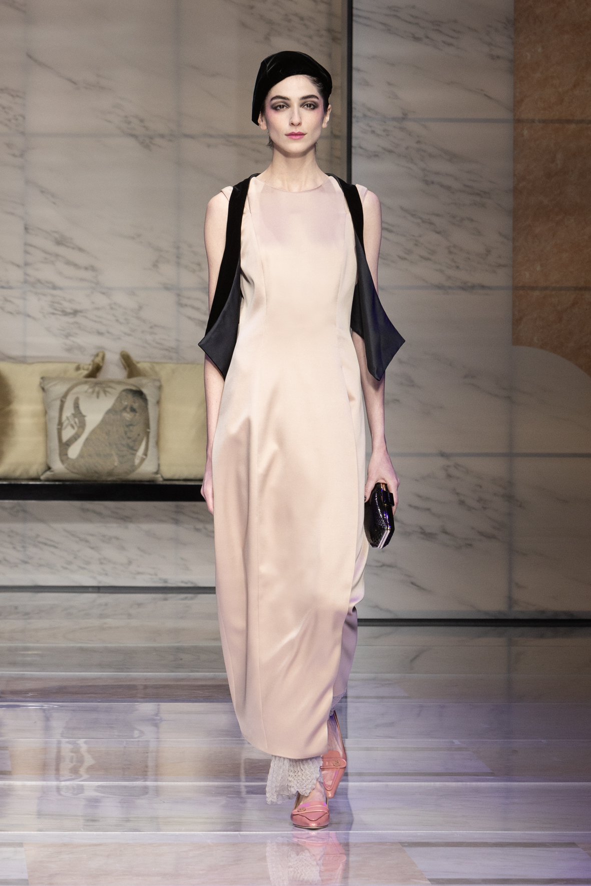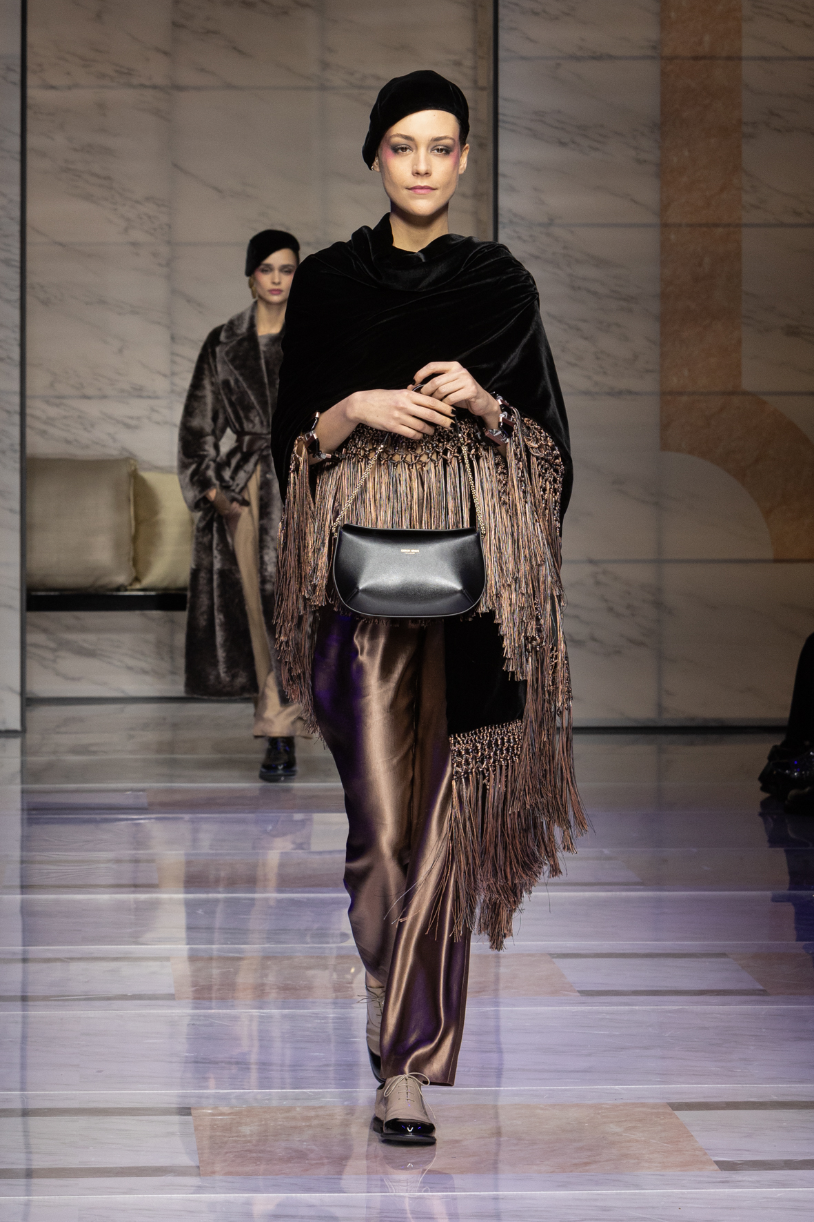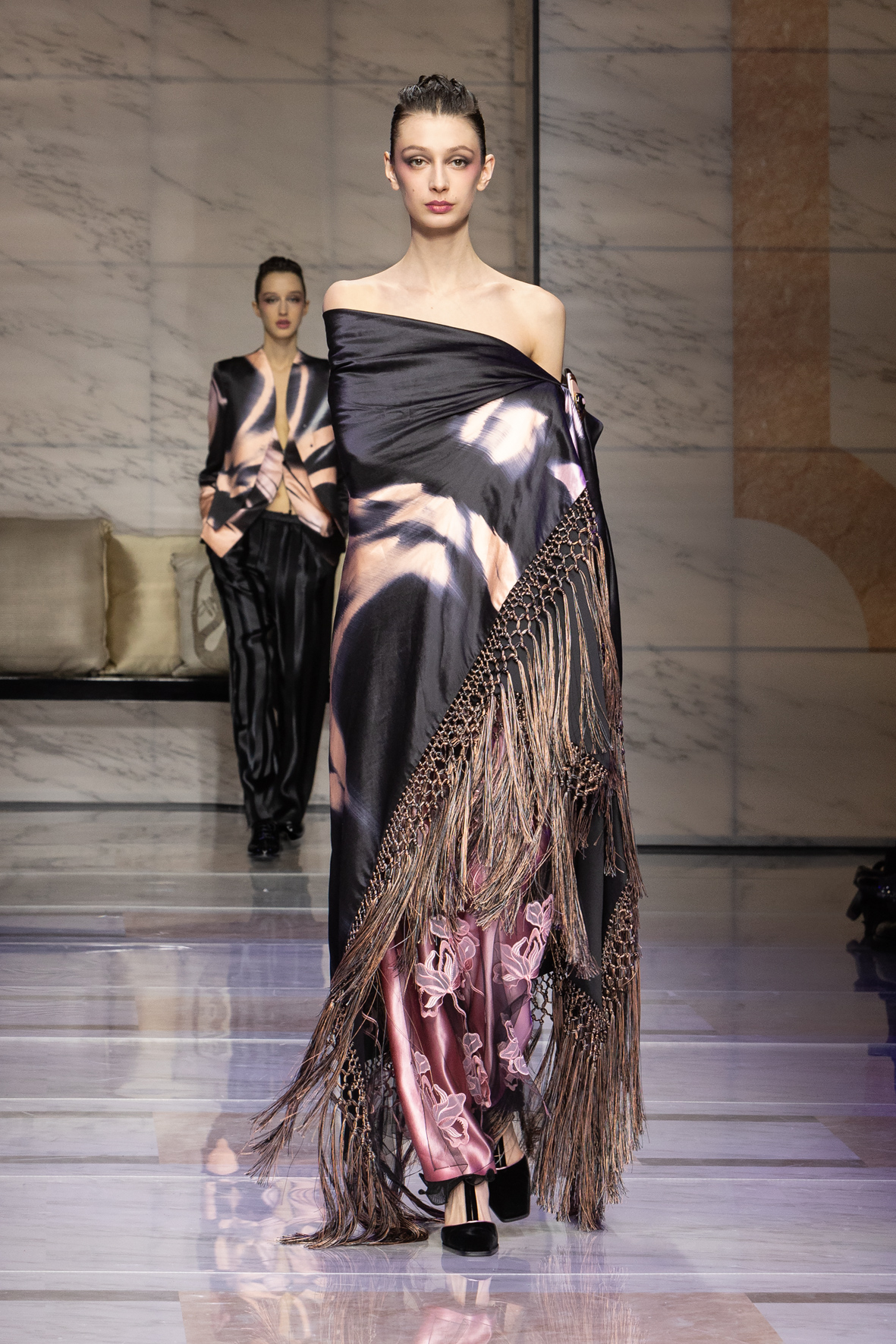 Makeup is always an intimate and personal moment. So is the atmosphere that permeates this collection, and not just because Giorgio Armani once again invites his guests to the small theater in Via Borgonuovo 21. After crossing the threshold of the Milanese palaces, suggested by the elegant marble frame and the harmony of colors and spaces, the guests are welcomed into a domestic dimension evoked by the presence of sofa cushions. It feels like a living room, a place for dialogue and socialization, and the wardrobe that accompanies this idea of gentle domesticity is fluid and sublime.