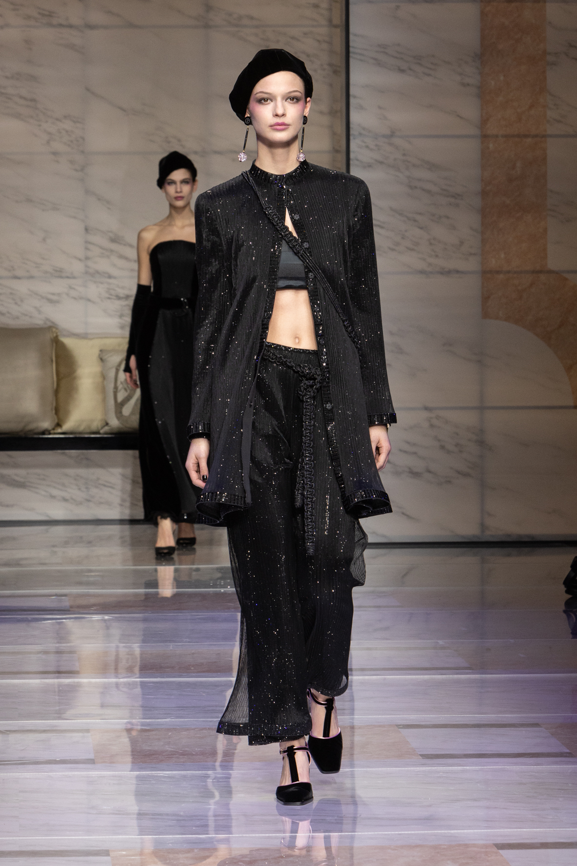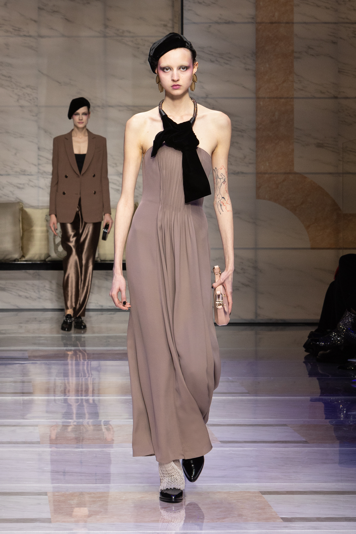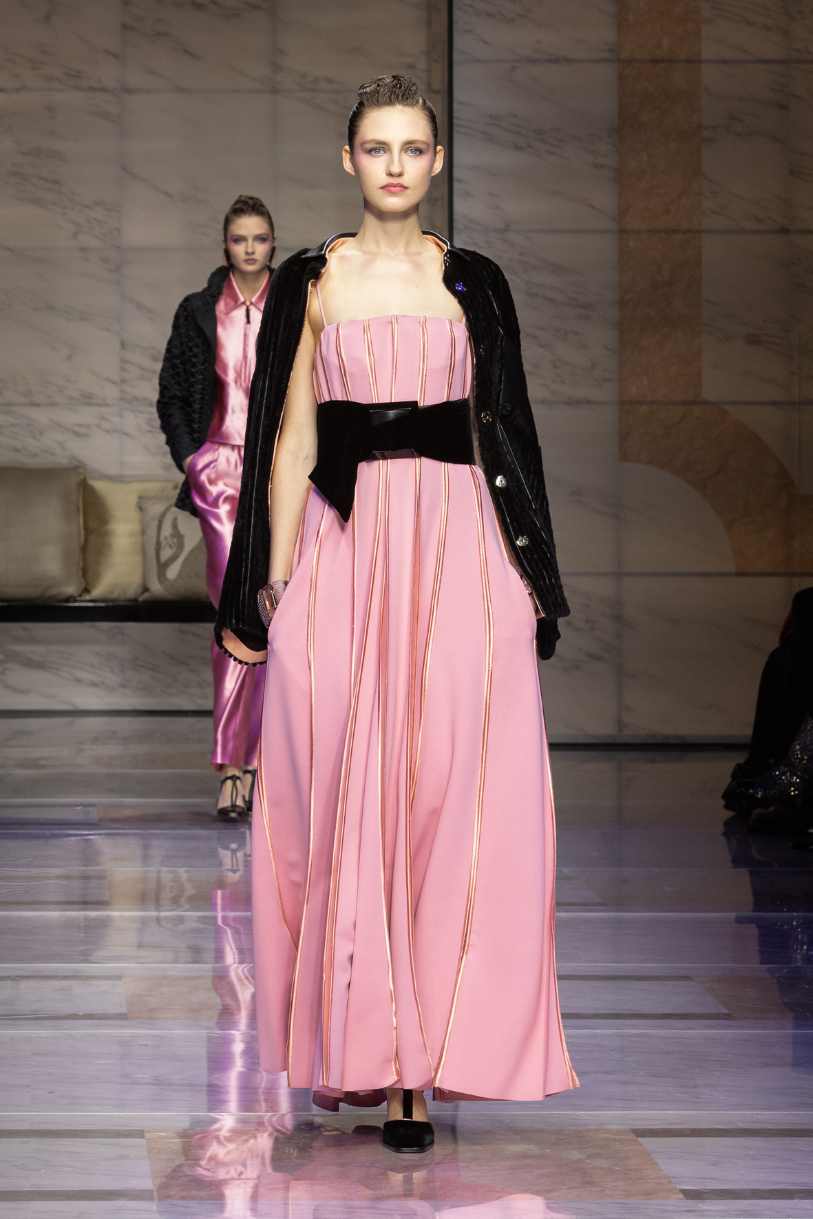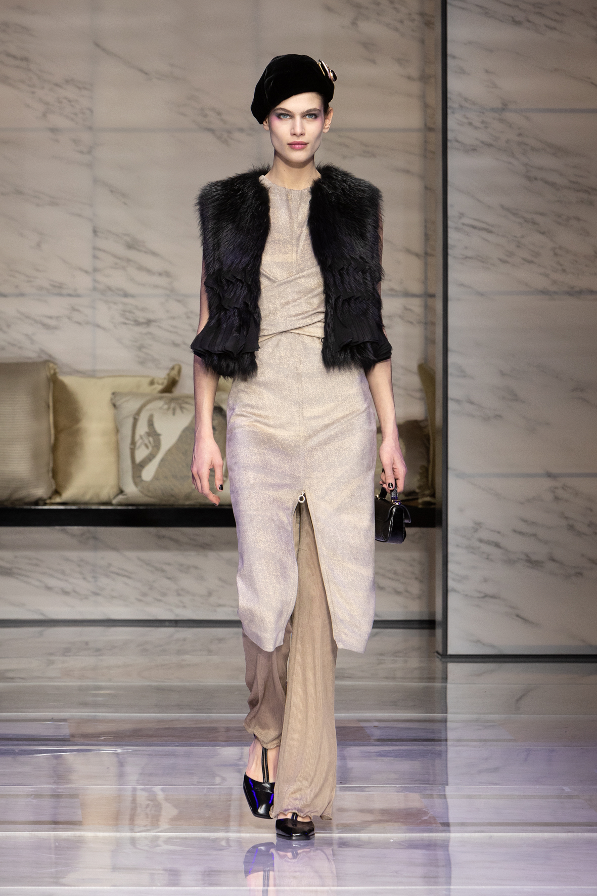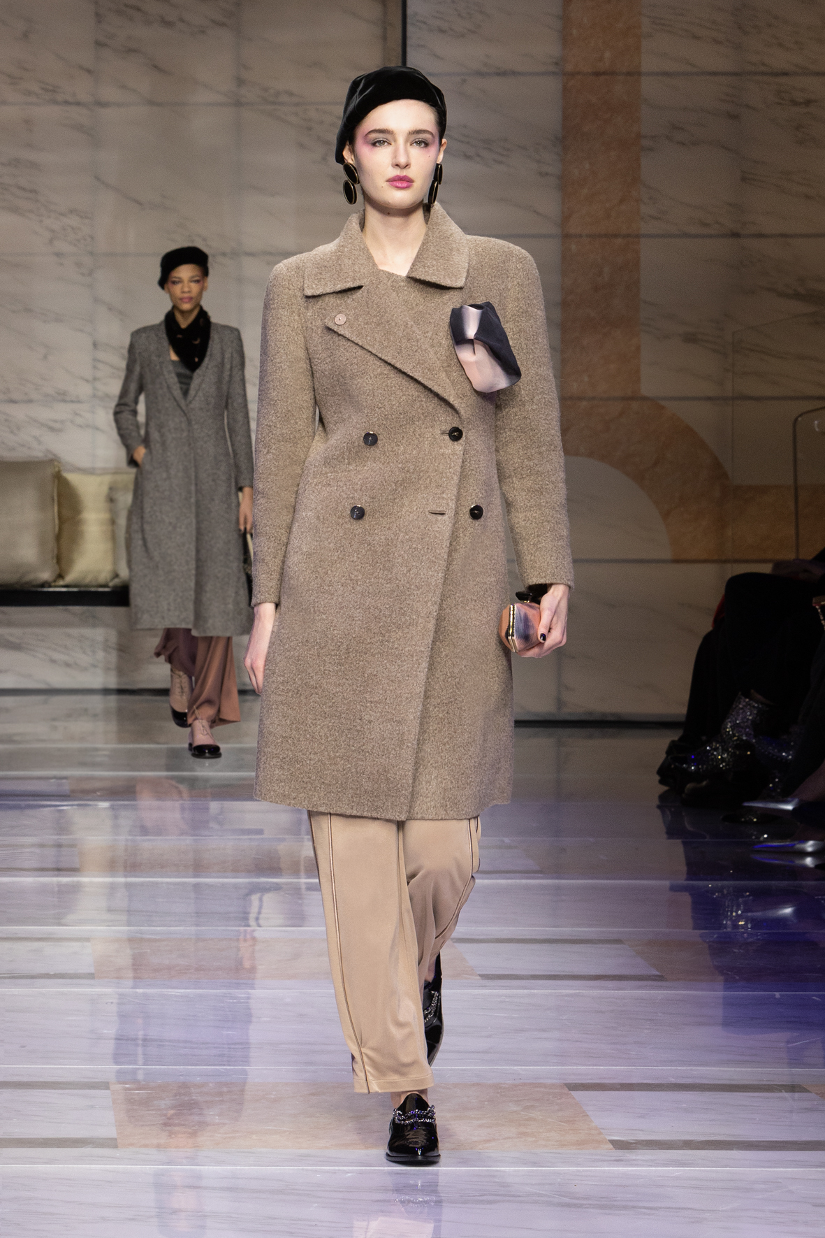 Makeup is always an intimate and personal moment. So is the atmosphere that permeates this collection, and not just because Giorgio Armani once again invites his guests to the small theater in Via Borgonuovo 21. After crossing the threshold of the Milanese palaces, suggested by the elegant marble frame and the harmony of colors and spaces, the guests are welcomed into a domestic dimension evoked by the presence of sofa cushions. It feels like a living room, a place for dialogue and socialization, and the wardrobe that accompanies this idea of gentle domesticity is fluid and sublime.