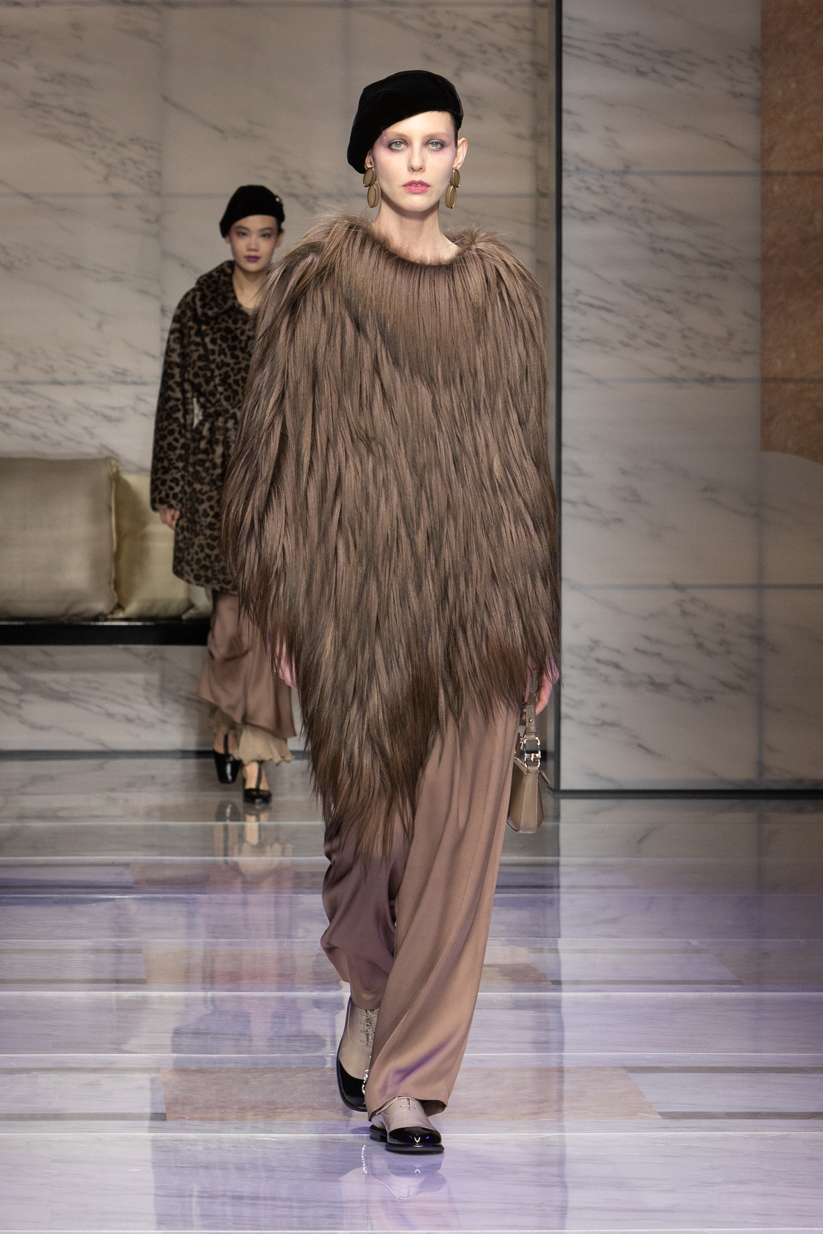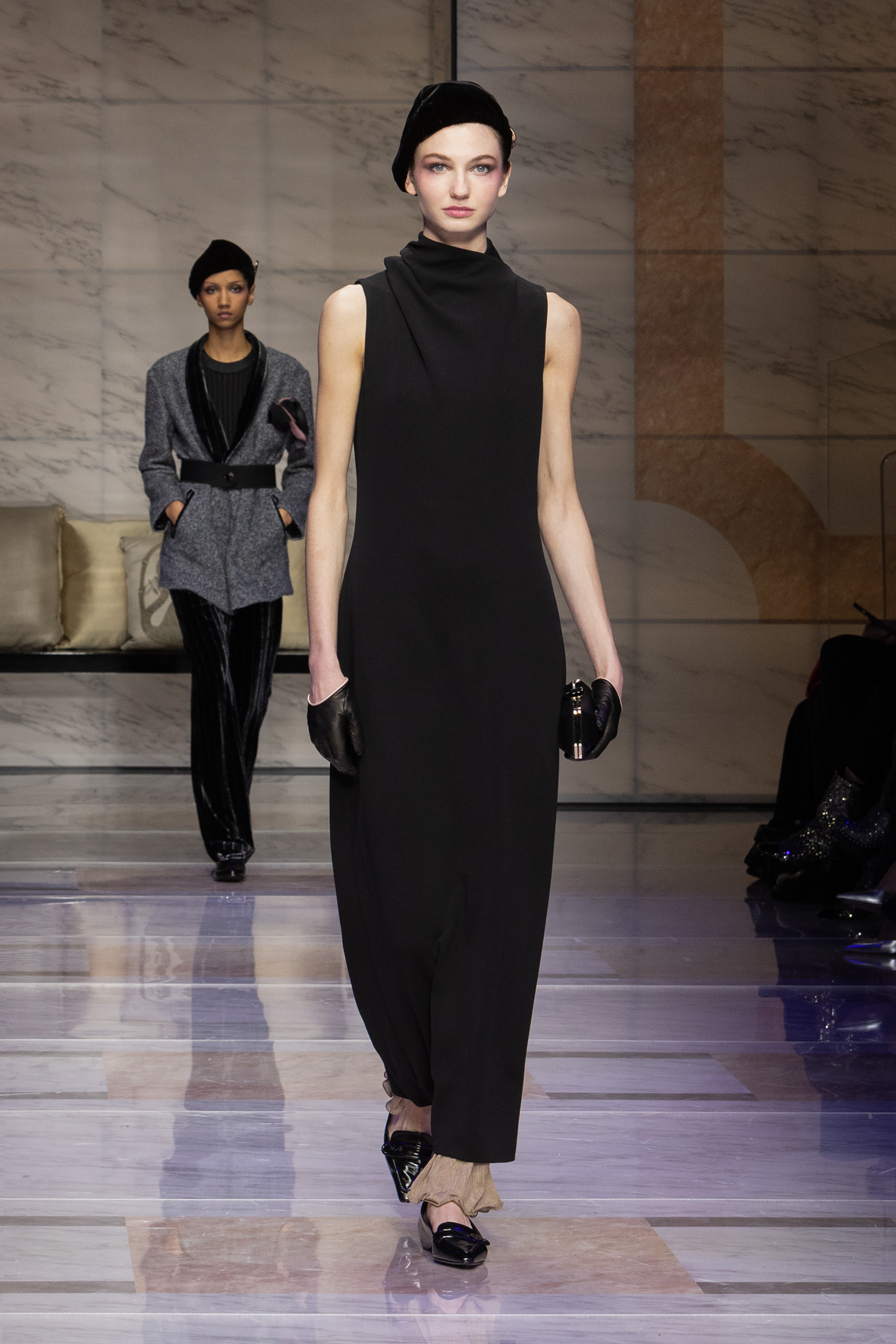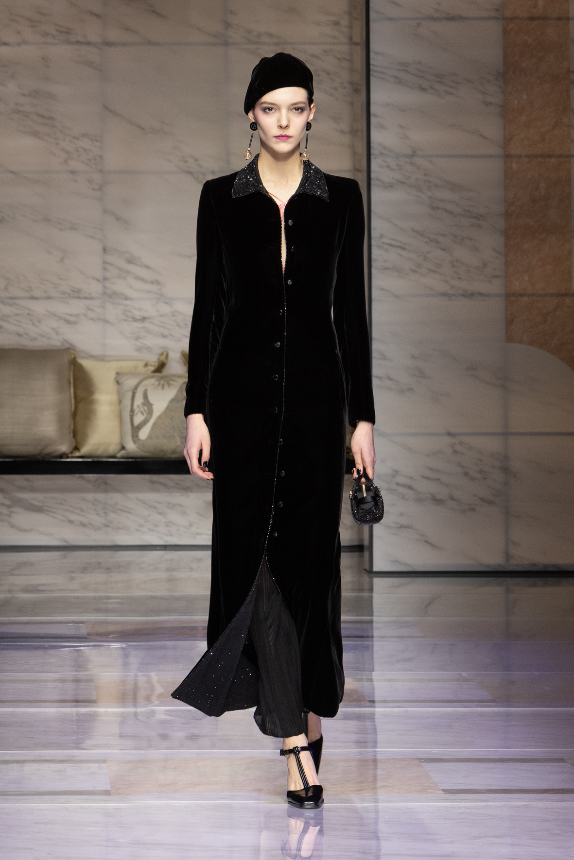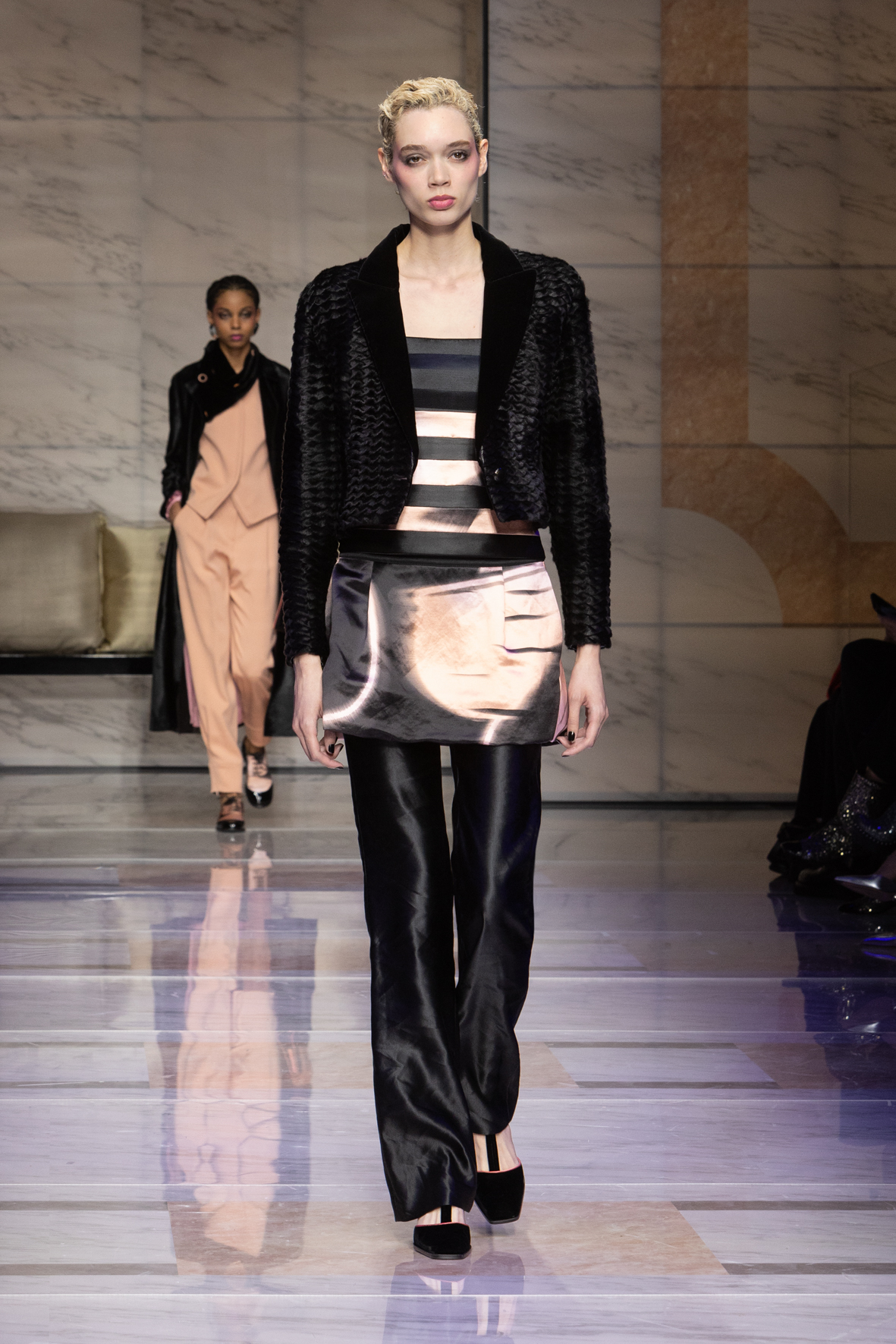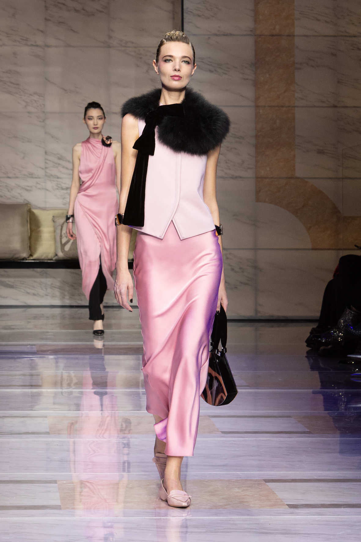 Makeup is always an intimate and personal moment. So is the atmosphere that permeates this collection, and not just because Giorgio Armani once again invites his guests to the small theater in Via Borgonuovo 21. After crossing the threshold of the Milanese palaces, suggested by the elegant marble frame and the harmony of colors and spaces, the guests are welcomed into a domestic dimension evoked by the presence of sofa cushions. It feels like a living room, a place for dialogue and socialization, and the wardrobe that accompanies this idea of gentle domesticity is fluid and sublime.