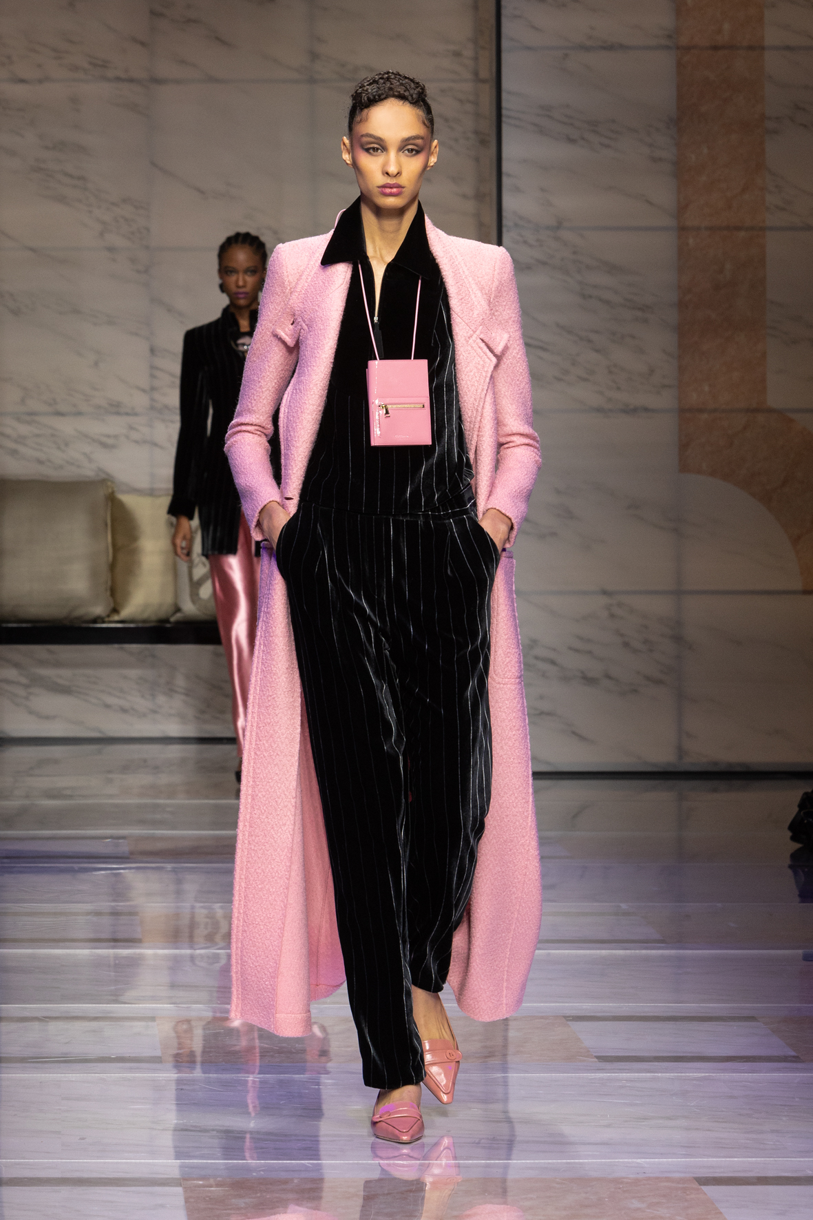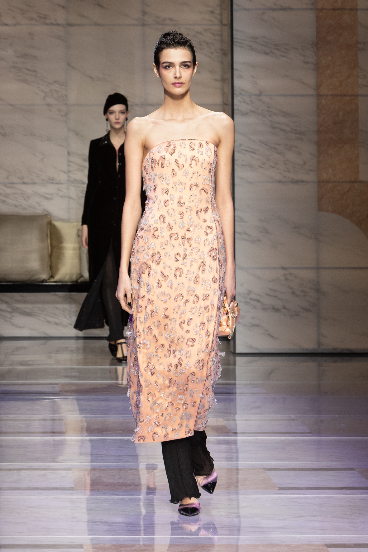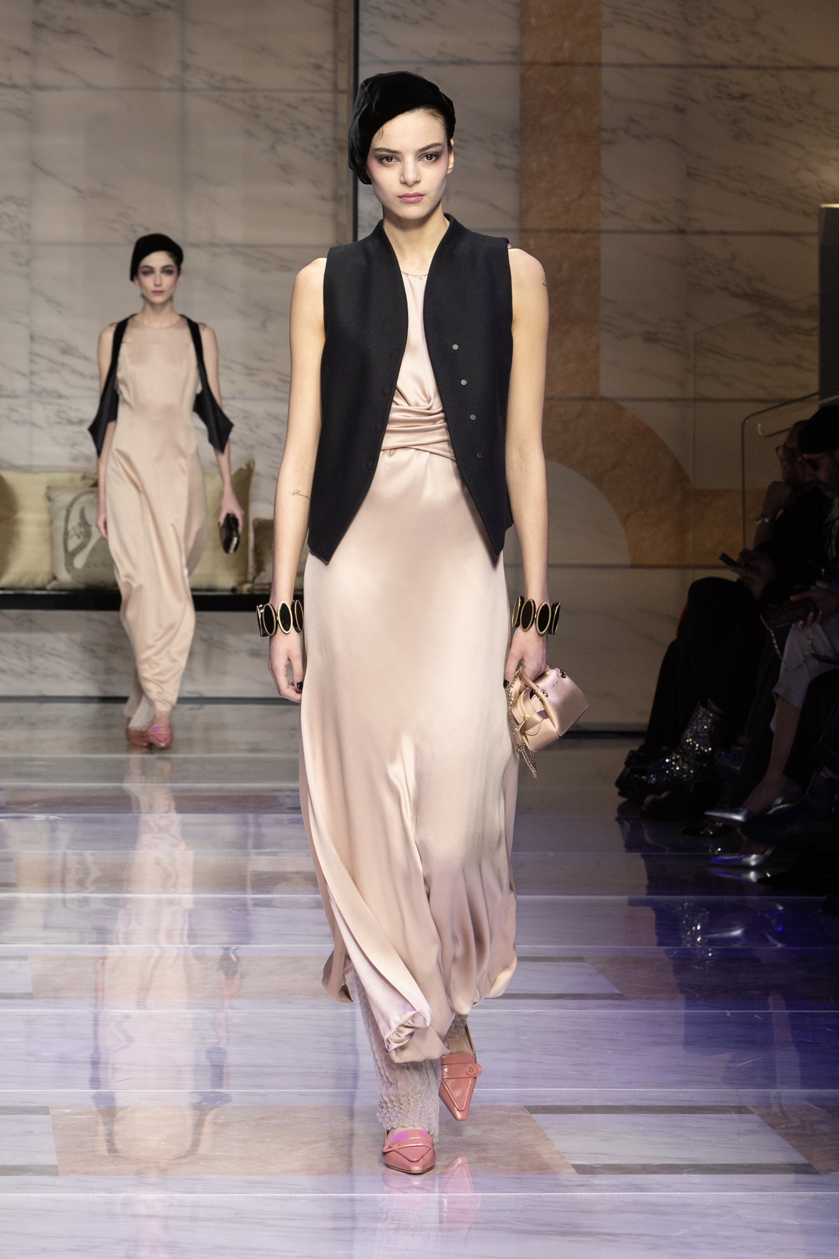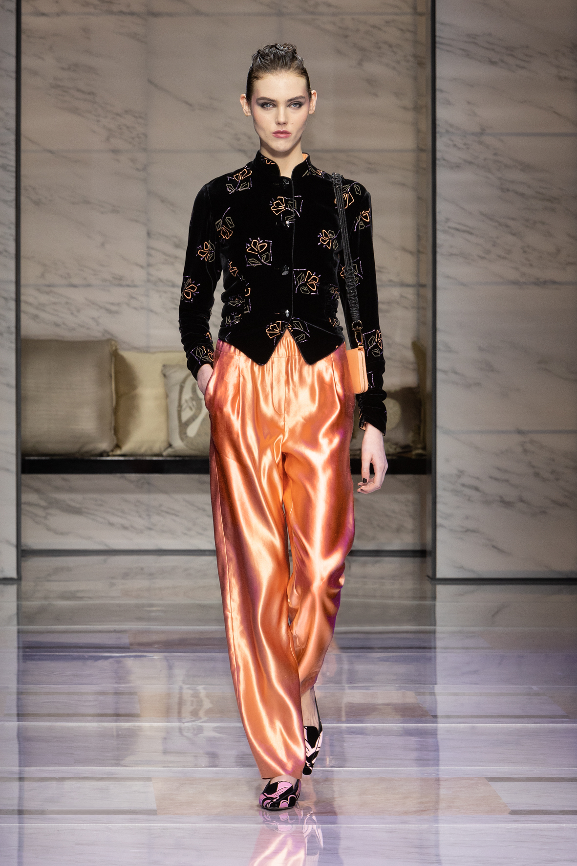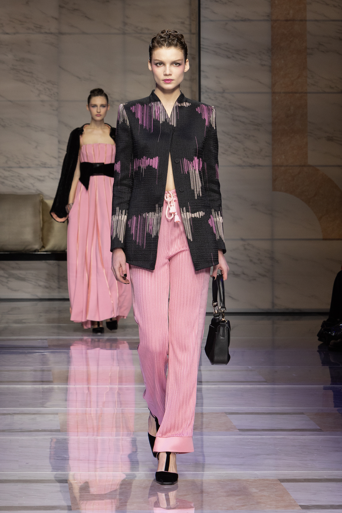 Makeup is always an intimate and personal moment. So is the atmosphere that permeates this collection, and not just because Giorgio Armani once again invites his guests to the small theater in Via Borgonuovo 21. After crossing the threshold of the Milanese palaces, suggested by the elegant marble frame and the harmony of colors and spaces, the guests are welcomed into a domestic dimension evoked by the presence of sofa cushions. It feels like a living room, a place for dialogue and socialization, and the wardrobe that accompanies this idea of gentle domesticity is fluid and sublime.
