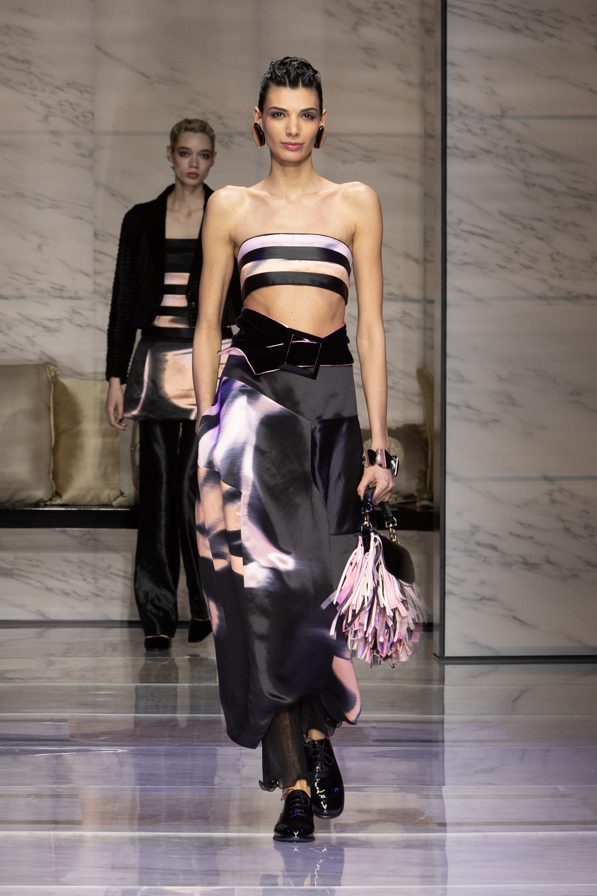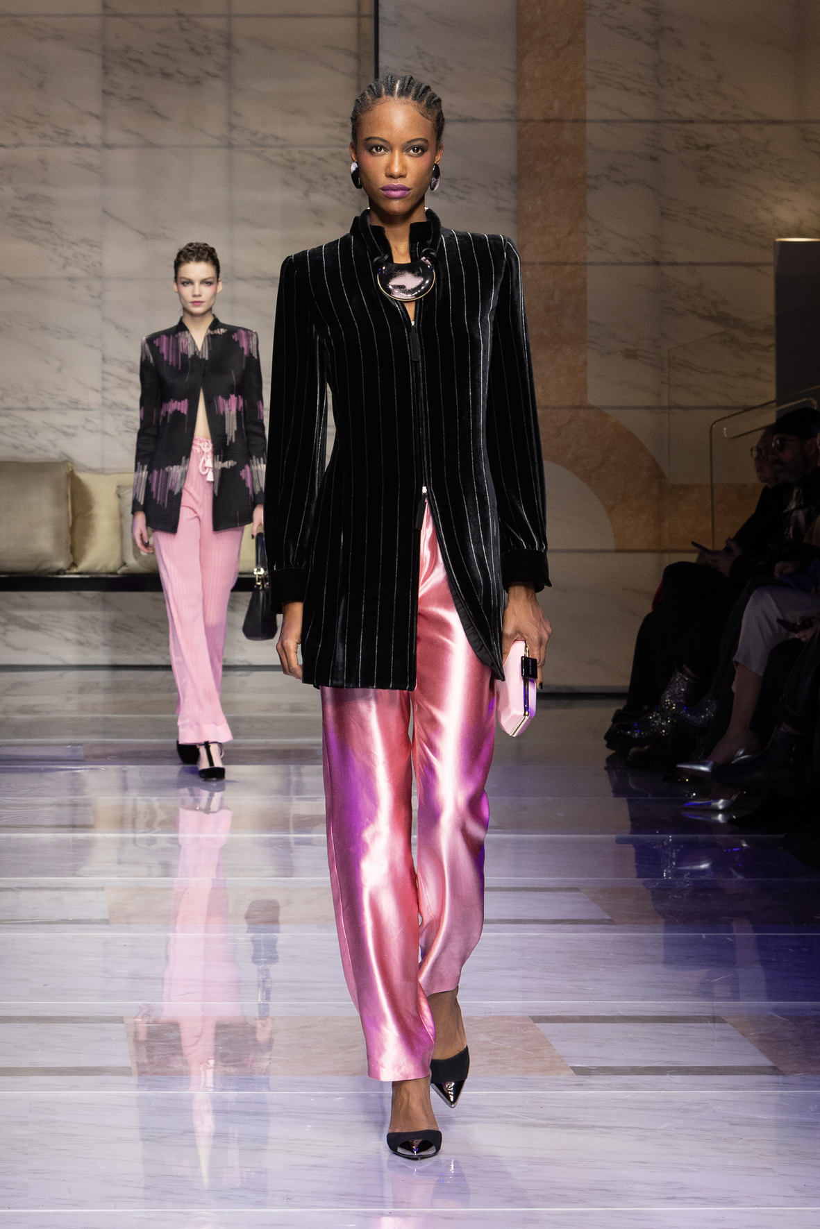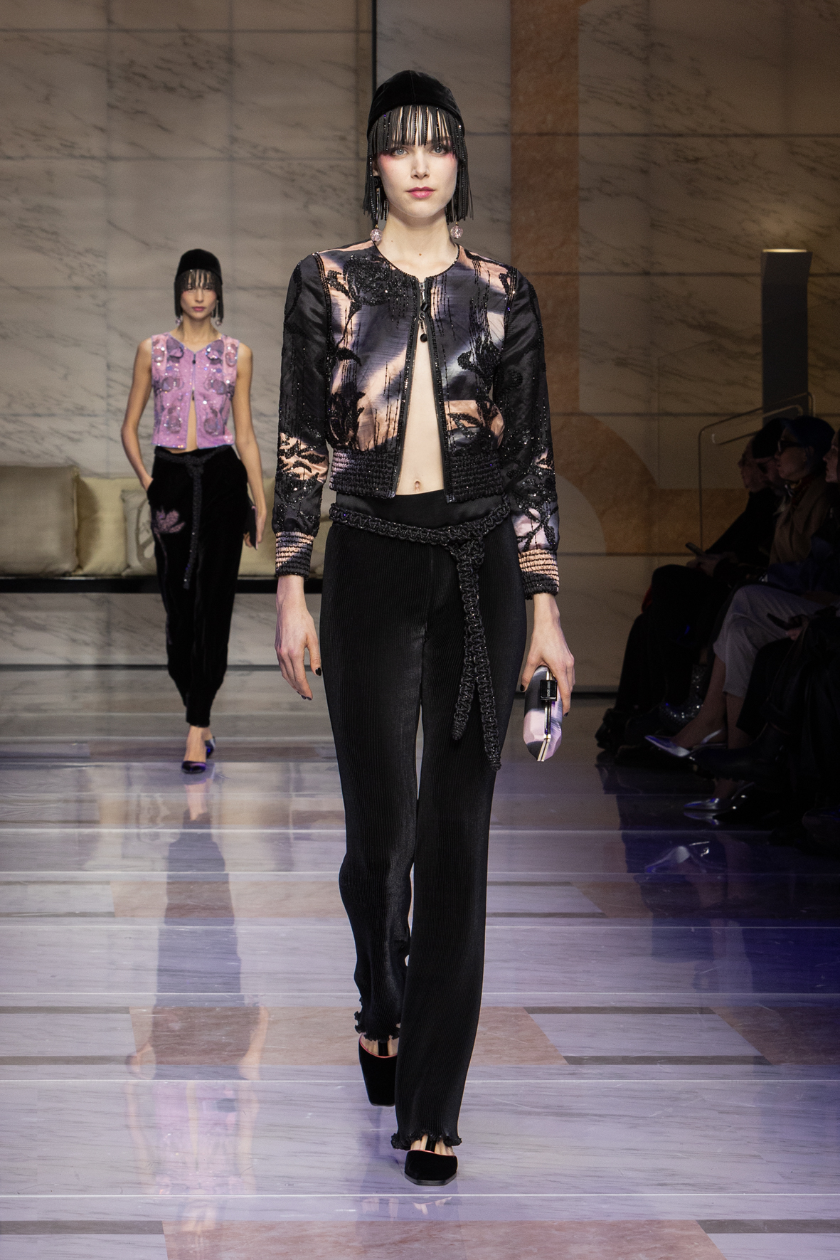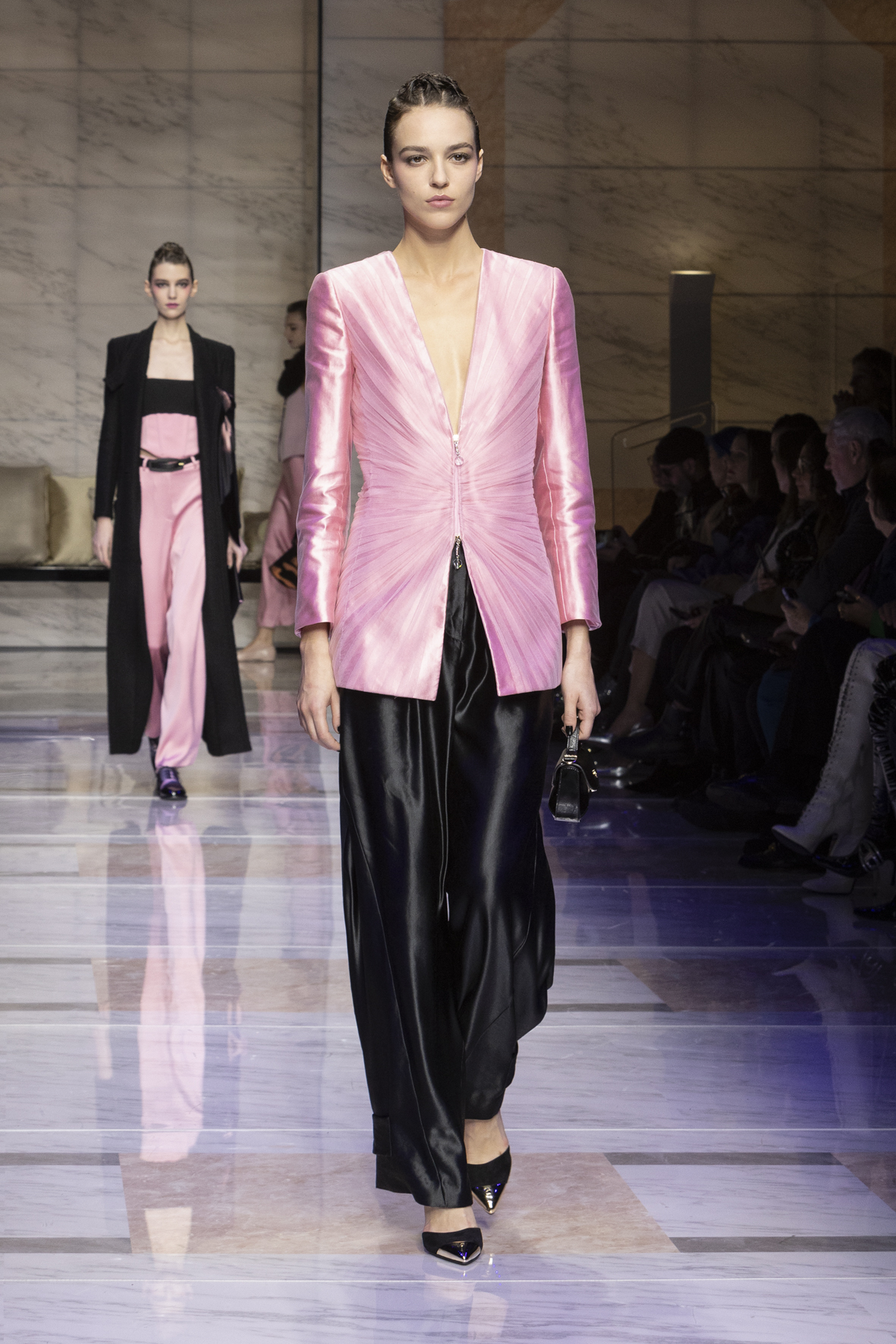Makeup is always an intimate and personal moment. So is the atmosphere that permeates this collection, and not just because Giorgio Armani once again invites his guests to the small theater in Via Borgonuovo 21. After crossing the threshold of the Milanese palaces, suggested by the elegant marble frame and the harmony of colors and spaces, the guests are welcomed into a domestic dimension evoked by the presence of sofa cushions. It feels like a living room, a place for dialogue and socialization, and the wardrobe that accompanies this idea of gentle domesticity is fluid and sublime.