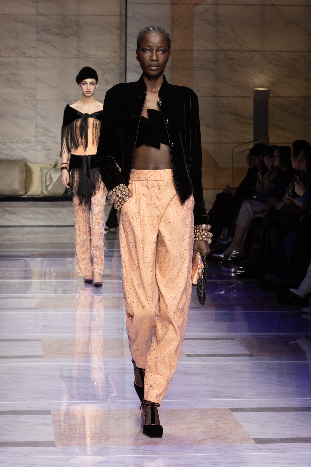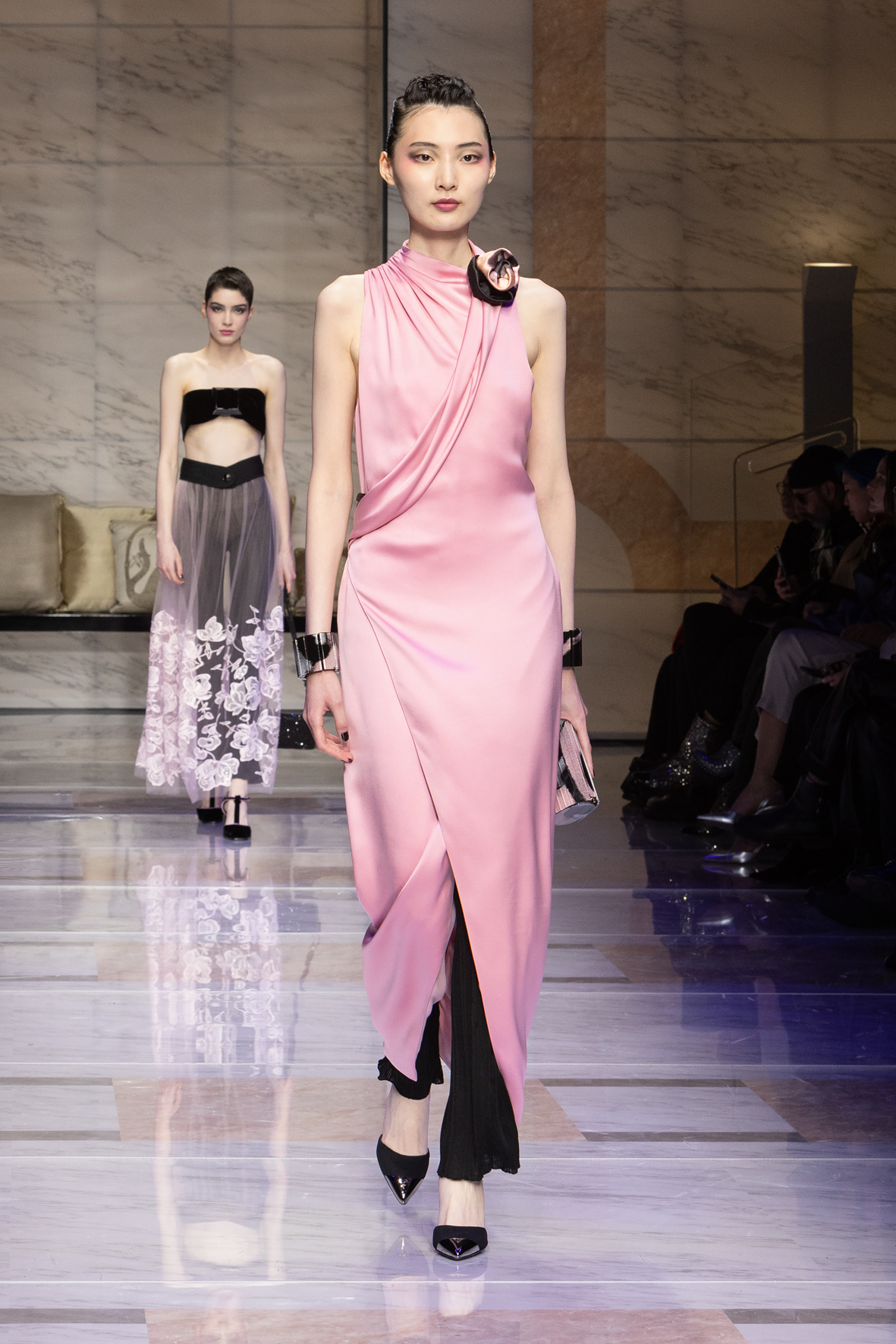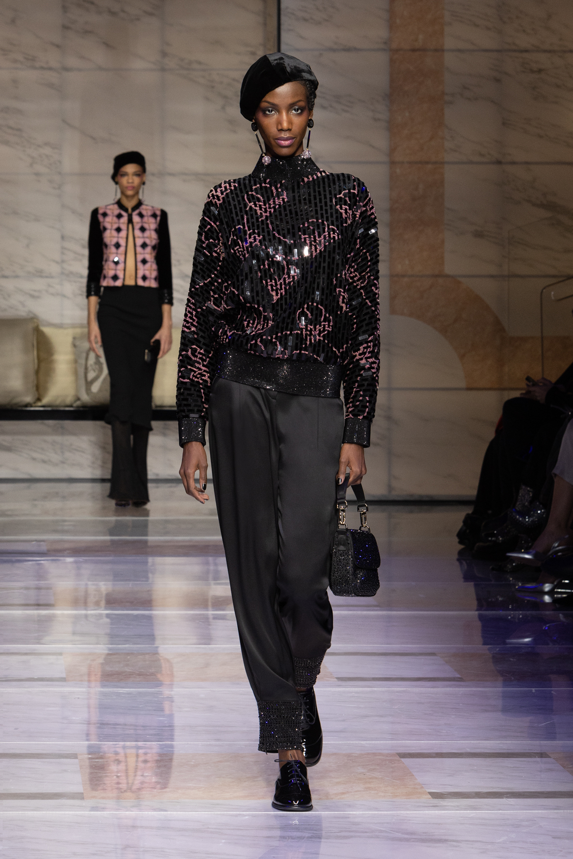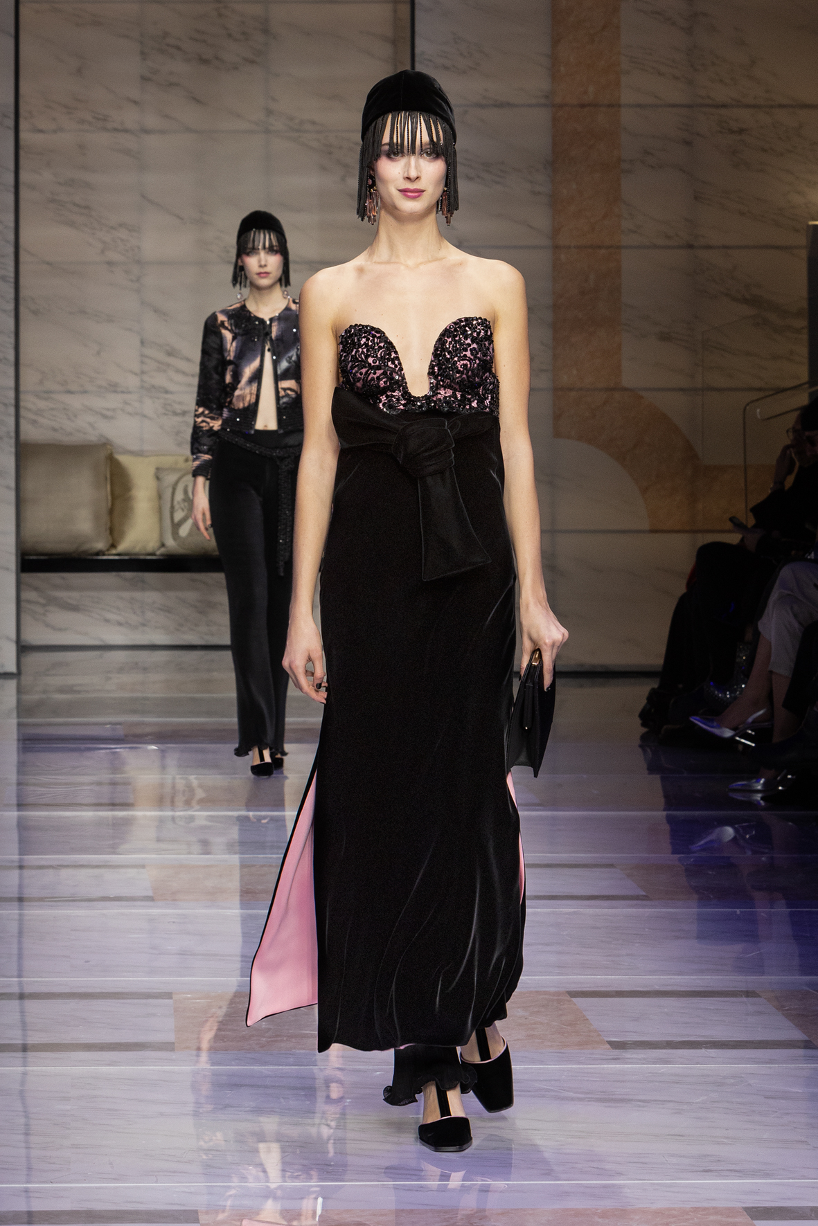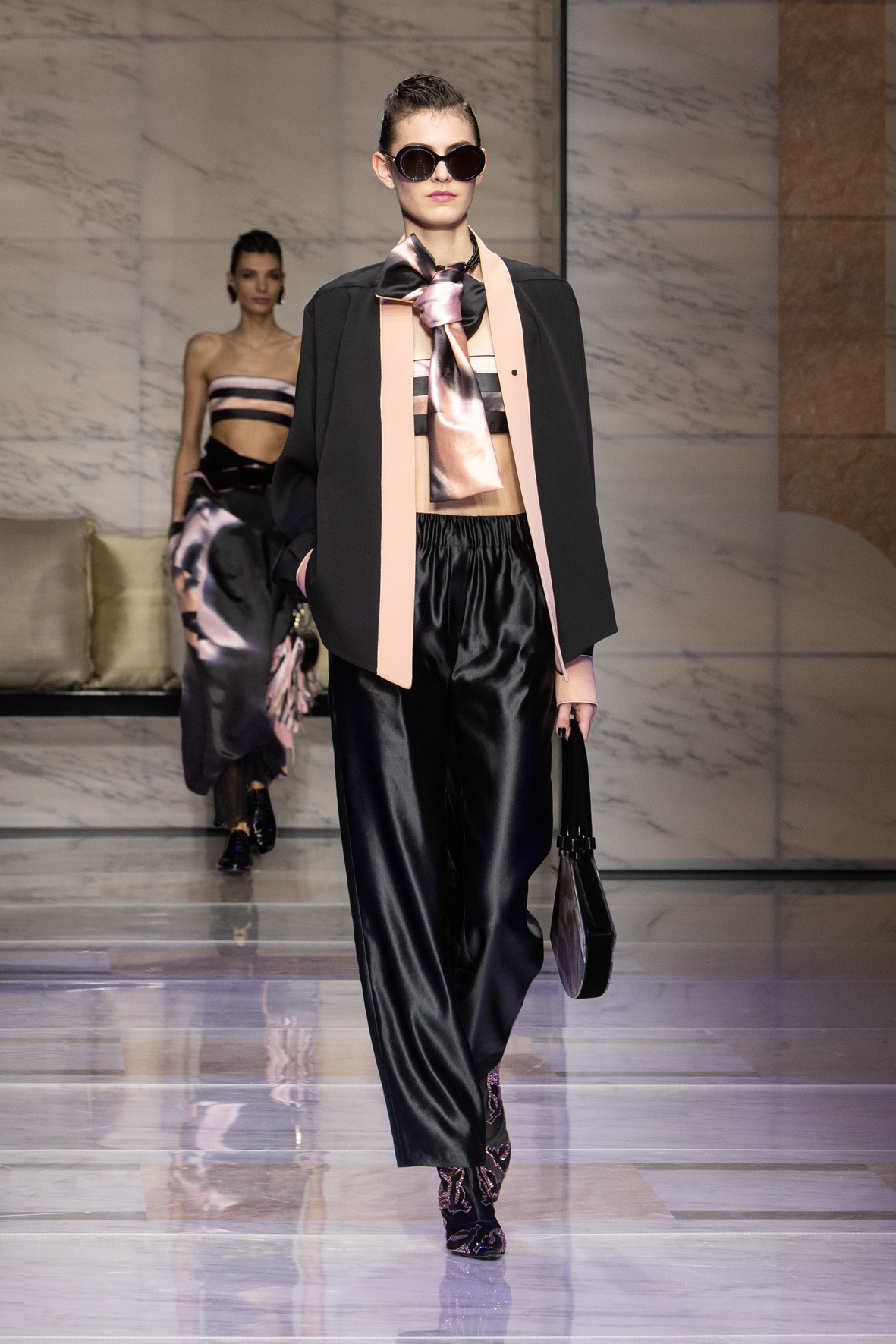 Makeup is always an intimate and personal moment. So is the atmosphere that permeates this collection, and not just because Giorgio Armani once again invites his guests to the small theater in Via Borgonuovo 21. After crossing the threshold of the Milanese palaces, suggested by the elegant marble frame and the harmony of colors and spaces, the guests are welcomed into a domestic dimension evoked by the presence of sofa cushions. It feels like a living room, a place for dialogue and socialization, and the wardrobe that accompanies this idea of gentle domesticity is fluid and sublime.