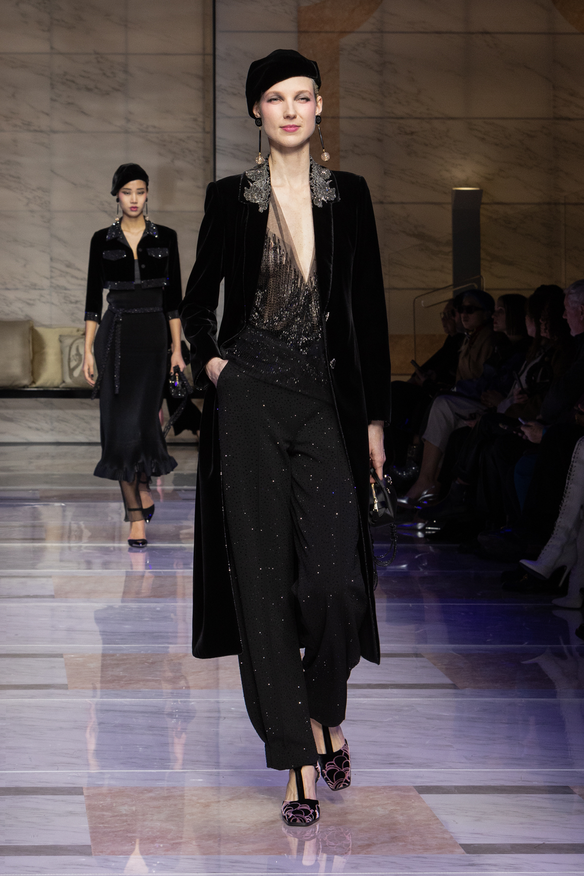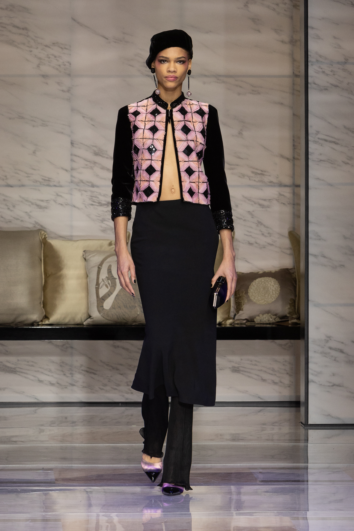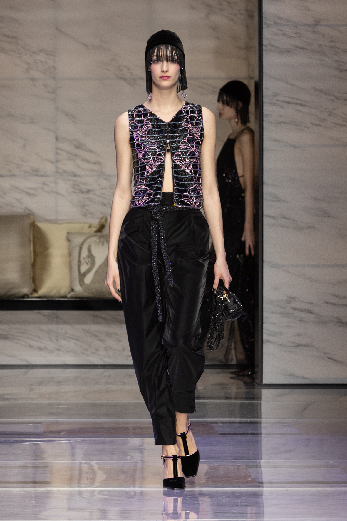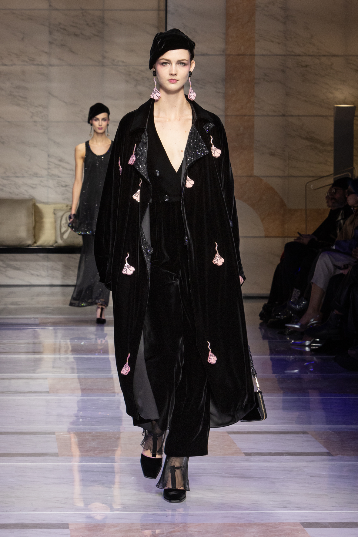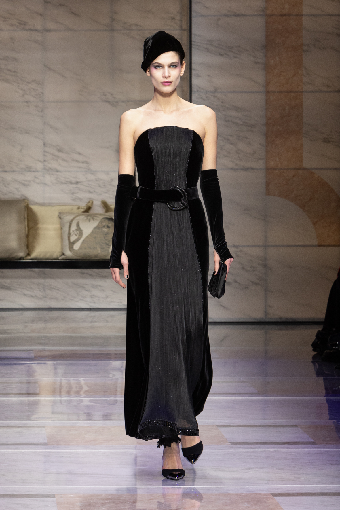 Makeup is always an intimate and personal moment. So is the atmosphere that permeates this collection, and not just because Giorgio Armani once again invites his guests to the small theater in Via Borgonuovo 21. After crossing the threshold of the Milanese palaces, suggested by the elegant marble frame and the harmony of colors and spaces, the guests are welcomed into a domestic dimension evoked by the presence of sofa cushions. It feels like a living room, a place for dialogue and socialization, and the wardrobe that accompanies this idea of gentle domesticity is fluid and sublime.