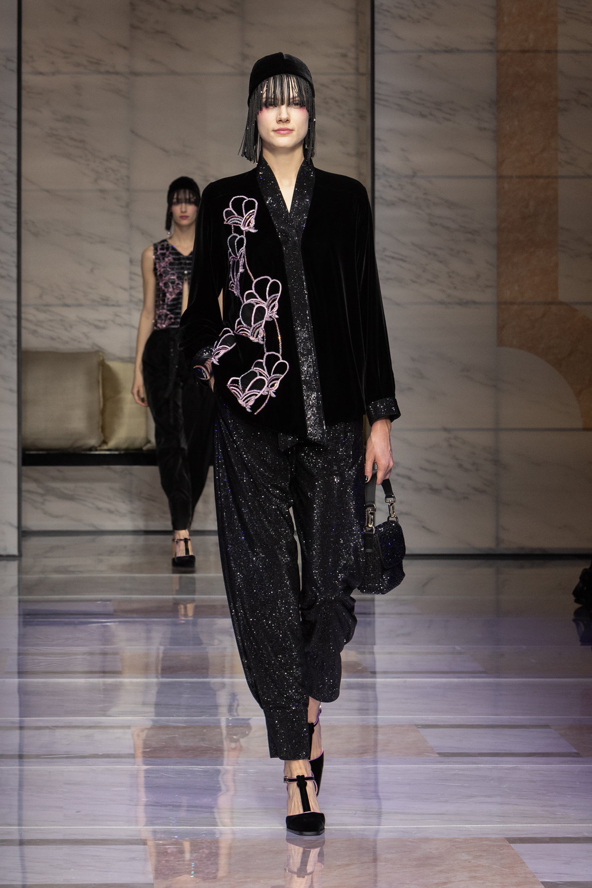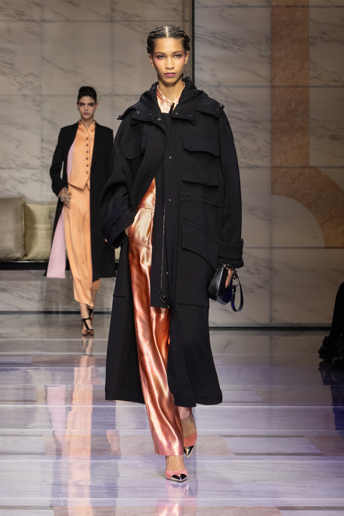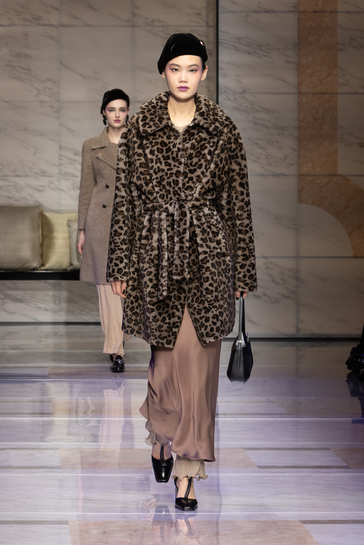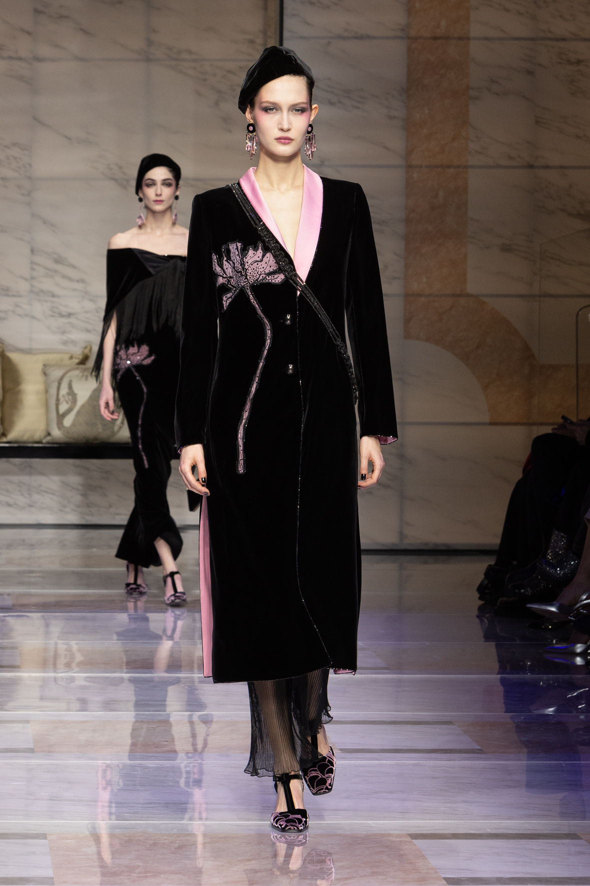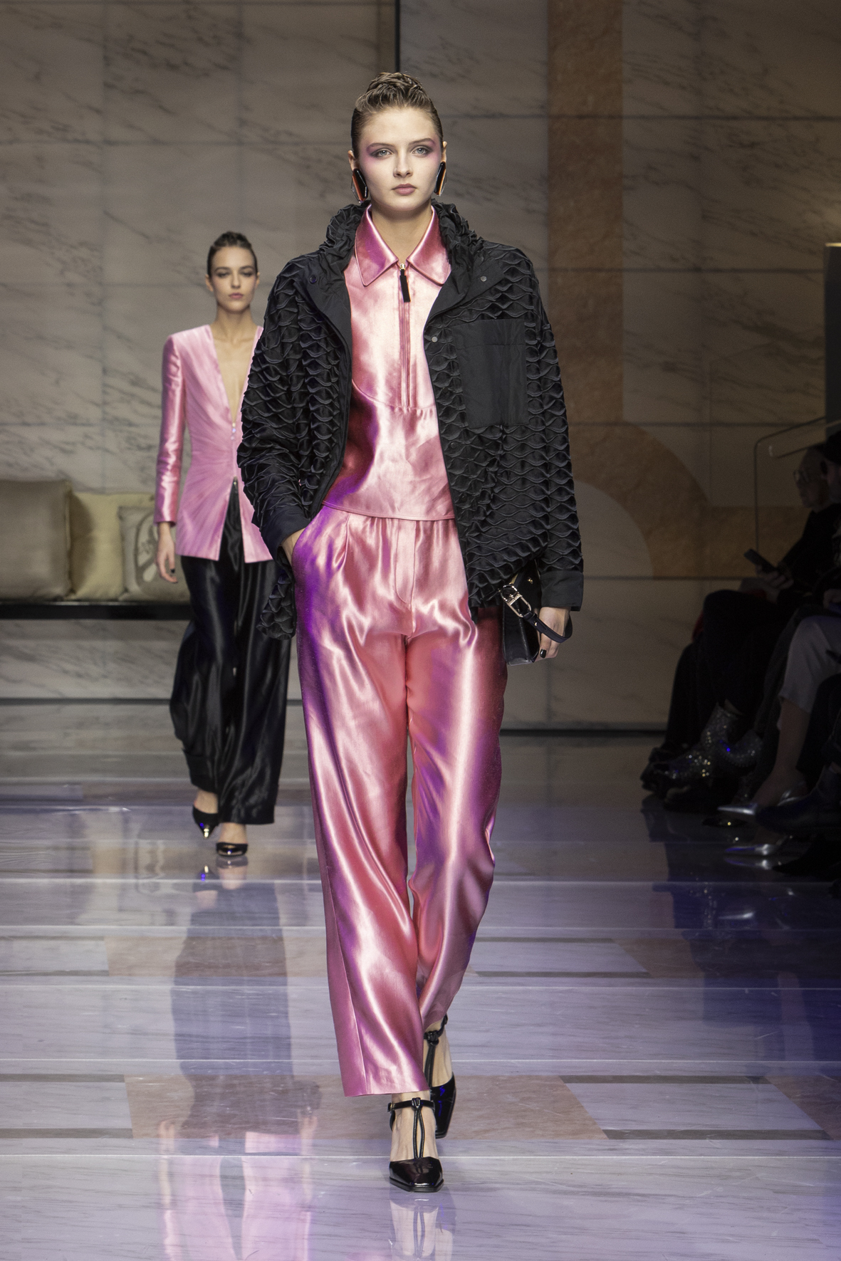 Makeup is always an intimate and personal moment. So is the atmosphere that permeates this collection, and not just because Giorgio Armani once again invites his guests to the small theater in Via Borgonuovo 21. After crossing the threshold of the Milanese palaces, suggested by the elegant marble frame and the harmony of colors and spaces, the guests are welcomed into a domestic dimension evoked by the presence of sofa cushions. It feels like a living room, a place for dialogue and socialization, and the wardrobe that accompanies this idea of gentle domesticity is fluid and sublime.