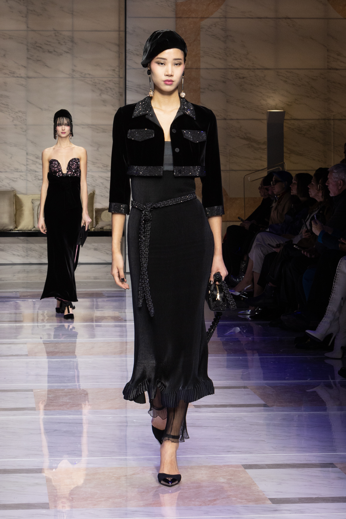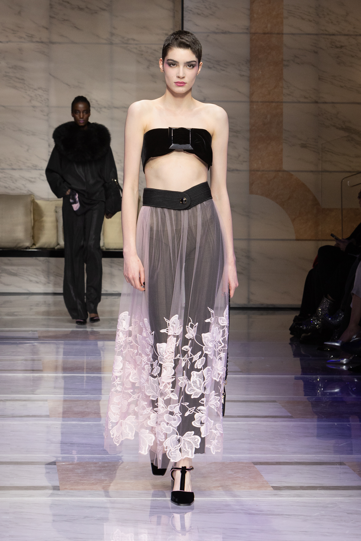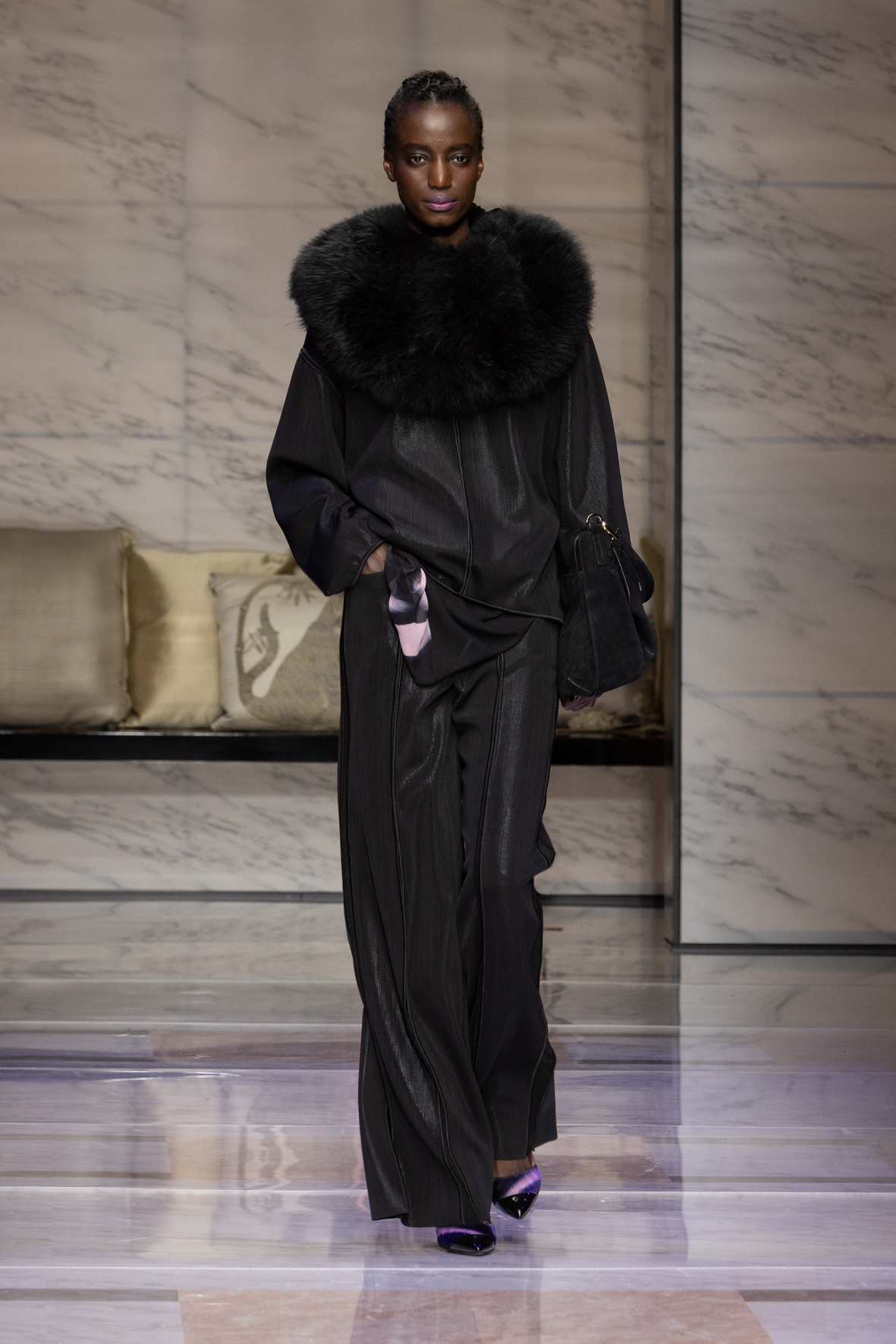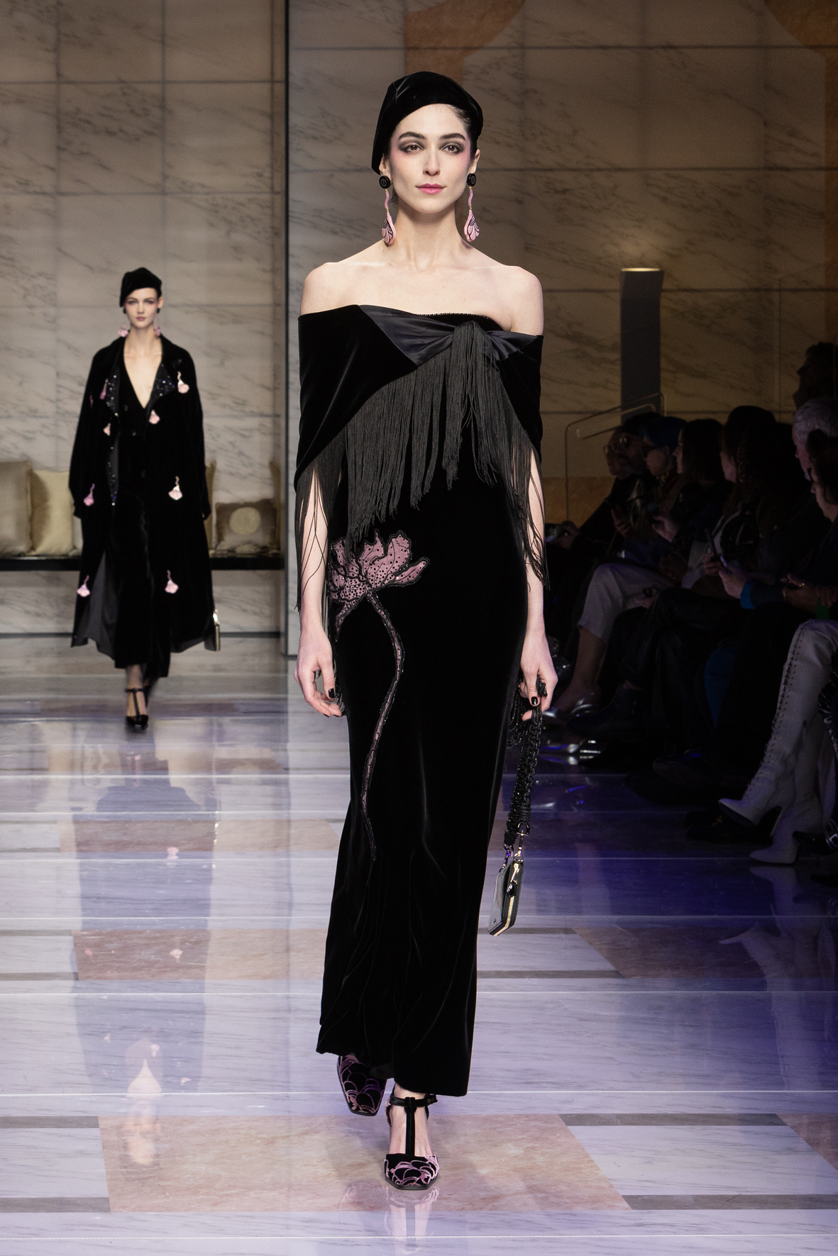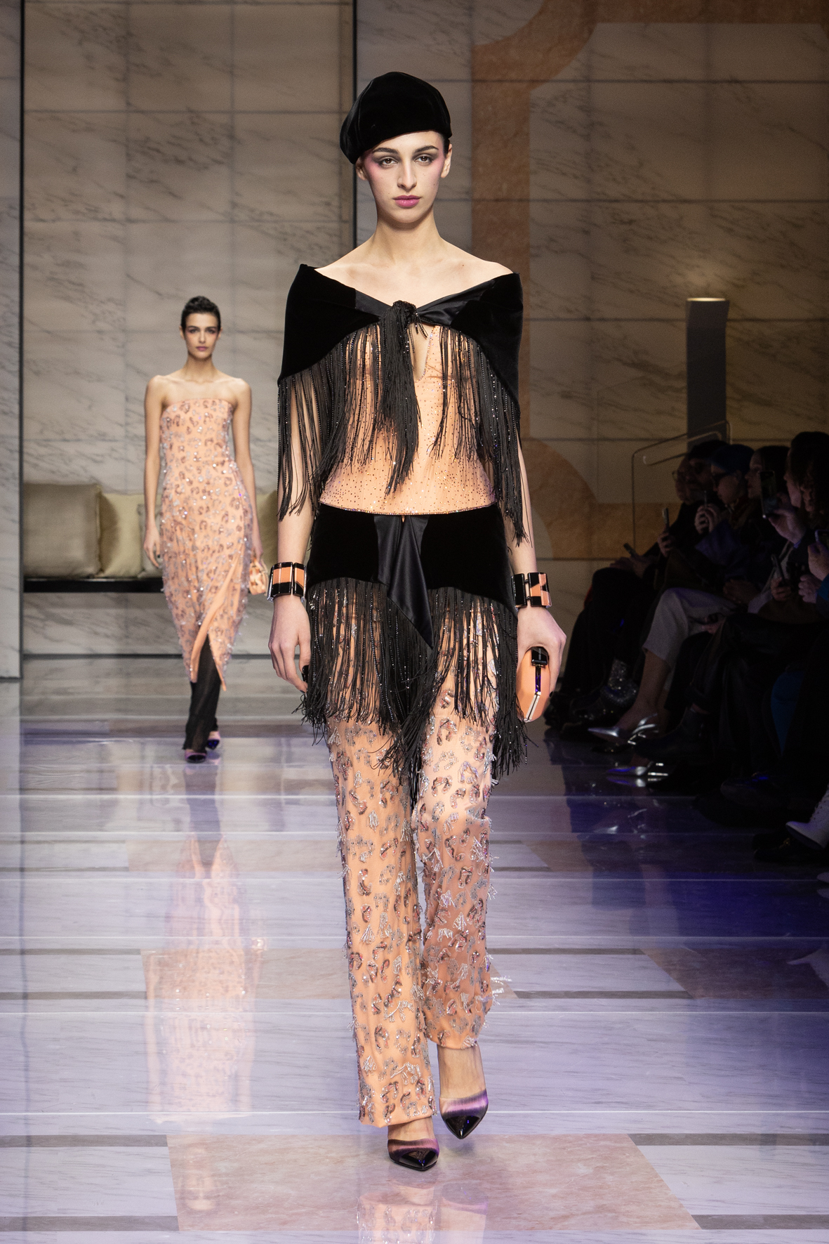 Makeup is always an intimate and personal moment. So is the atmosphere that permeates this collection, and not just because Giorgio Armani once again invites his guests to the small theater in Via Borgonuovo 21. After crossing the threshold of the Milanese palaces, suggested by the elegant marble frame and the harmony of colors and spaces, the guests are welcomed into a domestic dimension evoked by the presence of sofa cushions. It feels like a living room, a place for dialogue and socialization, and the wardrobe that accompanies this idea of gentle domesticity is fluid and sublime.