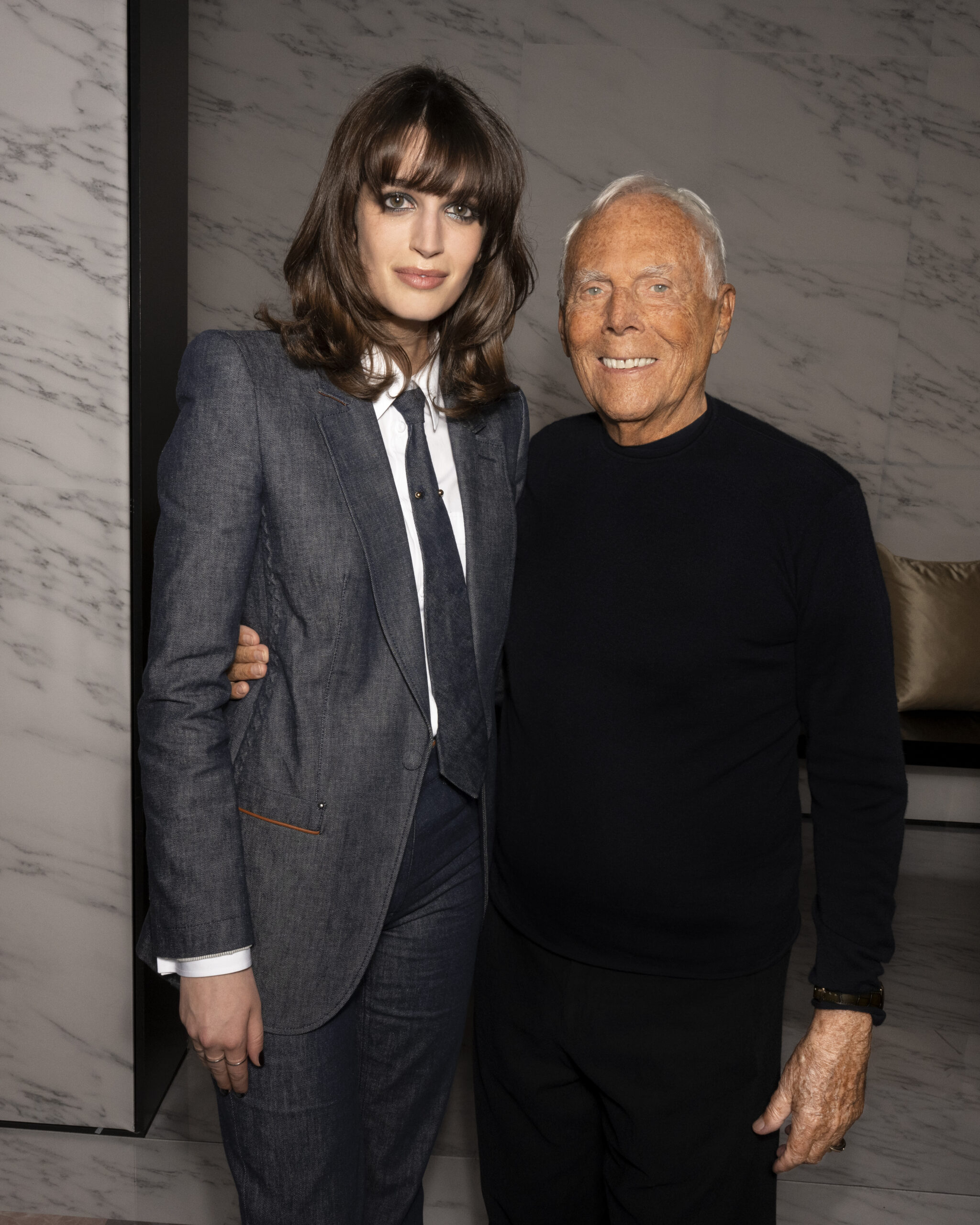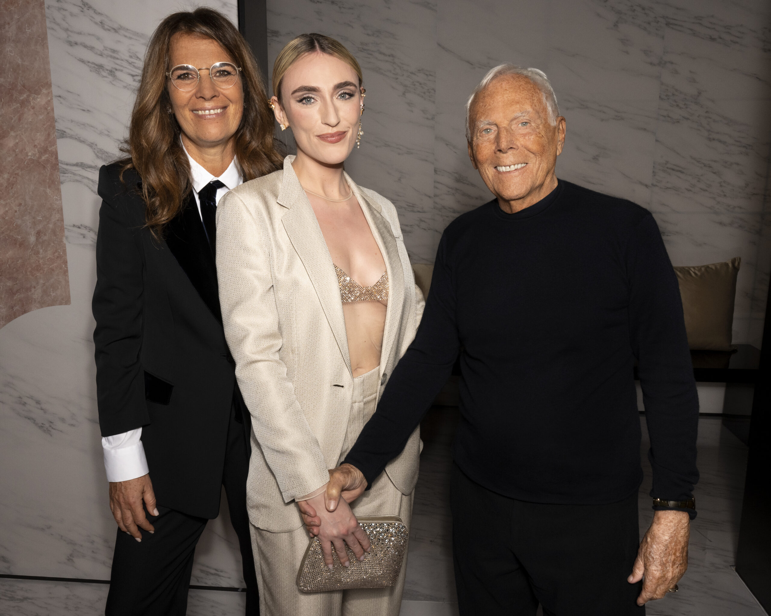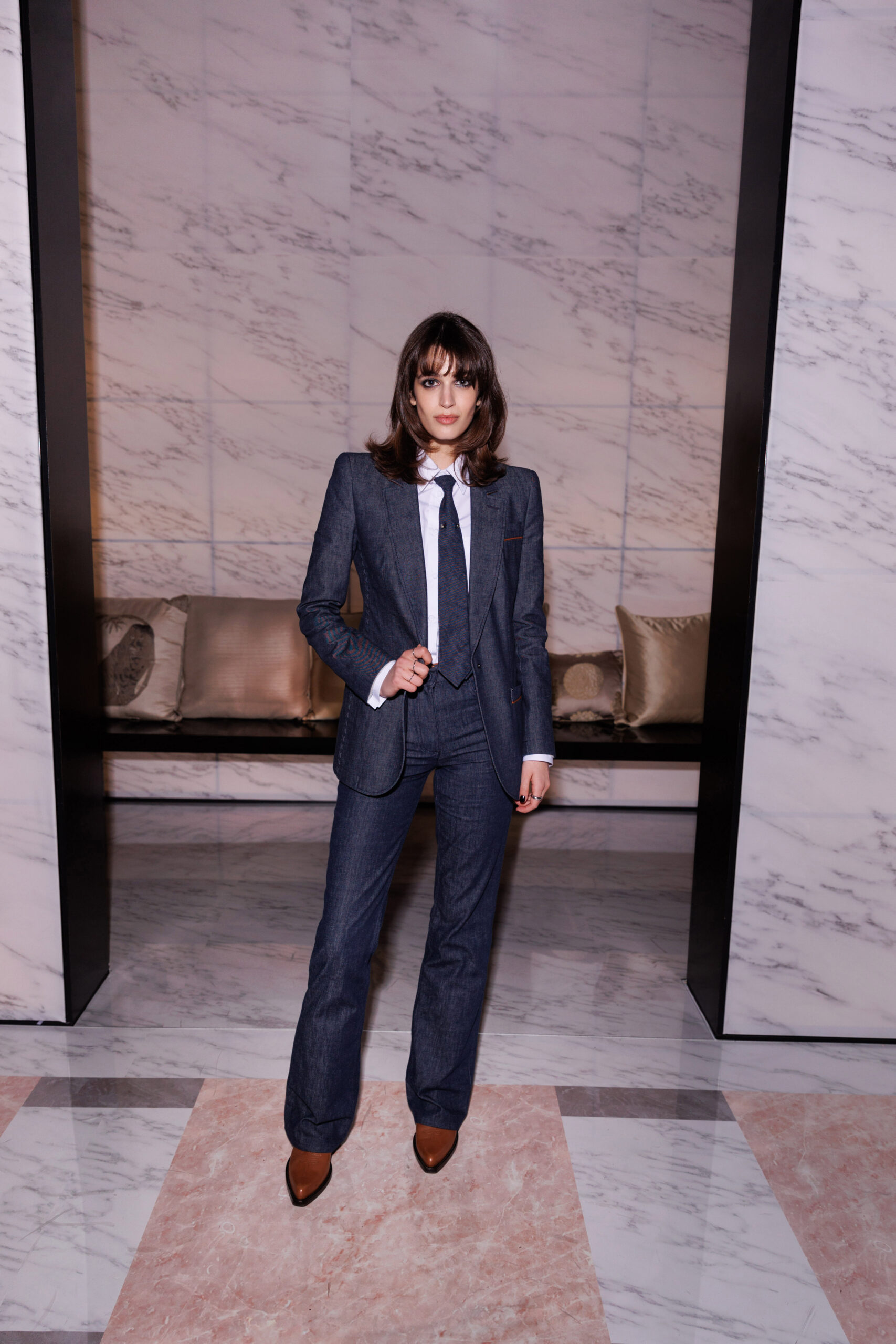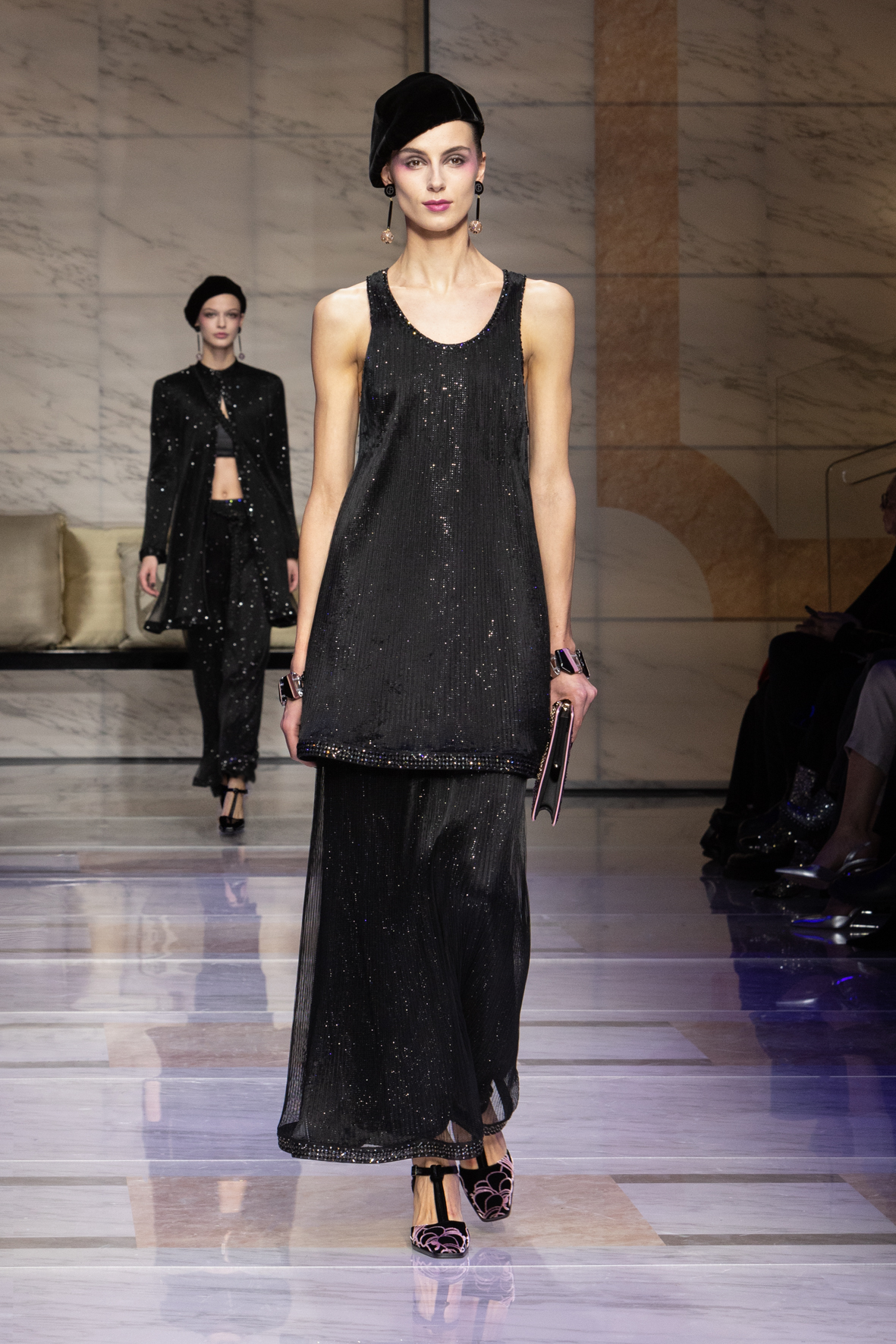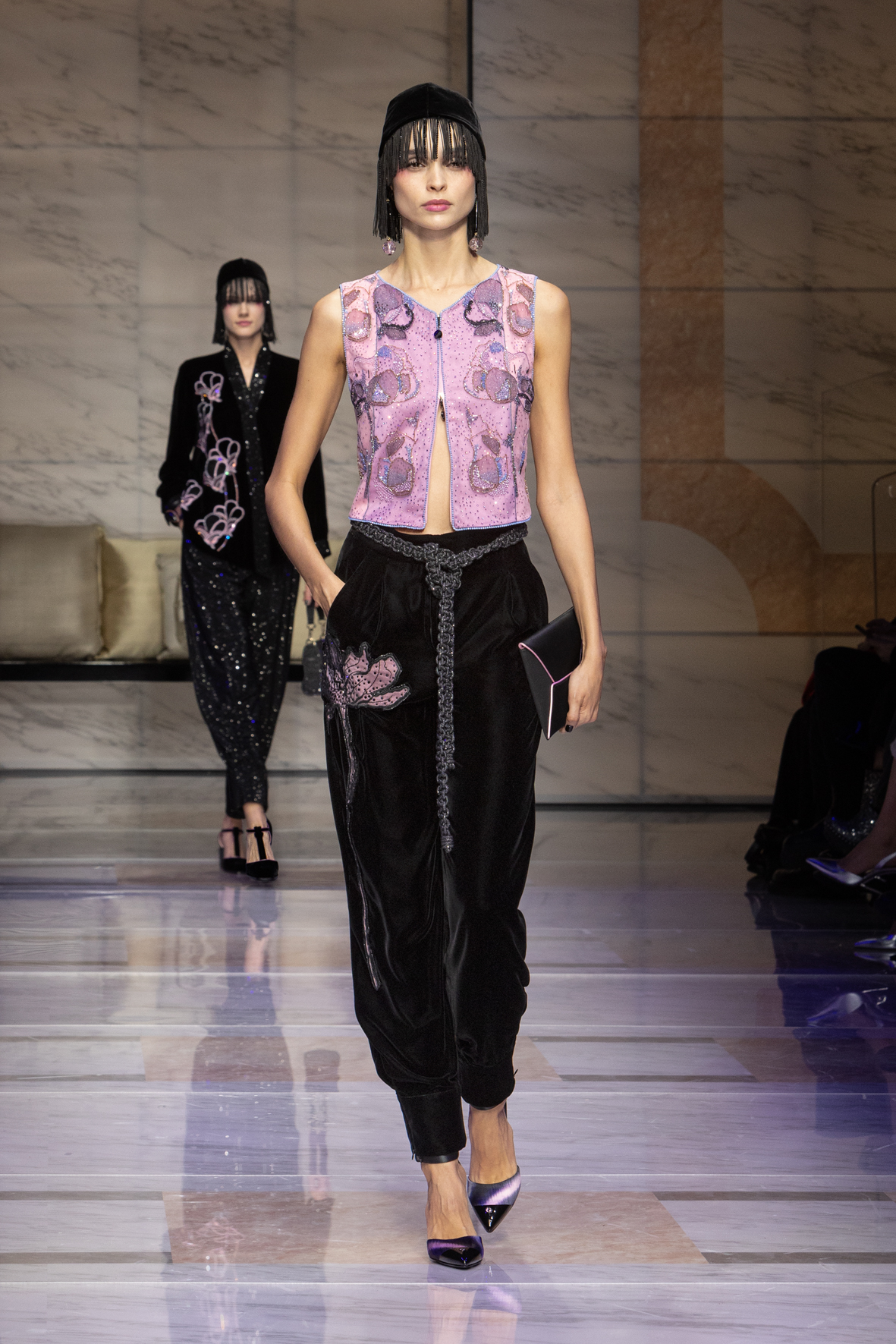 Makeup is always an intimate and personal moment. So is the atmosphere that permeates this collection, and not just because Giorgio Armani once again invites his guests to the small theater in Via Borgonuovo 21. After crossing the threshold of the Milanese palaces, suggested by the elegant marble frame and the harmony of colors and spaces, the guests are welcomed into a domestic dimension evoked by the presence of sofa cushions. It feels like a living room, a place for dialogue and socialization, and the wardrobe that accompanies this idea of gentle domesticity is fluid and sublime.