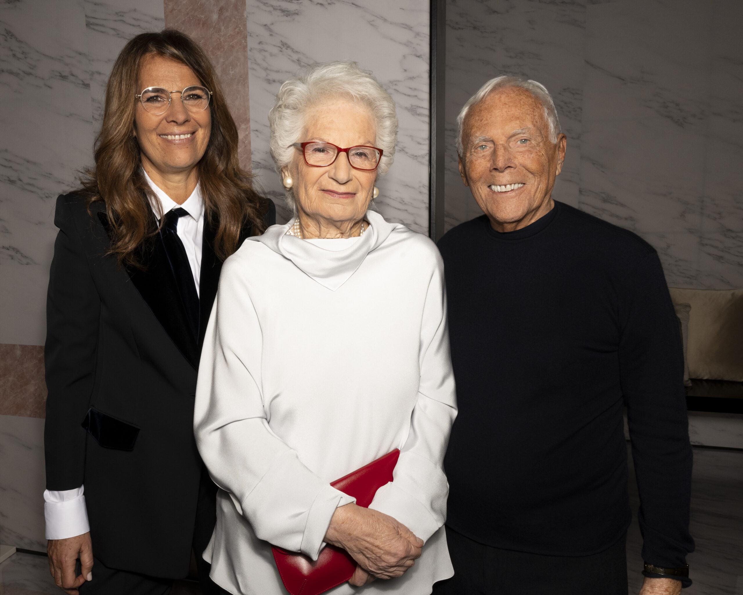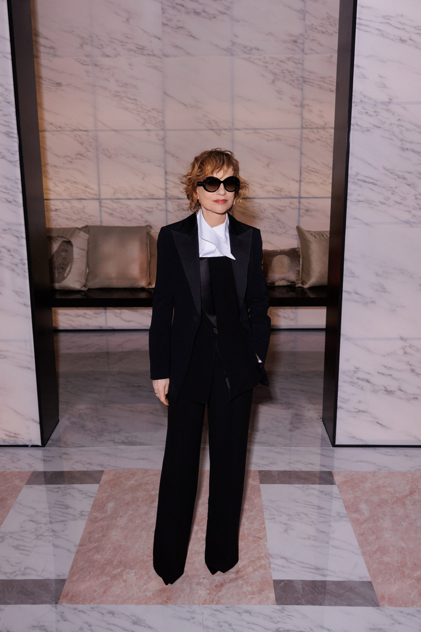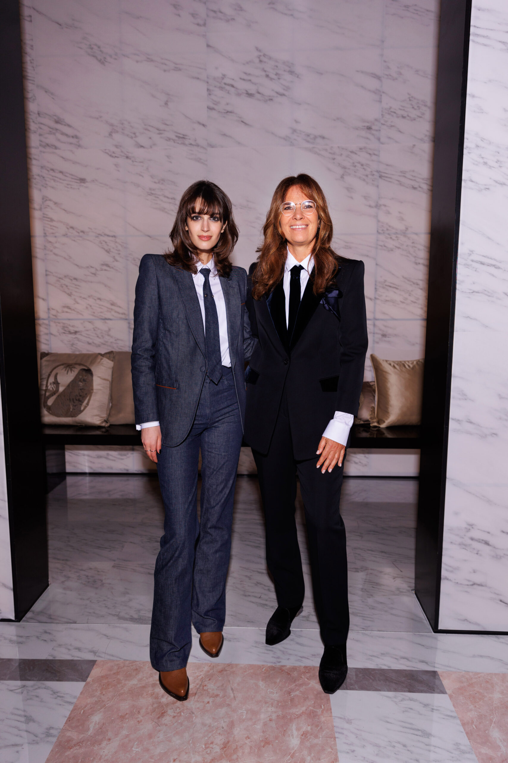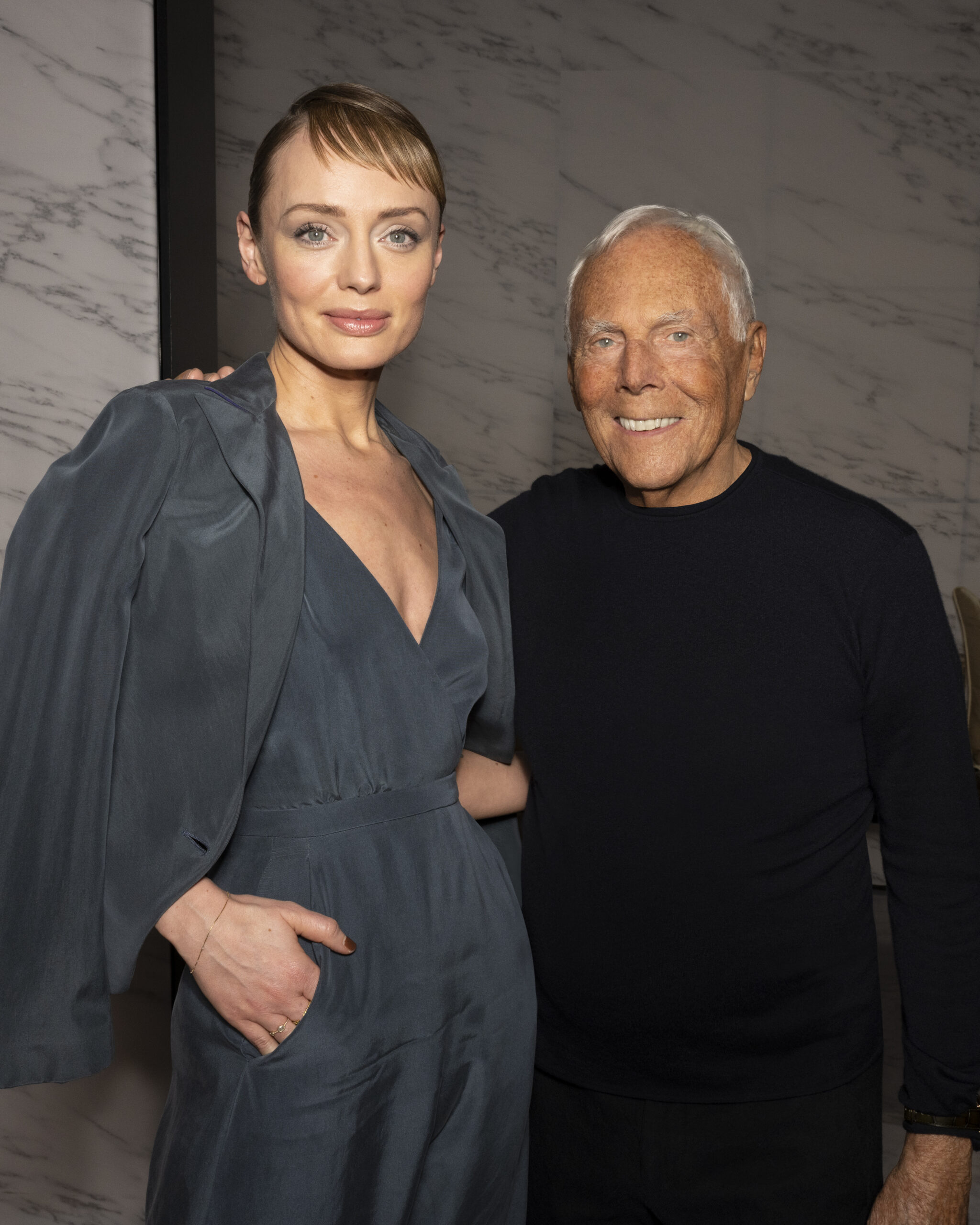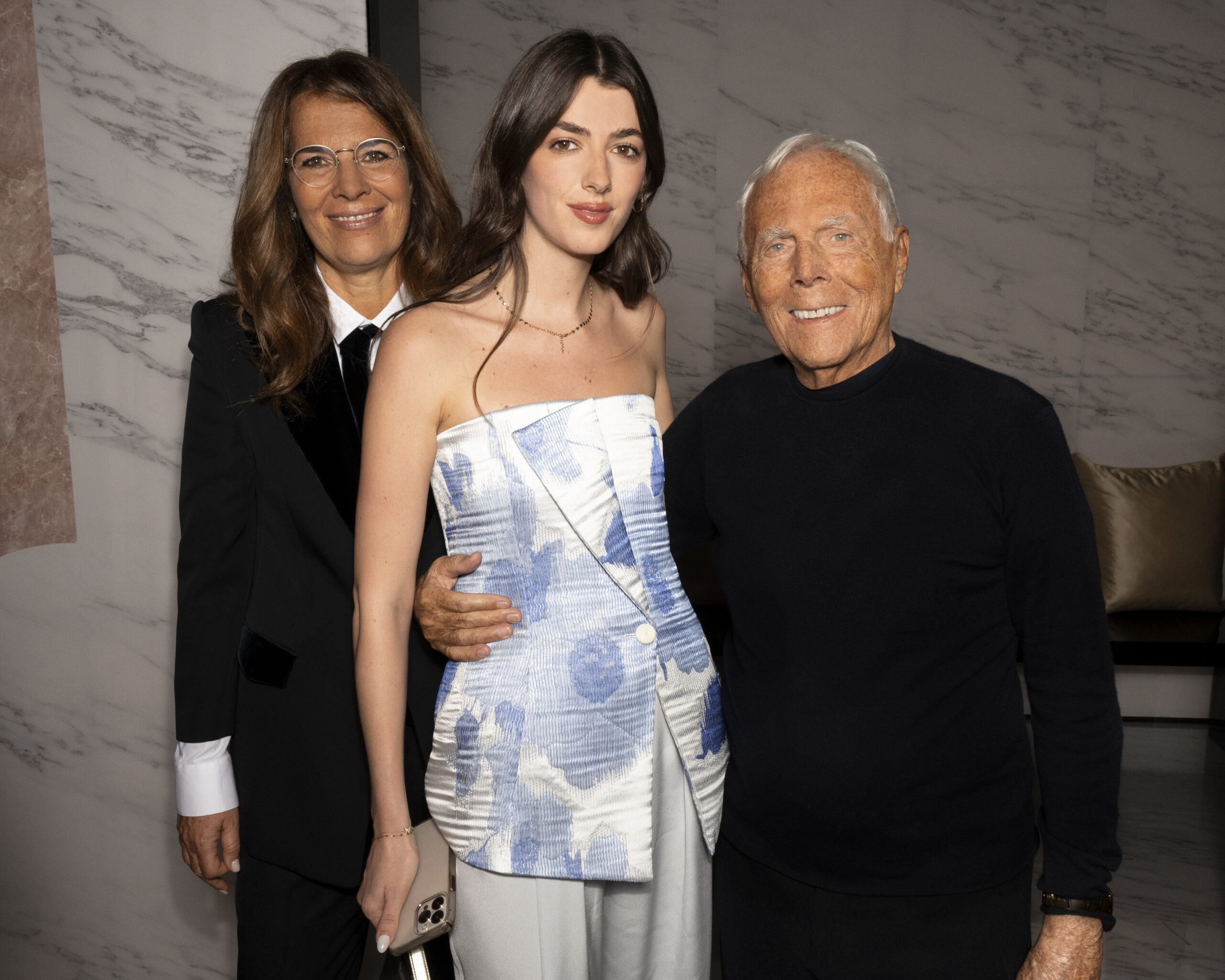 Makeup is always an intimate and personal moment. So is the atmosphere that permeates this collection, and not just because Giorgio Armani once again invites his guests to the small theater in Via Borgonuovo 21. After crossing the threshold of the Milanese palaces, suggested by the elegant marble frame and the harmony of colors and spaces, the guests are welcomed into a domestic dimension evoked by the presence of sofa cushions. It feels like a living room, a place for dialogue and socialization, and the wardrobe that accompanies this idea of gentle domesticity is fluid and sublime.