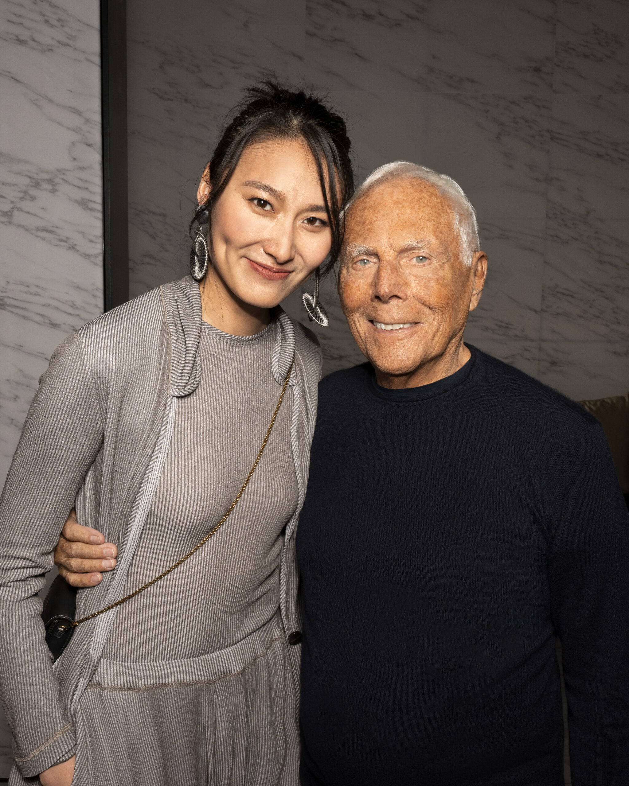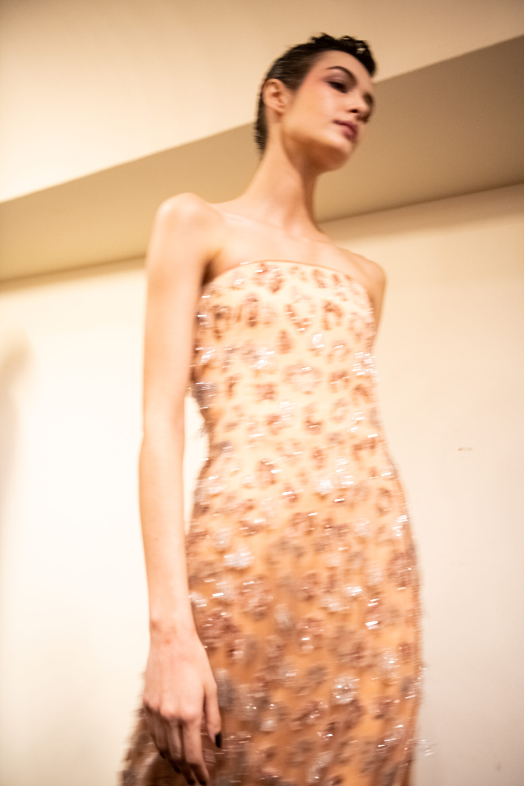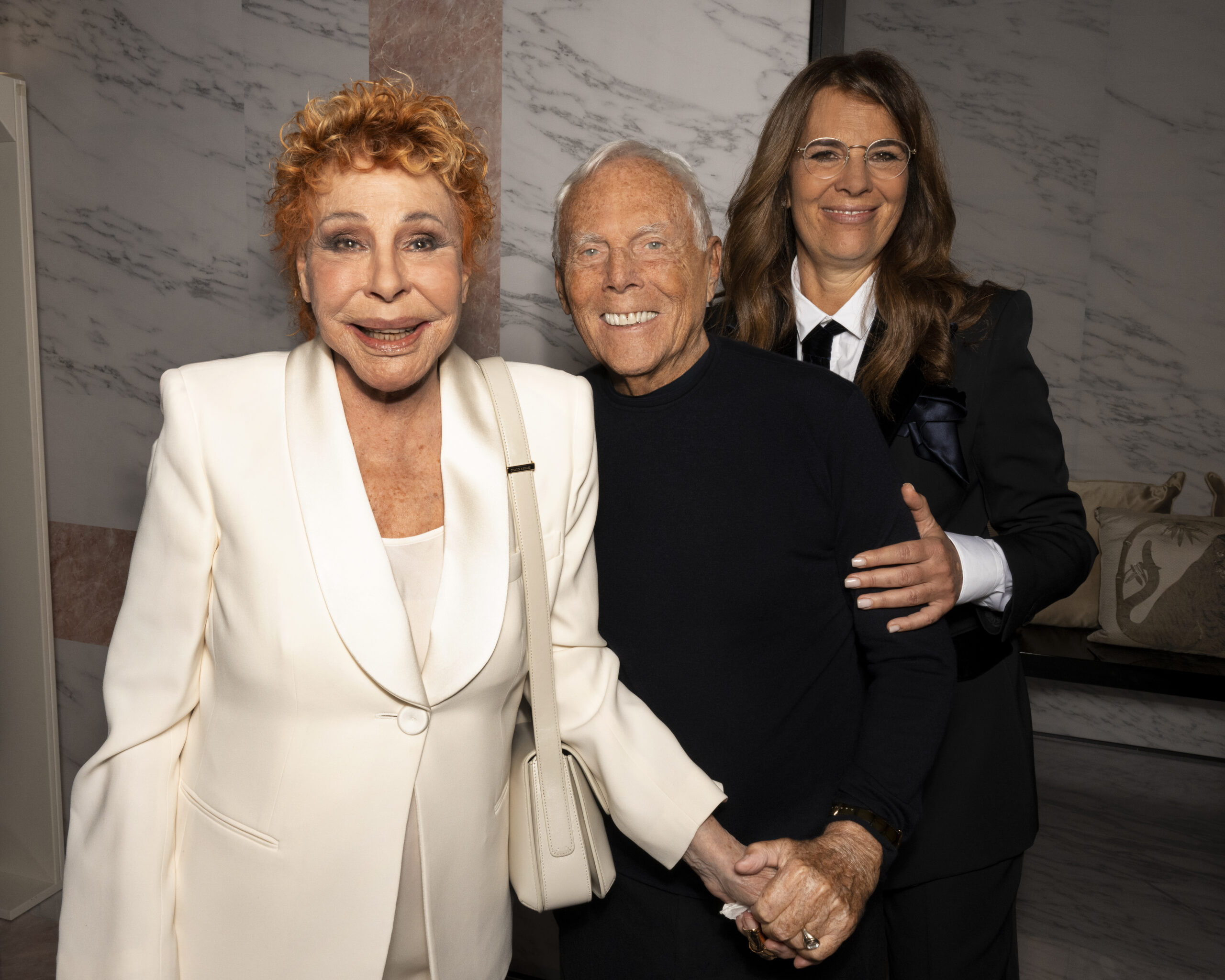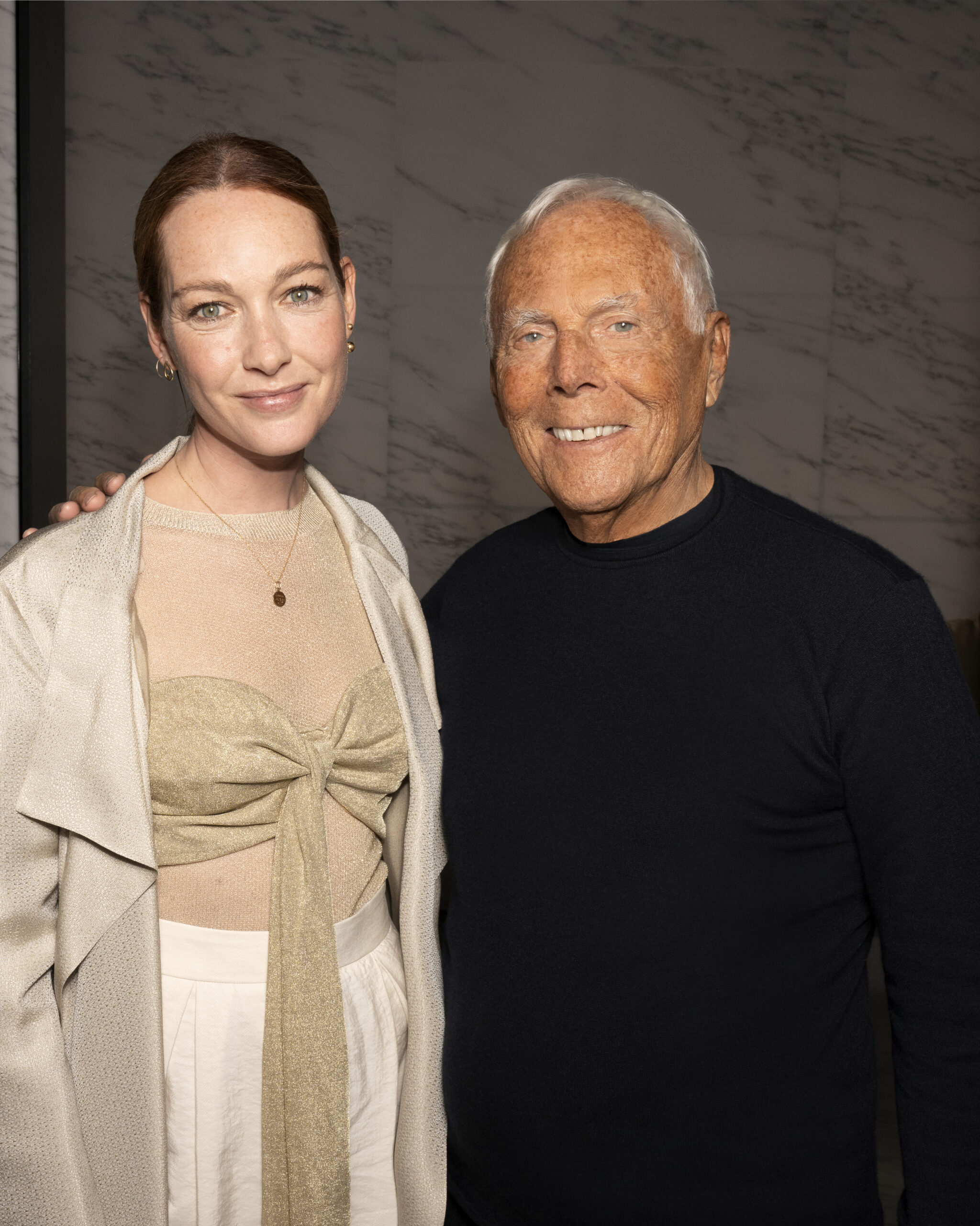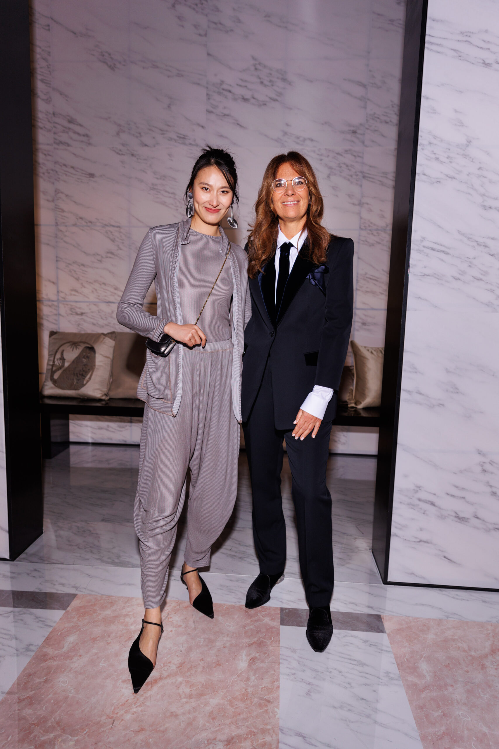 Makeup is always an intimate and personal moment. So is the atmosphere that permeates this collection, and not just because Giorgio Armani once again invites his guests to the small theater in Via Borgonuovo 21. After crossing the threshold of the Milanese palaces, suggested by the elegant marble frame and the harmony of colors and spaces, the guests are welcomed into a domestic dimension evoked by the presence of sofa cushions. It feels like a living room, a place for dialogue and socialization, and the wardrobe that accompanies this idea of gentle domesticity is fluid and sublime.