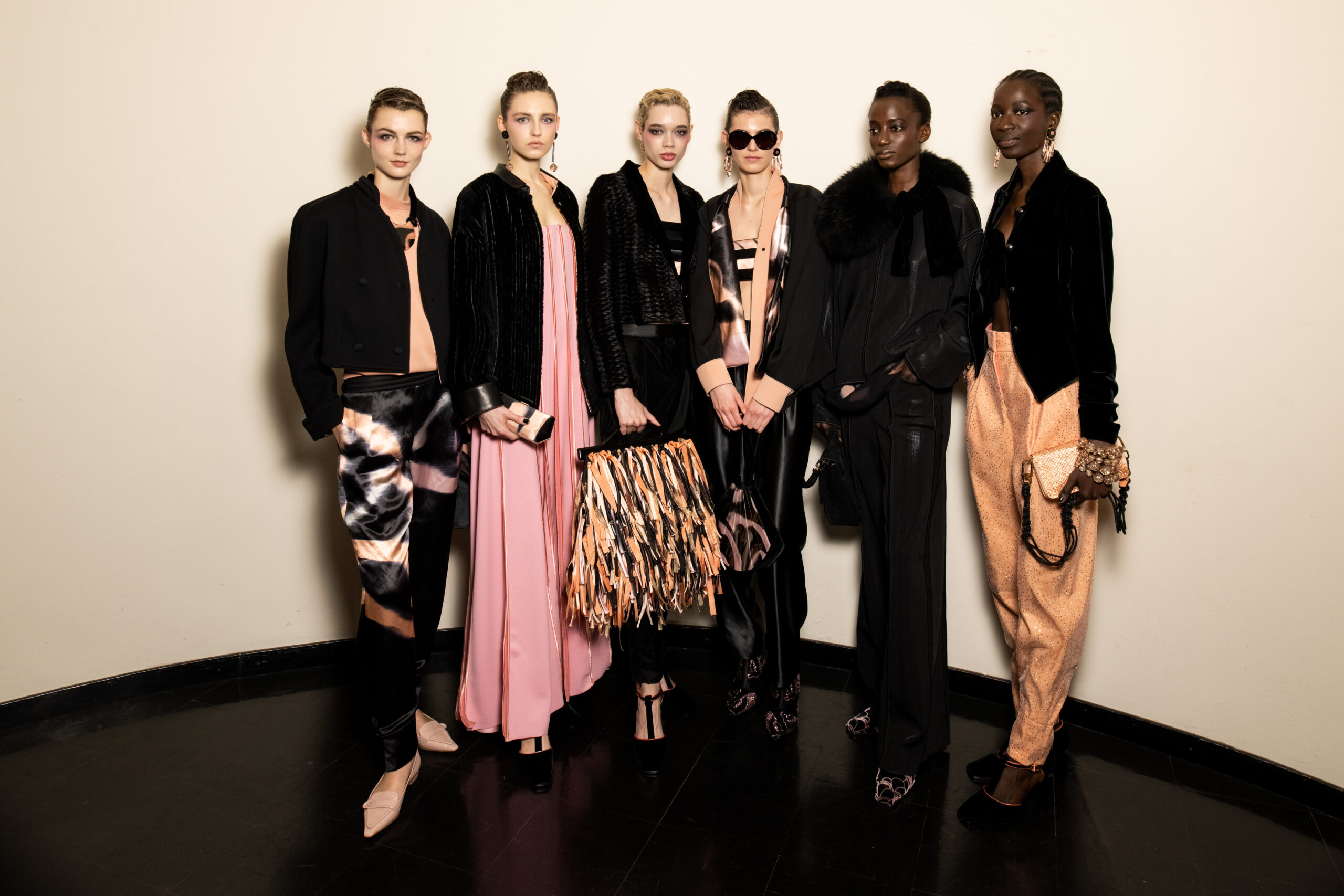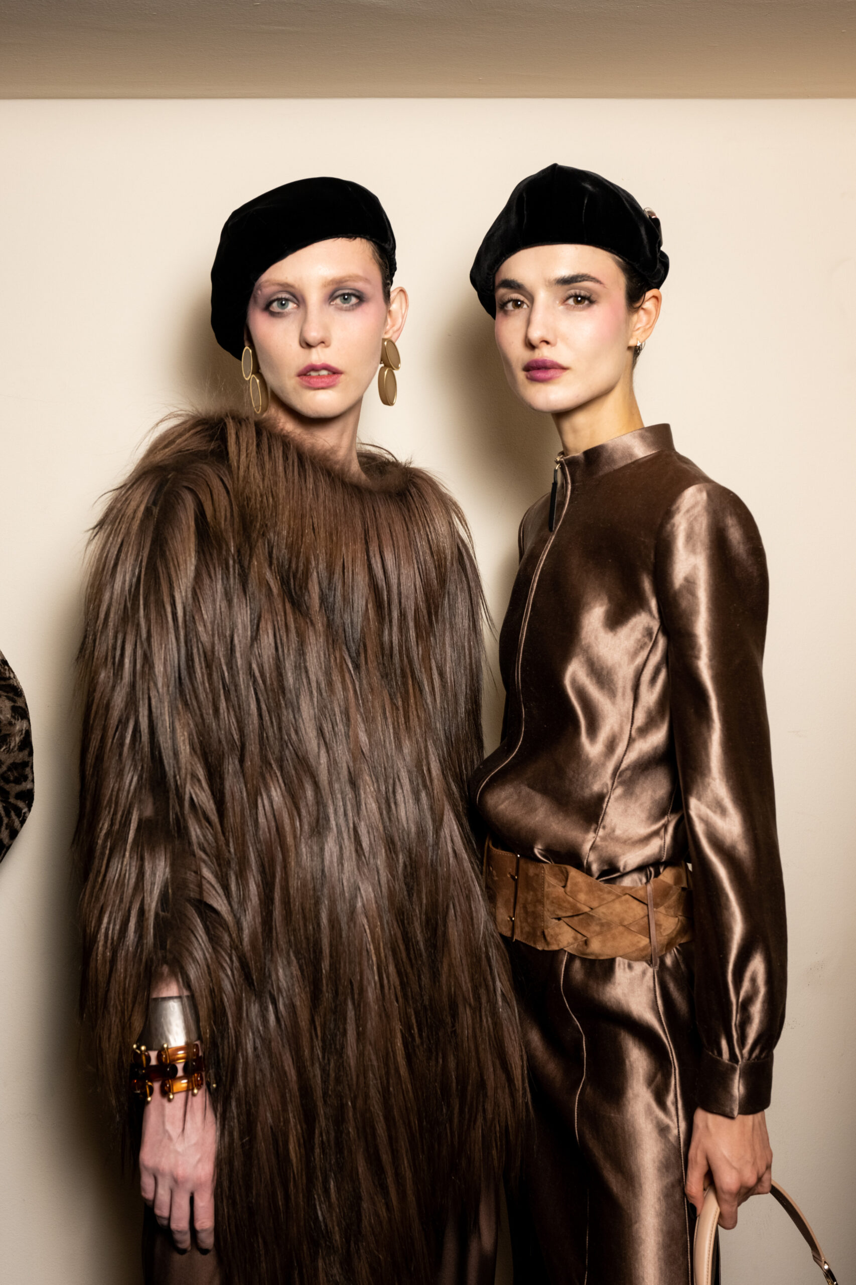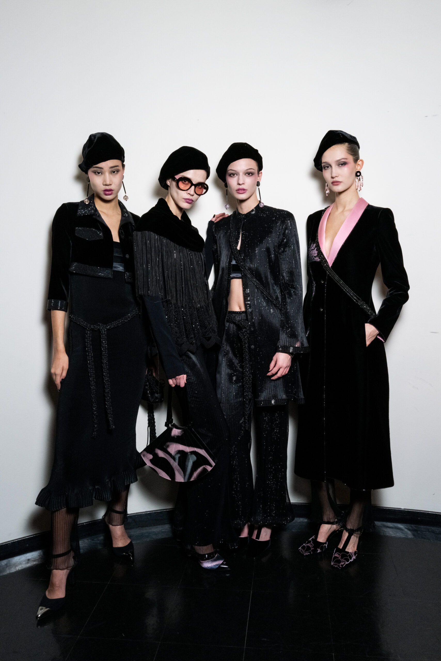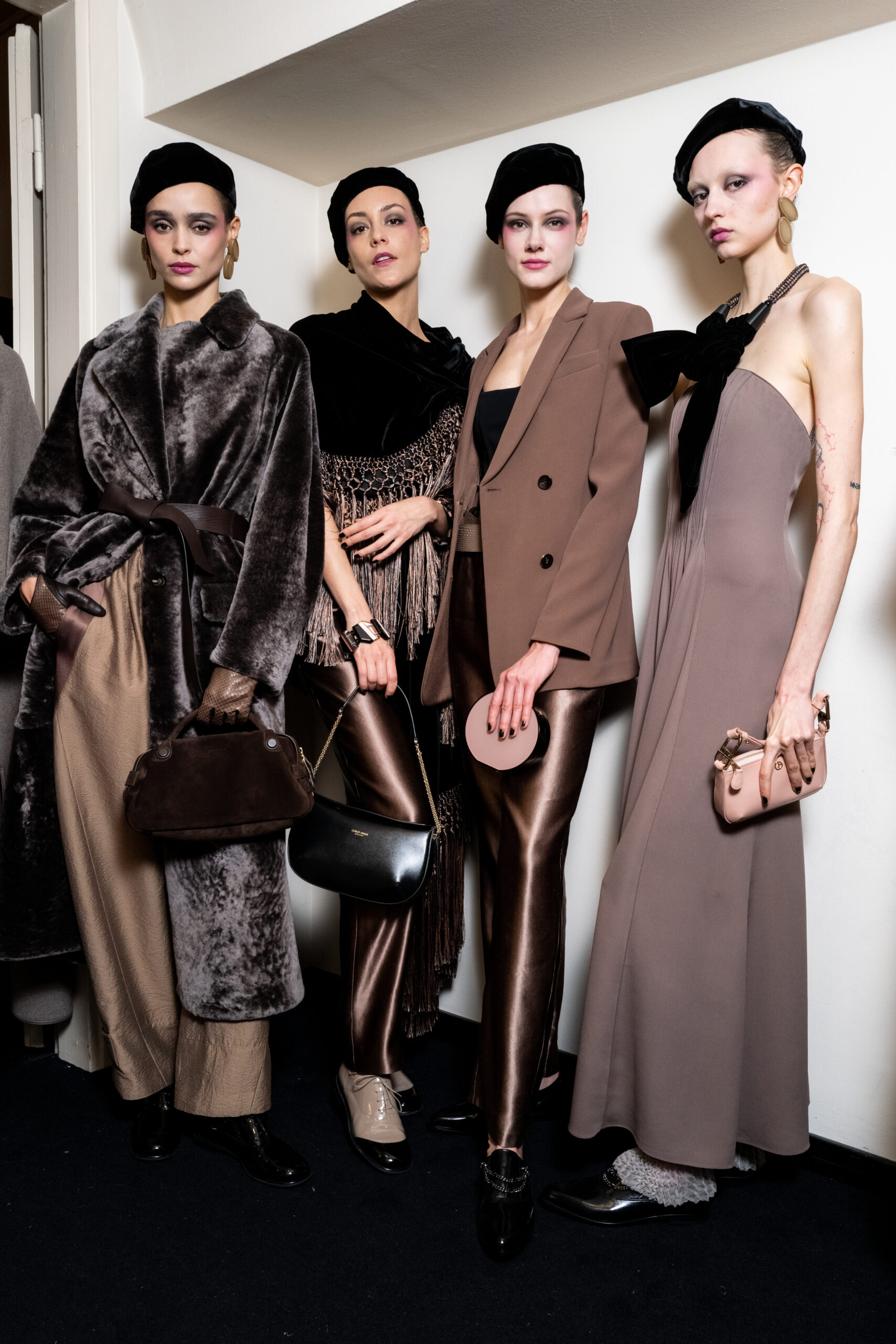 The shapes follow the body and its movements: silky dresses reminiscent of pajamas, wraparound shawls, soft pants, sweaters, elongated jackets and long dresses, in an earthy, bronze and powdery cosmetic palette with hints of tangerine enhanced by an abundance of black Kohl. The stylized floral motif is recurrent, a synthesis of grace, delicacy and discretion. This interior story is accompanied by subtle plays of gloss and matte on the equally soft clothing and accessories, by way of the new La Prima model. Beaded bangs dance on the berets, almost resembling sparkly headdresses, adding allure and mystery. An enveloping and personal vision that suggests intimacy as an antidote to a moment of theatrical excess.