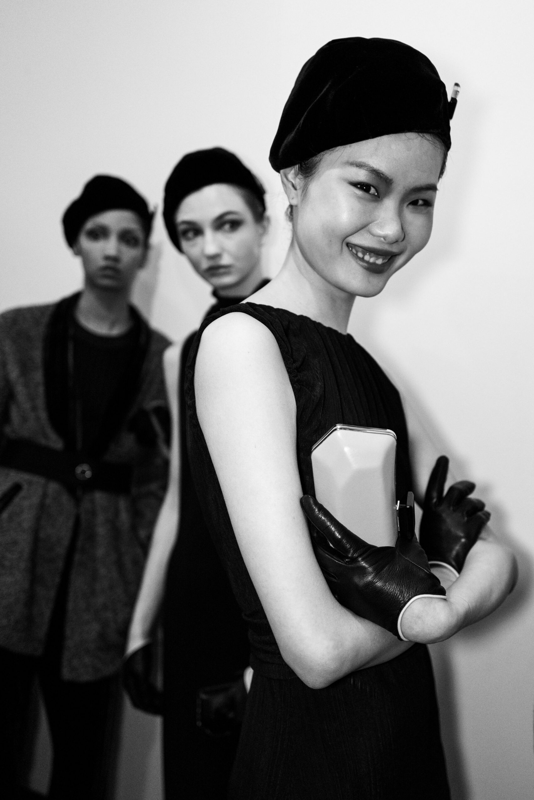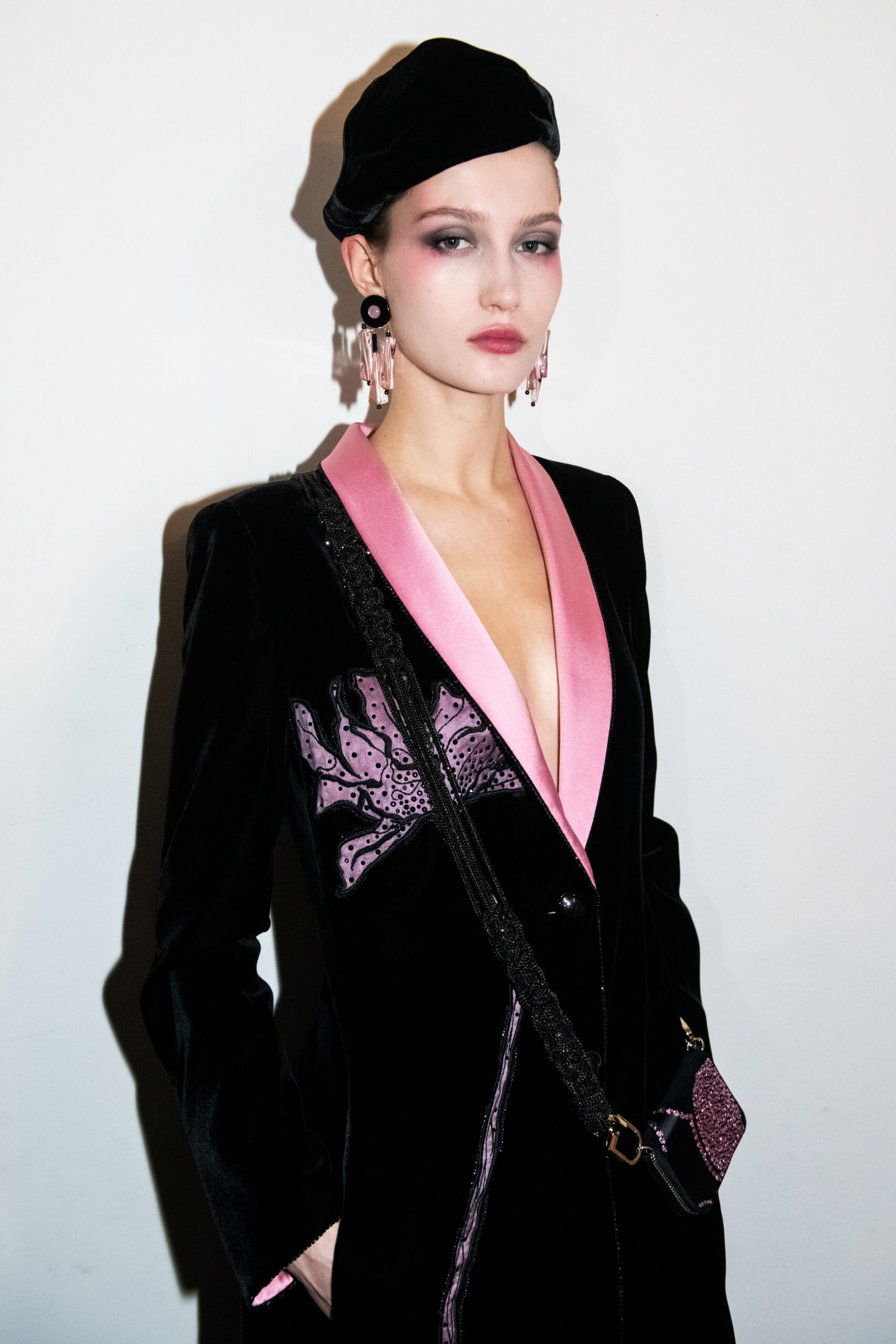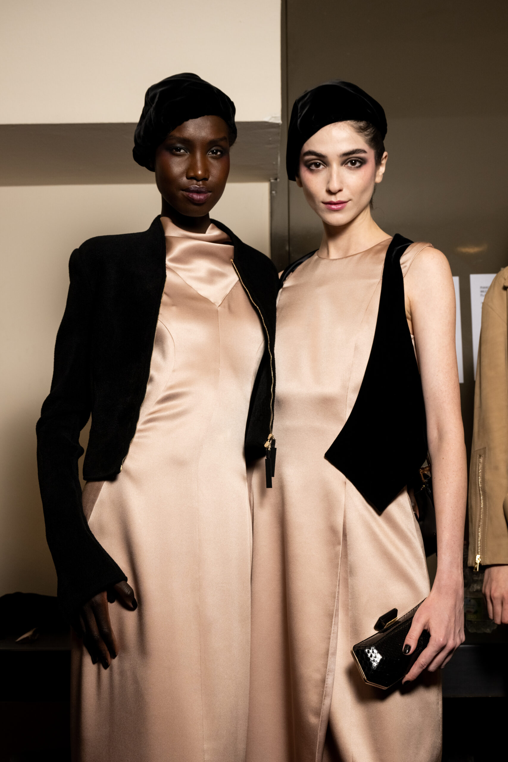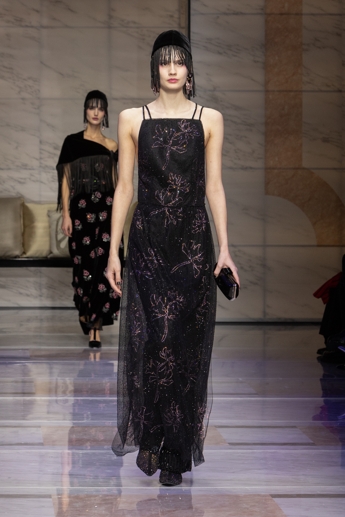 The shapes follow the body and its movements: silky dresses reminiscent of pajamas, wraparound shawls, soft pants, sweaters, elongated jackets and long dresses, in an earthy, bronze and powdery cosmetic palette with hints of tangerine enhanced by an abundance of black Kohl. The stylized floral motif is recurrent, a synthesis of grace, delicacy and discretion. This interior story is accompanied by subtle plays of gloss and matte on the equally soft clothing and accessories, by way of the new La Prima model. Beaded bangs dance on the berets, almost resembling sparkly headdresses, adding allure and mystery. An enveloping and personal vision that suggests intimacy as an antidote to a moment of theatrical excess.
