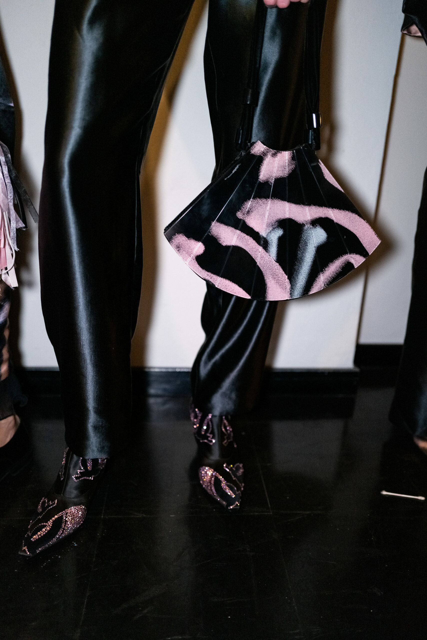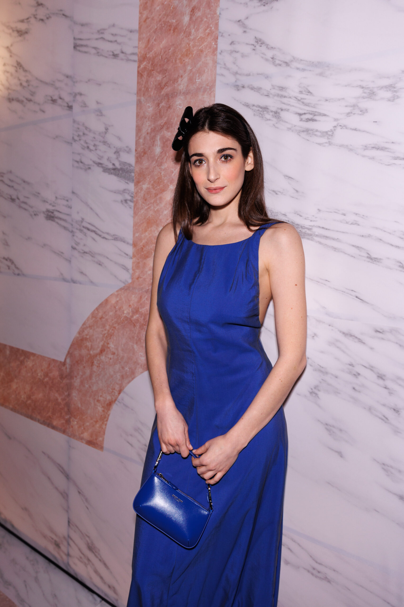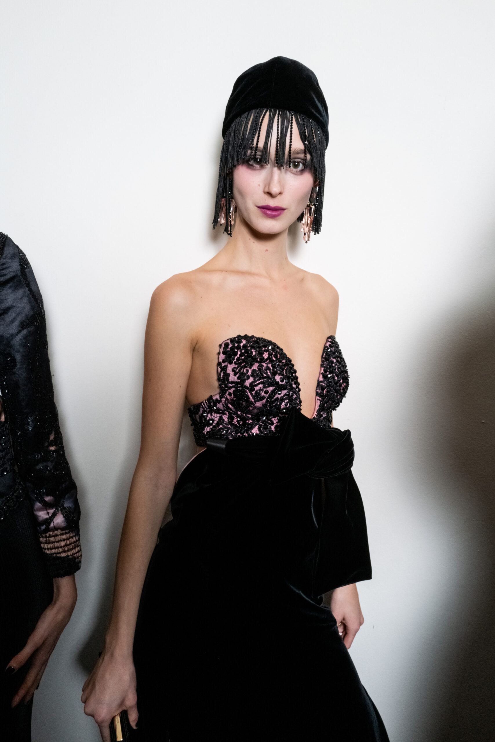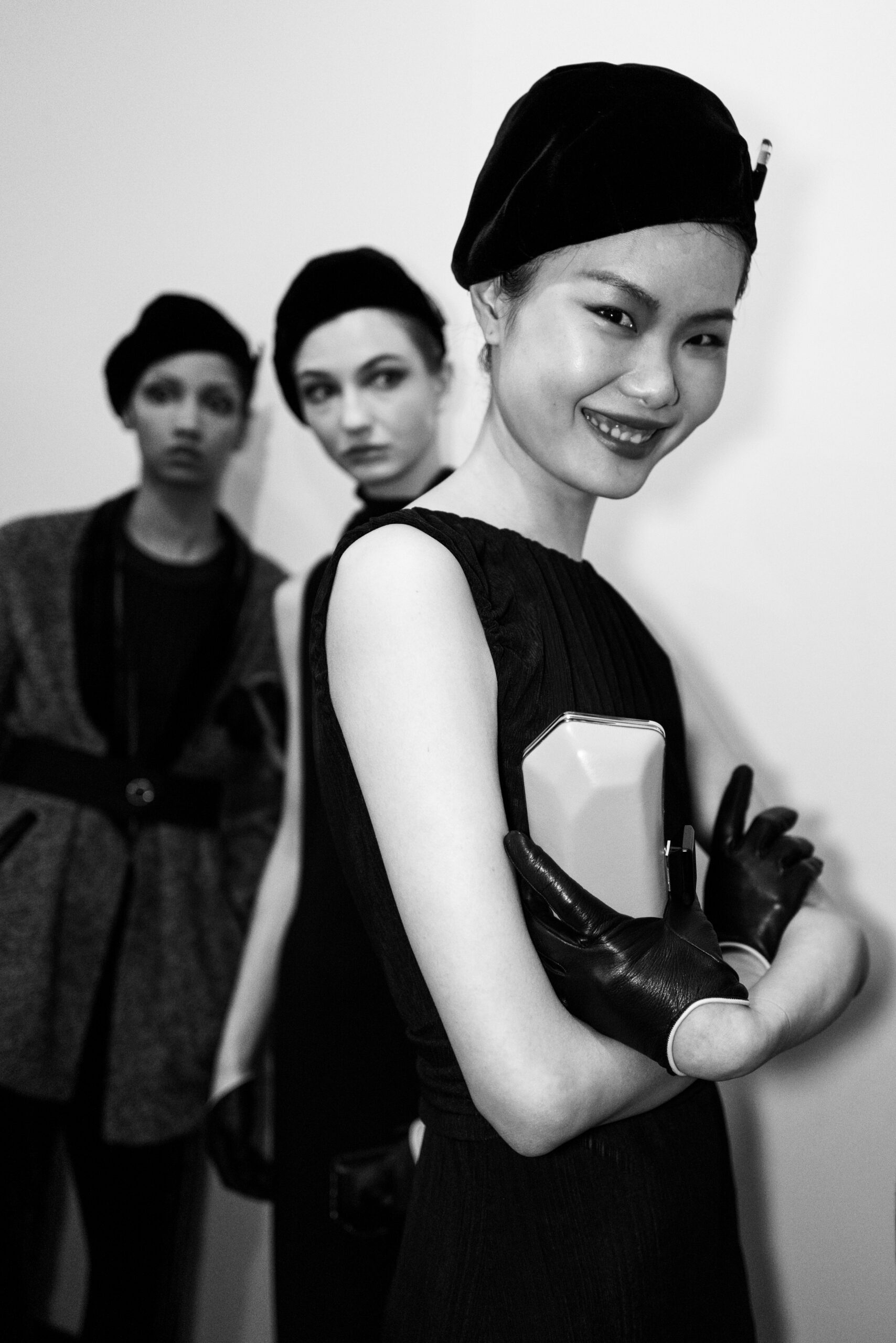 The shapes follow the body and its movements: silky dresses reminiscent of pajamas, wraparound shawls, soft pants, sweaters, elongated jackets and long dresses, in an earthy, bronze and powdery cosmetic palette with hints of tangerine enhanced by an abundance of black Kohl. The stylized floral motif is recurrent, a synthesis of grace, delicacy and discretion. This interior story is accompanied by subtle plays of gloss and matte on the equally soft clothing and accessories, by way of the new La Prima model. Beaded bangs dance on the berets, almost resembling sparkly headdresses, adding allure and mystery. An enveloping and personal vision that suggests intimacy as an antidote to a moment of theatrical excess.