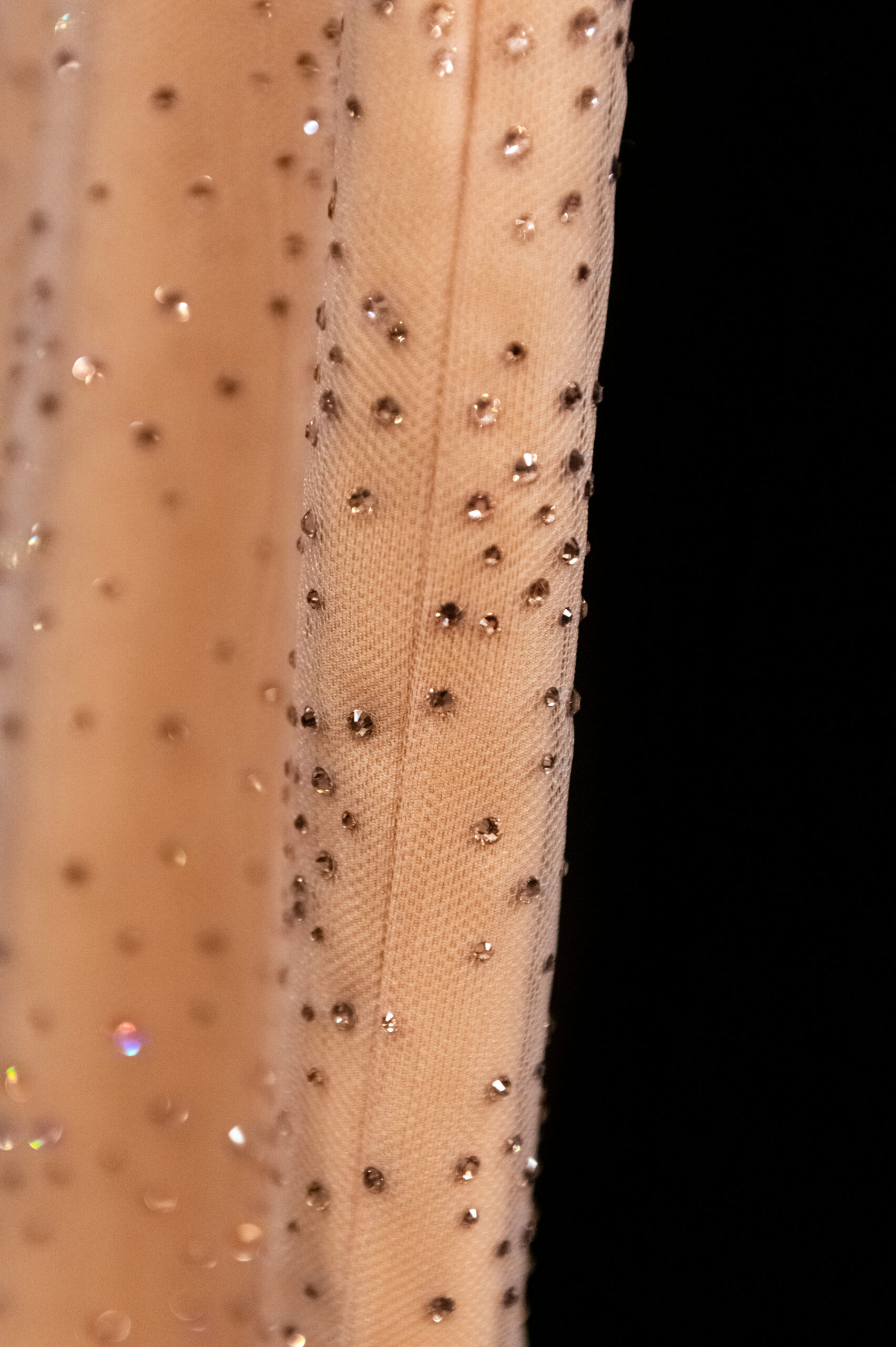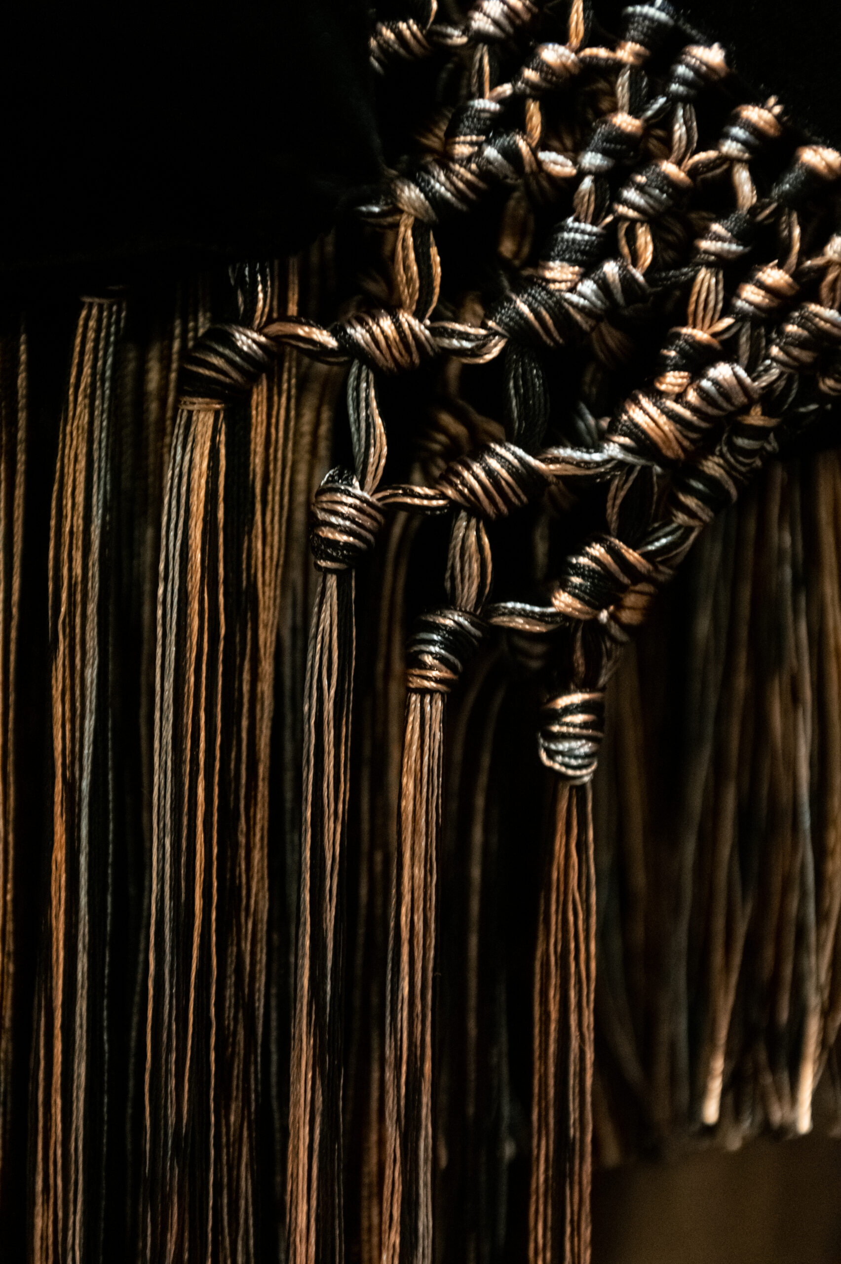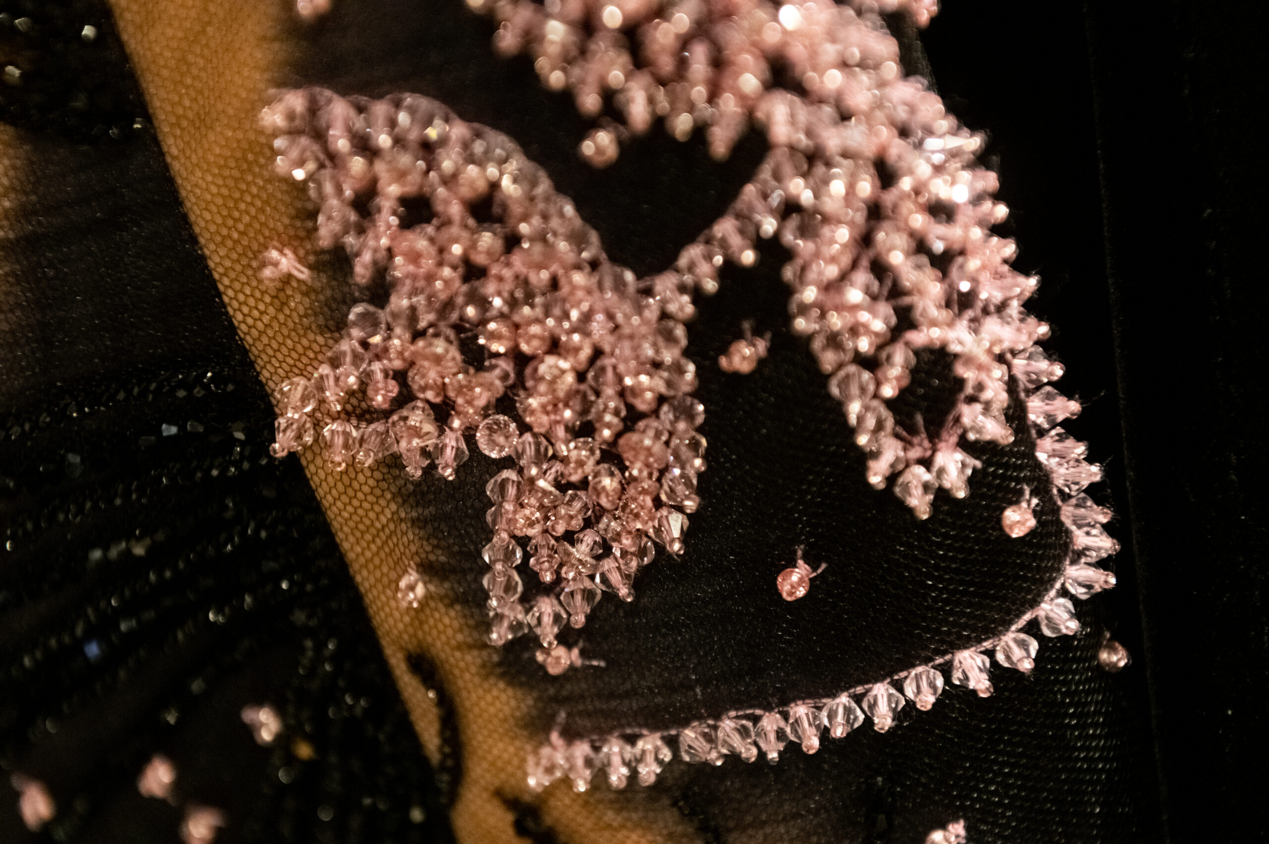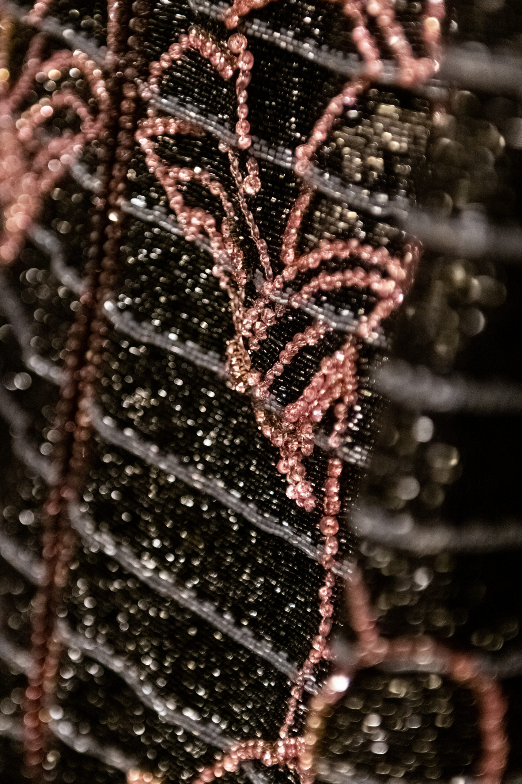 The shapes follow the body and its movements: silky dresses reminiscent of pajamas, wraparound shawls, soft pants, sweaters, elongated jackets and long dresses, in an earthy, bronze and powdery cosmetic palette with hints of tangerine enhanced by an abundance of black Kohl. The stylized floral motif is recurrent, a synthesis of grace, delicacy and discretion. This interior story is accompanied by subtle plays of gloss and matte on the equally soft clothing and accessories, by way of the new La Prima model. Beaded bangs dance on the berets, almost resembling sparkly headdresses, adding allure and mystery. An enveloping and personal vision that suggests intimacy as an antidote to a moment of theatrical excess.