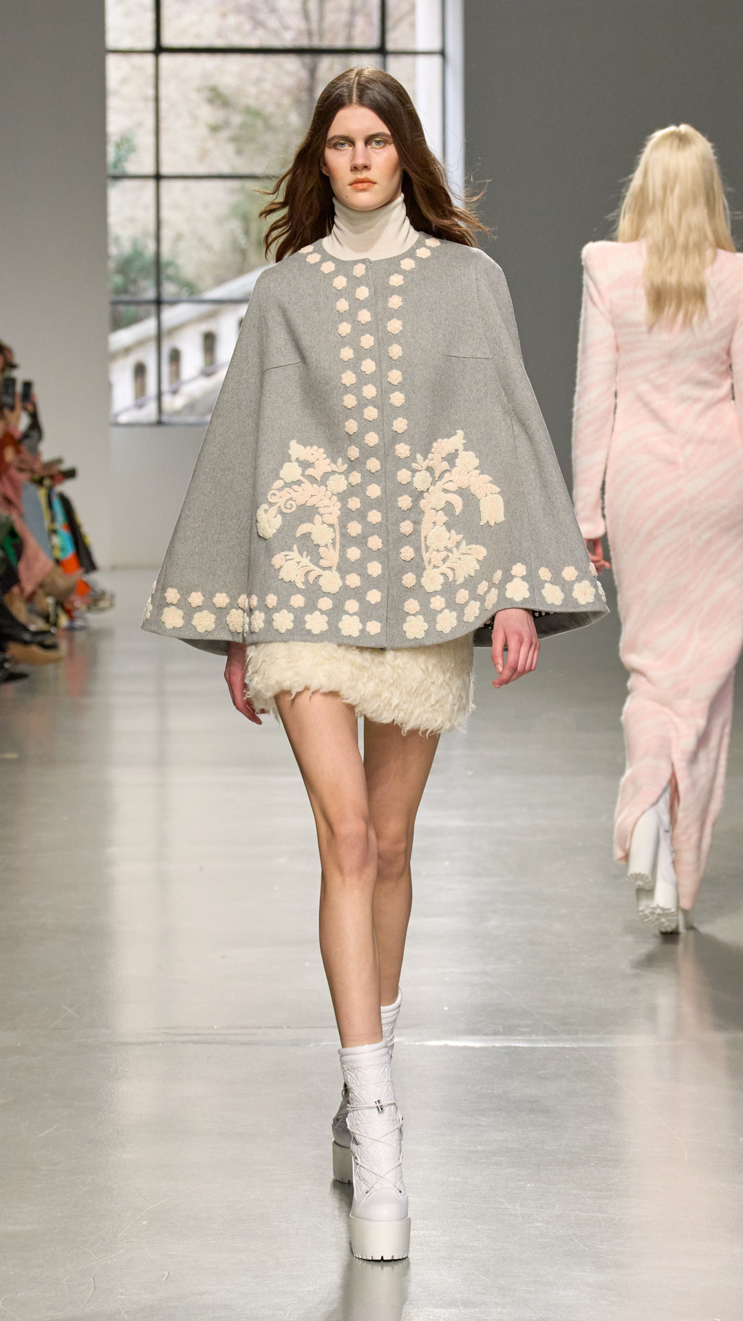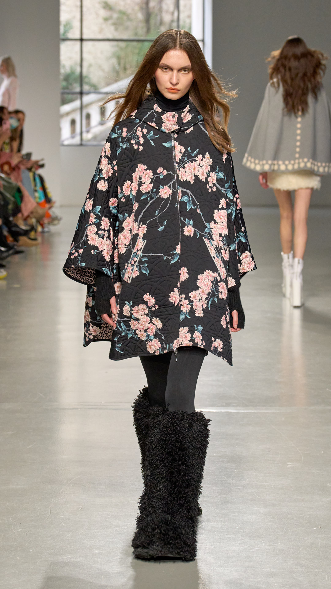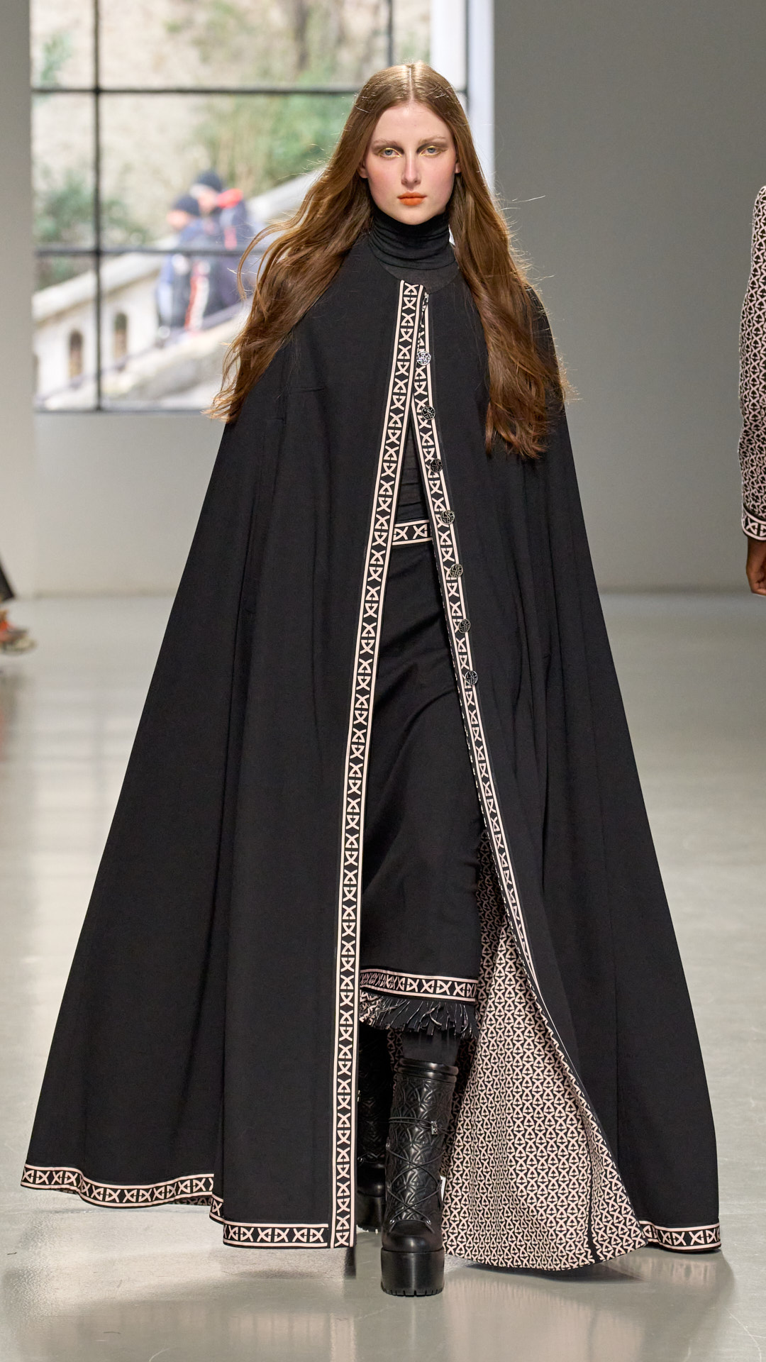 Between half Heidi and half Lady Di, our heroine has fun on the ski slopes in her lipstick red jersey quilted overalls. In the evening, she turns into a real star of the dance floor, marking the spirits in a strapless dress. In the middle of the night, she relaxes under the starry sky in a black woolen cloak embroidered with bouquets of folk flowers. In the early morning, she returns to the slopes, impressive in her coat with princely volumes in monogrammed cloqué brocade. She continues to twirl, as graceful as ever.