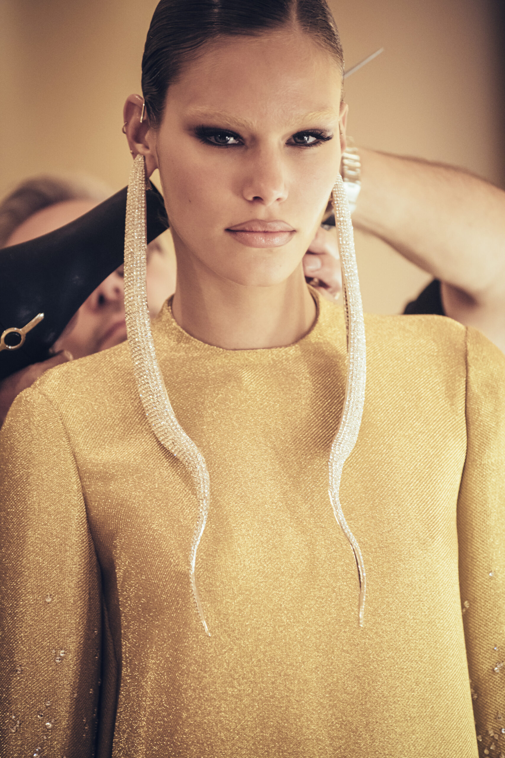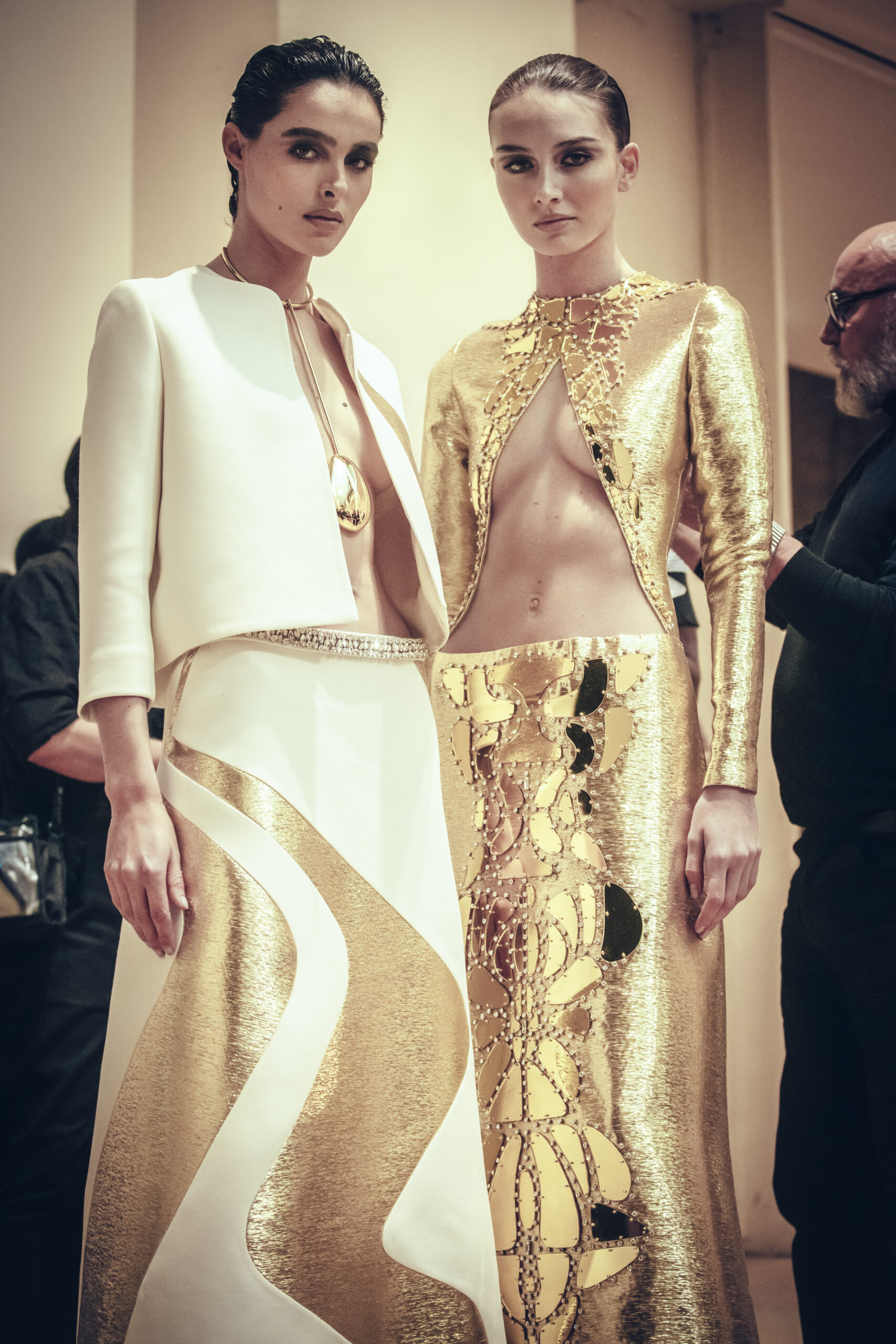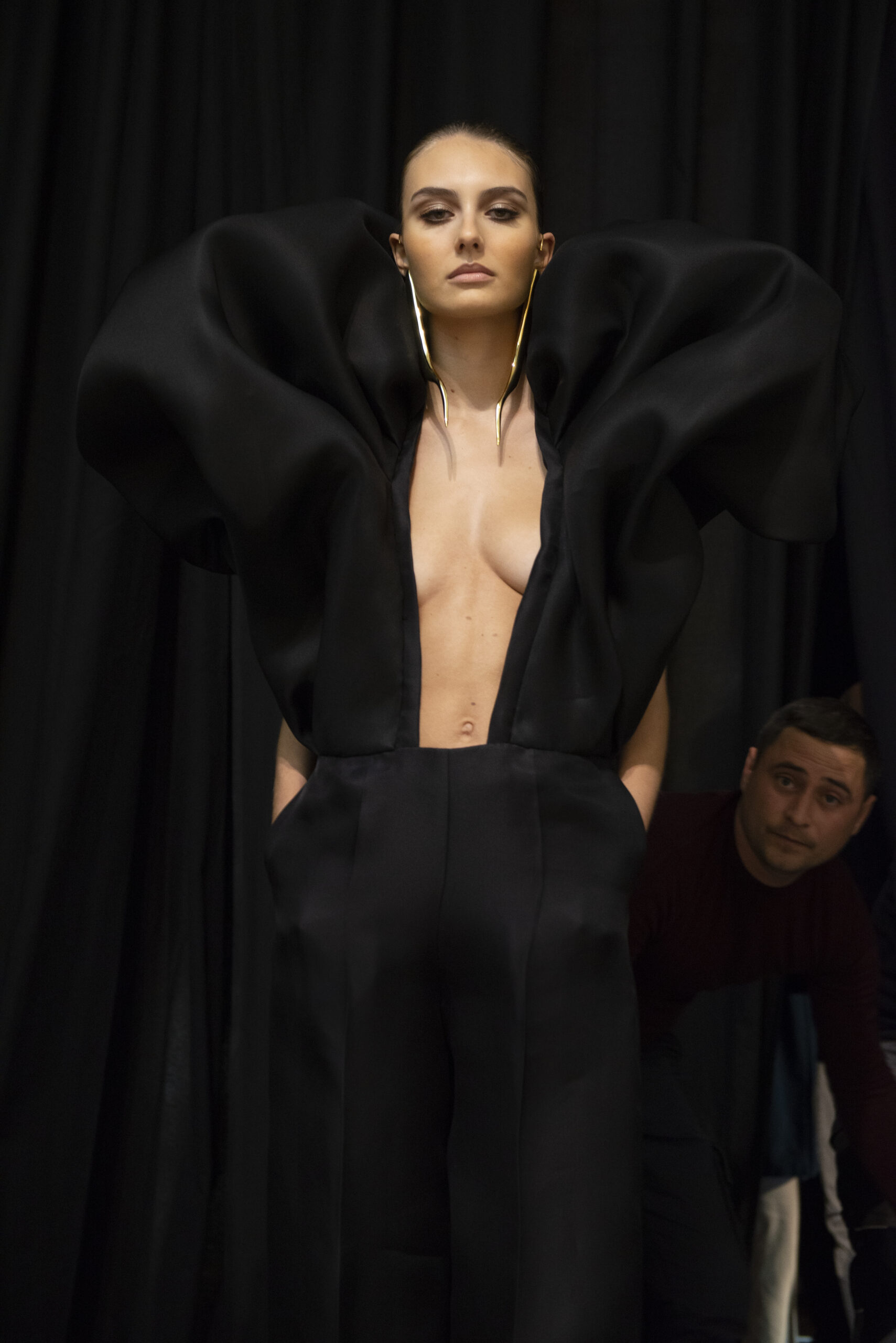 Stephane Rolland’s style is known for his ability to cut and sculpt silhouettes that are both elegant and avant-garde. This collection was no exception, with long dresses hugging the curves of the body and jackets with exaggerated shoulders, adding dimension and volume.