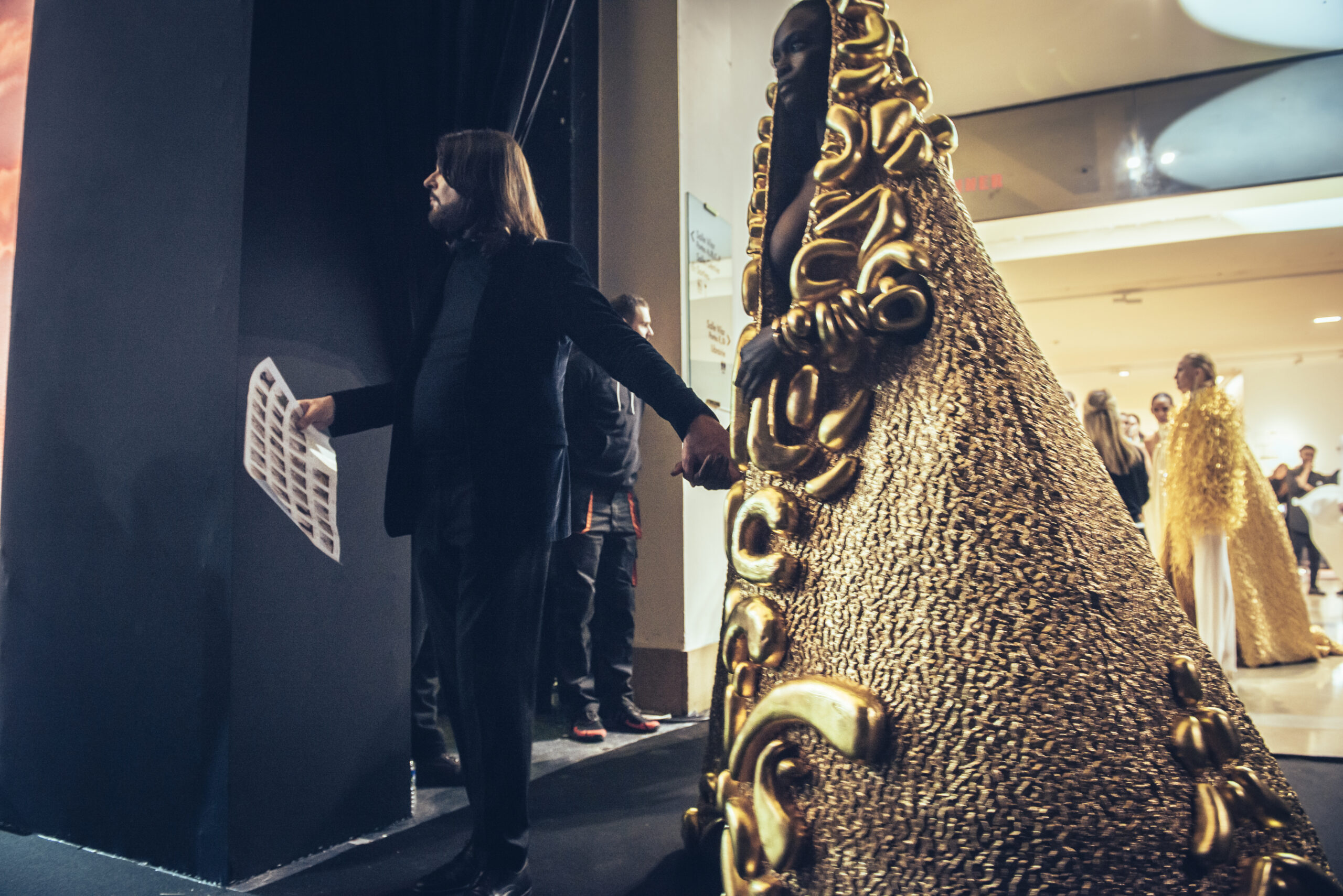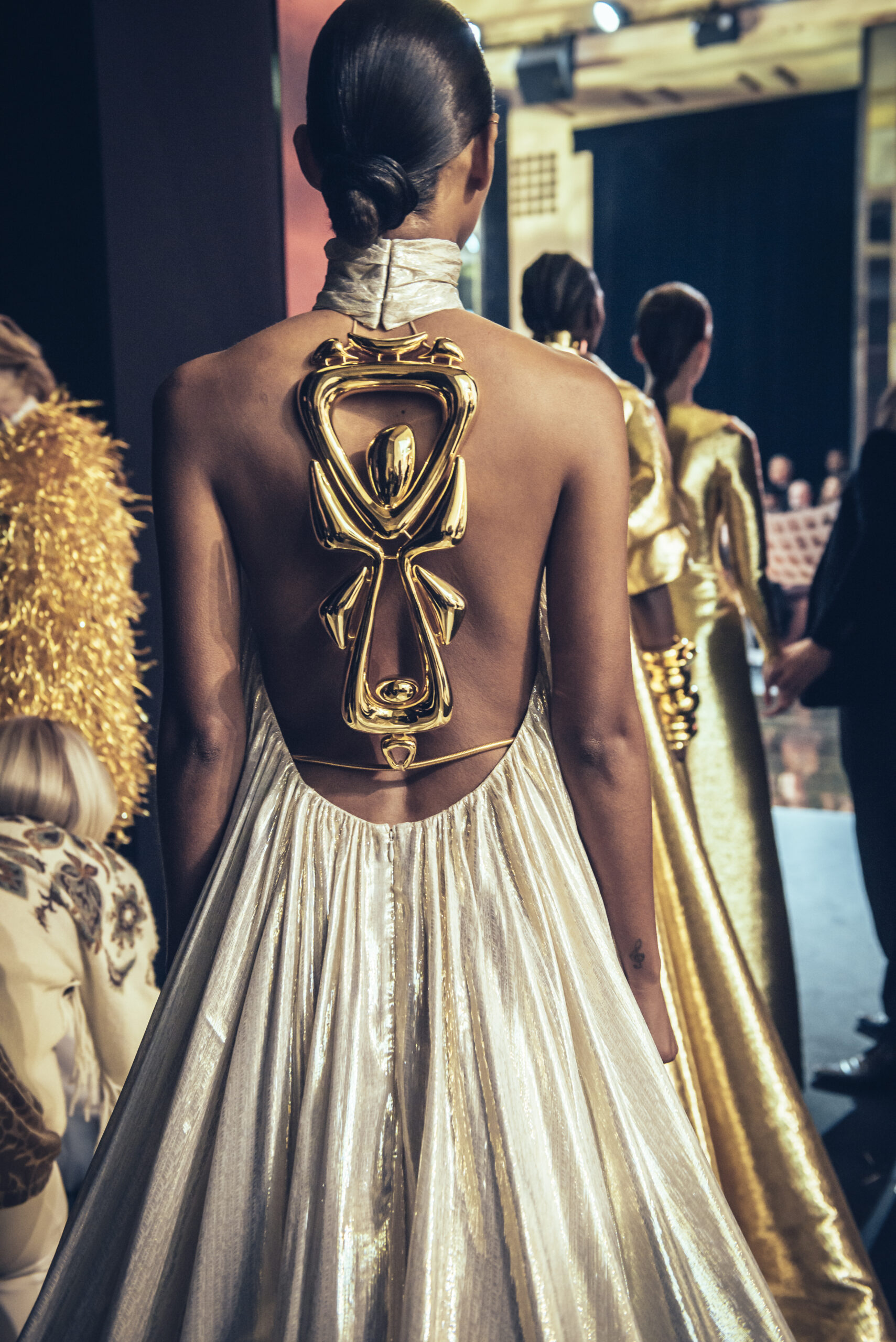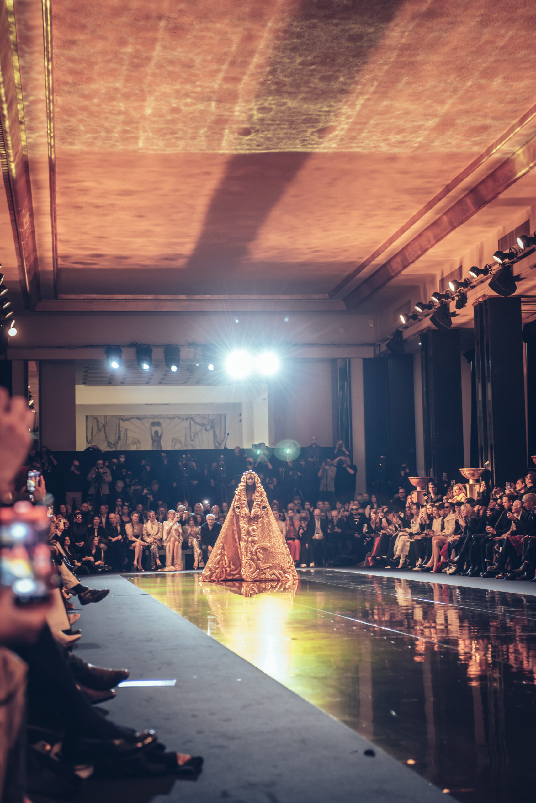 The show was held at the Théâtre National de Chaillot on January 24, 2023, presenting the spring-summer 2023 haute couture collection, entitled “Saudade Meu Amor”. The collection was presented in three acts, drawing inspiration from the sensuality of Bossa Nova, the architecture of Oscar Niemeyer and the rituals and art of the Amazonian culture. The collection featured totem dresses, ponchos and dresses embroidered with symbols and mirrors, capturing the light and creating a sense of divinity for the women wearing them. The last act was inspired by the gold of the conquistadors, with dresses and jackets made of metallic fabrics and adorned with crystals and amethysts, evoking the baroque style of the churches in Bahia. The collection was a journey from minimalism to abundance, gathering extremes to create a new balance and light.