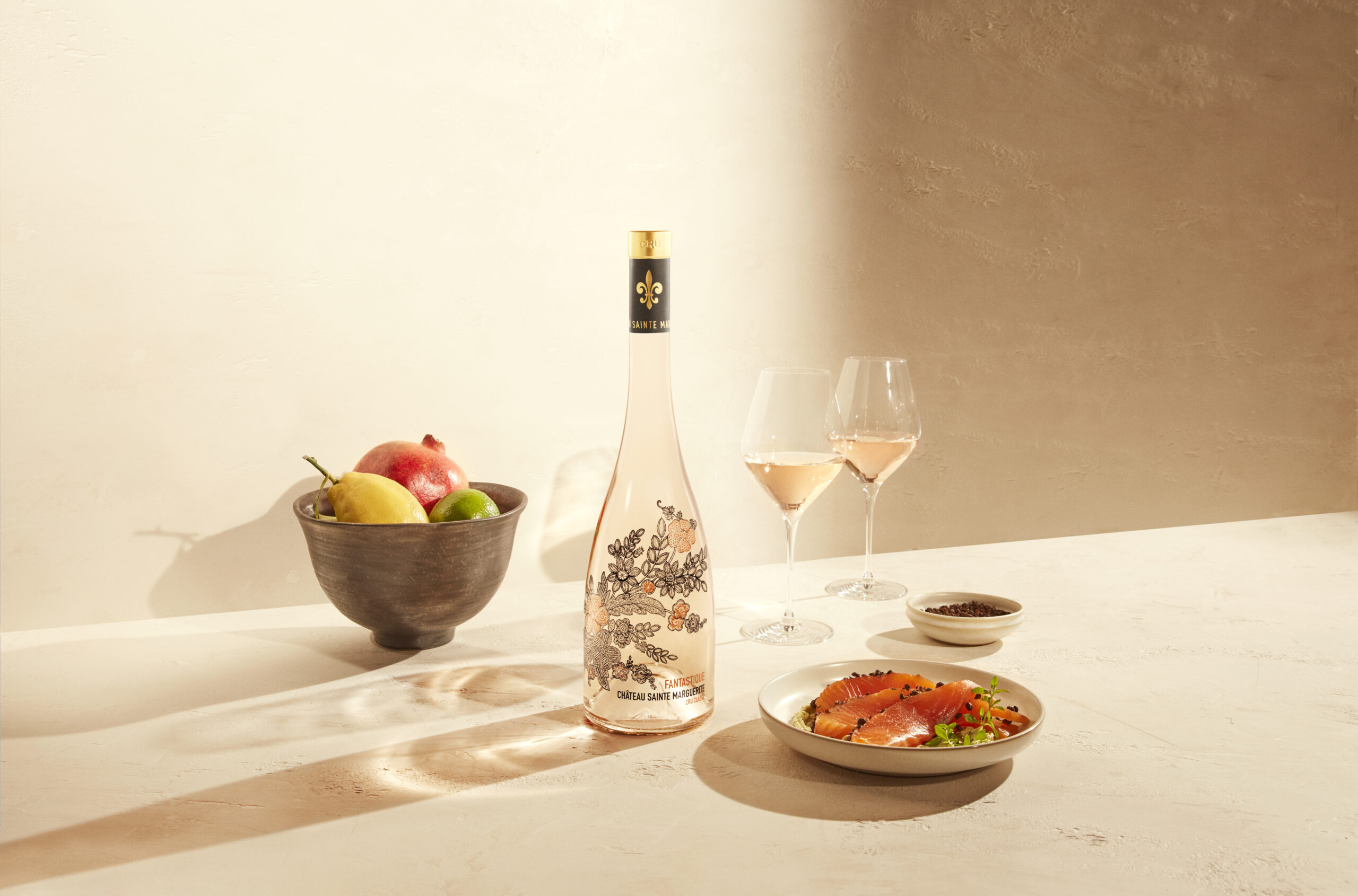 Rosé from Sainte Marguerite en Provence is not just a summer wine to be enjoyed chilled, it’s also a gourmet wine that goes brilliantly with a wide variety of dishes. It goes wonderfully with grilled fish, shellfish, Mediterranean salads, mild cheeses and fruity desserts. Its freshness and finesse make it the ideal companion for convivial meals, aperitifs with friends, or romantic dinners under the stars.