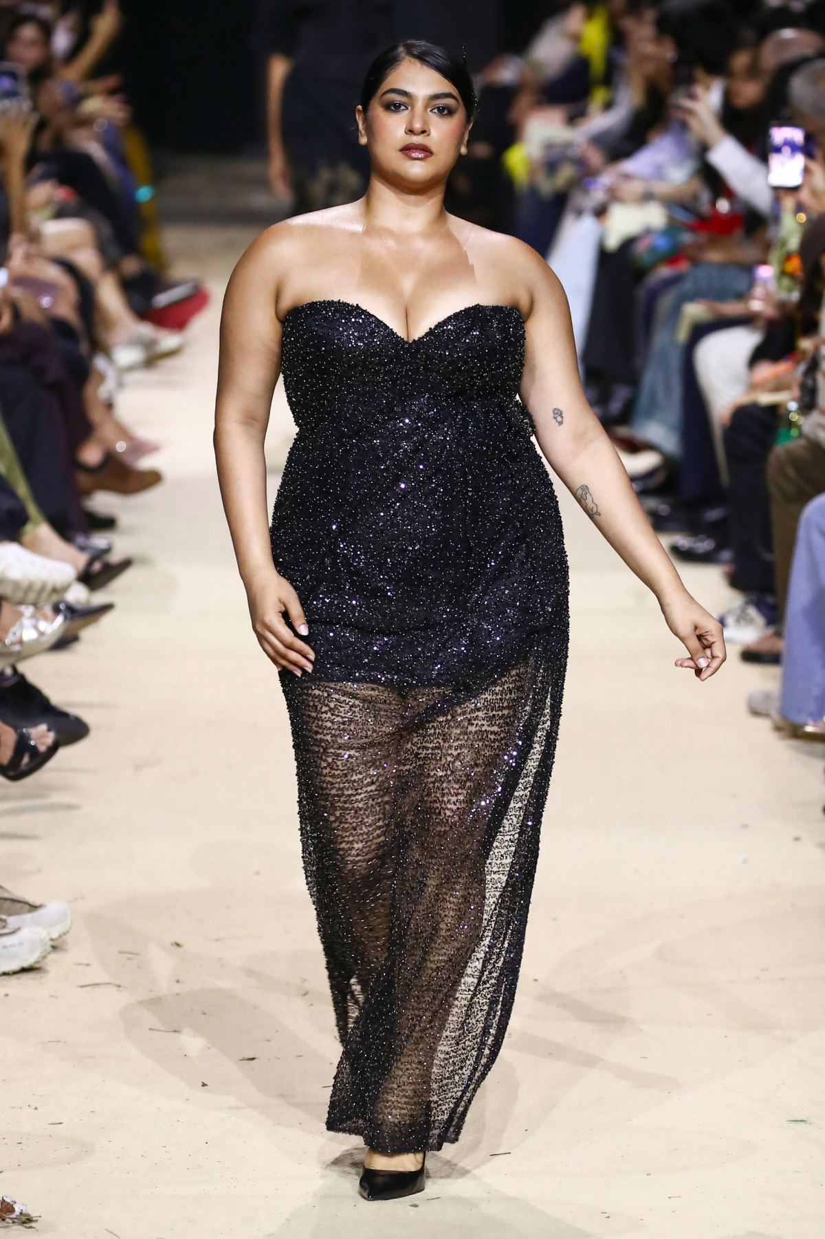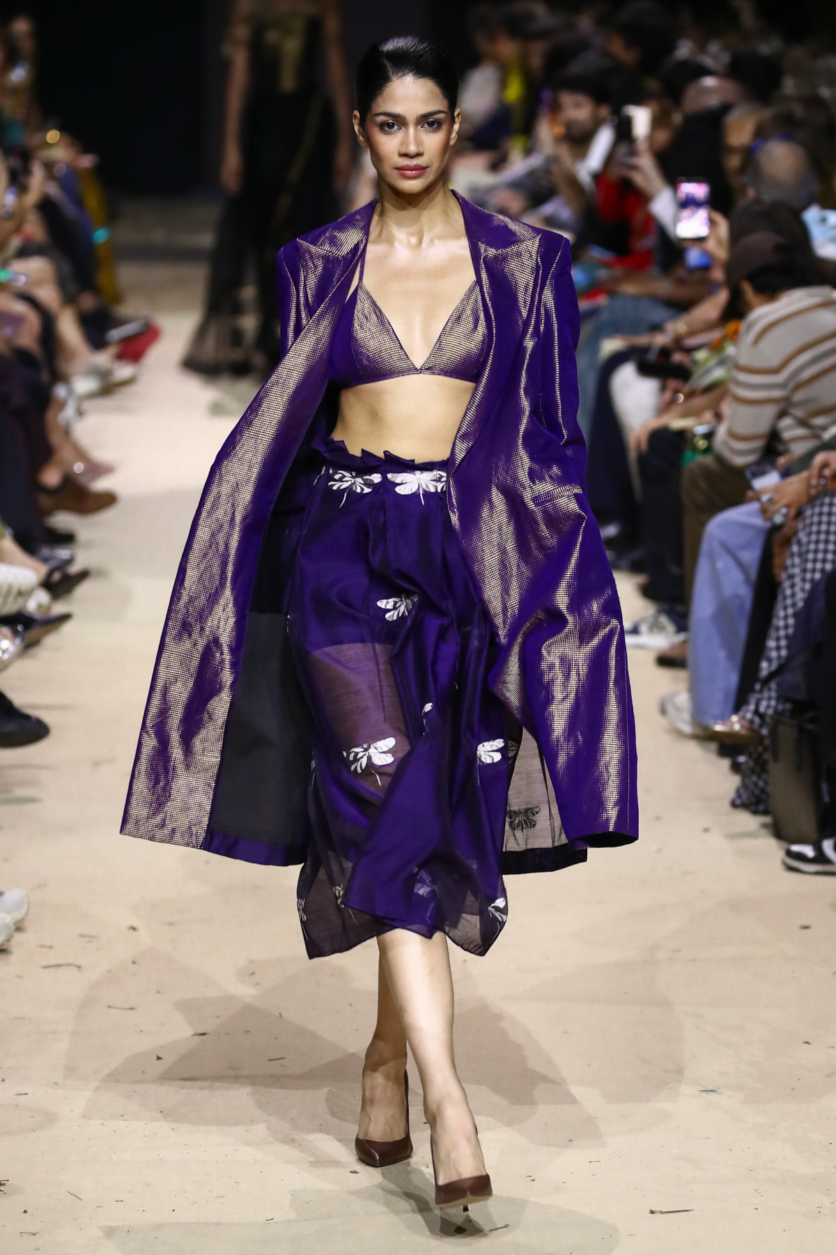 Like a painter sublimating his canvas, Vermeulen deploys his palette of vivid colors, from signature orange to new vitamin-rich hues. Inspired by artistic gestures, he applies his colors in abstract patterns on noble materials, such as blurred brushing on cotton poplin or stretch satin. Trompe-l’œil prints also appear on pleated fabrics, revealing the visual poetry so dear to the Belgian house.
