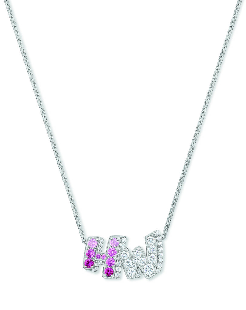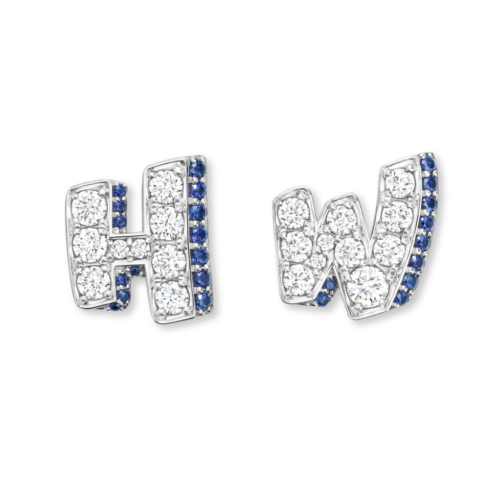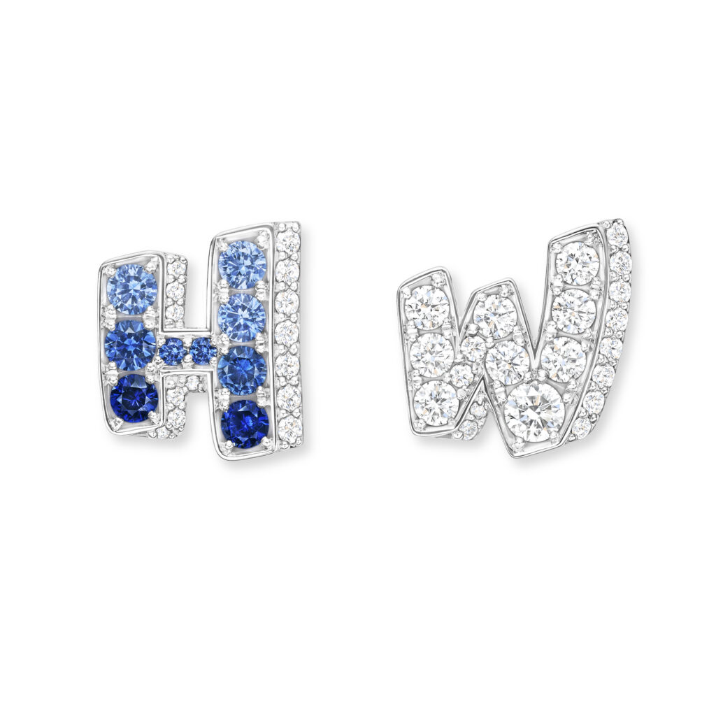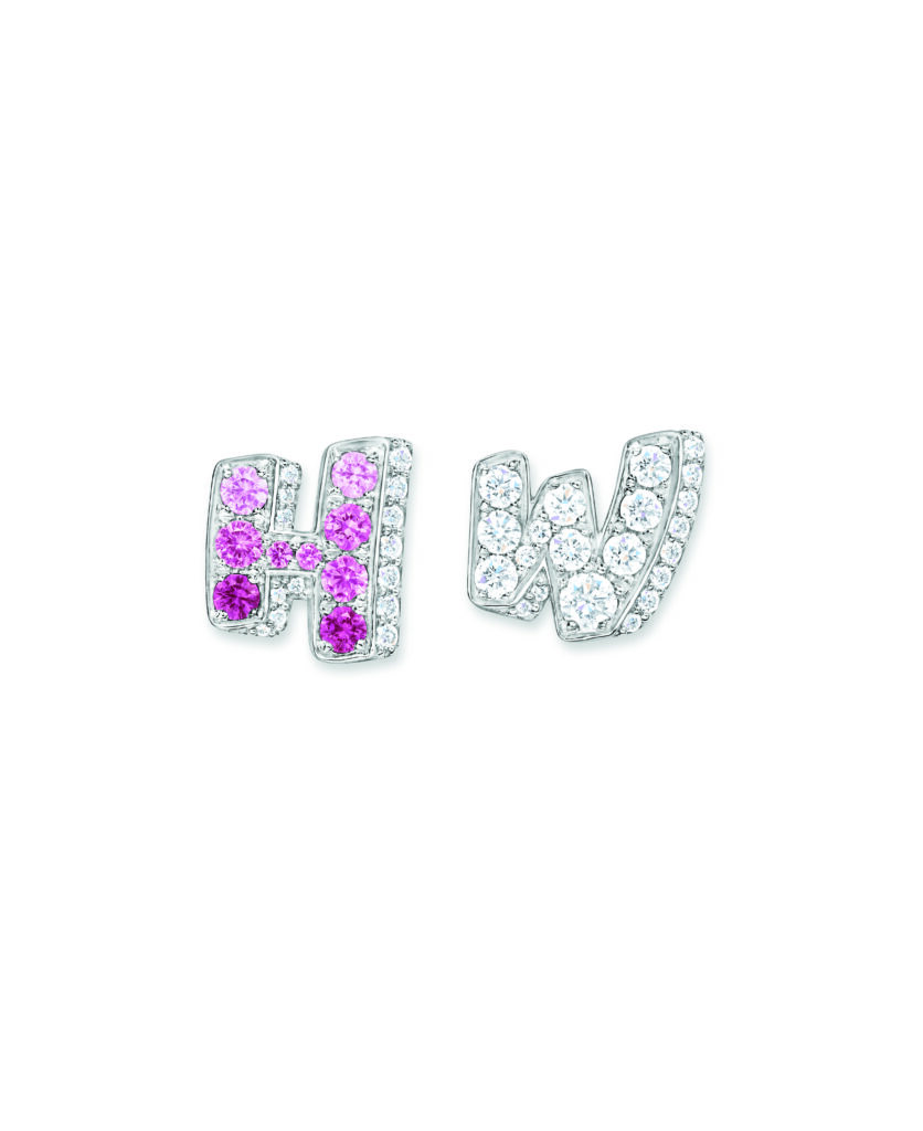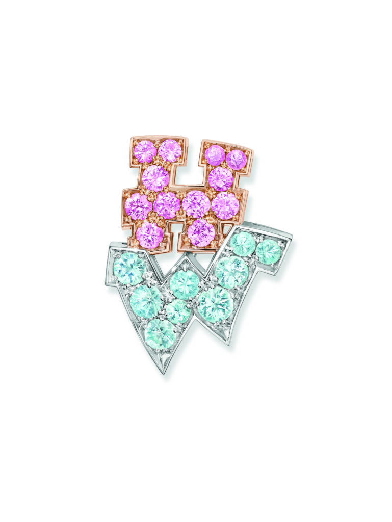 The formal motif of the collection is based on a simple principle: the two initial letters of the Maison – H and W – serve as compositional frames. The stones are set in relief, the right angles of the H contrasting with the broken line of the W. This is not a decorative monogram; it’s a design constraint that imposes a geometric progression on the gem-setter. Versions are available in three documented color registers: pink sapphires and diamonds, blue sapphires and diamonds, and a monochrome all-diamond version.