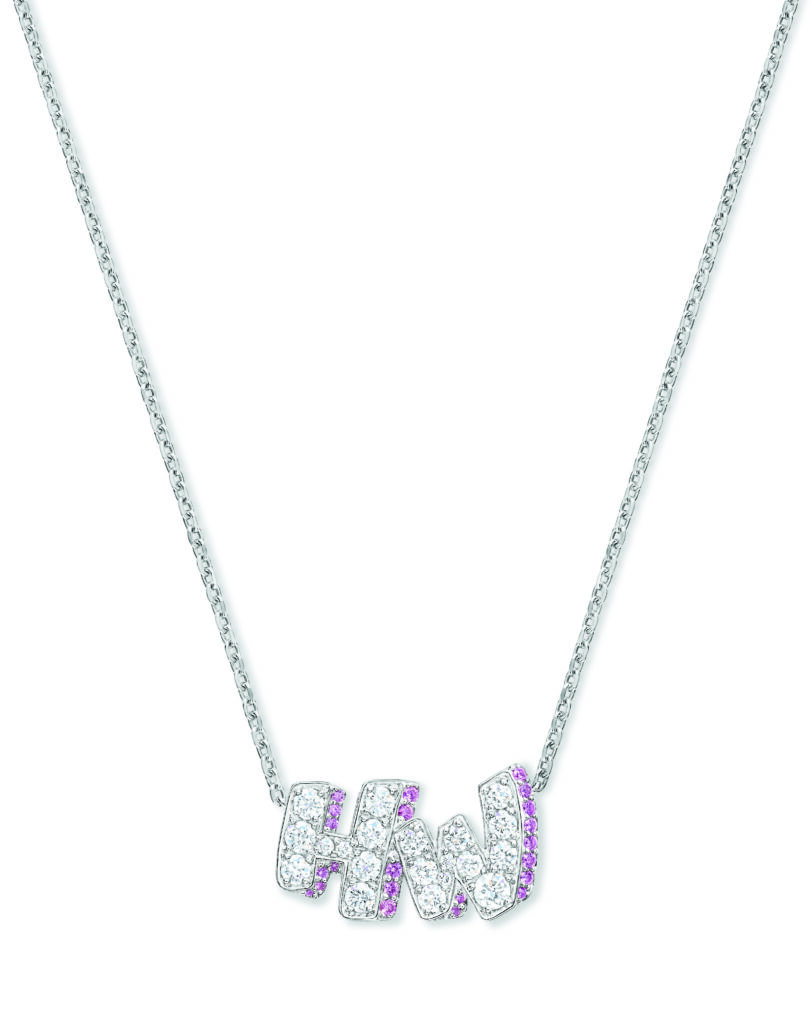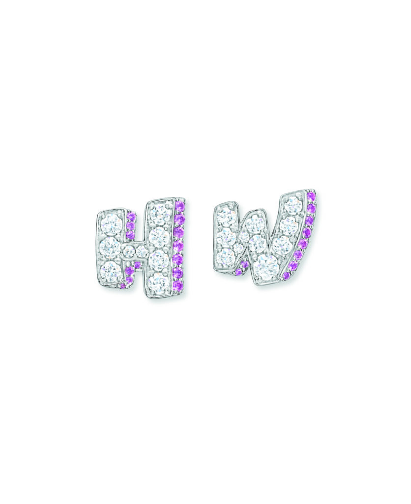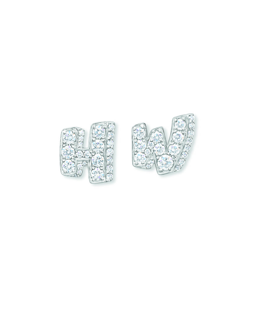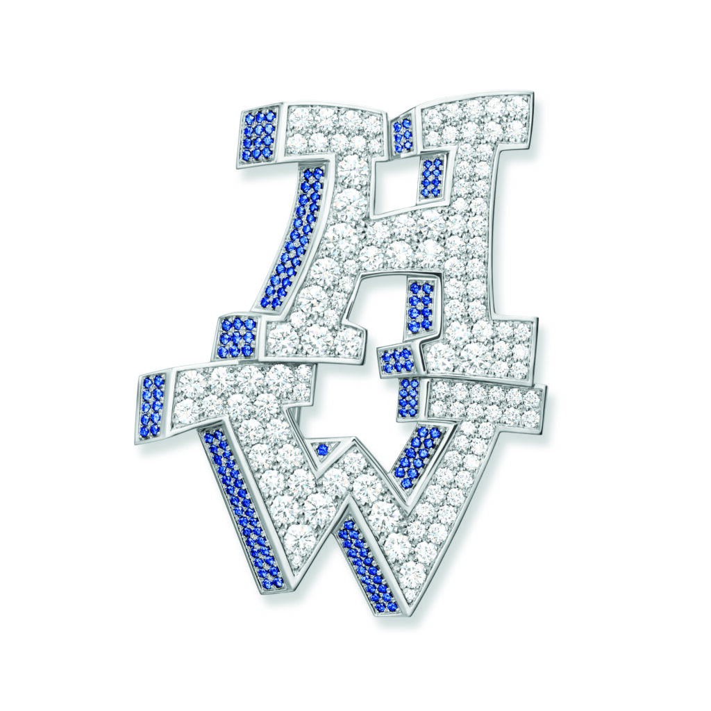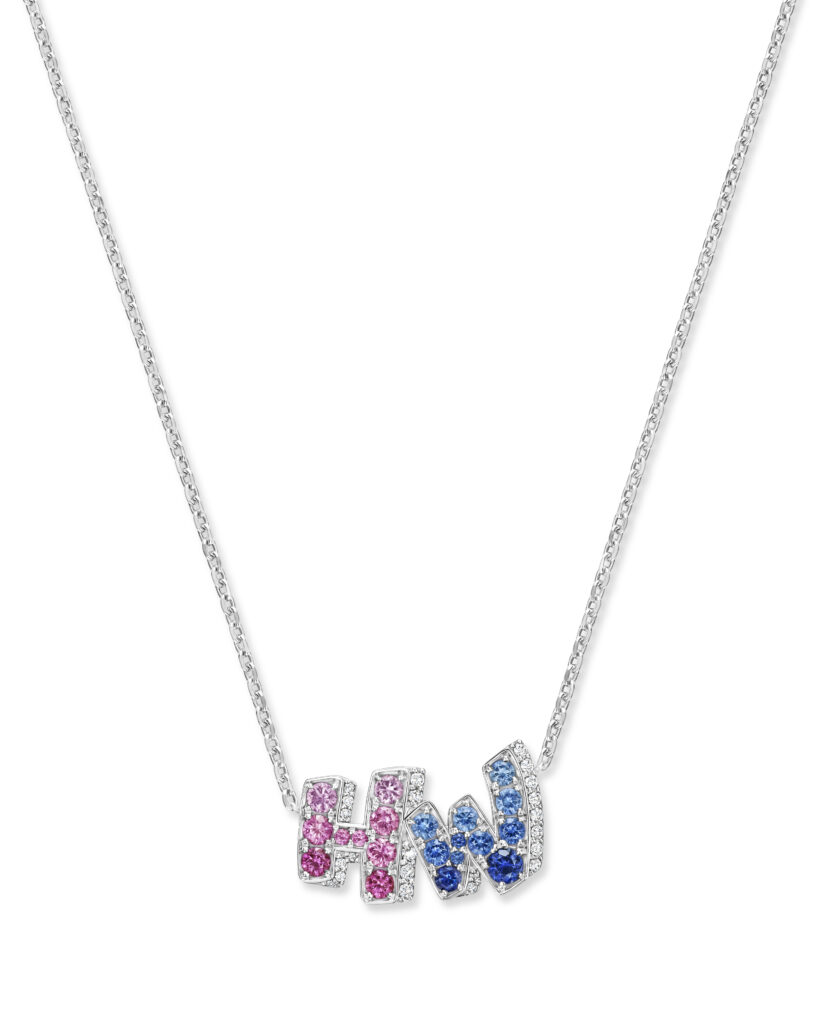 The formal motif of the collection is based on a simple principle: the two initial letters of the Maison – H and W – serve as compositional frames. The stones are set in relief, the right angles of the H contrasting with the broken line of the W. This is not a decorative monogram; it’s a design constraint that imposes a geometric progression on the gem-setter. Versions are available in three documented color registers: pink sapphires and diamonds, blue sapphires and diamonds, and a monochrome all-diamond version.